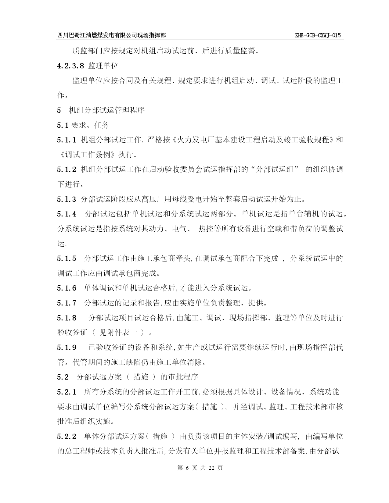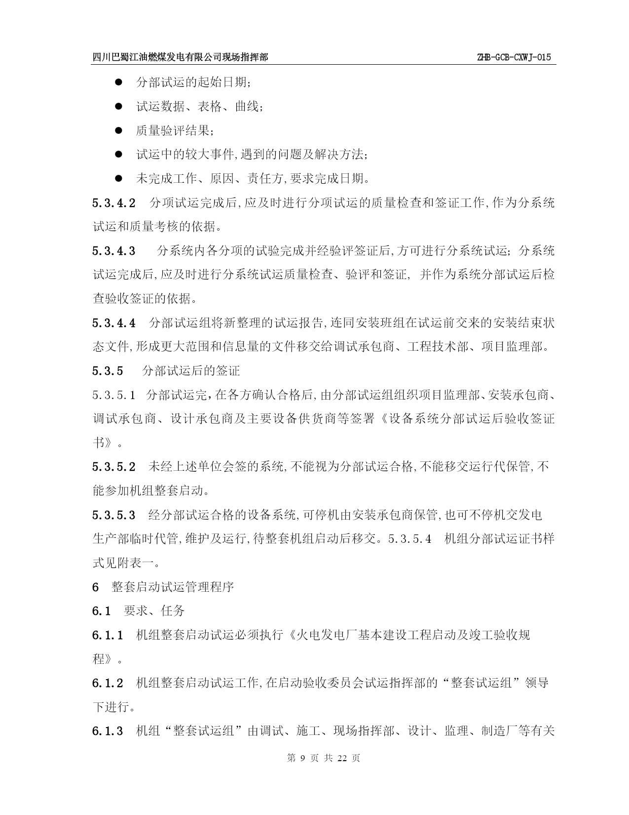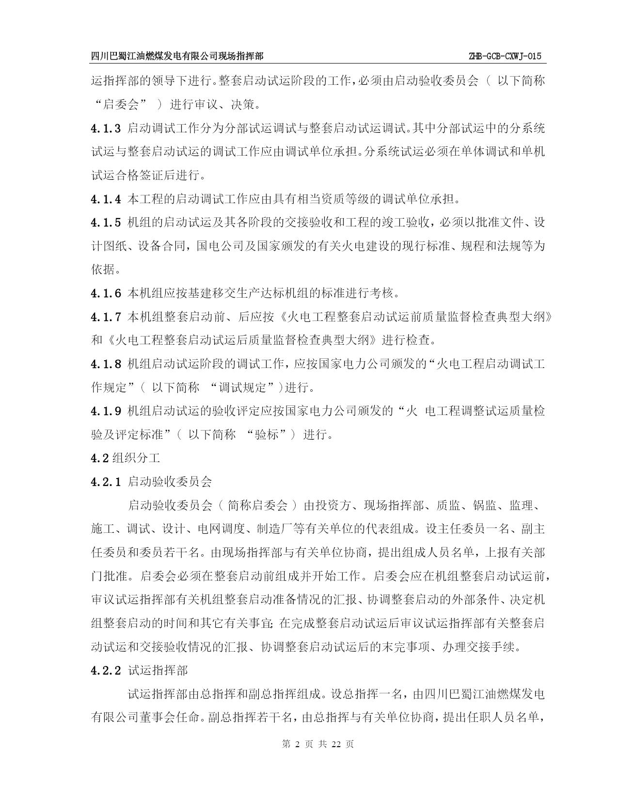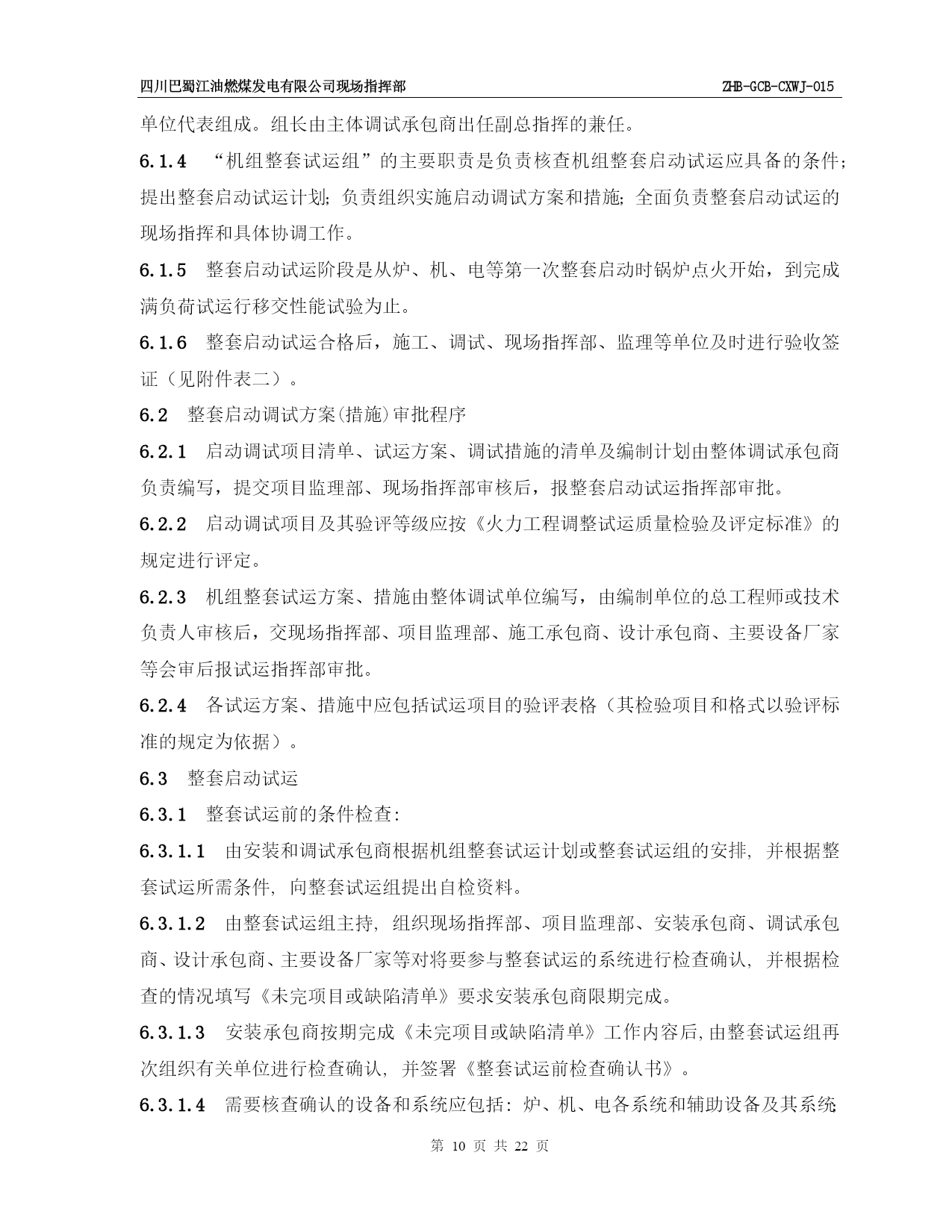 四川巴蜀江油燃煤发电有限公司现场指挥部ZHB-GCB-CXWJ-015PAGE第PAGE20页共NUMPAGES22页启动调试管理程序编制目的为了加强本工程调试工作的管理,明确参与调试各部门的任务和职责范围,提高调试工作水平,顺利完成本工程的调试工作,根据《火力发电厂基本建设工程启动及竣工验收规程(1996年版)》、《火电工程启动调试工作规定》和《火电工程重点项目质量监督检验大纲》制定本管理程序。定义启动调试:是机组在安装完毕后对各设备和系统进行试验、调整、养护等,以及对其健康状况进行动、静态检验的全面的、系统的工作。它分为分部试运调试与整套启动试运调试。分部试运:是对单体设备和分部系统进行调试,检验单机和分系统设备性能是否符合规范要求并进行优化调整。整套启动试运:是对整套机组进行全面调整、试验,它分为空负荷调试、带负荷调试和满负荷调试。应用范围四川巴蜀江油2×30OMW燃煤机组工程机组的整个启动调试过程。总则通则4.1.l启动调试工作是火电基本建设工程的一个关键阶段,基本任务是使新安装机组安全顺利地完成整套启动并移交生产。投产后能安全稳定运行,形成生产能力,发挥投资效益。机组的启动试运是全面检查主机及其配套系统的设备制造、设计、施工、调试和生产准备的重要环节,是保证机组能安全、可靠、经济、文明地投入生产,形成生产能力,发挥投资效益的关键性程序。启动调试工作要按国家标准和规程、规范及设备文件的要求进行。调试单位要在启动试运指挥部的领导下,根据设计和设备的特点,合理组织、协调、实施启动试运工作,确保启动调试工作的安全和质量。机组的启动试运及其各阶段的交接验收,应在试运指挥部的领导下进行。整套启动试运阶段的工作,必须由启动验收委员会(以下简称“启委会”)进行审议、决策。启动调试工作分为分部试运调试与整套启动试运调试。其中分部试运中的分系统试运与整套启动试运的调试工作应由调试单位承担。分系统试运必须在单体调试和单机试运合格签证后进行。本工程的启动调试工作应由具有相当资质等级的调试单位承担。机组的启动试运及其各阶段的交接验收和工程的竣工验收,必须以批准文件、设计图纸、设备合同,国电公司及国家颁发的有关火电建设的现行标准、规程和法规等为依据。本机组应按基建移交生产达标机组的标准进行考核。本机组整套启动前、后应按《火电工程整套启动试运前质量监督检查典型大纲》和《火电工程整套启动试运后质量监督检查典型大纲》进行检查。机组启动试运阶段的调试工作,应按国家电力公司颁发的“火电工程启动调试工作规定”(以下简称“调试规定”)进行。机组启动试运的验收评定应按国家电力公司颁发的“火电工程调整试运质量检验及评定标准”(以下简称“验标”)进行。组织分工4.2.1启动验收委员会启动验收委员会(简称启委会)由投资方、现场指挥部、质监、锅监、监理、施工、调试、设计、电网调度、制造厂等有关单位的代表组成。设主任委员一名、副主任委员和委员若干名。由现场指挥部与有关单位协商,提出组成人员名单,上报有关部门批准。启委会必须在整套启动前组成并开始工作。启委会应在机组整套启动试运前,审议试运指挥部有关机组整套启动准备情况的汇报、协调整套启动的外部条件、决定机组整套启动的时间和其它有关事宜;在完成整套启动试运后审议试运指挥部有关整套启动试运和交接验收情况的汇报、协调整套启动试运后的末完事项、办理交接手续。4.2.2试运指挥部试运指挥部由总指挥和副总指挥组成。设总指挥一名,由四川巴蜀江油燃煤发电有限公司董事会任命。副总指挥若干名,由总指挥与有关单位协商,提出任职人员名单,上报四川巴蜀江油燃煤发电有限公司董事会批准。试运指挥部一般应从分部试运开始前一个月组成并开始工作,直到办完移交生产手续为止。其主要职责是:全面组织、领导和协调机组启动试运工作;对试运中的安全、质量、进度和效益全面负责;审批启动调试方案和措施;启委会成立后,在主任委员的领导下,筹备启委会全体会议,启委会闭会期间,代表启委会主持整套启动试运的常务指挥工作;协调解决启动试运中的重大问题;组织、领导、检查和协调试运指挥部各组及各阶段的交接签证工作。试运指挥部下设:分部试运组、整套试运组、验收检查组、生产准备组、综合组。根据工作需要,各组可下设若干个专业组,专业组的成员,一般由总指挥与有关单位协商任命,并报工程主管单位备案。4.2.2.1分部试运组分部试运组由施工、调试、现场指挥部、设计、监理等有关单位的代表组成,应邀请主要设备厂派员参加。设组长一名、副组长若干名。组长应由主体施工单位出任副总指挥的兼任。其主要职责是:负责分部试运阶段的组织协调、统筹安排和指挥领导工作;组织和办理分部试运后的验收签证及资料的交接等。4.2.2.2整套