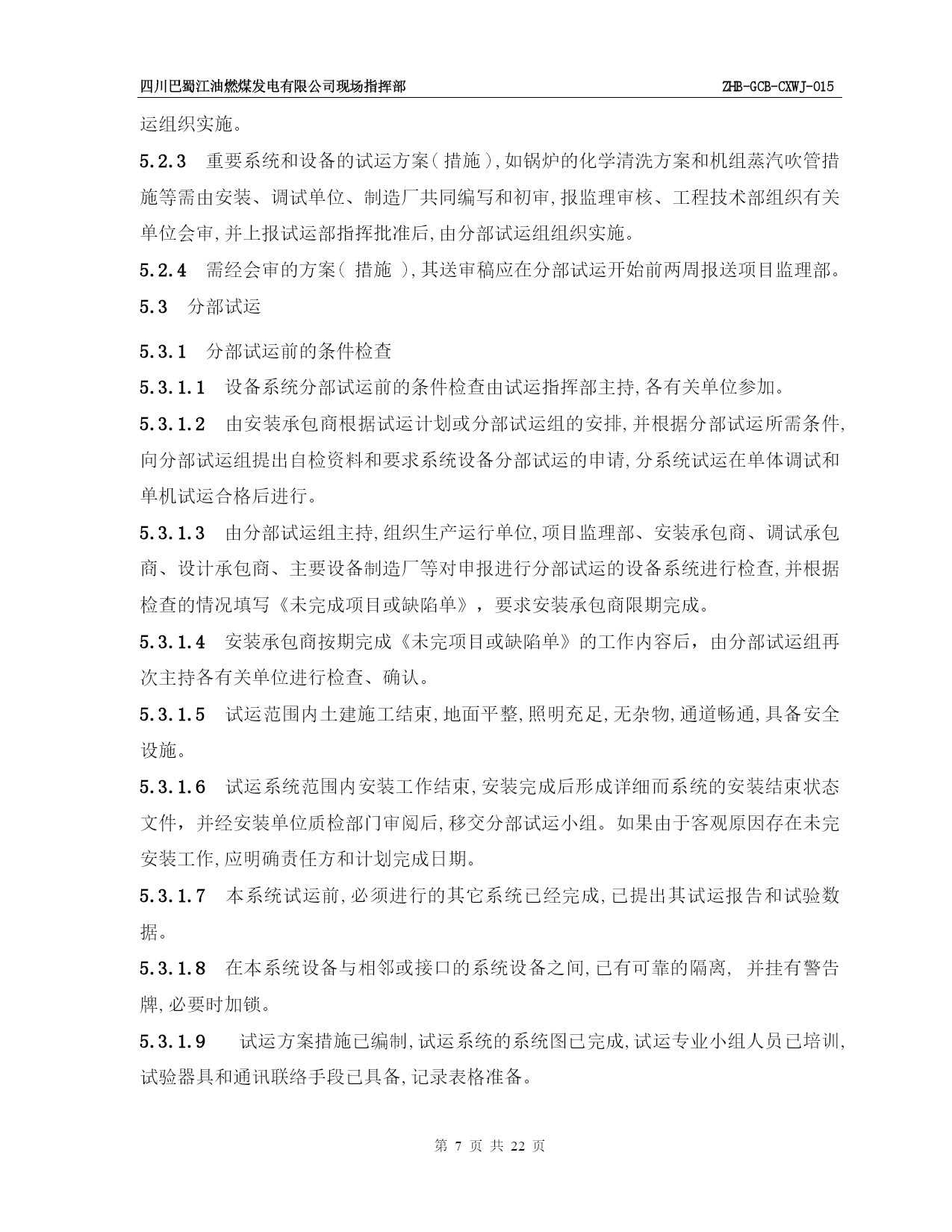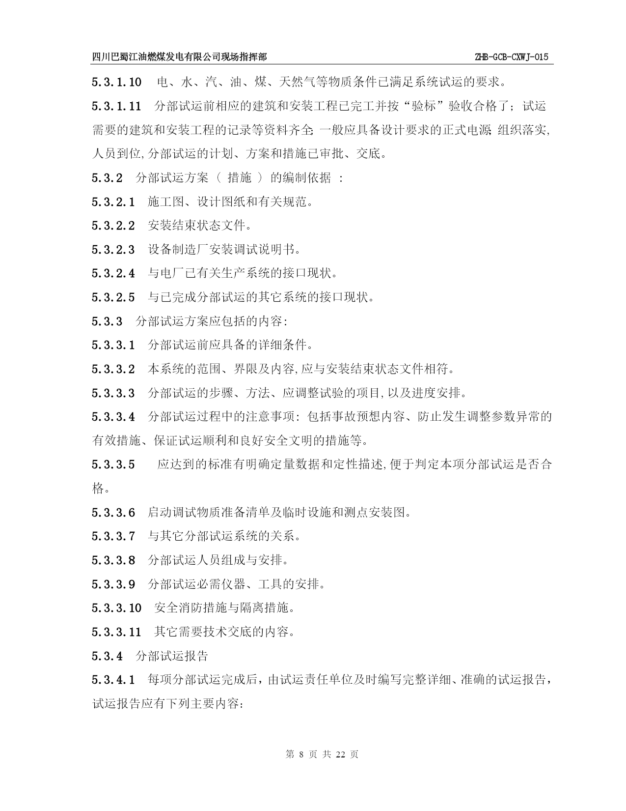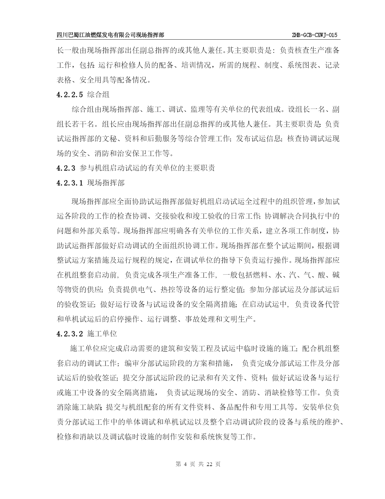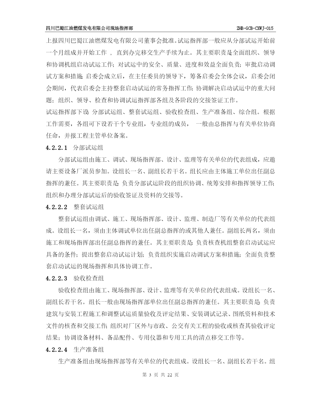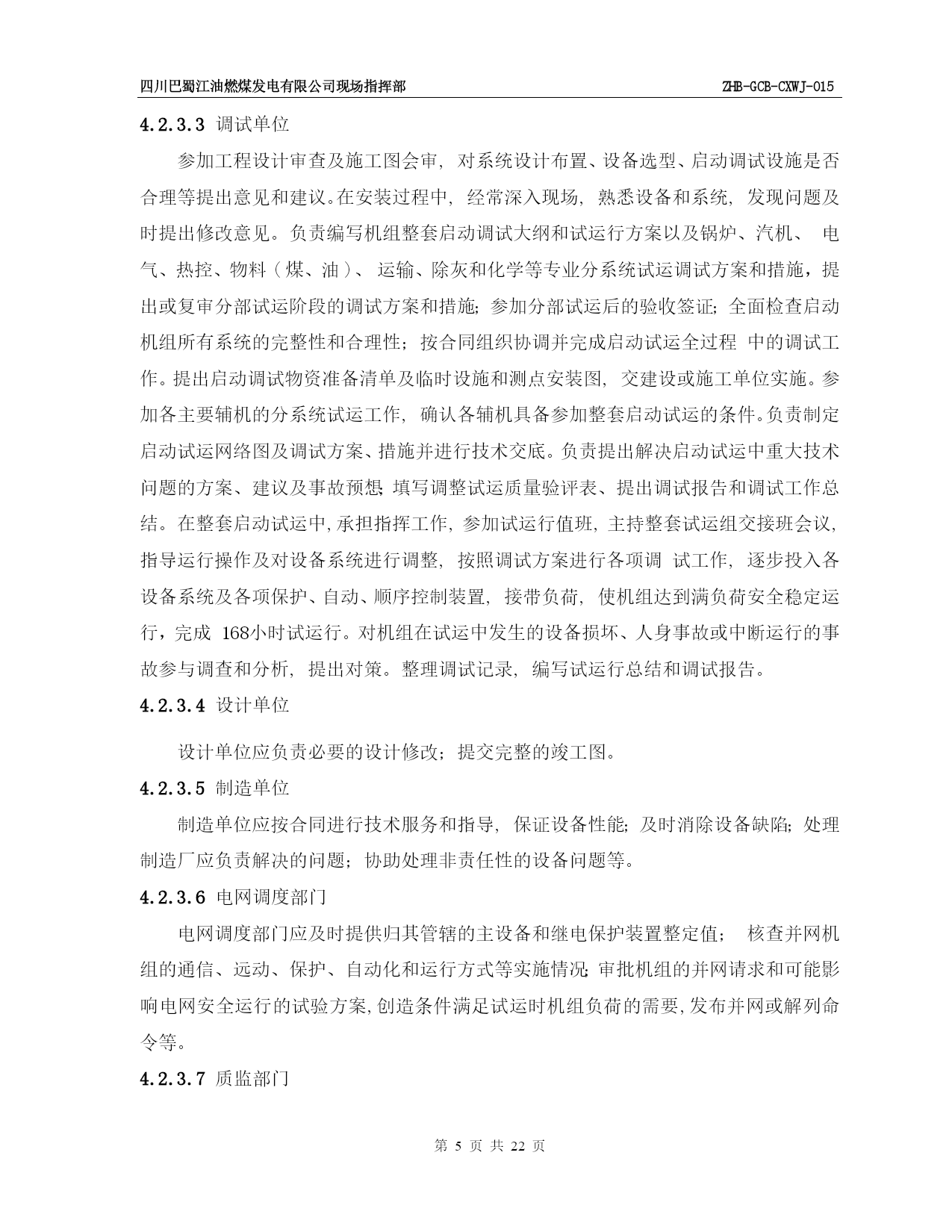 四川巴蜀江油燃煤发电有限公司现场指挥部ZHB-GCB-CXWJ-015PAGE第PAGE20页共NUMPAGES22页启动调试管理程序编制目的为了加强本工程调试工作的管理,明确参与调试各部门的任务和职责范围,提高调试工作水平,顺利完成本工程的调试工作,根据《火力发电厂基本建设工程启动及竣工验收规程(1996年版)》、《火电工程启动调试工作规定》和《火电工程重点项目质量监督检验大纲》制定本管理程序。定义启动调试:是机组在安装完毕后对各设备和系统进行试验、调整、养护等,以及对其健康状况进行动、静态检验的全面的、系统的工作。它分为分部试运调试与整套启动试运调试。分部试运:是对单体设备和分部系统进行调试,检验单机和分系统设备性能是否符合规范要求并进行优化调整。整套启动试运:是对整套机组进行全面调整、试验,它分为空负荷调试、带负荷调试和满负荷调试。应用范围四川巴蜀江油2×30OMW燃煤机组工程机组的整个启动调试过程。总则通则4.1.l启动调试工作是火电基本建设工程的一个关键阶段,基本任务是使新安装机组安全顺利地完成整套启动并移交生产。投产后能安全稳定运行,形成生产能力,发挥投资效益。机组的启动试运是全面检查主机及其配套系统的设备制造、设计、施工、调试和生产准备的重要环节,是保证机组能安全、可靠、经济、文明地投入生产,形成生产能力,发挥投资效益的关键性程序。启动调试工作要按国家标准和规程、规范及设备文件的要求进行。调试单位要在启动试运指挥部的领导下,根据设计和设备的特点,合理组织、协调、实施启动试运工作,确保启动调试工作的安全和质量。机组的启动试运及其各阶段的交接验收,应在试运指挥部的领导下进行。整套启动试运阶段的工作,必须由启动验收委员会(以下简称“启委会”)进行审议、决策。启动调试工作分为分部试运调试与整套启动试运调试。其中分部试运中的分系统试运与整套启动试运的调试工作应由调试单位承担。分系统试运必须在单体调试和单机试运合格签证后进行。本工程的启动调试工作应由具有相当资质等级的调试单位承担。机组的启动试运及其各阶段的交接验收和工程的竣工验收,必须以批准文件、设计图纸、设备合同,国电公司及国家颁发的有关火电建设的现行标准、规程和法规等为依据。本机组应按基建移交生产达标机组的标准进行考核。本机组整套启动前、后应按《火电工程整套启动试运前质量监督检查典型大纲》和《火电工程整套启动试运后质量监督检查典型大纲》进行检查。机组启动试运阶段的调试工作,应按国家电力公司颁发的“火电工程启动调试工作规定”(以下简称“调试规定”)进行。机组启动试运的验收评定应按国家电力公司颁发的“火电工程调整试运质量检验及评定标准”(以下简称“验标”)进行。组织分工4.2.1启动验收委员会启动验收委员会(简称启委会)由投资方、现场指挥部、质监、锅监、监理、施工、调试、设计、电网调度、制造厂等有关单位的代表组成。设主任委员一名、副主任委员和委员若干名。由现场指挥部与有关单位协商,提出组成人员名单,上报有关部门批准。启委会必须在整套启动前组成并开始工作。启委会应在机组整套启动试运前,审议试运指挥部有关机组整套启动准备情况的汇报、协调整套启动的外部条件、决定机组整套启动的时间和其它有关事宜;在完成整套启动试运后审议试运指挥部有关整套启动试运和交接验收情况的汇报、协调整套启动试运后的末完事项、办理交接手续。4.2.2试运指挥部试运指挥部由总指挥和副总指挥组成。设总指挥一名,由四川巴蜀江油燃煤发电有限公司董事会任命。副总指挥若干名,由总指挥与有关单位协商,提出任职人员名单,上报四川巴蜀江油燃煤发电有限公司董事会批准。试运指挥部一般应从分部试运开始前一个月组成并开始工作,直到办完移交生产手续为止。其主要职责是:全面组织、领导和协调机组启动试运工作;对试运中的安全、质量、进度和效益全面负责;审批启动调试方案和措施;启委会成立后,在主任委员的领导下,筹备启委会全体会议,启委会闭会期间,代表启委会主持整套启动试运的常务指挥工作;协调解决启动试运中的重大问题;组织、领导、检查和协调试运指挥部各组及各阶段的交接签证工作。试运指挥部下设:分部试运组、整套试运组、验收检查组、生产准备组、综合组。根据工作需要,各组可下设若干个专业组,专业组的成员,一般由总指挥与有关单位协商任命,并报工程主管单位备案。4.2.2.1分部试运组分部试运组由施工、调试、现场指挥部、设计、监理等有关单位的代表组成,应邀请主要设备厂派员参加。设组长一名、副组长若干名。组长应由主体施工单位出任副总指挥的兼任。其主要职责是:负责分部试运阶段的组织协调、统筹安排和指挥领导工作;组织和办理分部试运后的验收签证及资料的交接等。4.2.2.2整套