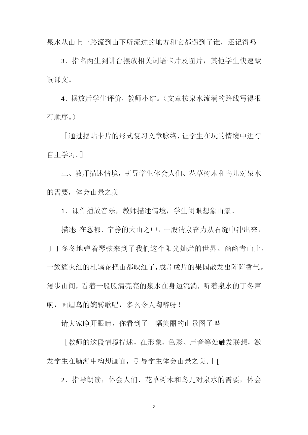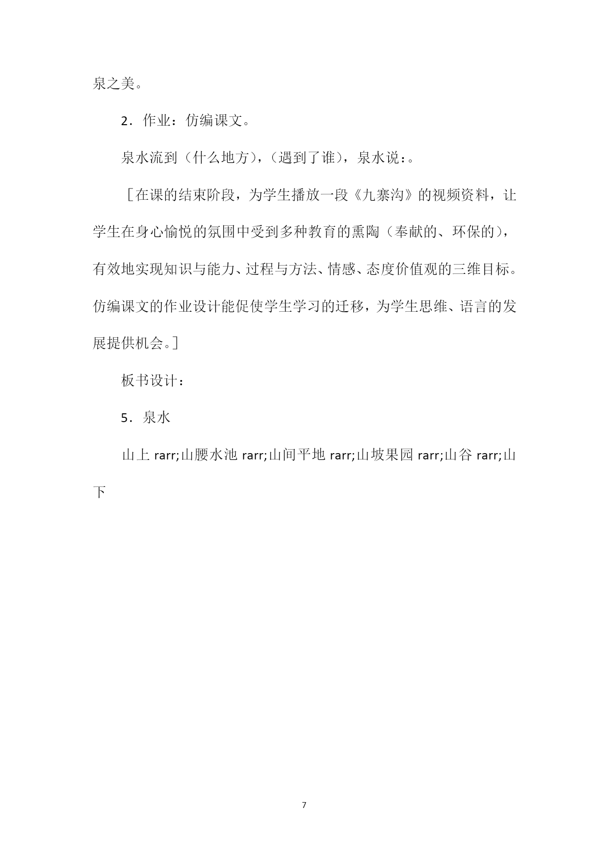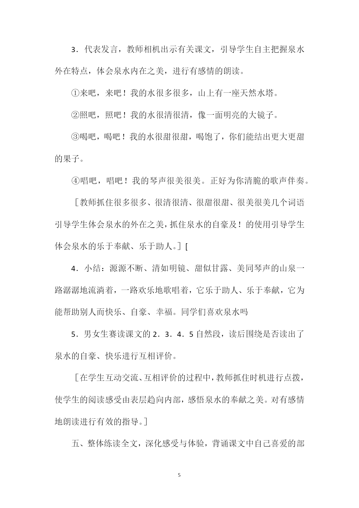 PAGEPAGE7《泉水》教学设计三一、导入谈话上节课我们初步学习了第5课《泉水》。这一课要求我们会认的字大家记熟了吗二、复习1.课件出示下列词语认读:石缝清泉天然水塔瓦罐歌声①齐读。②提问:课文中的天然水塔指的是什么[在情境图上复现词语,既检查学生识记生字的情况,又使字的形、义与情境图密切结合。]2.课件出示下列词语认读:冲出石缝一股泉水一座天然水塔提着瓦罐清脆的歌声①指名领读。②再读清脆的歌声,在比较朗读中进一步了解词语意思。[两次认读词语的不同,是为了引导学生感悟语言文字的精妙,积累词语。]小结上一节课的认字学词任务完成情况。检查学生初读课文情况:泉水从山上一路流到山下所流过的地方和它都遇到了谁,还记得吗3.指名两生到讲台摆放相关词语卡片及图片,其他学生快速默读课文。4.摆放后学生评价,教师小结。(文章按泉水流淌的路线写得很有顺序。)[通过摆贴卡片的形式复习文章脉络,让学生在玩的情境中进行自主学习。]三、教师描述情境,引导学生体会人们、花草树木和鸟儿对泉水的需要,体会山景之美1.课件播放音乐,教师描述情境,学生闭眼想象山景。描述:在葱郁、宁静的大山之中,一股清泉奋力从石缝中冲出来,丁丁冬冬地弹着琴弦来到了我们这个阳光灿烂的世界。幽幽青山上,一簇簇火红的杜鹃花把山都映红了,成片成片的果园散发出阵阵香气。漫步山间,看着一股股清亮亮的泉水在身边流淌,听着泉水的丁冬声响,画眉鸟的婉转歌唱,多么令人陶醉呀!请大家睁开眼睛,你看到了一幅美丽的山景图了吗[教师的这段情境描述,在形象、色彩、声音等处触发联想,激发学生在脑海中构想画面,引导学生体会山景之美。][2.指导朗读,体会人们、花草树木和鸟儿对泉水的需要,体会山景之美。①六个小组轮读全文,比比看哪一组读出来的山景最美。②教师进行评价,并通过指导感受、理解下列词语,指导读好词语所在句子,体会人们、花草树木和鸟儿对泉水的需要,体会山景之美。火红的杜鹃花A.齐读词语。B.指导想象像火一样红的情景后,读泉水流过山间的平地,火红的杜鹃花照见了自己美丽的身影一句。C.引导体验:火红的杜鹃花们,你们喜欢泉水吗,为什么(引导体会杜鹃花对泉水的需要)大口大口地喝水A.读词并做动作。B.交流:果树为什么要大口大口地喝水C.指导读泉水流到山坡的果园里,果树大口大口地喝水一句,体会果树对泉水的需要。尽情地歌唱A.指名读泉水穿过静静的山谷,画眉鸟在尽情地歌唱一句。B.指名赛读,看谁的朗读最能不受约束地表达快乐的心情。C.引导体验:画眉鸟为什么唱得那么欢快(引导体会画眉鸟对泉水的需要)小结朗读情况。[《语文课程标准》低年级阅读目标之一:结合上下文和生活实际了解课文中词句的意思,在阅读中积累词语。本环节的设计旨在通过引导学生对修饰性词语的认真体会、理解、积累等,指导学生有感情地朗读课文,方法虽然简单,但却能调动学生情绪,能收到好的效果(让学生想象情境读、做做动作读)]四、教师引导学生自主把握泉水外在特点,体会泉水内在之美。1.课件播放连续性动画,教师引读泉水说的话。[配乐动画加字幕的课件,能调动学生多种感官参与学习。学生一边听,一边回答教师提出的问题,在不知不觉中进入学习的新环节。]2.讨论,交流:请再读一读泉水说的话,你觉得泉水怎么样六人小组讨论,交流。[《语文课程标准》在低年级阅读目标中指出:阅读浅近的童话、寓言、故事,向往美好的情境,关心自然和生命,对感兴趣的人物和事件有自己的感受和想法,并乐于与人交流。本环节的设计便缘于此,促使学生在畅谈自己感受的互动交流中逐步获得深层的理解与感受。]3.代表发言,教师相机出示有关课文,引导学生自主把握泉水外在特点,体会泉水内在之美,进行有感情的朗读。①来吧,来吧!我的水很多很多,山上有一座天然水塔。②照吧,照吧!我的水很清很清,像一面明亮的大镜子。③喝吧,喝吧!我的水很甜很甜,喝饱了,你们能结出更大更甜的果子。④唱吧,唱吧!我的琴声很美很美。正好为你清脆的歌声伴奏。[教师抓住很多很多、很清很清、很甜很甜、很美很美几个词语引导学生体会泉水的外在之美,抓住泉水的自豪及!的使用引导学生体会泉水的乐于奉献、乐于助人。][4.小结:源源不断、清如明镜、甜似甘露、美同琴声的山泉一路潺潺地流淌着,一路欢乐地歌唱着,它乐于助人、乐于奉献,它为能帮助别人而快乐、自豪、幸福。同学们喜欢泉水吗5.男女生赛读课文的2.3.4.5自然段,读后围绕是否读出了泉水的自豪、快乐进行互相评价。[在学生互动交流、互相评价的过程中,教师抓住时机进行点拨,使学生的阅读感受由表层趋向内部,感悟泉水的奉献之美。对有感情地朗读进行有效的指导。]五、整体练读全文,深化感受与体验