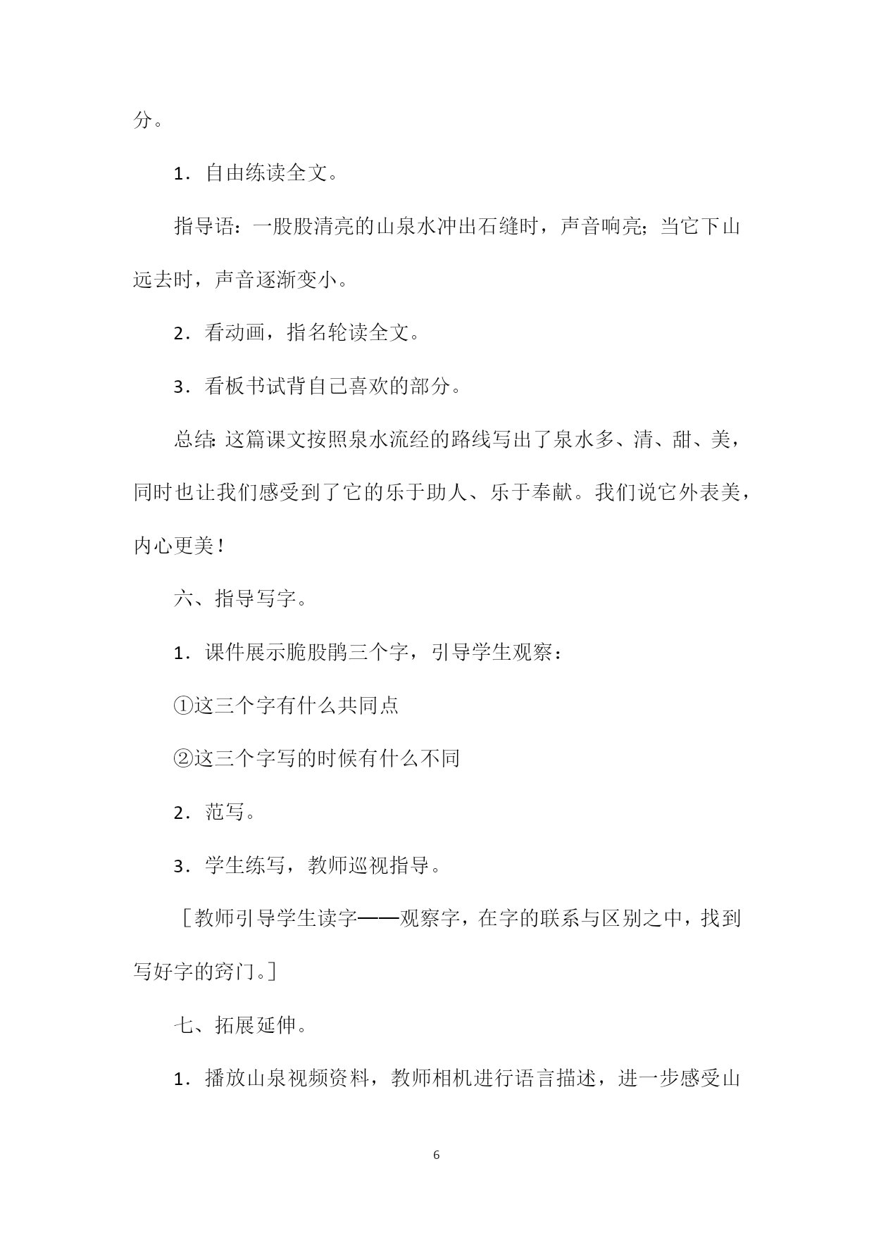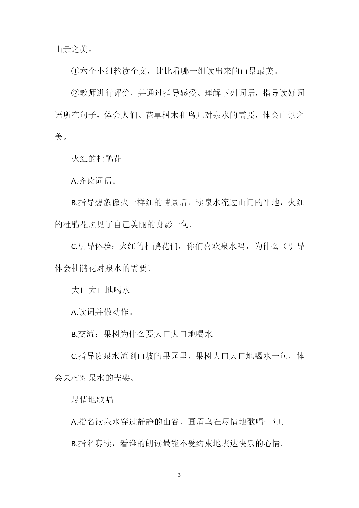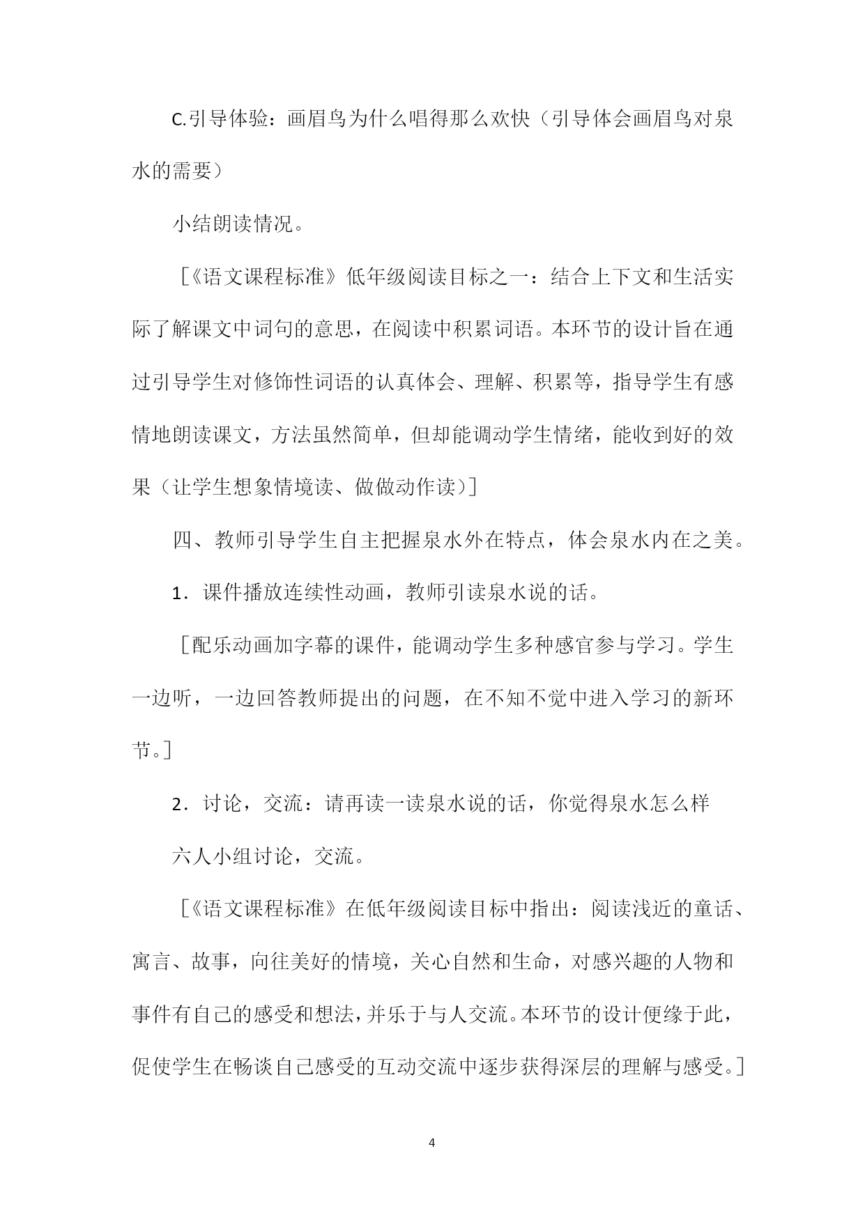 PAGEPAGE7《泉水》教学设计三一、导入谈话上节课我们初步学习了第5课《泉水》。这一课要求我们会认的字大家记熟了吗二、复习1.课件出示下列词语认读:石缝清泉天然水塔瓦罐歌声①齐读。②提问:课文中的天然水塔指的是什么[在情境图上复现词语,既检查学生识记生字的情况,又使字的形、义与情境图密切结合。]2.课件出示下列词语认读:冲出石缝一股泉水一座天然水塔提着瓦罐清脆的歌声①指名领读。②再读清脆的歌声,在比较朗读中进一步了解词语意思。[两次认读词语的不同,是为了引导学生感悟语言文字的精妙,积累词语。]小结上一节课的认字学词任务完成情况。检查学生初读课文情况:泉水从山上一路流到山下所流过的地方和它都遇到了谁,还记得吗3.指名两生到讲台摆放相关词语卡片及图片,其他学生快速默读课文。4.摆放后学生评价,教师小结。(文章按泉水流淌的路线写得很有顺序。)[通过摆贴卡片的形式复习文章脉络,让学生在玩的情境中进行自主学习。]三、教师描述情境,引导学生体会人们、花草树木和鸟儿对泉水的需要,体会山景之美1.课件播放音乐,教师描述情境,学生闭眼想象山景。描述:在葱郁、宁静的大山之中,一股清泉奋力从石缝中冲出来,丁丁冬冬地弹着琴弦来到了我们这个阳光灿烂的世界。幽幽青山上,一簇簇火红的杜鹃花把山都映红了,成片成片的果园散发出阵阵香气。漫步山间,看着一股股清亮亮的泉水在身边流淌,听着泉水的丁冬声响,画眉鸟的婉转歌唱,多么令人陶醉呀!请大家睁开眼睛,你看到了一幅美丽的山景图了吗[教师的这段情境描述,在形象、色彩、声音等处触发联想,激发学生在脑海中构想画面,引导学生体会山景之美。][2.指导朗读,体会人们、花草树木和鸟儿对泉水的需要,体会山景之美。①六个小组轮读全文,比比看哪一组读出来的山景最美。②教师进行评价,并通过指导感受、理解下列词语,指导读好词语所在句子,体会人们、花草树木和鸟儿对泉水的需要,体会山景之美。火红的杜鹃花A.齐读词语。B.指导想象像火一样红的情景后,读泉水流过山间的平地,火红的杜鹃花照见了自己美丽的身影一句。C.引导体验:火红的杜鹃花们,你们喜欢泉水吗,为什么(引导体会杜鹃花对泉水的需要)大口大口地喝水A.读词并做动作。B.交流:果树为什么要大口大口地喝水C.指导读泉水流到山坡的果园里,果树大口大口地喝水一句,体会果树对泉水的需要。尽情地歌唱A.指名读泉水穿过静静的山谷,画眉鸟在尽情地歌唱一句。B.指名赛读,看谁的朗读最能不受约束地表达快乐的心情。C.引导体验:画眉鸟为什么唱得那么欢快(引导体会画眉鸟对泉水的需要)小结朗读情况。[《语文课程标准》低年级阅读目标之一:结合上下文和生活实际了解课文中词句的意思,在阅读中积累词语。本环节的设计旨在通过引导学生对修饰性词语的认真体会、理解、积累等,指导学生有感情地朗读课文,方法虽然简单,但却能调动学生情绪,能收到好的效果(让学生想象情境读、做做动作读)]四、教师引导学生自主把握泉水外在特点,体会泉水内在之美。1.课件播放连续性动画,教师引读泉水说的话。[配乐动画加字幕的课件,能调动学生多种感官参与学习。学生一边听,一边回答教师提出的问题,在不知不觉中进入学习的新环节。]2.讨论,交流:请再读一读泉水说的话,你觉得泉水怎么样六人小组讨论,交流。[《语文课程标准》在低年级阅读目标中指出:阅读浅近的童话、寓言、故事,向往美好的情境,关心自然和生命,对感兴趣的人物和事件有自己的感受和想法,并乐于与人交流。本环节的设计便缘于此,促使学生在畅谈自己感受的互动交流中逐步获得深层的理解与感受。]3.代表发言,教师相机出示有关课文,引导学生自主把握泉水外在特点,体会泉水内在之美,进行有感情的朗读。①来吧,来吧!我的水很多很多,山上有一座天然水塔。②照吧,照吧!我的水很清很清,像一面明亮的大镜子。③喝吧,喝吧!我的水很甜很甜,喝饱了,你们能结出更大更甜的果子。④唱吧,唱吧!我的琴声很美很美。正好为你清脆的歌声伴奏。[教师抓住很多很多、很清很清、很甜很甜、很美很美几个词语引导学生体会泉水的外在之美,抓住泉水的自豪及!的使用引导学生体会泉水的乐于奉献、乐于助人。][4.小结:源源不断、清如明镜、甜似甘露、美同琴声的山泉一路潺潺地流淌着,一路欢乐地歌唱着,它乐于助人、乐于奉献,它为能帮助别人而快乐、自豪、幸福。同学们喜欢泉水吗5.男女生赛读课文的2.3.4.5自然段,读后围绕是否读出了泉水的自豪、快乐进行互相评价。[在学生互动交流、互相评价的过程中,教师抓住时机进行点拨,使学生的阅读感受由表层趋向内部,感悟泉水的奉献之美。对有感情地朗读进行有效的指导。]五、整体练读全文,深化感受与体验