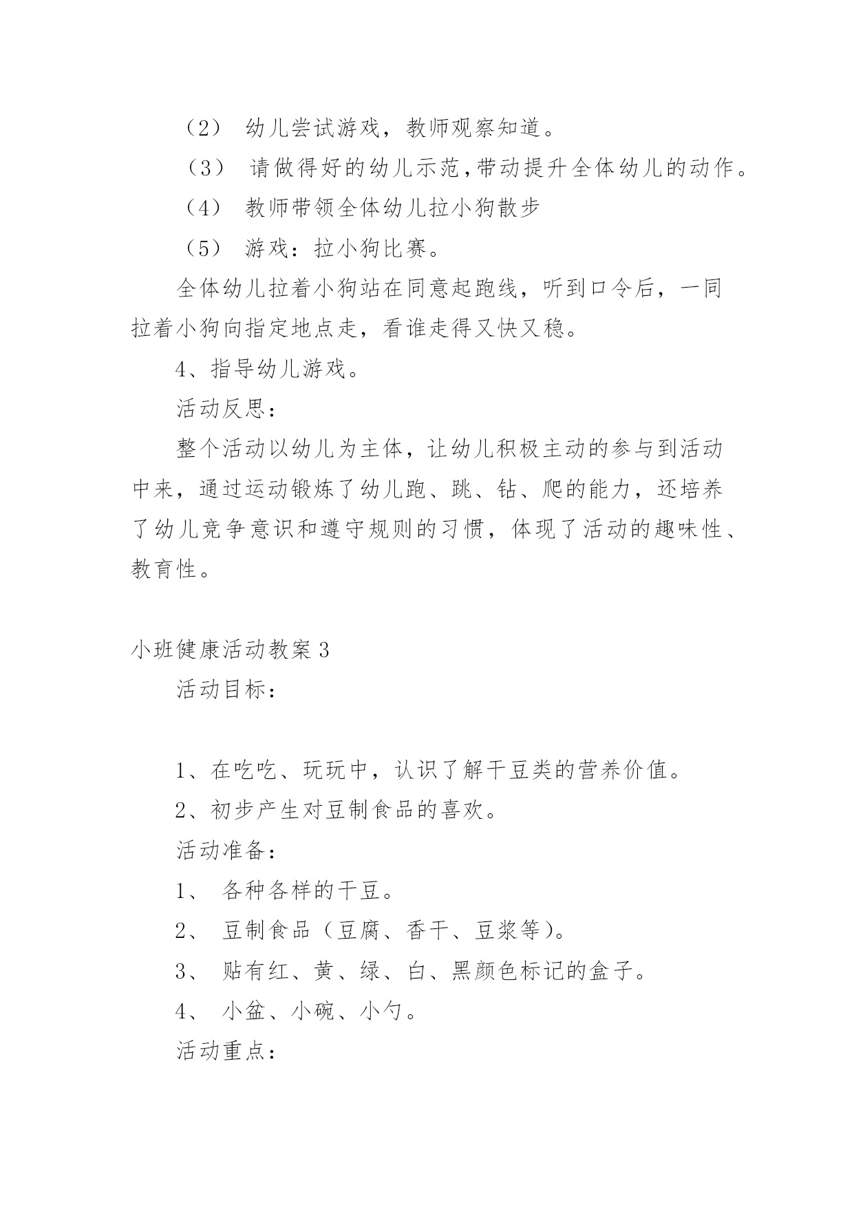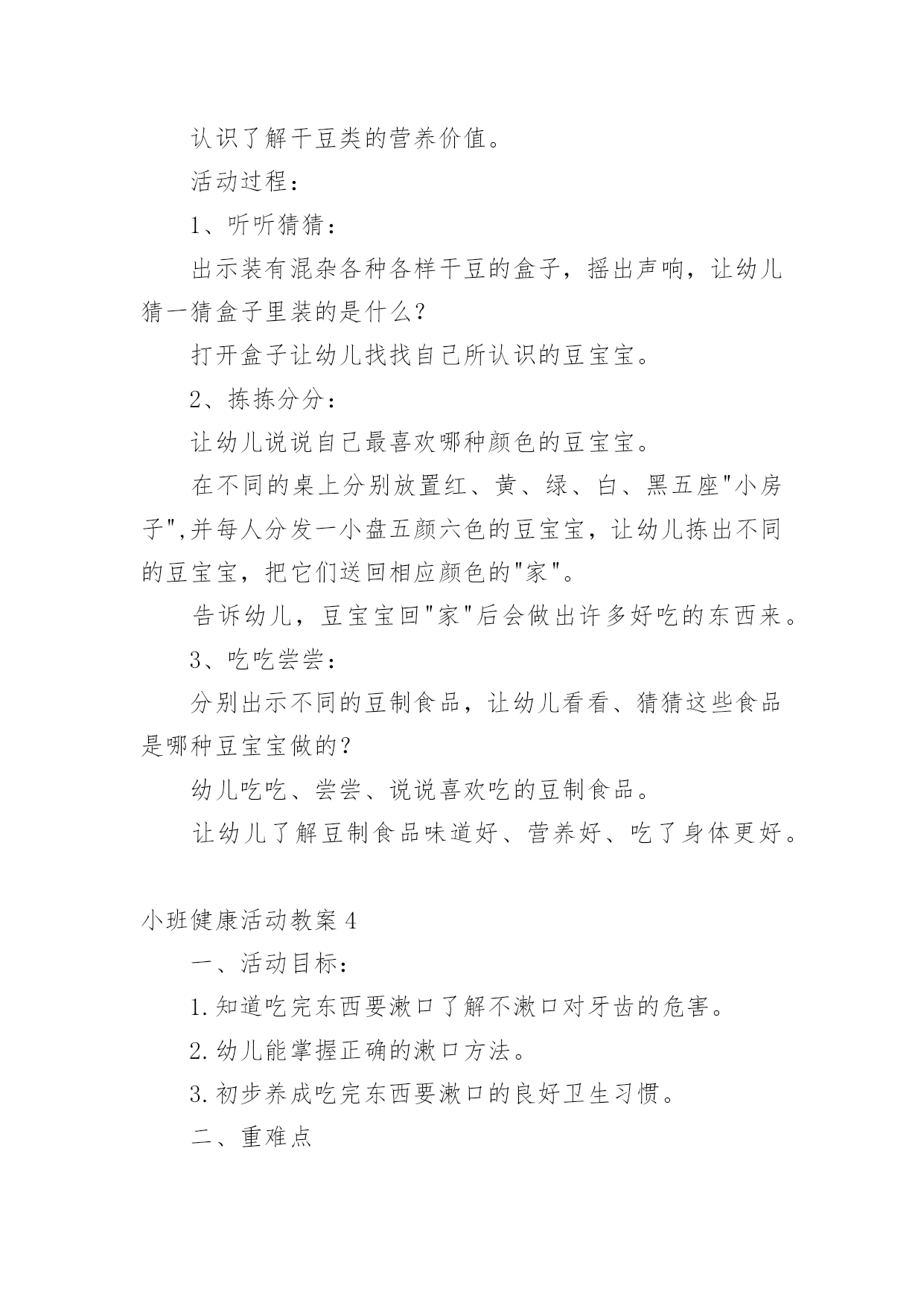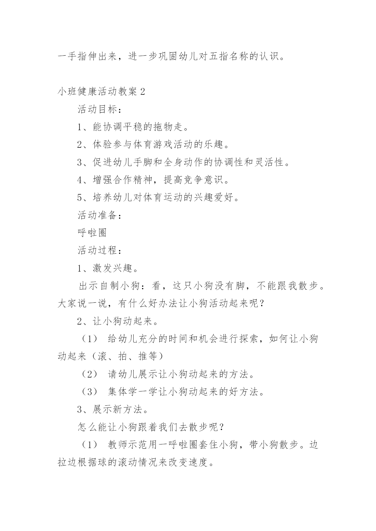 小班健康活动教案作为一名人民教师,常常要根据教学需要编写教案,编写教案有利于我们准确把握教材的重点与难点,进而选择恰当的教学方法。教案应该怎么写呢?下面是小编帮大家整理的小班健康活动教案,仅供参考,欢迎大家阅读。小班健康活动教案1一、活动目标1、引导幼儿了解销售各组成部分的名称,知道自己的事情自己做。2、引导幼儿知道小手能做很多事情,初步掌握保护小手的方法。3、让幼儿喜欢活动小手,体验操作销小手的快乐。二、活动准备1、手指律动《五根手指头》2、指偶若干3、爱护小手的图片三、活动过程1、教师带领幼儿做手指律动《五根手指头》,激发幼儿的兴趣,引出今日的主题。2、教师引导幼儿了解小手的组成部分以及各手指的名称。(1)请你伸出你的小手来,数数你有几根手指头。(2)五根手指是一样长的吗?哪根最短?哪根最长?(3)五根手指头的粗细是一样的吗?哪根最粗?哪根最细?(4)我们来认识一下手指一家吧!3、儿歌拇指一家大拇指是爸爸,爸爸喜欢夸奖我。食指是妈妈,妈妈喜欢亲亲我。中指是哥哥,哥哥喜欢牵着我。无名指是姐姐,姐姐喜欢抱抱我。小小指头就是我,我喜欢你们都爱我。4、教师带有而做手指戴帽,巩固幼儿对手指名称的认识。游戏规则:教师说任一手指的名字,幼儿取指偶戴在相应手指上,教师将指偶分别戴在五个手指上,请幼儿轮流说出:老师把××戴在××指上。5、教师出示图片,进入生活百事通缓解,启发幼儿讨论小手的作用。(1)画面中的小手在做什么?(2)你能试着做出相同的手势吗?你会做其他手势吗?(3)想一想,你的小手还能做哪些事情呢?(4)我的小手还可以穿衣服,洗脸、拿勺子、拿画笔、弹钢琴。6、教师引导幼儿明白自己的事情需要自己处理。每一位小朋友都有一双小手,小手能做的事情那么多,以后你们也要自己穿衣服、自己拿勺子吃饭…你们能做到自己的事情自己做吗?7、教师引导幼儿了解保护小手的方法。(1)我们应该怎么样保护小手,使小手不受到伤害呢?(2)饭前便后要把小手洗干净,勤剪指甲,不咬手指,冬天戴上小手套等。四、活动延伸教师带领幼儿到户外做手影游戏,体验小手更多有趣的用处。五、资料库五根手指头一根手指变变变,变成一条毛毛虫,扭扭扭。两根手指变变变,变成一只小白兔,跳跳跳。三根手指变变变,变成一只小花猫,喵喵喵。四根手指变变变,变成一只小乌龟,爬爬爬。五根手指变变变,变成一只花蝴蝶,飞飞飞。六、活动总结每一位小朋友都有一双小手,小手能做的事情那么多,我的小手还可以穿衣服,洗脸、拿勺子、拿画笔、弹钢琴。以后你们也要自己穿衣服、自己拿勺子吃饭…你们能做到自己的事情自己做吗?认识手指名称缓解可以添加游戏手指一家睡醒了,即五指握拳,听命令,教师说到××手指睡醒的时候,幼儿将这一手指伸出来,进一步巩固幼儿对五指名称的认识。小班健康活动教案2活动目标:1、能协调平稳的拖物走。2、体验参与体育游戏活动的乐趣。3、促进幼儿手脚和全身动作的协调性和灵活性。4、增强合作精神,提高竞争意识。5、培养幼儿对体育运动的兴趣爱好。活动准备:呼啦圈活动过程:1、激发兴趣。出示自制小狗:看,这只小狗没有脚,不能跟我散步。大家说一说,有什么好办法让小狗活动起来呢?2、让小狗动起来。(1)给幼儿充分的时间和机会进行探索,如何让小狗动起来(滚、拍、推等)(2)请幼儿展示让小狗动起来的方法。(3)集体学一学让小狗动起来的好方法。3、展示新方法。怎么能让小狗跟着我们去散步呢?(1)教师示范用一呼啦圈套住小狗,带小狗散步。边拉边根据球的滚动情况来改变速度。(2)幼儿尝试游戏,教师观察知道。(3)请做得好的幼儿示范,带动提升全体幼儿的动作。(4)教师带领全体幼儿拉小狗散步(5)游戏:拉小狗比赛。全体幼儿拉着小狗站在同意起跑线,听到口令后,一同拉着小狗向指定地点走,看谁走得又快又稳。4、指导幼儿游戏。活动反思:整个活动以幼儿为主体,让幼儿积极主动的参与到活动中来,通过运动锻炼了幼儿跑、跳、钻、爬的能力,还培养了幼儿竞争意识和遵守规则的习惯,体现了活动的趣味性、教育性。小班健康活动教案3活动目标:1、在吃吃、玩玩中,认识了解干豆类的营养价值。2、初步产生对豆制食品的喜欢。活动准备:1、各种各样的干豆。2、豆制食品(豆腐、香干、豆浆等)。3、贴有红、黄、绿、白、黑颜色标记的盒子。4、小盆、小碗、小勺。活动重点:认识了解干豆类的营养价值。活动过程:1、听听猜猜:出示装有混杂各种各样干豆的盒子,摇出声响,让幼儿猜一猜盒子里装的是什么?打开盒子让幼儿找找自己所认识的豆宝宝。2、拣拣分分:让幼儿说说自己最喜欢哪种颜色的豆宝宝。在不同的桌上分别放置红、黄、绿、白、黑五座"小房子",并每人分发一小盘五颜六色的豆宝宝,让幼儿拣出不同的豆宝宝,把它们送回相应颜色的"家"。告诉幼儿,豆宝宝回"家"后会做出许多好吃的东西来。3、吃吃尝尝:分