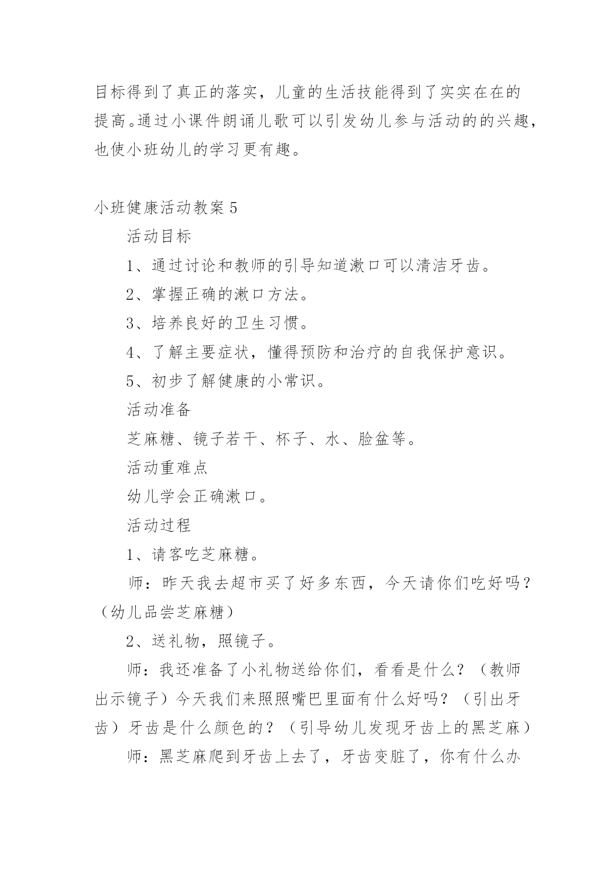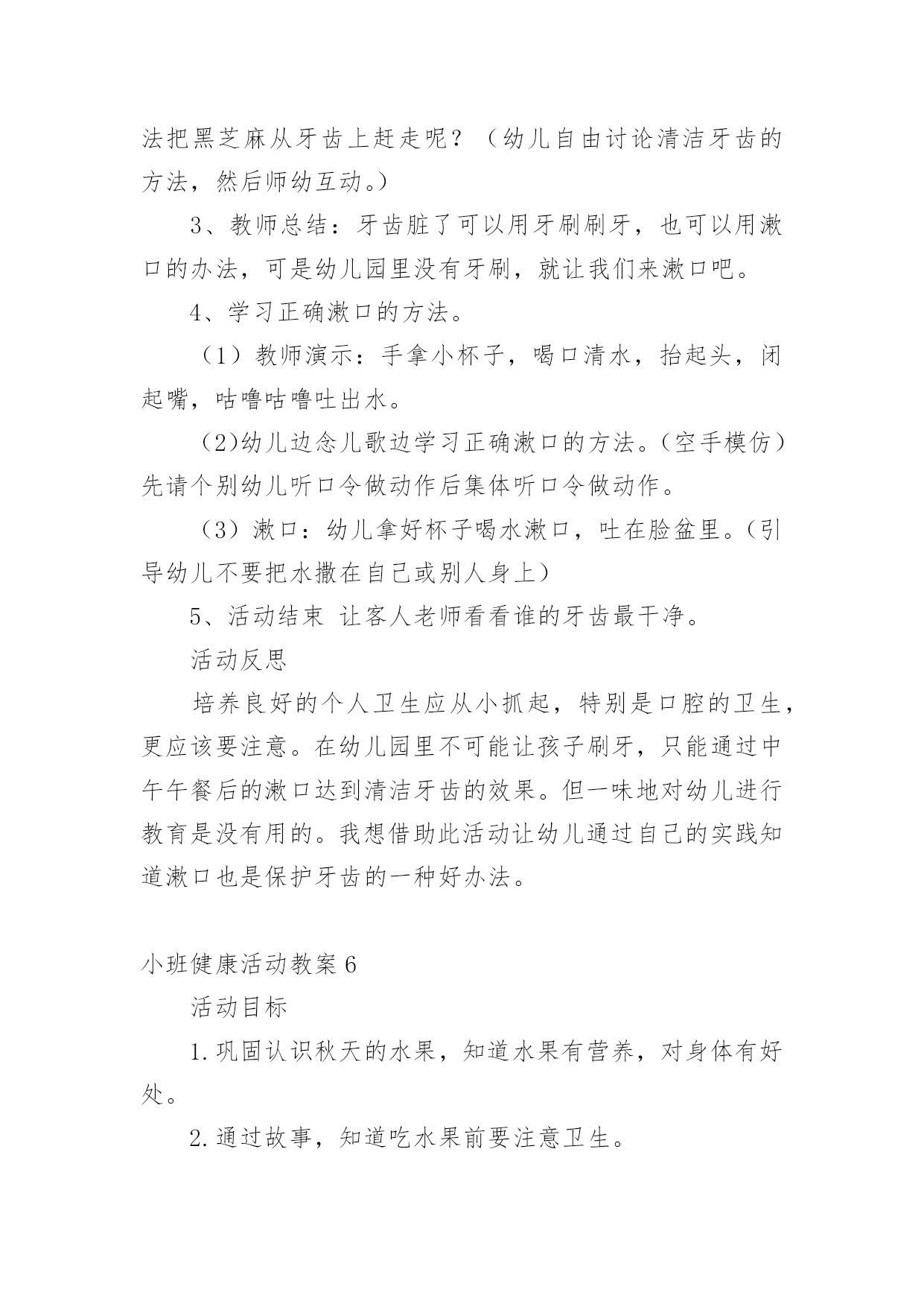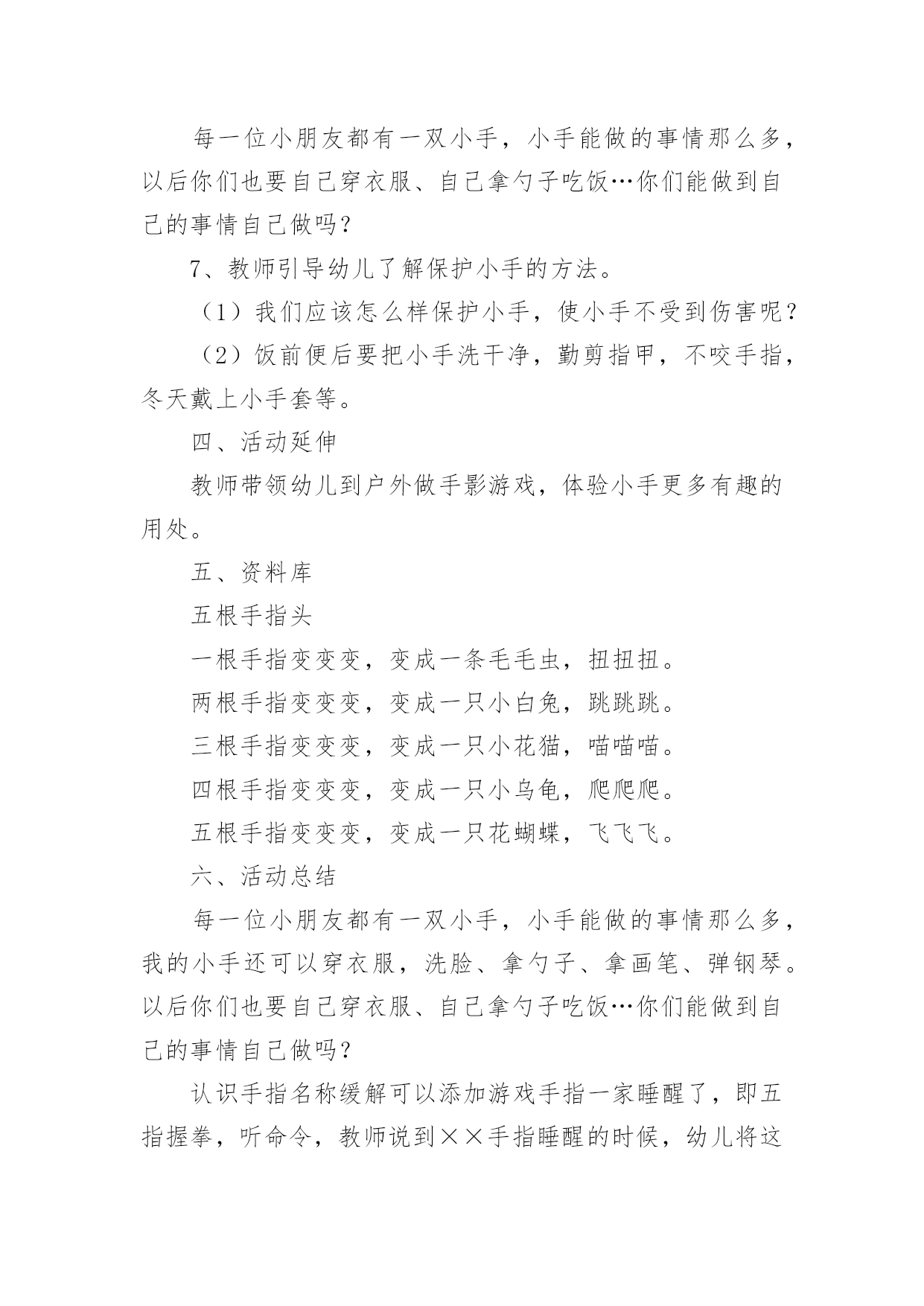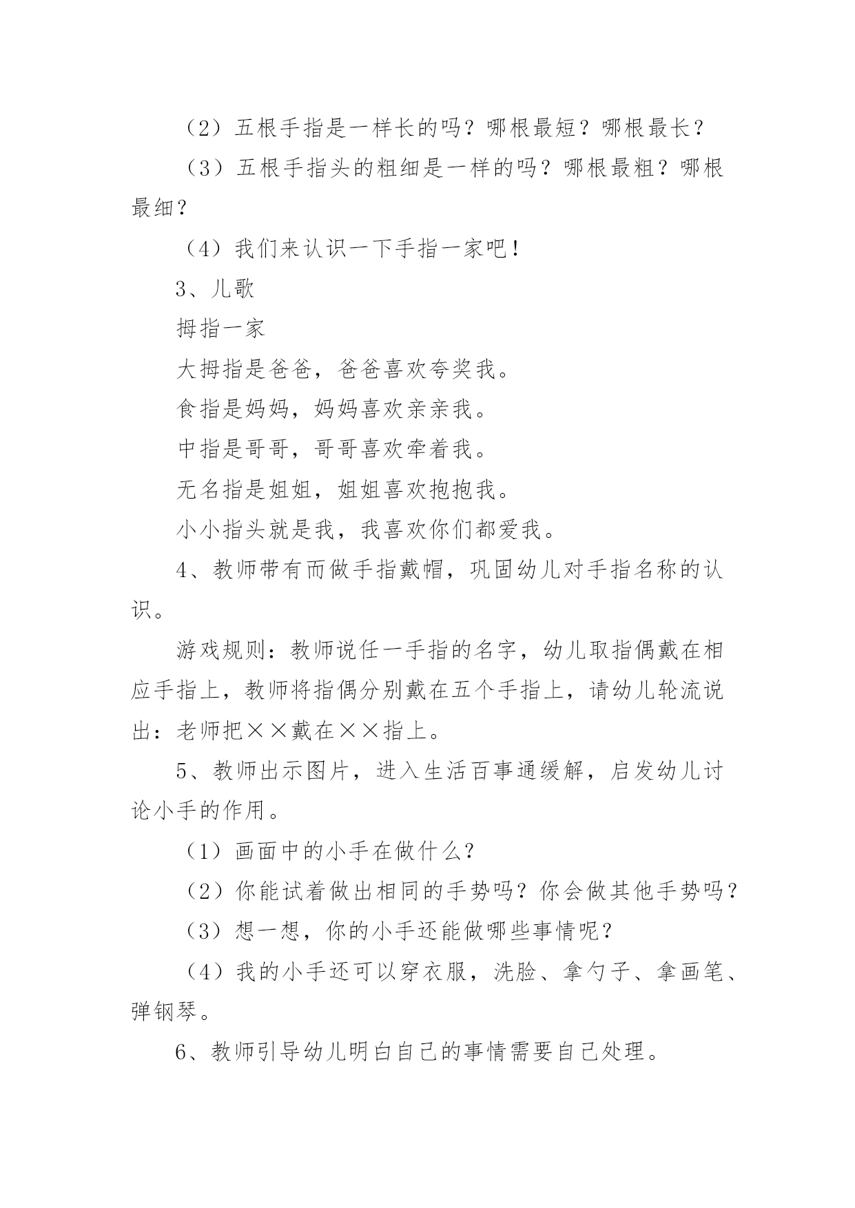 小班健康活动教案作为一名人民教师,常常要根据教学需要编写教案,编写教案有利于我们准确把握教材的重点与难点,进而选择恰当的教学方法。教案应该怎么写呢?下面是小编帮大家整理的小班健康活动教案,仅供参考,欢迎大家阅读。小班健康活动教案1一、活动目标1、引导幼儿了解销售各组成部分的名称,知道自己的事情自己做。2、引导幼儿知道小手能做很多事情,初步掌握保护小手的方法。3、让幼儿喜欢活动小手,体验操作销小手的快乐。二、活动准备1、手指律动《五根手指头》2、指偶若干3、爱护小手的图片三、活动过程1、教师带领幼儿做手指律动《五根手指头》,激发幼儿的兴趣,引出今日的主题。2、教师引导幼儿了解小手的组成部分以及各手指的名称。(1)请你伸出你的小手来,数数你有几根手指头。(2)五根手指是一样长的吗?哪根最短?哪根最长?(3)五根手指头的粗细是一样的吗?哪根最粗?哪根最细?(4)我们来认识一下手指一家吧!3、儿歌拇指一家大拇指是爸爸,爸爸喜欢夸奖我。食指是妈妈,妈妈喜欢亲亲我。中指是哥哥,哥哥喜欢牵着我。无名指是姐姐,姐姐喜欢抱抱我。小小指头就是我,我喜欢你们都爱我。4、教师带有而做手指戴帽,巩固幼儿对手指名称的认识。游戏规则:教师说任一手指的名字,幼儿取指偶戴在相应手指上,教师将指偶分别戴在五个手指上,请幼儿轮流说出:老师把××戴在××指上。5、教师出示图片,进入生活百事通缓解,启发幼儿讨论小手的作用。(1)画面中的小手在做什么?(2)你能试着做出相同的手势吗?你会做其他手势吗?(3)想一想,你的小手还能做哪些事情呢?(4)我的小手还可以穿衣服,洗脸、拿勺子、拿画笔、弹钢琴。6、教师引导幼儿明白自己的事情需要自己处理。每一位小朋友都有一双小手,小手能做的事情那么多,以后你们也要自己穿衣服、自己拿勺子吃饭…你们能做到自己的事情自己做吗?7、教师引导幼儿了解保护小手的方法。(1)我们应该怎么样保护小手,使小手不受到伤害呢?(2)饭前便后要把小手洗干净,勤剪指甲,不咬手指,冬天戴上小手套等。四、活动延伸教师带领幼儿到户外做手影游戏,体验小手更多有趣的用处。五、资料库五根手指头一根手指变变变,变成一条毛毛虫,扭扭扭。两根手指变变变,变成一只小白兔,跳跳跳。三根手指变变变,变成一只小花猫,喵喵喵。四根手指变变变,变成一只小乌龟,爬爬爬。五根手指变变变,变成一只花蝴蝶,飞飞飞。六、活动总结每一位小朋友都有一双小手,小手能做的事情那么多,我的小手还可以穿衣服,洗脸、拿勺子、拿画笔、弹钢琴。以后你们也要自己穿衣服、自己拿勺子吃饭…你们能做到自己的事情自己做吗?认识手指名称缓解可以添加游戏手指一家睡醒了,即五指握拳,听命令,教师说到××手指睡醒的时候,幼儿将这一手指伸出来,进一步巩固幼儿对五指名称的认识。小班健康活动教案2活动目标:1、能协调平稳的拖物走。2、体验参与体育游戏活动的乐趣。3、促进幼儿手脚和全身动作的协调性和灵活性。4、增强合作精神,提高竞争意识。5、培养幼儿对体育运动的兴趣爱好。活动准备:呼啦圈活动过程:1、激发兴趣。出示自制小狗:看,这只小狗没有脚,不能跟我散步。大家说一说,有什么好办法让小狗活动起来呢?2、让小狗动起来。(1)给幼儿充分的时间和机会进行探索,如何让小狗动起来(滚、拍、推等)(2)请幼儿展示让小狗动起来的方法。(3)集体学一学让小狗动起来的好方法。3、展示新方法。怎么能让小狗跟着我们去散步呢?(1)教师示范用一呼啦圈套住小狗,带小狗散步。边拉边根据球的滚动情况来改变速度。(2)幼儿尝试游戏,教师观察知道。(3)请做得好的幼儿示范,带动提升全体幼儿的动作。(4)教师带领全体幼儿拉小狗散步(5)游戏:拉小狗比赛。全体幼儿拉着小狗站在同意起跑线,听到口令后,一同拉着小狗向指定地点走,看谁走得又快又稳。4、指导幼儿游戏。活动反思:整个活动以幼儿为主体,让幼儿积极主动的参与到活动中来,通过运动锻炼了幼儿跑、跳、钻、爬的能力,还培养了幼儿竞争意识和遵守规则的习惯,体现了活动的趣味性、教育性。小班健康活动教案3活动目标:1、在吃吃、玩玩中,认识了解干豆类的营养价值。2、初步产生对豆制食品的喜欢。活动准备:1、各种各样的干豆。2、豆制食品(豆腐、香干、豆浆等)。3、贴有红、黄、绿、白、黑颜色标记的盒子。4、小盆、小碗、小勺。活动重点:认识了解干豆类的营养价值。活动过程:1、听听猜猜:出示装有混杂各种各样干豆的盒子,摇出声响,让幼儿猜一猜盒子里装的是什么?打开盒子让幼儿找找自己所认识的豆宝宝。2、拣拣分分:让幼儿说说自己最喜欢哪种颜色的豆宝宝。在不同的桌上分别放置红、黄、绿、白、黑五座"小房子",并每人分发一小盘五颜六色的豆宝宝,让幼儿拣出不同的豆宝宝,把它们送回相应颜色的"家"。告诉幼儿,豆宝宝回"家"后会做出许多好吃的东西来。3、吃吃尝尝:分