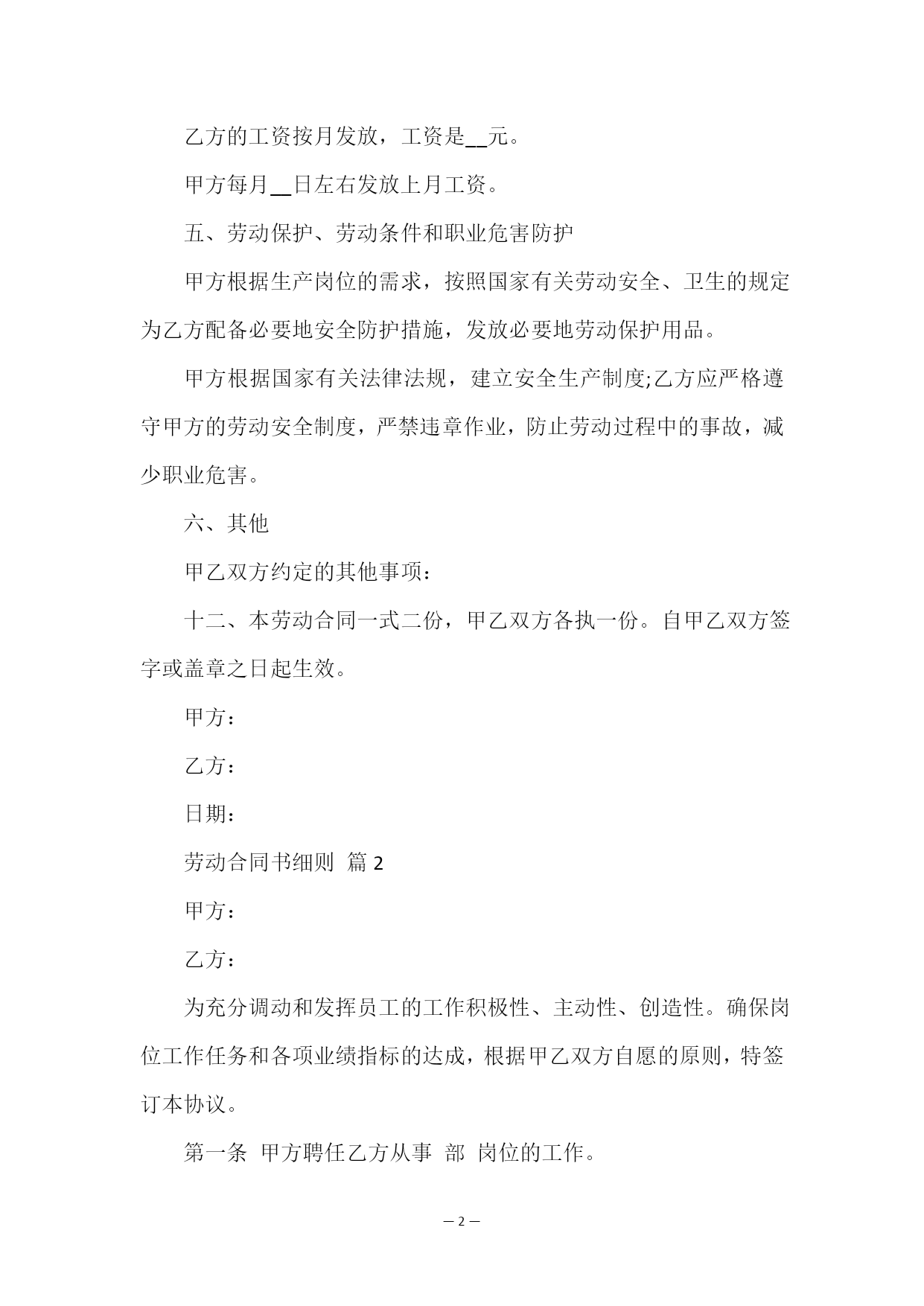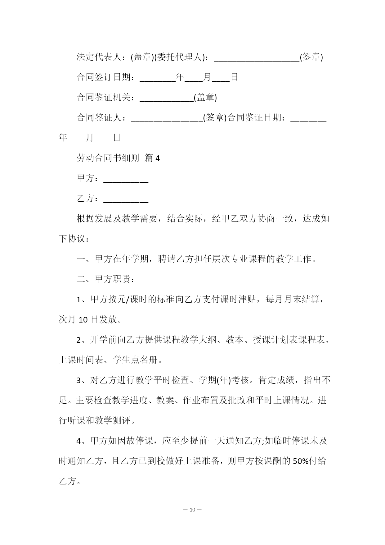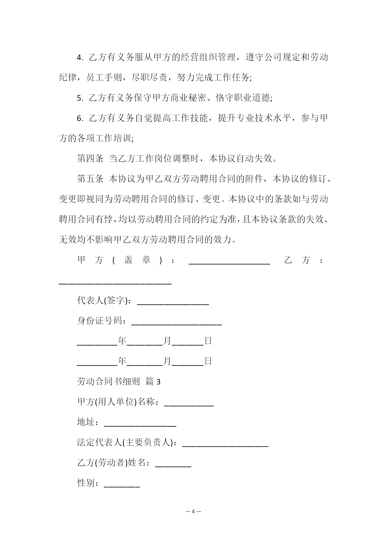 —PAGE\*MERGEFORMAT16—劳动合同法司法解释5篇在这种合同中,除双方当事人的意思表示一致之外,还必须有一方实际交付标的物的行为,才能产生法律效果。怎样写劳动合同书细则?下面我给大家带来劳动合同书细则5篇,仅供参考,希望大家喜欢!劳动合同书细则篇1甲方:乙方:根据《中华人民共和国劳动法》、《中华人民共和国劳动合同法》及其他有关法律法规规定,甲乙双方本着平等自愿、协商一致、合法公平、诚实信用的原则,订立本合同,并承诺共同遵守:一、合同期限自年月日起至年月日止,共__个月。二、工作内容和工作地点乙方从事岗位工作,乙方的工作地点。根据甲方工作需要,经双方协商同意,可以变更工作地点。乙方应按照甲方的要求,按时完成规定的工作数量,达到规定的质量标准,否则将追究责任人的责任。三、工作时间实行不定时工作制,工作时间甲乙双方协商安排。四、劳动报酬及支付时间乙方的工资按月发放,工资是__元。甲方每月__日左右发放上月工资。五、劳动保护、劳动条件和职业危害防护甲方根据生产岗位的需求,按照国家有关劳动安全、卫生的规定为乙方配备必要地安全防护措施,发放必要地劳动保护用品。甲方根据国家有关法律法规,建立安全生产制度;乙方应严格遵守甲方的劳动安全制度,严禁违章作业,防止劳动过程中的事故,减少职业危害。六、其他甲乙双方约定的其他事项:十二、本劳动合同一式二份,甲乙双方各执一份。自甲乙双方签字或盖章之日起生效。甲方:乙方:日期:劳动合同书细则篇2甲方:乙方:为充分调动和发挥员工的工作积极性、主动性、创造性。确保岗位工作任务和各项业绩指标的达成,根据甲乙双方自愿的原则,特签订本协议。第一条甲方聘任乙方从事部岗位的工作。聘任期自年月日起生效。第二条甲方的权利与义务1.甲方有权根据企业经营状况及经营目标与计划制定绩效考核方案。2.甲方有权对乙方的工作绩效进行考评,并依据考评结果对乙方进行相关人事调整,包括:1)核发乙方绩效工资;2)调整乙方薪酬,包括调整薪资结构、加薪、降薪等;3)兑现奖惩,包括表彰、奖励、处罚、通告等;4)调整乙方工作岗位,包括晋升、调岗、降职等;5)调整劳动合同关系,包括续聘、终止、解聘等。3.甲方有义务向乙方提供必需的工作条件;4.甲方有义务创造条件,提高乙方的政治思想素质和业务技术水平;第三条乙方的权利与义务1.乙方认同并接受甲方的工作安排,乙方确认对甲方的各项规章制度及该岗位工作职责已充分了解,并能正确履行权利与义务。(附:《岗位说明书》)2.乙方接受甲方的绩效考核制度,该岗位的岗位工资(含绩效工资),试用期为(大写:),转正后为(大写:);3.乙方享有参加与本岗位工作密切相关的业务培训、提出合理化建议的权利;4.乙方有义务服从甲方的经营组织管理,遵守公司规定和劳动纪律,员工手则,尽职尽责,努力完成工作任务;5.乙方有义务保守甲方商业秘密、恪守职业道德;6.乙方有义务自觉提高工作技能,提升专业技术水平,参与甲方的各项工作培训;第四条当乙方工作岗位调整时,本协议自动失效。第五条本协议为甲乙双方劳动聘用合同的附件,本协议的修订、变更即视同为劳动聘用合同的修订、变更。本协议中的条款如与劳动聘用合同有悖,均以劳动聘用合同的约定为准,且本协议条款的失效、无效均不影响甲乙双方劳动聘用合同的效力。甲方(盖章):__________________乙方:_________________________代表人(签字):________________身份证号码:_____________________________年________月_______日_________年________月_______日劳动合同书细则篇3甲方(用人单位)名称:___________地址:________________法定代表人(主要负责人):___________________乙方(劳动者)姓名:________性别:________年龄:________身份证号码:______________现在住址:________________________根据《中华人民共和国劳动法》和《中华人民共和国私营企业暂行条例》及有关劳动法规,甲乙双方在平等自愿、协商一致的基础上签订本合同。第一条合同期限本合同期限从________年____月____日起至________年____月____日止,共________年。其中试用期从________年____月____日起至________年____月____日止,共______个月。第二条生产(工作)任务:甲方安排乙方从事_______________________