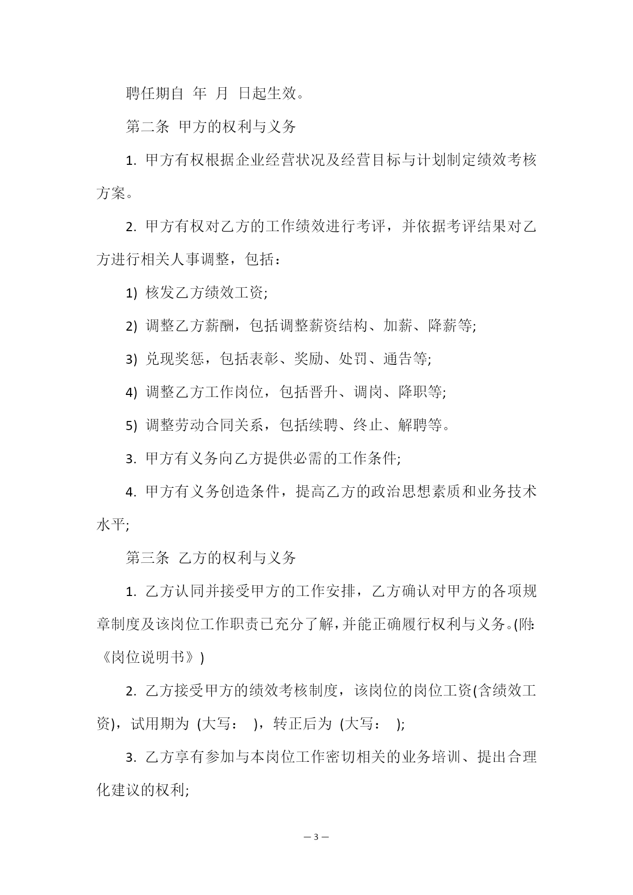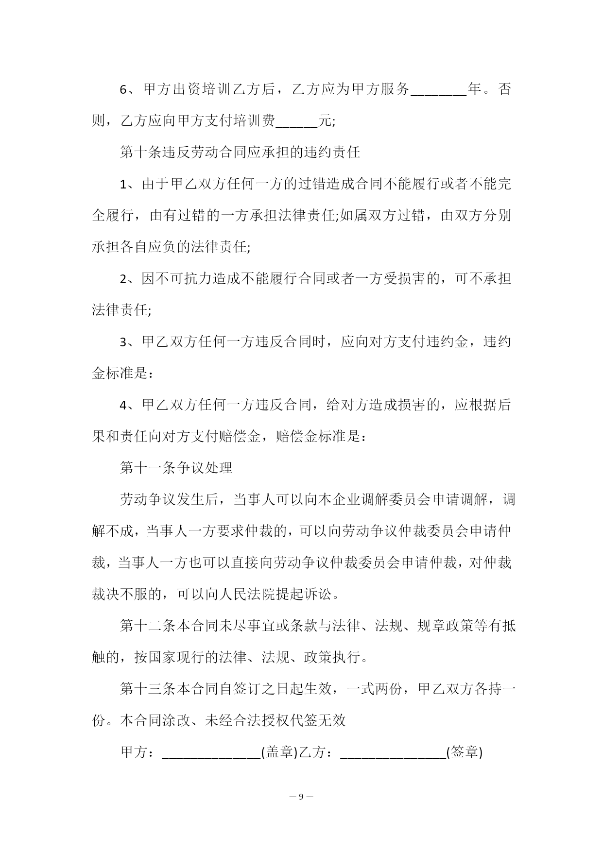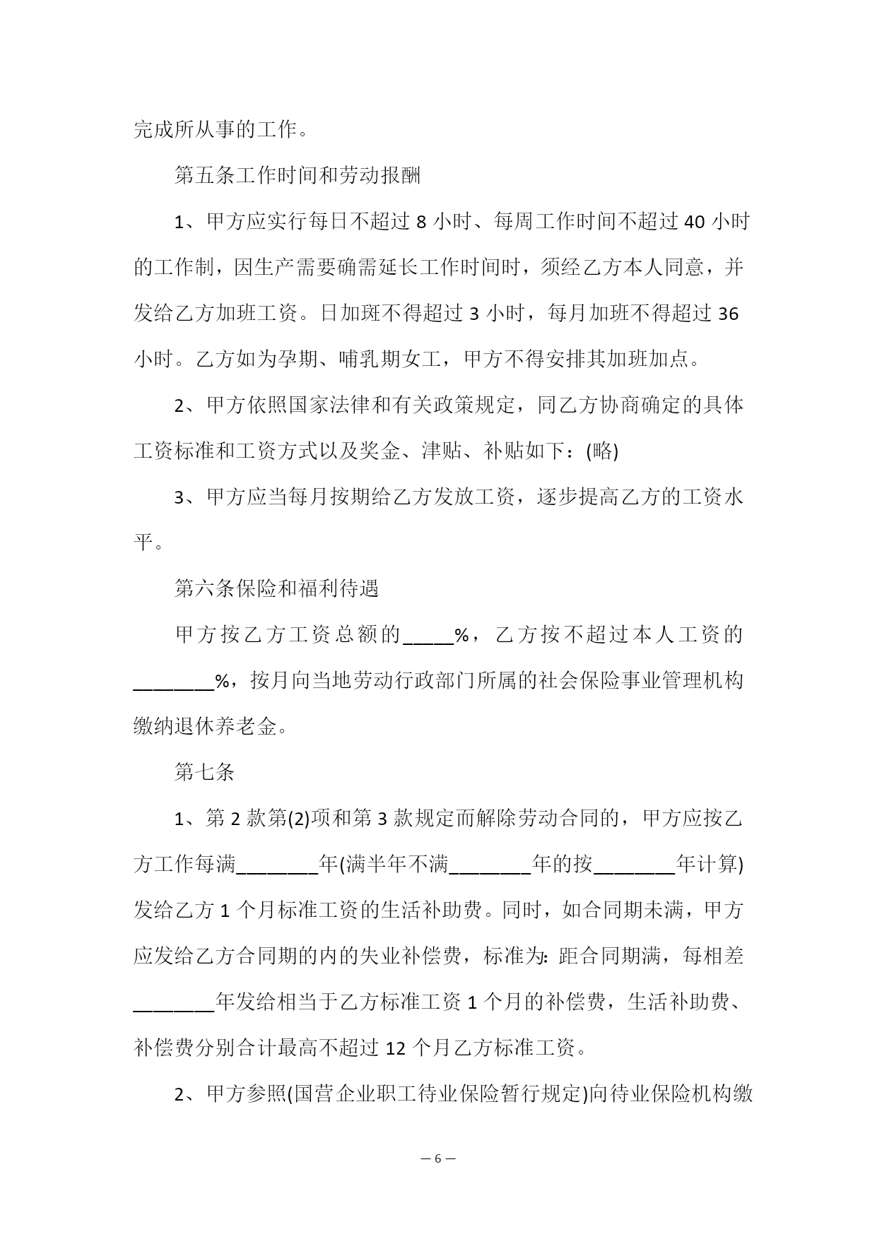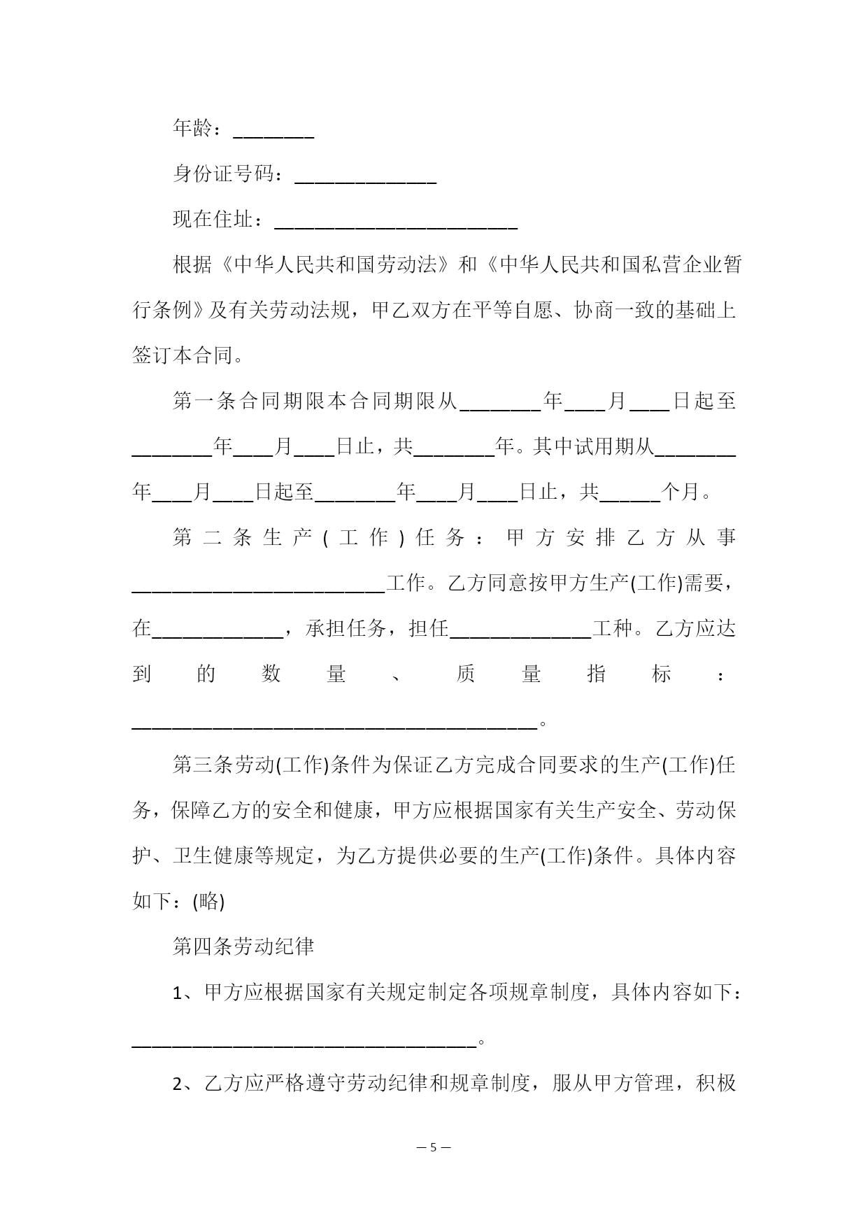 —PAGE\*MERGEFORMAT16—劳动合同法司法解释5篇在这种合同中,除双方当事人的意思表示一致之外,还必须有一方实际交付标的物的行为,才能产生法律效果。怎样写劳动合同书细则?下面我给大家带来劳动合同书细则5篇,仅供参考,希望大家喜欢!劳动合同书细则篇1甲方:乙方:根据《中华人民共和国劳动法》、《中华人民共和国劳动合同法》及其他有关法律法规规定,甲乙双方本着平等自愿、协商一致、合法公平、诚实信用的原则,订立本合同,并承诺共同遵守:一、合同期限自年月日起至年月日止,共__个月。二、工作内容和工作地点乙方从事岗位工作,乙方的工作地点。根据甲方工作需要,经双方协商同意,可以变更工作地点。乙方应按照甲方的要求,按时完成规定的工作数量,达到规定的质量标准,否则将追究责任人的责任。三、工作时间实行不定时工作制,工作时间甲乙双方协商安排。四、劳动报酬及支付时间乙方的工资按月发放,工资是__元。甲方每月__日左右发放上月工资。五、劳动保护、劳动条件和职业危害防护甲方根据生产岗位的需求,按照国家有关劳动安全、卫生的规定为乙方配备必要地安全防护措施,发放必要地劳动保护用品。甲方根据国家有关法律法规,建立安全生产制度;乙方应严格遵守甲方的劳动安全制度,严禁违章作业,防止劳动过程中的事故,减少职业危害。六、其他甲乙双方约定的其他事项:十二、本劳动合同一式二份,甲乙双方各执一份。自甲乙双方签字或盖章之日起生效。甲方:乙方:日期:劳动合同书细则篇2甲方:乙方:为充分调动和发挥员工的工作积极性、主动性、创造性。确保岗位工作任务和各项业绩指标的达成,根据甲乙双方自愿的原则,特签订本协议。第一条甲方聘任乙方从事部岗位的工作。聘任期自年月日起生效。第二条甲方的权利与义务1.甲方有权根据企业经营状况及经营目标与计划制定绩效考核方案。2.甲方有权对乙方的工作绩效进行考评,并依据考评结果对乙方进行相关人事调整,包括:1)核发乙方绩效工资;2)调整乙方薪酬,包括调整薪资结构、加薪、降薪等;3)兑现奖惩,包括表彰、奖励、处罚、通告等;4)调整乙方工作岗位,包括晋升、调岗、降职等;5)调整劳动合同关系,包括续聘、终止、解聘等。3.甲方有义务向乙方提供必需的工作条件;4.甲方有义务创造条件,提高乙方的政治思想素质和业务技术水平;第三条乙方的权利与义务1.乙方认同并接受甲方的工作安排,乙方确认对甲方的各项规章制度及该岗位工作职责已充分了解,并能正确履行权利与义务。(附:《岗位说明书》)2.乙方接受甲方的绩效考核制度,该岗位的岗位工资(含绩效工资),试用期为(大写:),转正后为(大写:);3.乙方享有参加与本岗位工作密切相关的业务培训、提出合理化建议的权利;4.乙方有义务服从甲方的经营组织管理,遵守公司规定和劳动纪律,员工手则,尽职尽责,努力完成工作任务;5.乙方有义务保守甲方商业秘密、恪守职业道德;6.乙方有义务自觉提高工作技能,提升专业技术水平,参与甲方的各项工作培训;第四条当乙方工作岗位调整时,本协议自动失效。第五条本协议为甲乙双方劳动聘用合同的附件,本协议的修订、变更即视同为劳动聘用合同的修订、变更。本协议中的条款如与劳动聘用合同有悖,均以劳动聘用合同的约定为准,且本协议条款的失效、无效均不影响甲乙双方劳动聘用合同的效力。甲方(盖章):__________________乙方:_________________________代表人(签字):________________身份证号码:_____________________________年________月_______日_________年________月_______日劳动合同书细则篇3甲方(用人单位)名称:___________地址:________________法定代表人(主要负责人):___________________乙方(劳动者)姓名:________性别:________年龄:________身份证号码:______________现在住址:________________________根据《中华人民共和国劳动法》和《中华人民共和国私营企业暂行条例》及有关劳动法规,甲乙双方在平等自愿、协商一致的基础上签订本合同。第一条合同期限本合同期限从________年____月____日起至________年____月____日止,共________年。其中试用期从________年____月____日起至________年____月____日止,共______个月。第二条生产(工作)任务:甲方安排乙方从事_______________________