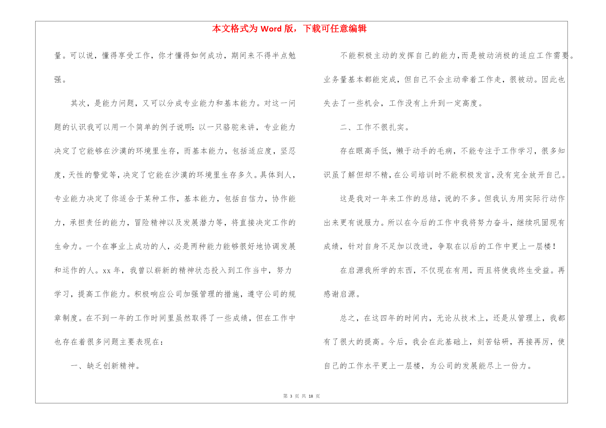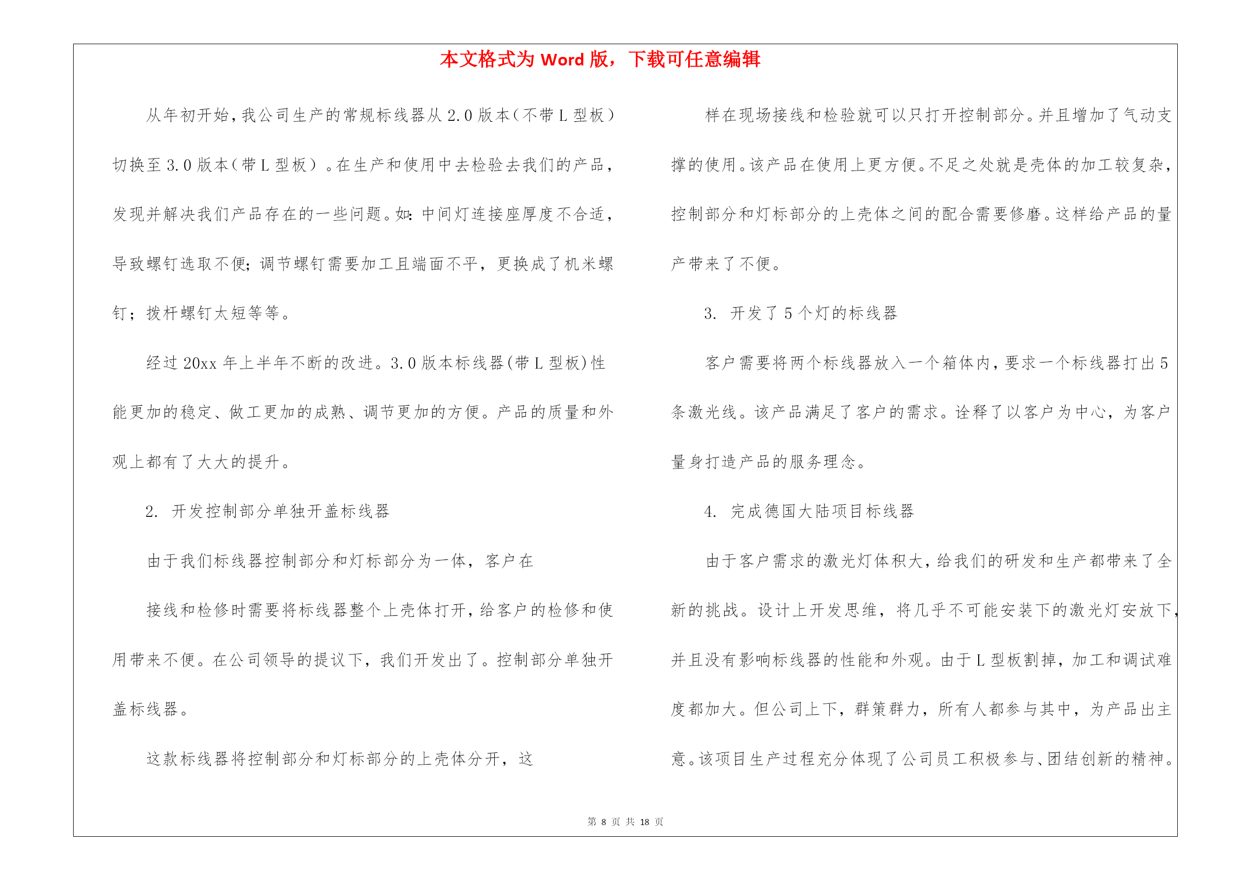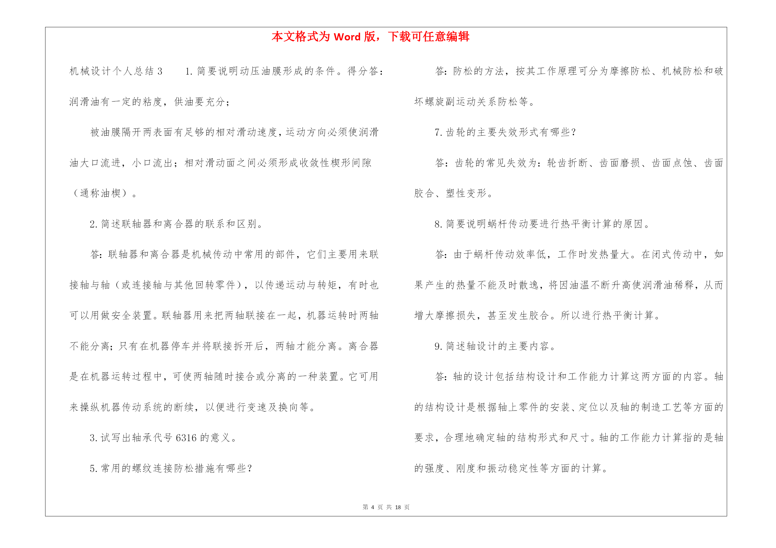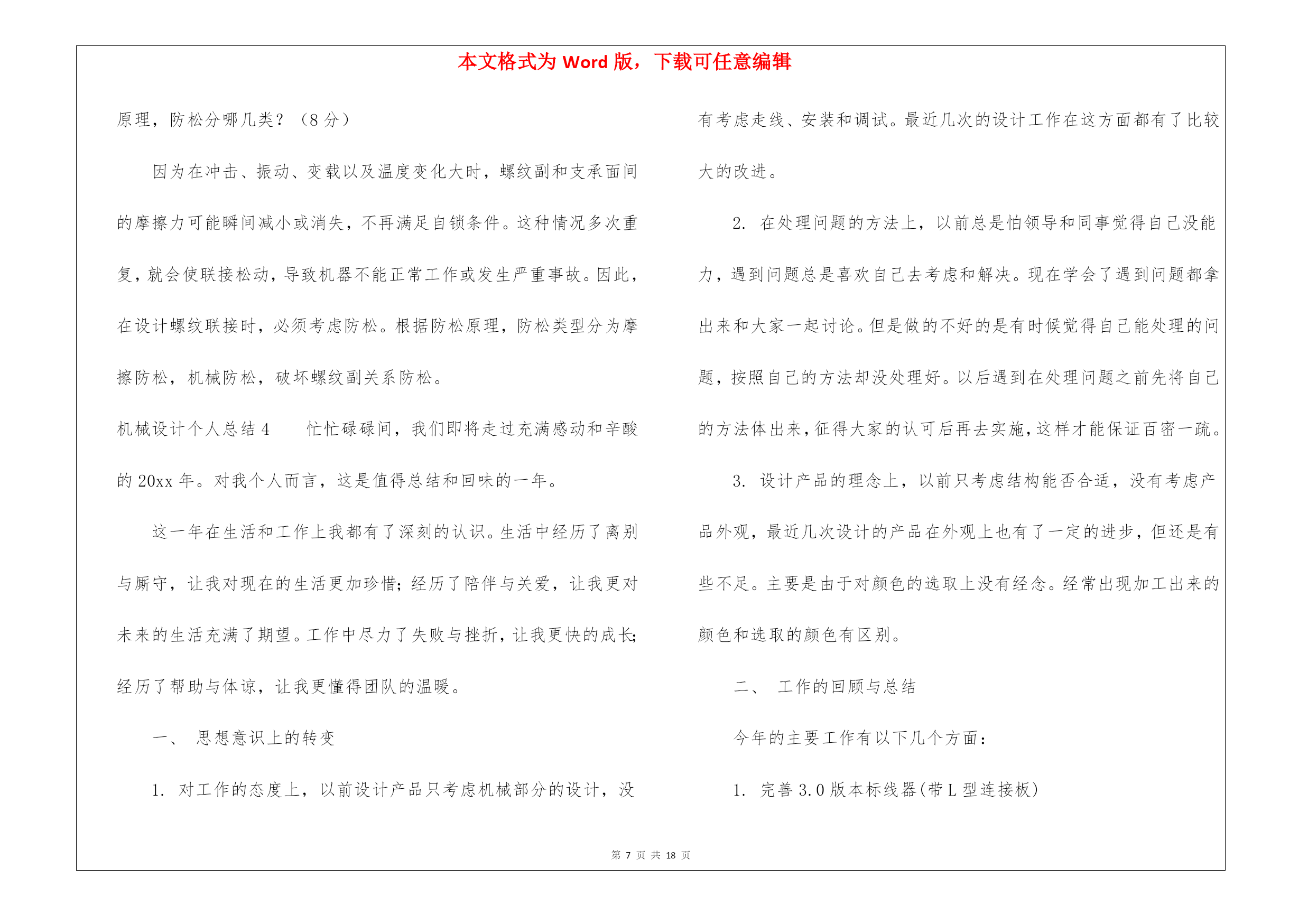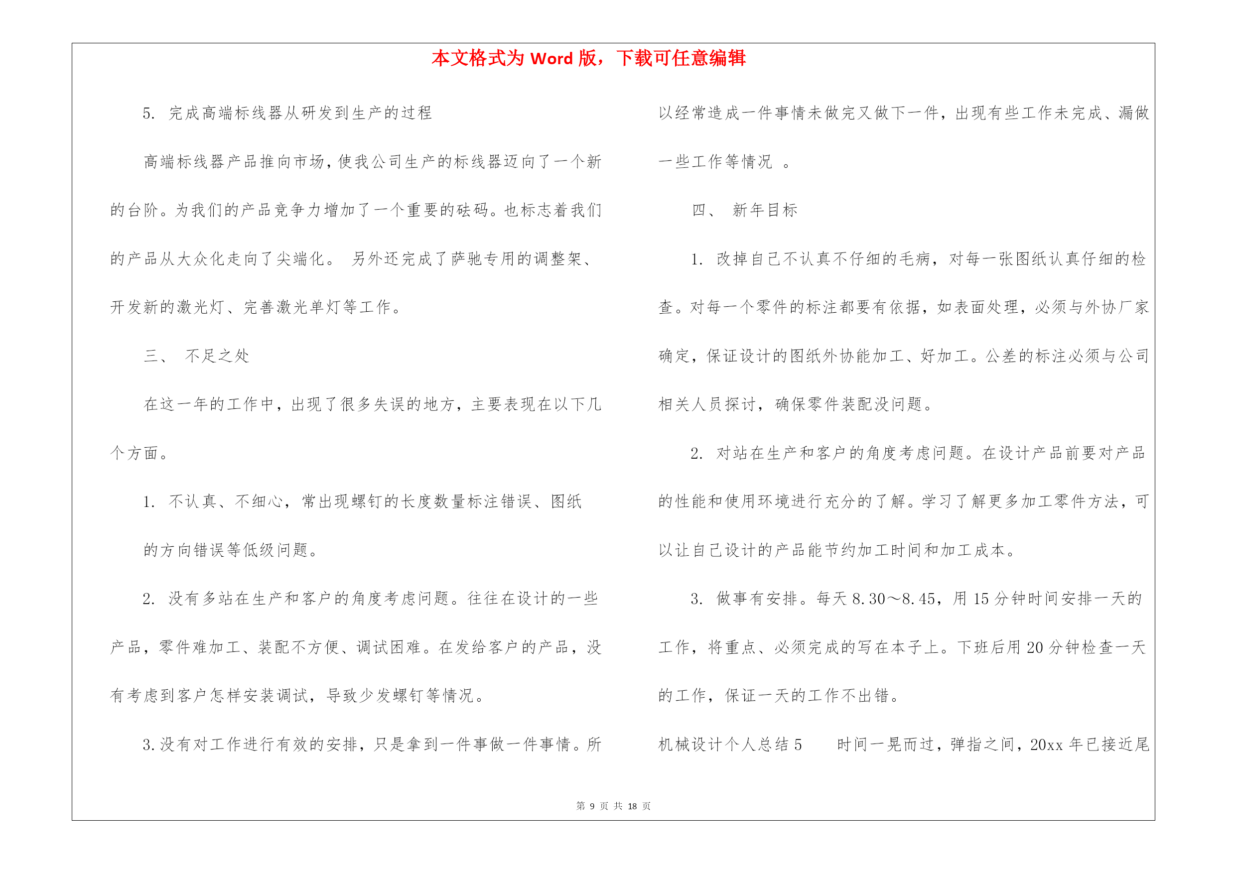本文格式为Word版,下载可任意编辑第PAGE\*MERGEFORMAT18页共NUMPAGES\*MERGEFORMAT18页机械设计个人总结机械设计个人总结总结是把一定阶段内的有关情况分析研究,做出有指导性结论的书面材料,它可以帮助我们有寻找学习和工作中的规律,不妨坐下来好好写写总结吧。总结你想好怎么写了吗?以下是我为大家编写的机械设计个人总结,仅供参考,欢迎大家阅读。机械设计个人总结1时光荏苒,岁月如梭,转眼已经从学校毕业三年,来启源工作也已经三年了,在启源工作的三年里既有收获的踏实和欢欣,也有因不足带来的遗憾和愧疚。启源公司是一个以生产变压器装备为主的一个研发型企业,它是国内的变压器装备制造企业,是目前亚洲的电工装备制造企业。生产部的工作是繁重和艰巨的,因为它肩负着公司所有设备的装配和现场安装调试任务。我在车间领导和师傅的指导下,较好的融入了这种紧张和严谨的工作氛围中,较好地完成了领导安排各项工作。自身的业务素质和工作能力有了较大提高,对工作有了更多的自信。过去的三年,我参与了较多的产品装备和设备现场安装调试工作,从中受益匪浅,不仅学到了很多专业知识,对动机装设备有了更全面的理解和把握,而且培养了我作为机械工程师所应该具备的基本素质。同时,我认真工作,坚持自学,提高了理论水平。具体总结如下:我是一名刚踏入社会的大学毕业生,XX年毕业于xxx专业作为新员工。首先,参加公司的培训工作。了解了公司的基本情况,了解了自己在公司岗位工作的基本工作和任务。作为一名新员工,同时,我也积极地参加公司组织的其它培训,学到了许多以前没有接触到的知识和理念。正式进入工作岗位后,起初,感到一切都很茫然,我虽然是学机械专业的。在学校只学习了一些理论知识,实践的机会很少,车间是我学习和实践的好地方。到车间后发现以前在学校学的理论知识太肤浅,工作起来非常困难,在工地我就向工人师傅虚心的请教,有不明白的地方我就问。对这些设备图纸看起来都是很忙然,只有走上工作岗位后,才知道自己的学识很肤浅,要学习的东西很多,所以,我就虚心向师傅请教,多问,多看图纸,立足于岗位工作,从基本做起不怕不会,就怕不学,不问。在见习期间,由于我勤奋好学,加上师傅的指导有方,很快,就对公司的设备有了基本的了解。见习期,我的工作主要是协助师傅装配,到库房领零部件,同时,也是对零部件有一个认识,在装配中,知道它在整个设备中所起的作用。在装配工作中,只能做一些基本的工作,攻丝,钻孔之类的。虽然这些工作看起来不起眼,但是,它也是做一个装配工作应有的基本功夫。所以,我对这些小的工作,做的也是特别仔细,做不好的话就要别人来返工,同时也是浪费别人的工作时间。在工作的同时,我也发现自己的机械制图能力不是很好,我结合工作的需要和我个人的实际情况,重点学习了xx制图方面的有关知识。使得自己在机械制图方面的基本功有了很大的提高。这给我以后的工作带来了很大的帮助。通过这一年的工作实习,使我在机械知识和工作方面,都有了很大的提高。机械设计个人总结2xx年是我真真正正走上工作岗位的第一年,对于工作或者说事业,每个人都有不同的认识和感受,我也一样。对我而言,我通常会从两个角度去把握自己的思想脉络。首先是心态,套用名人的一句话"态度决定一切"。有了正确的态度,才能运用正确的方法,找到正确的方向,进而取得正确的结果。具体而言,我对工作的态度就是选择自己喜爱的,然后为自己的所爱尽自己最大的努力。我一直认为工作不该是一个任务或者负担,应该是一种乐趣,是一种享受,而只有你对它产生兴趣,彻底的爱上它,你才能充分的体会到其中的快乐。我相信我会在对这一业务的努力探索和发现中找到我工作的乐趣,也才能毫无保留的为它尽我最大的力量。可以说,懂得享受工作,你才懂得如何成功,期间来不得半点勉强。其次,是能力问题,又可以分成专业能力和基本能力。对这一问题的认识我可以用一个简单的例子说明:以一只骆驼来讲,专业能力决定了它能够在沙漠的环境里生存,而基本能力,包括适应度,坚忍度,天性的警觉等,决定了它能在沙漠的环境里生存多久。具体到人,专业能力决定了你适合于某种工作,基本能力,包括自信力,协作能力,承担责任的能力,冒险精神以及发展潜力等,将直接决定工作的生命力。一个在事业上成功的人,必是两种能力能够很好地协调发展和运作的人。xx年,我曾以崭新的精神状态投入到工作当中,努力学习,提高工作能力。积极响应公司加强管理的措施,遵守公司的规章制度。在不到一年的工作时间里虽然取得了一些成绩,但在工作中也存在着很多问题主要表现在:一、缺乏创新精神。不能积极主动的发挥自己的能力,而是被动消极的适应工作需要。业务量基本都能完成,但自己不会主动牵着工作走,很被动。因此也失去了一些机会,工作没有上升到一定高度。二、工作不很扎实。存在眼高手低,懒