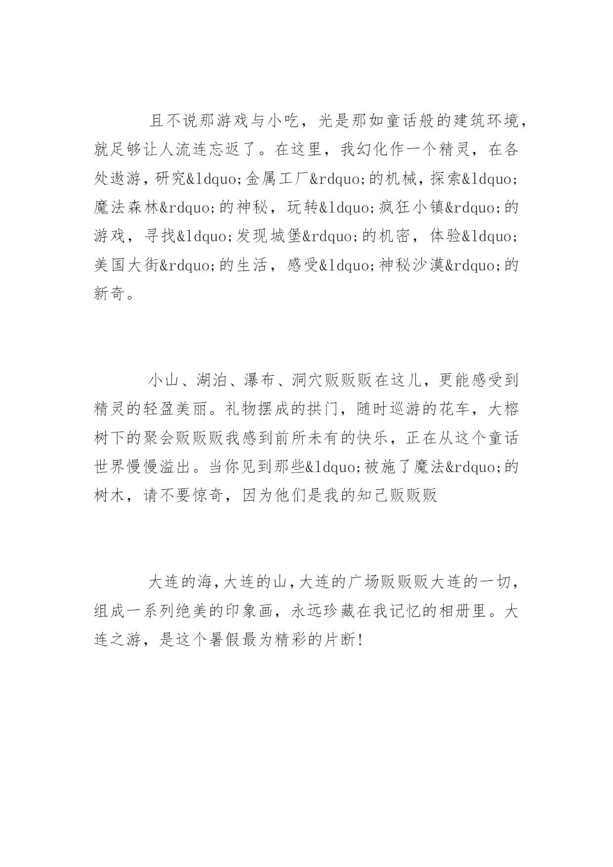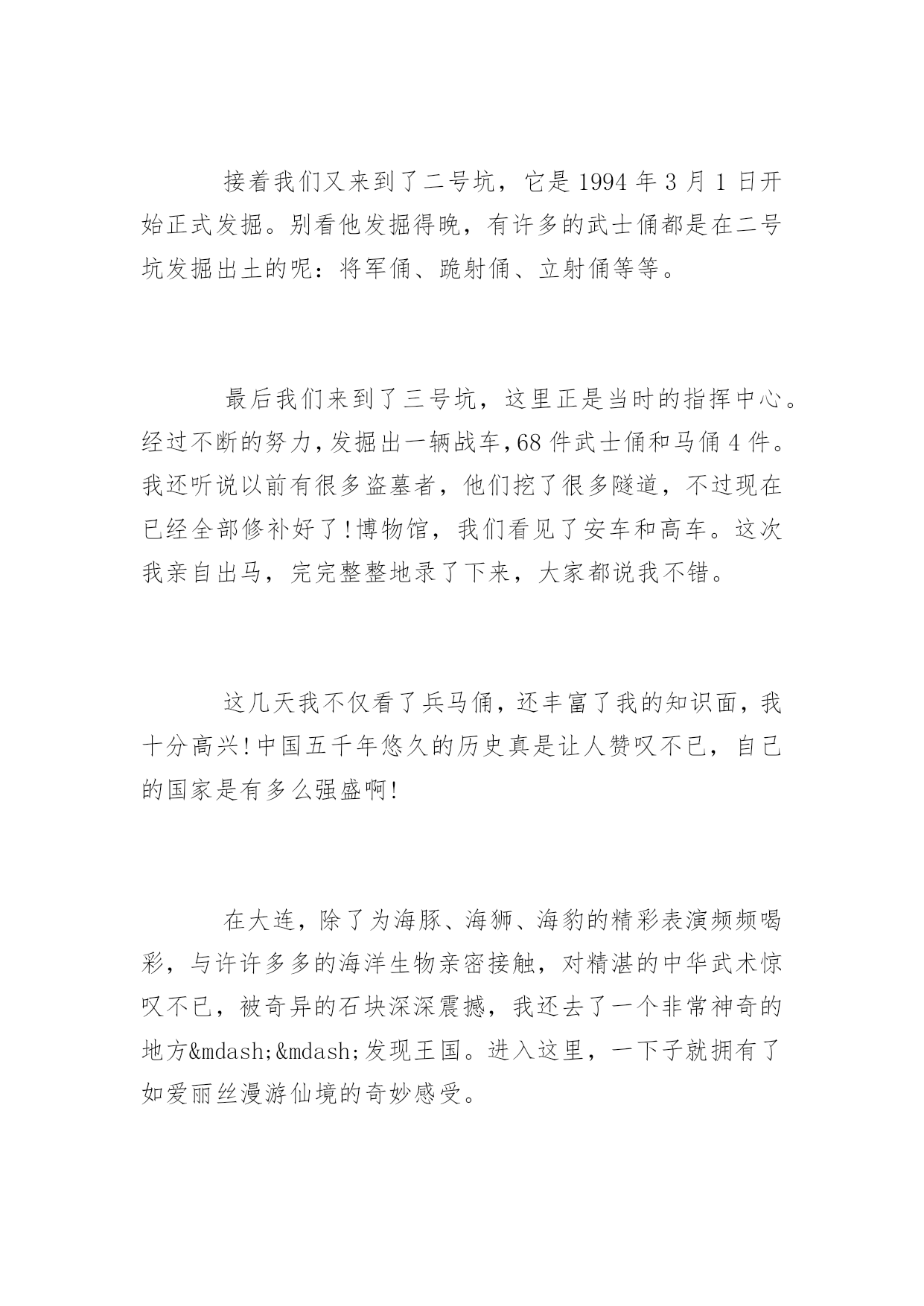 暑假旅游作文600暑假旅游作文600字中国五千年悠久的历史是多么神奇呀!有许多伟大的建筑又是多么值得人们去欣赏啊!这几天我正好在兵马俑旅游呢。快来,快来我来给你们介绍一下。兵马俑是秦始皇陪葬品的其中之一。是秦始皇50岁死后那年而建造。一位叫杨志发的农民从1974年3月发现,今天来这里旅游我真是太幸运了!我们先来到了一号坑,看到这么壮观的景色我叫妈妈立刻录了下来。原来一号坑里有许许多多的武士!它们都昂首挺胸的站立着。我们看得目吃口呆!据导游所说,东面站着的三排武士为先锋。每两个隔墙之间都有四排武士,它们有的穿战袍,有的穿铠甲,还配有战车呢!它们组成了庞大的军队。此时此刻,我心想:在两千年前秦始皇带领的军队是多么威武。接着我们又来到了二号坑,它是1994年3月1日开始正式发掘。别看他发掘得晚,有许多的武士俑都是在二号坑发掘出土的呢:将军俑、跪射俑、立射俑等等。最后我们来到了三号坑,这里正是当时的指挥中心。经过不断的努力,发掘出一辆战车,68件武士俑和马俑4件。我还听说以前有很多盗墓者,他们挖了很多隧道,不过现在已经全部修补好了!博物馆,我们看见了安车和高车。这次我亲自出马,完完整整地录了下来,大家都说我不错。这几天我不仅看了兵马俑,还丰富了我的知识面,我十分高兴!中国五千年悠久的历史真是让人赞叹不已,自己的国家是有多么强盛啊!在大连,除了为海豚、海狮、海豹的精彩表演频频喝彩,与许许多多的海洋生物亲密接触,对精湛的中华武术惊叹不已,被奇异的石块深深震撼,我还去了一个非常神奇的地方——发现王国。进入这里,一下子就拥有了如爱丽丝漫游仙境的奇妙感受。且不说那游戏与小吃,光是那如童话般的建筑环境,就足够让人流连忘返了。在这里,我幻化作一个精灵,在各处遨游,研究“金属工厂”的机械,探索“魔法森林”的神秘,玩转“疯狂小镇”的游戏,寻找“发现城堡”的机密,体验“美国大街”的生活,感受“神秘沙漠”的新奇。小山、湖泊、瀑布、洞穴贩贩贩在这儿,更能感受到精灵的轻盈美丽。礼物摆成的拱门,随时巡游的花车,大榕树下的聚会贩贩贩我感到前所未有的快乐,正在从这个童话世界慢慢溢出。当你见到那些“被施了魔法”的树木,请不要惊奇,因为他们是我的知己贩贩贩大连的海,大连的山,大连的广场贩贩贩大连的一切,组成一系列绝美的印象画,永远珍藏在我记忆的相册里。大连之游,是这个暑假最为精彩的片断!