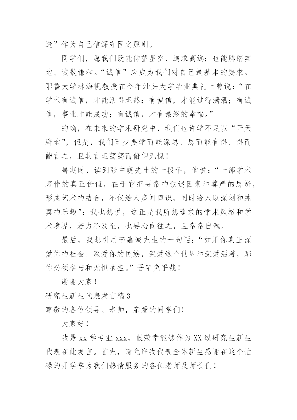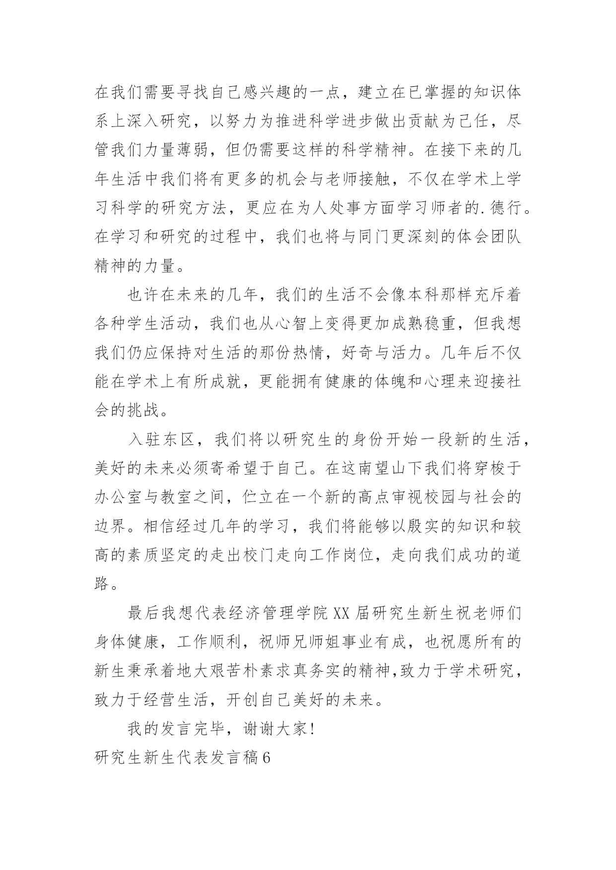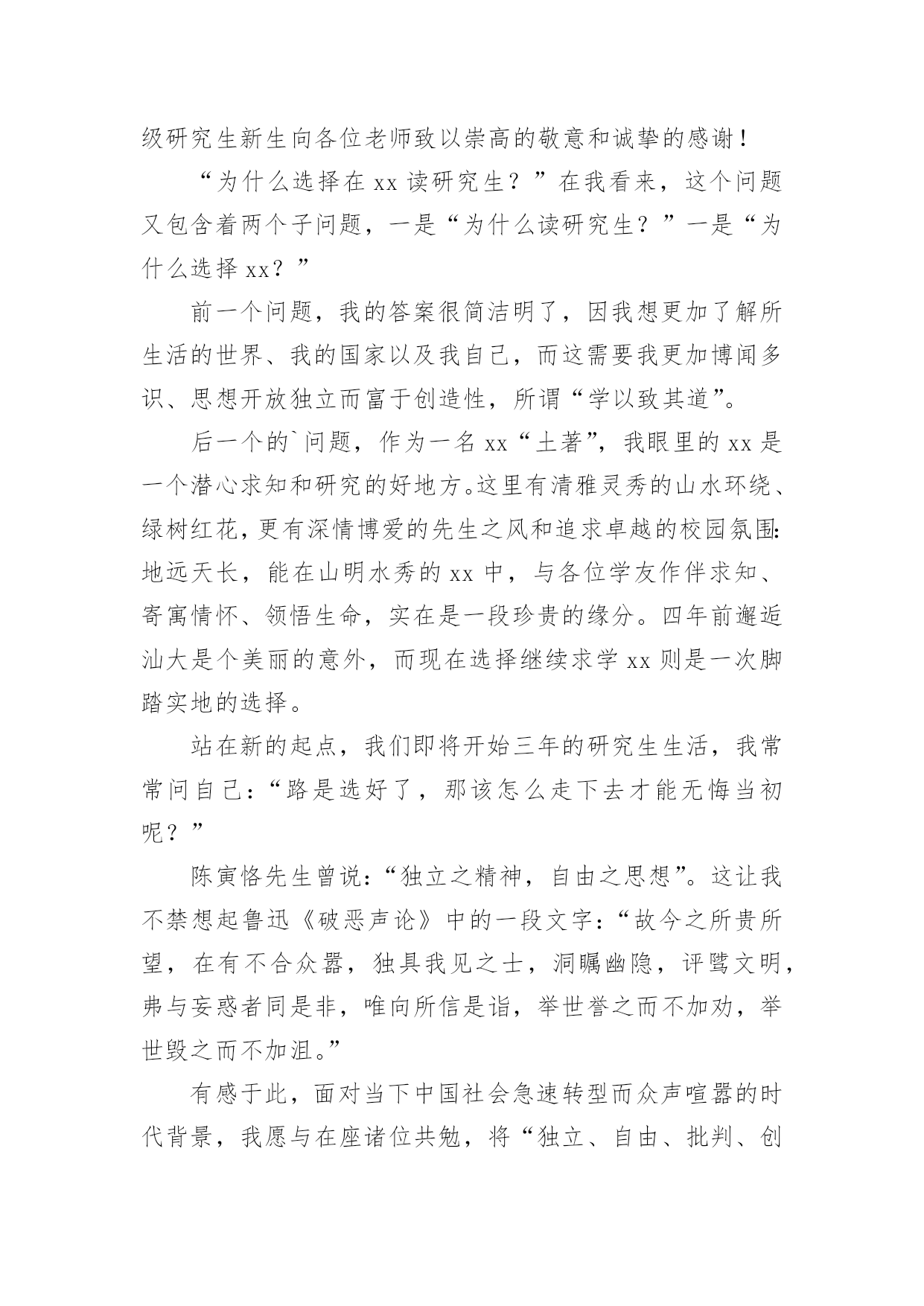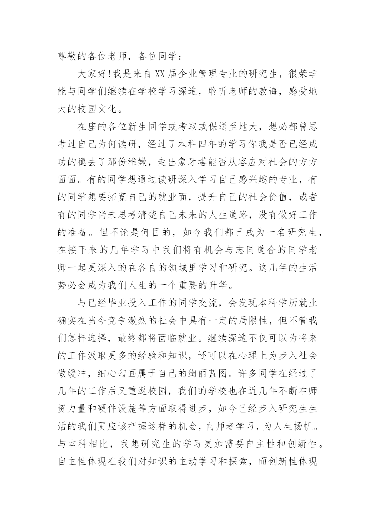 研究生新生代表发言稿研究生新生代表发言稿在日新月异的现代社会中,我们可以使用发言稿的机会越来越多,发言稿的格式由称谓、开场白、主干、结尾等几部分组成。相信写发言稿是一个让许多人都头痛的问题,下面是小编精心整理的研究生新生代表发言稿,希望对大家有所帮助。研究生新生代表发言稿1尊敬的各位老师,亲爱的各位同学:大家好!我是XX专业20xx级新生XXX,非常荣幸能够代表研一新生发言。首先请允许我代表14级新生向为我们入学提供热情服务的老师和师兄师姐们表示衷心的感谢!我们怀着同一个求学的理想,从祖国各地汇聚在这里。回首我们曾经历过的无数挑灯夜战,奋力备考的日子,今天的开学典礼别有一番滋味在心头。那一个个求学路上的悲喜瞬间见证了我们履行誓言、坚守信念、执着梦想的青春岁月。曾经挥汗如雨的.付出已变为今天踌躇满志的希望。我们这些曾经的胜利者就要踏上新的征途。在这本该属于收获的季节里,我们要把一颗颗梦想和希望的种子深埋在兰大这块科研的沃土之中。我们坚信,三年之后,我们今天的希望与梦想将在充满生机与活力的资环放飞,扬帆远航。作为一名兰大人,我深感自豪!“大学之大,在于精神之立”,大学的精神是一所大学的灵魂所在。兰州大学,这座孤独舞动了百年的高等学府,即将将她最宝贵的精神财富给予我们,这份日益稀少的朴实无华和美好憧憬,这种甘于寂寞、乐于奉献的胡杨精神将时刻砥砺我心。我们是新一代的兰大人,兰大“勤奋、求实、进取”的学风需要我们去弘扬,兰大“自强不息、独树一帜”的精神需要我们去光大。作为一名资环人,我倍加骄傲!我们要牢记李先生的“读万卷书穷途万里;行万里路明德亲民”的嘱托,诚实守信,脚踏实地,争做“真人”,学做“君子”;我们要将资环人勇闯三极的精神作为激励我们不断前进的动力,勇于创新,敢于质疑,不断提高自身综合素质,做一名合格的社会主义建设者和接班人;我们要时刻谨记资环人“自强不息、勇闯高峰”的精神,体会到“海纳百川,独树一帜”的独有风姿。最后,衷心地祝愿大家,在兰大这片因我们而美丽的土地上,收获真知与人生的意义,从这个值得纪念的日子起,书写我们人生路上一幕崭新的华丽篇章!谢谢大家!研究生新生代表发言稿2尊敬的老师们,亲爱的同学们:大家好!首先我非常荣幸能作为研究生新生代表在此发言,值我国第xx个教师节即将来临之际,请允许我代表xx大学20xx级研究生新生向各位老师致以崇高的敬意和诚挚的感谢!“为什么选择在xx读研究生?”在我看来,这个问题又包含着两个子问题,一是“为什么读研究生?”一是“为什么选择xx?”前一个问题,我的答案很简洁明了,因我想更加了解所生活的世界、我的国家以及我自己,而这需要我更加博闻多识、思想开放独立而富于创造性,所谓“学以致其道”。后一个的`问题,作为一名xx“土著”,我眼里的xx是一个潜心求知和研究的好地方。这里有清雅灵秀的山水环绕、绿树红花,更有深情博爱的先生之风和追求卓越的校园氛围:地远天长,能在山明水秀的xx中,与各位学友作伴求知、寄寓情怀、领悟生命,实在是一段珍贵的缘分。四年前邂逅汕大是个美丽的意外,而现在选择继续求学xx则是一次脚踏实地的选择。站在新的起点,我们即将开始三年的研究生生活,我常常问自己:“路是选好了,那该怎么走下去才能无悔当初呢?”陈寅恪先生曾说:“独立之精神,自由之思想”。这让我不禁想起鲁迅《破恶声论》中的一段文字:“故今之所贵所望,在有不合众嚣,独具我见之士,洞瞩幽隐,评骘文明,弗与妄惑者同是非,唯向所信是诣,举世誉之而不加劝,举世毁之而不加沮。”有感于此,面对当下中国社会急速转型而众声喧嚣的时代背景,我愿与在座诸位共勉,将“独立、自由、批判、创造”作为自己信深守固之原则。同学们,愿我们既能仰望星空、追求高远;也能脚踏实地、诚敬谦和。“诚信”应成为我们对自己最基本的要求。耶鲁大学林海帆教授在今年汕头大学毕业典礼上曾说:“在学术有诚信,才能活得坦然;有诚信,才能过得潇洒;有诚信,事业才能成功;有诚信,才有最终的幸福。”的确,在未来的学术研究中,我们也许学不足以“开天辟地”,但是,我们至少要学而能深思、思而能有得、得而能言之,且其言坦荡荡而俯仰无愧!暑期时,读到张中晓先生的一段话,他说:“一部学术著作的真正价值,在于它把寻常的叙述因素和尊严的思辨,形成艺术的结合,不仅给人多闻博识,同时给人以深刻和纯真的乐趣”:我也想说,这正是我所想追求的学术风格和学术境界,若力不及至,也要心向往之,且常常自勉。最后,我想引用李嘉诚先生的一句话:“如果你真正深爱你的社会、深爱你的民族,深爱这个世界和深爱活着,那你必须参与和无惧承担。”吾辈免乎哉!谢谢大家!研究生新生代表发言稿3尊敬的各位领导、老师,亲爱的同学们!大家好!我是xx学专业xxx,很荣幸能够作为XX级研究生新生代表在此发言。首先,请允许我代表全体新生感谢在这