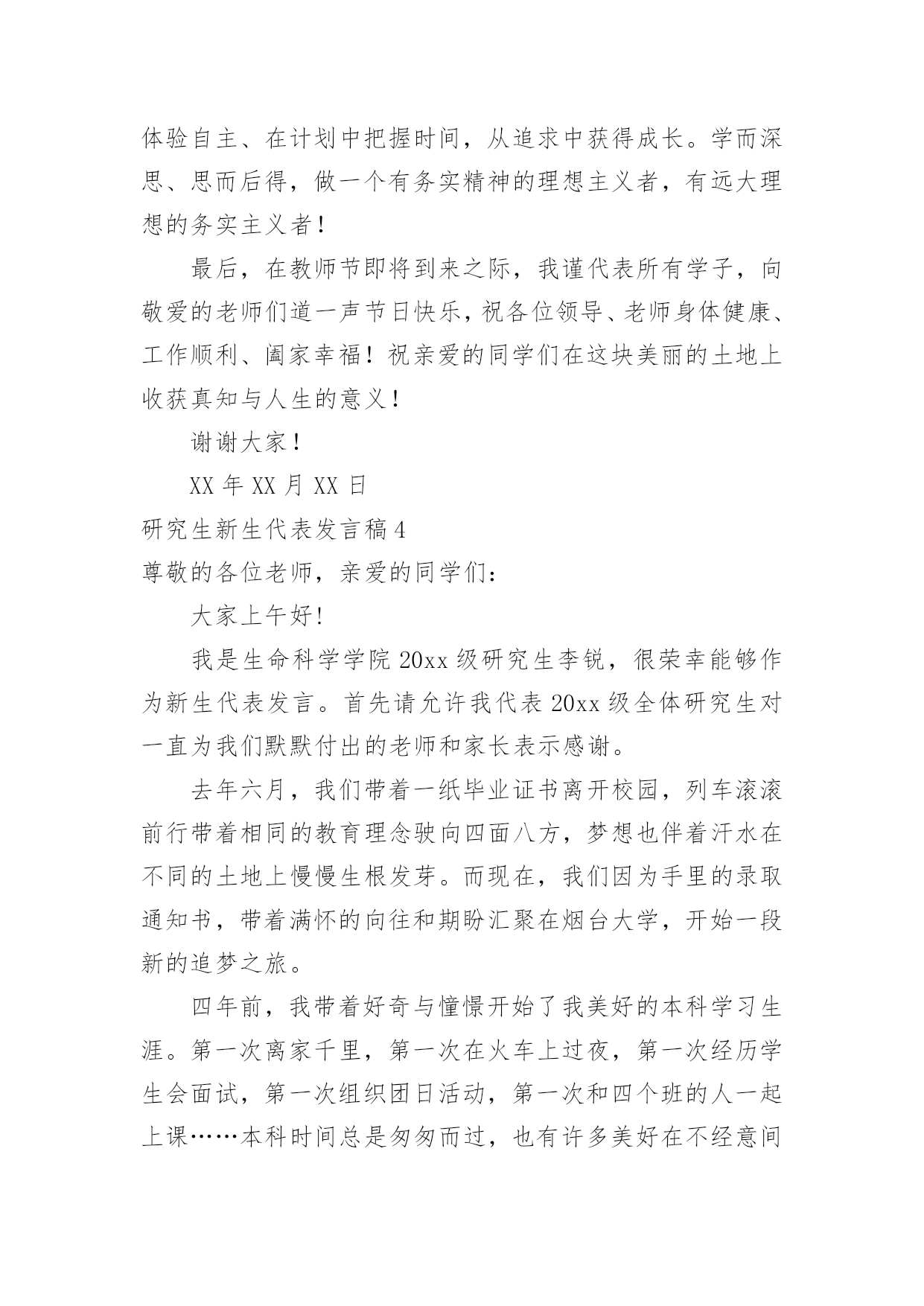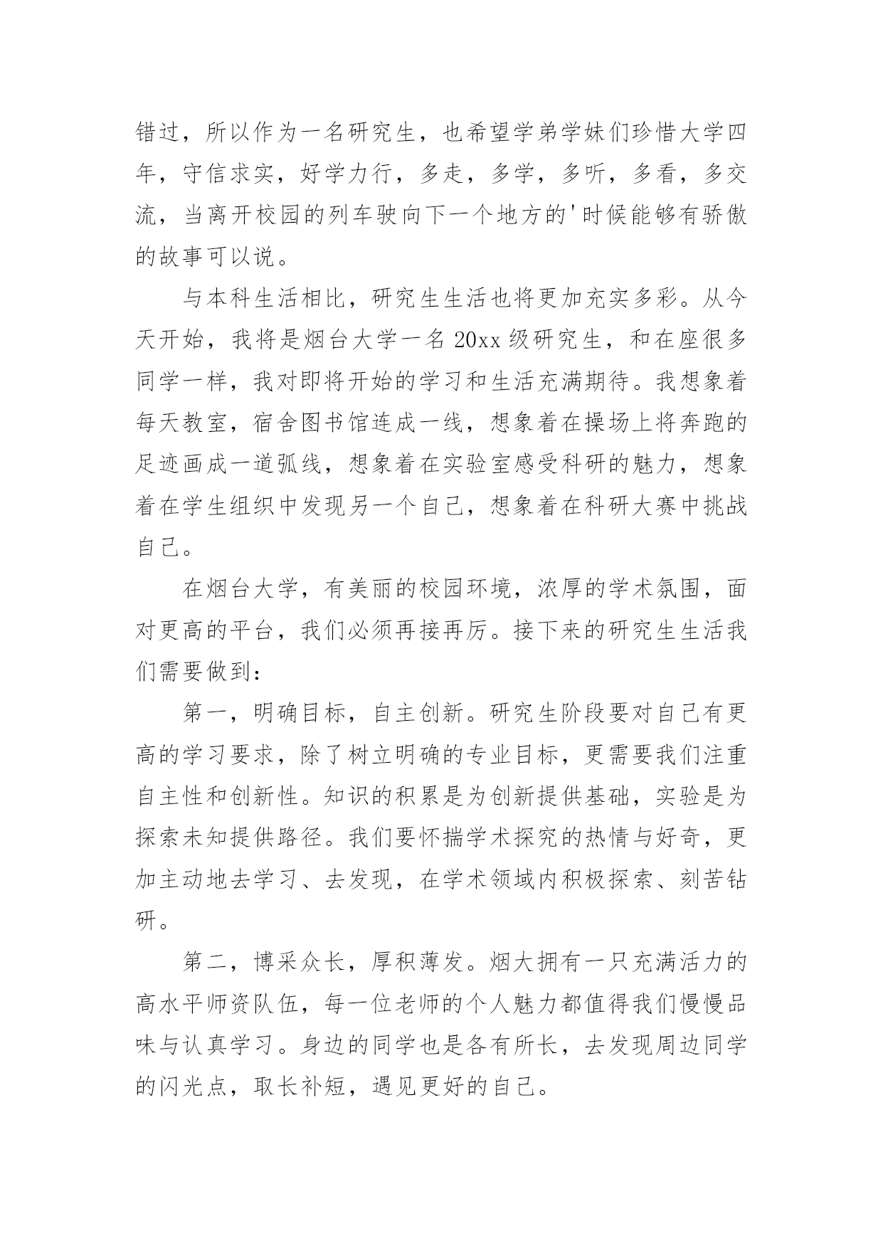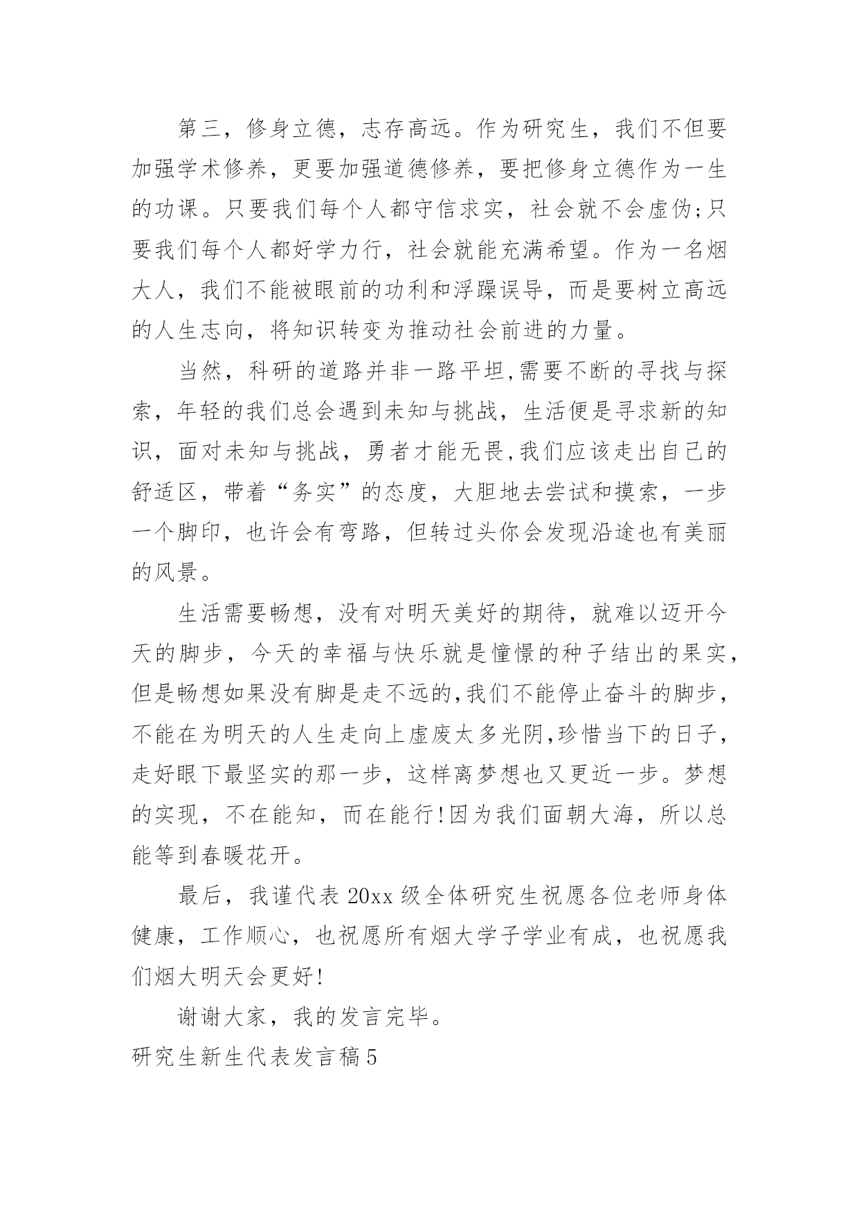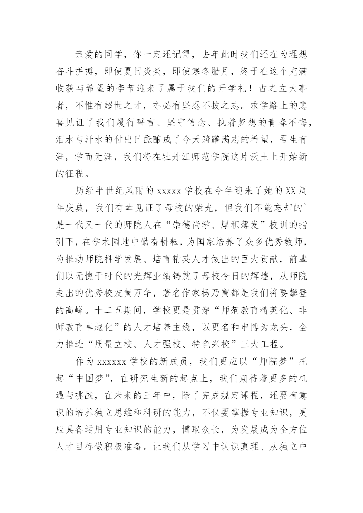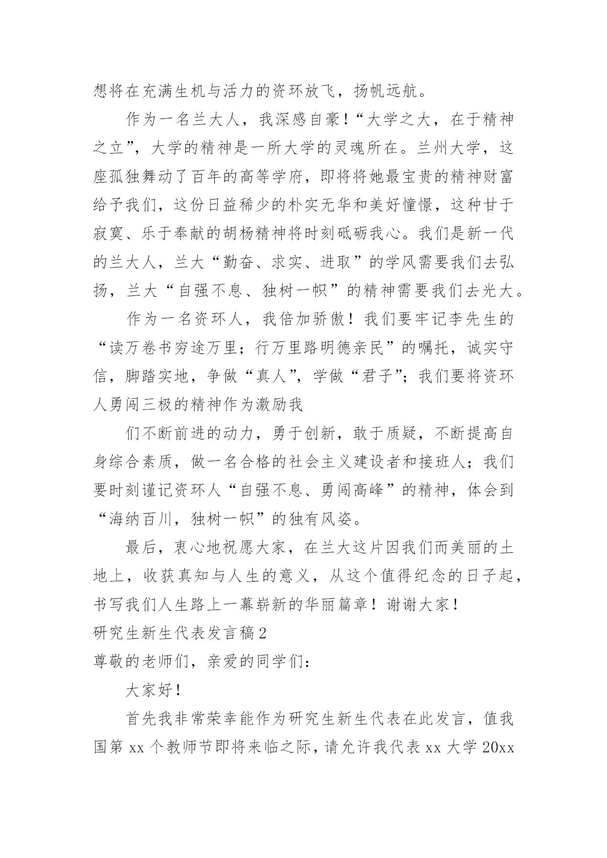 研究生新生代表发言稿研究生新生代表发言稿在日新月异的现代社会中,我们可以使用发言稿的机会越来越多,发言稿的格式由称谓、开场白、主干、结尾等几部分组成。相信写发言稿是一个让许多人都头痛的问题,下面是小编精心整理的研究生新生代表发言稿,希望对大家有所帮助。研究生新生代表发言稿1尊敬的各位老师,亲爱的各位同学:大家好!我是XX专业20xx级新生XXX,非常荣幸能够代表研一新生发言。首先请允许我代表14级新生向为我们入学提供热情服务的老师和师兄师姐们表示衷心的感谢!我们怀着同一个求学的理想,从祖国各地汇聚在这里。回首我们曾经历过的无数挑灯夜战,奋力备考的日子,今天的开学典礼别有一番滋味在心头。那一个个求学路上的悲喜瞬间见证了我们履行誓言、坚守信念、执着梦想的青春岁月。曾经挥汗如雨的.付出已变为今天踌躇满志的希望。我们这些曾经的胜利者就要踏上新的征途。在这本该属于收获的季节里,我们要把一颗颗梦想和希望的种子深埋在兰大这块科研的沃土之中。我们坚信,三年之后,我们今天的希望与梦想将在充满生机与活力的资环放飞,扬帆远航。作为一名兰大人,我深感自豪!“大学之大,在于精神之立”,大学的精神是一所大学的灵魂所在。兰州大学,这座孤独舞动了百年的高等学府,即将将她最宝贵的精神财富给予我们,这份日益稀少的朴实无华和美好憧憬,这种甘于寂寞、乐于奉献的胡杨精神将时刻砥砺我心。我们是新一代的兰大人,兰大“勤奋、求实、进取”的学风需要我们去弘扬,兰大“自强不息、独树一帜”的精神需要我们去光大。作为一名资环人,我倍加骄傲!我们要牢记李先生的“读万卷书穷途万里;行万里路明德亲民”的嘱托,诚实守信,脚踏实地,争做“真人”,学做“君子”;我们要将资环人勇闯三极的精神作为激励我们不断前进的动力,勇于创新,敢于质疑,不断提高自身综合素质,做一名合格的社会主义建设者和接班人;我们要时刻谨记资环人“自强不息、勇闯高峰”的精神,体会到“海纳百川,独树一帜”的独有风姿。最后,衷心地祝愿大家,在兰大这片因我们而美丽的土地上,收获真知与人生的意义,从这个值得纪念的日子起,书写我们人生路上一幕崭新的华丽篇章!谢谢大家!研究生新生代表发言稿2尊敬的老师们,亲爱的同学们:大家好!首先我非常荣幸能作为研究生新生代表在此发言,值我国第xx个教师节即将来临之际,请允许我代表xx大学20xx级研究生新生向各位老师致以崇高的敬意和诚挚的感谢!“为什么选择在xx读研究生?”在我看来,这个问题又包含着两个子问题,一是“为什么读研究生?”一是“为什么选择xx?”前一个问题,我的答案很简洁明了,因我想更加了解所生活的世界、我的国家以及我自己,而这需要我更加博闻多识、思想开放独立而富于创造性,所谓“学以致其道”。后一个的`问题,作为一名xx“土著”,我眼里的xx是一个潜心求知和研究的好地方。这里有清雅灵秀的山水环绕、绿树红花,更有深情博爱的先生之风和追求卓越的校园氛围:地远天长,能在山明水秀的xx中,与各位学友作伴求知、寄寓情怀、领悟生命,实在是一段珍贵的缘分。四年前邂逅汕大是个美丽的意外,而现在选择继续求学xx则是一次脚踏实地的选择。站在新的起点,我们即将开始三年的研究生生活,我常常问自己:“路是选好了,那该怎么走下去才能无悔当初呢?”陈寅恪先生曾说:“独立之精神,自由之思想”。这让我不禁想起鲁迅《破恶声论》中的一段文字:“故今之所贵所望,在有不合众嚣,独具我见之士,洞瞩幽隐,评骘文明,弗与妄惑者同是非,唯向所信是诣,举世誉之而不加劝,举世毁之而不加沮。”有感于此,面对当下中国社会急速转型而众声喧嚣的时代背景,我愿与在座诸位共勉,将“独立、自由、批判、创造”作为自己信深守固之原则。同学们,愿我们既能仰望星空、追求高远;也能脚踏实地、诚敬谦和。“诚信”应成为我们对自己最基本的要求。耶鲁大学林海帆教授在今年汕头大学毕业典礼上曾说:“在学术有诚信,才能活得坦然;有诚信,才能过得潇洒;有诚信,事业才能成功;有诚信,才有最终的幸福。”的确,在未来的学术研究中,我们也许学不足以“开天辟地”,但是,我们至少要学而能深思、思而能有得、得而能言之,且其言坦荡荡而俯仰无愧!暑期时,读到张中晓先生的一段话,他说:“一部学术著作的真正价值,在于它把寻常的叙述因素和尊严的思辨,形成艺术的结合,不仅给人多闻博识,同时给人以深刻和纯真的乐趣”:我也想说,这正是我所想追求的学术风格和学术境界,若力不及至,也要心向往之,且常常自勉。最后,我想引用李嘉诚先生的一句话:“如果你真正深爱你的社会、深爱你的民族,深爱这个世界和深爱活着,那你必须参与和无惧承担。”吾辈免乎哉!谢谢大家!研究生新生代表发言稿3尊敬的各位领导、老师,亲爱的同学们!大家好!我是xx学专业xxx,很荣幸能够作为XX级研究生新生代表在此发言。首先,请允许我代表全体新生感谢在这