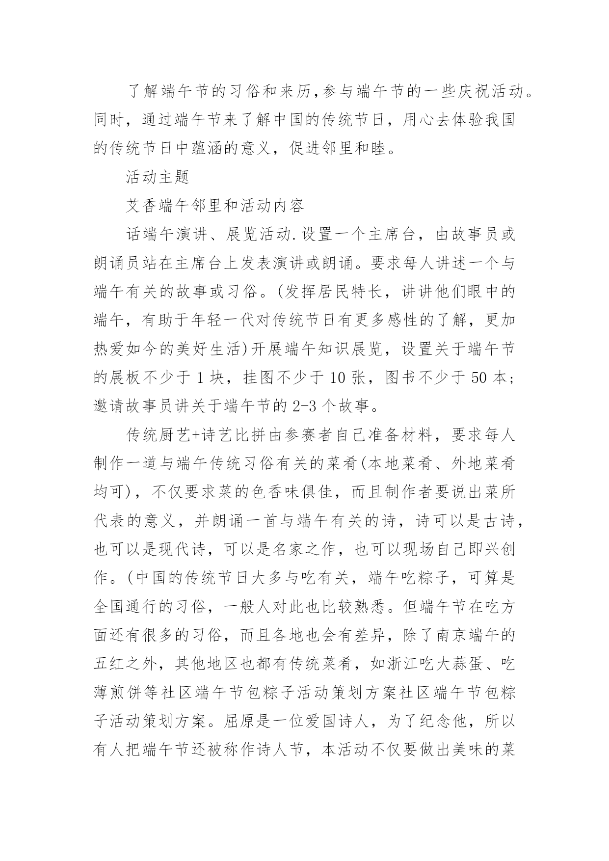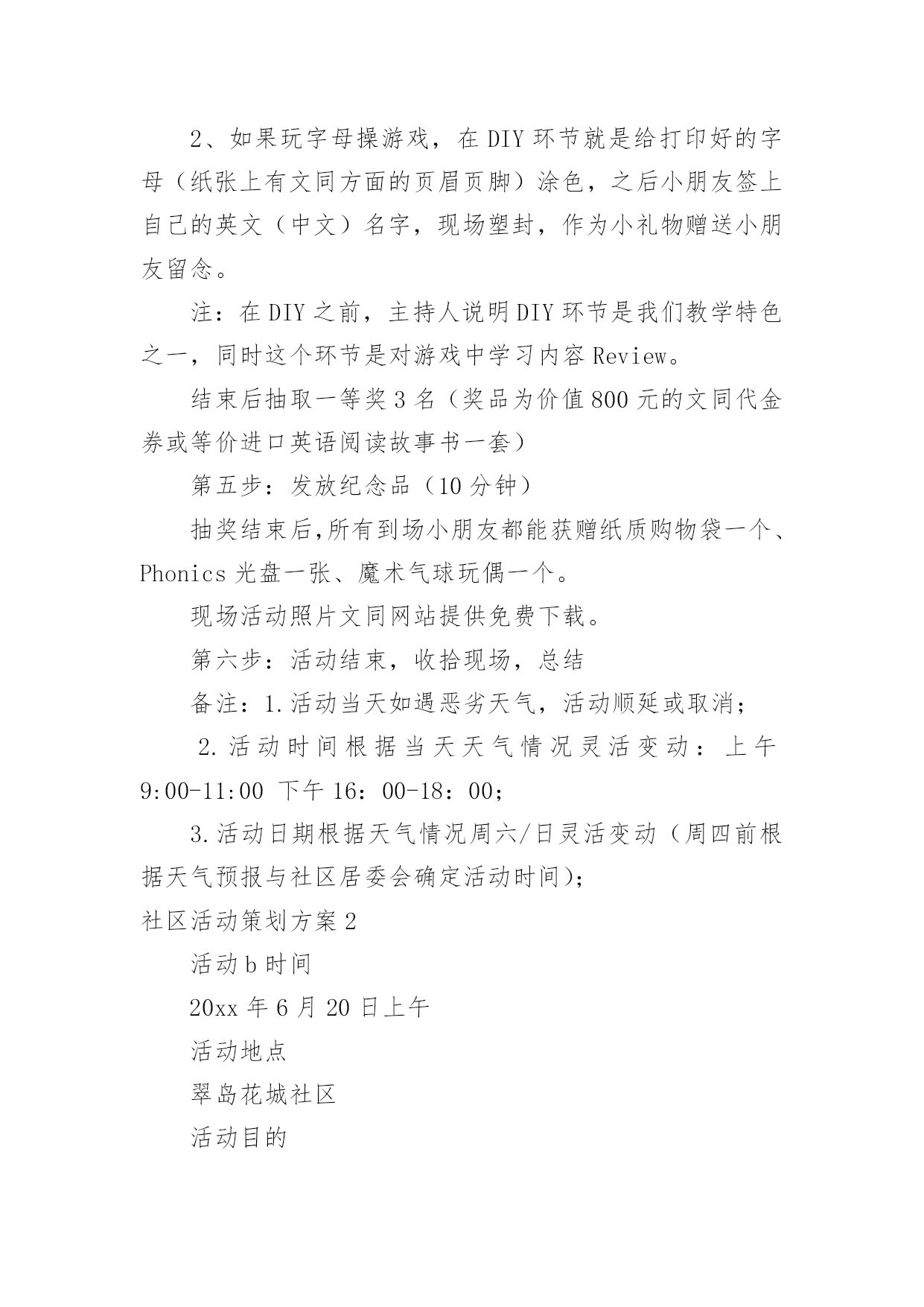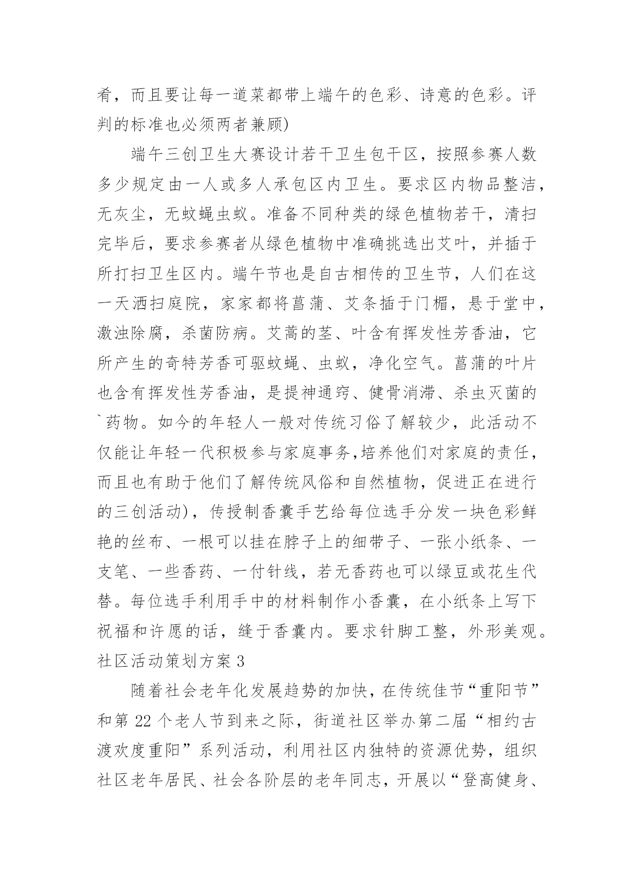 社区活动策划方案社区活动策划方案15篇为了确保事情或工作科学有序进行,通常需要预先制定一份完整的方案,方案是有很强可操作性的书面计划。那么我们该怎么去写方案呢?下面是小编帮大家整理的社区活动策划方案,欢迎大家借鉴与参考,希望对大家有所帮助。社区活动策划方案1幼儿英语社区活动----“美语进社区”系列活动一.活动介绍:二.活动目的1.提升活动组织单位的社会形象:通过活动,宣传和贯彻计生相关政策,提高花园路街道为民服务意识,为街道和社区创建良好的社会形象;2.提高文同国际儿童美语学校品牌的知名度:通过活动,为花园路街道所属社区适龄儿童提供良好的英语学习氛围,让他们更早、更好的接触专业、快乐英语学习方式,提高学习英语的兴趣,创建英语母语思维;三.活动主要步骤及内容第一步:活动现场布置(提前30分钟到场)现场布置登记咨询桌、太阳伞、文同地毯、宣传展架、横幅、宣传背板、宣传资料、礼品气球、DIY桌椅、音响设备、电脑及其他设备等;第二步:活动暖场(15-20分钟)中教及外教和小朋友一起欢唱四首英文歌结束后抽取三等奖3名(奖品为价值300元的文同试听课程卡及20元实物礼品)第三步:活动游戏(30分钟)游戏两个供选:1、“水果忍者”——用KT板喷绘出Apple、Banana、Peach、Pear、Watermelon、Strawberry等,根据现场小朋友人数分两组或者三组进行比赛,小朋友拿着不同颜色Maker笔,跨过几个简单的障碍之后,来到“水果”前面,大声说出水果单词,之后用笔进行“削水果”。在规定时间内,看哪组“削水果”最多。2、字母操——老师带领小朋友跳字母操,之后把现场小朋友分成两组,家长1人陪同,根据主持人出示的'字母,大声喊出字母及字母的发音,并根据字母形状摆出相应造型,在规定时间内摆出造型最多为获胜组。结束后抽取二等奖2名(奖品为价值500元的文同试听课程卡及50元实物礼品)第四步:活动DIY(20-30分钟)与游戏相辅1、如果玩“水果忍者”游戏,在DIY环节就是给打印好的水果(纸张上有文同方面的页眉页脚)涂色,之后小朋友签上自己的英文(中文)名字,现场塑封,作为小礼物赠送小朋友留念。2、如果玩字母操游戏,在DIY环节就是给打印好的字母(纸张上有文同方面的页眉页脚)涂色,之后小朋友签上自己的英文(中文)名字,现场塑封,作为小礼物赠送小朋友留念。注:在DIY之前,主持人说明DIY环节是我们教学特色之一,同时这个环节是对游戏中学习内容Review。结束后抽取一等奖3名(奖品为价值800元的文同代金券或等价进口英语阅读故事书一套)第五步:发放纪念品(10分钟)抽奖结束后,所有到场小朋友都能获赠纸质购物袋一个、Phonics光盘一张、魔术气球玩偶一个。现场活动照片文同网站提供免费下载。第六步:活动结束,收拾现场,总结备注:1.活动当天如遇恶劣天气,活动顺延或取消;2.活动时间根据当天天气情况灵活变动:上午9:00-11:00下午16:00-18:00;3.活动日期根据天气情况周六/日灵活变动(周四前根据天气预报与社区居委会确定活动时间);社区活动策划方案2活动b时间20xx年6月20日上午活动地点翠岛花城社区活动目的了解端午节的习俗和来历,参与端午节的一些庆祝活动。同时,通过端午节来了解中国的传统节日,用心去体验我国的传统节日中蕴涵的意义,促进邻里和睦。活动主题艾香端午邻里和活动内容话端午演讲、展览活动.设置一个主席台,由故事员或朗诵员站在主席台上发表演讲或朗诵。要求每人讲述一个与端午有关的故事或习俗。(发挥居民特长,讲讲他们眼中的端午,有助于年轻一代对传统节日有更多感性的了解,更加热爱如今的美好生活)开展端午知识展览,设置关于端午节的展板不少于1块,挂图不少于10张,图书不少于50本;邀请故事员讲关于端午节的2-3个故事。传统厨艺+诗艺比拼由参赛者自己准备材料,要求每人制作一道与端午传统习俗有关的菜肴(本地菜肴、外地菜肴均可),不仅要求菜的色香味俱佳,而且制作者要说出菜所代表的意义,并朗诵一首与端午有关的诗,诗可以是古诗,也可以是现代诗,可以是名家之作,也可以现场自己即兴创作。(中国的传统节日大多与吃有关,端午吃粽子,可算是全国通行的习俗,一般人对此也比较熟悉。但端午节在吃方面还有很多的习俗,而且各地也会有差异,除了南京端午的五红之外,其他地区也都有传统菜肴,如浙江吃大蒜蛋、吃薄煎饼等社区端午节包粽子活动策划方案社区端午节包粽子活动策划方案。屈原是一位爱国诗人,为了纪念他,所以有人把端午节还被称作诗人节,本活动不仅要做出美味的菜肴,而且要让每一道菜都带上端午的色彩、诗意的色彩。评判的标准也必须两者兼顾)端午三创卫生大赛设计若干卫生包干区,按照参赛人数多少规定由一人或多人承包区内卫生。要求区内物品整洁,无灰尘,无蚊蝇虫蚁。准备不同