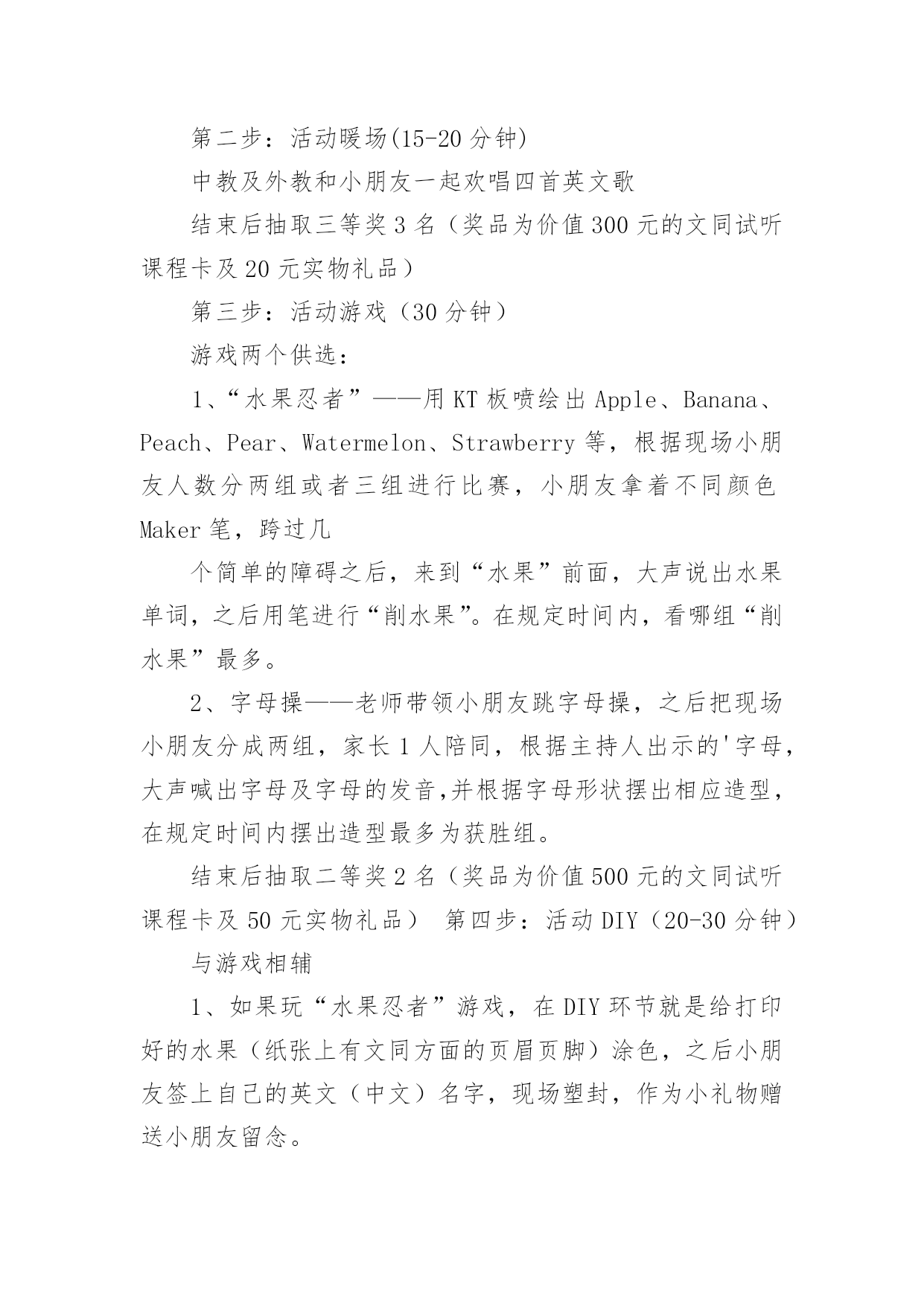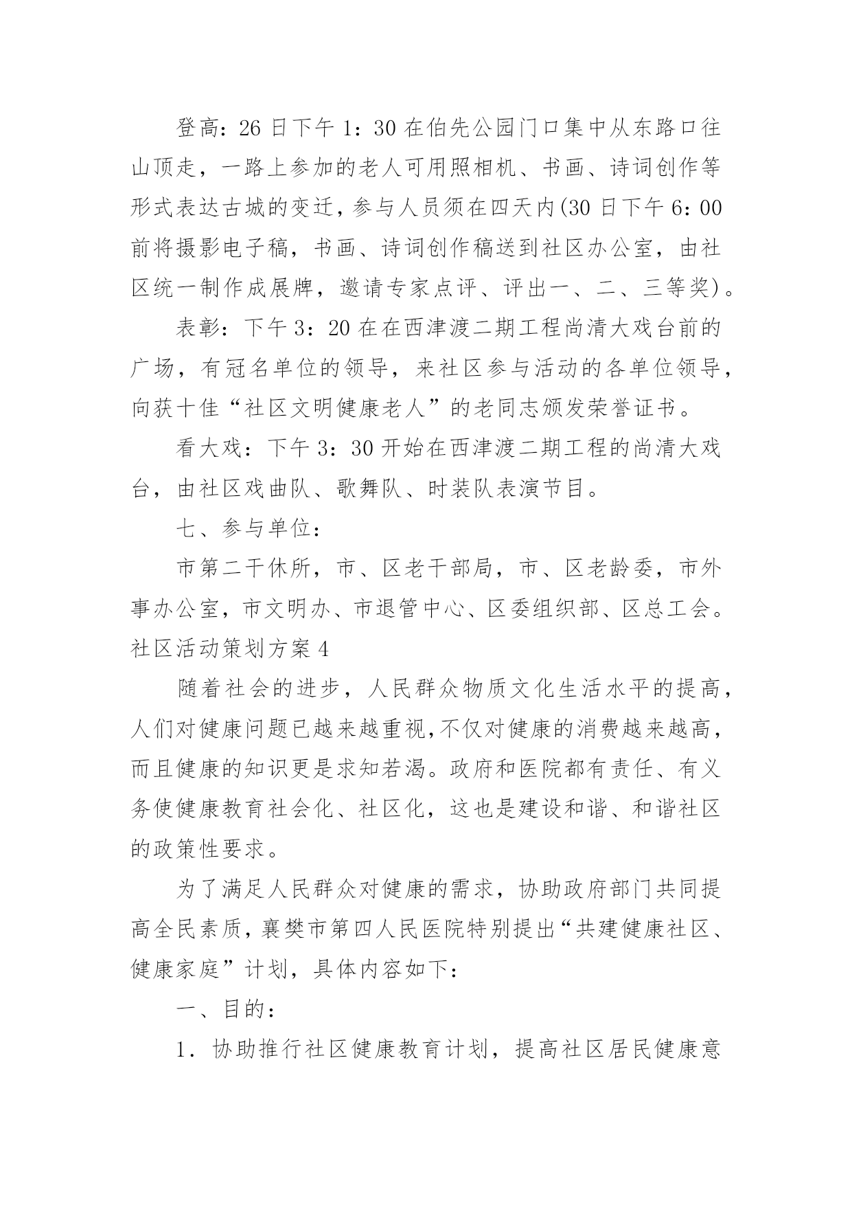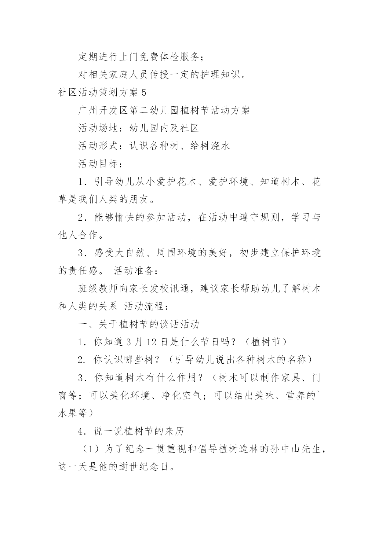 社区活动策划方案社区活动策划方案15篇为了确保事情或工作科学有序进行,通常需要预先制定一份完整的方案,方案是有很强可操作性的书面计划。那么我们该怎么去写方案呢?下面是小编帮大家整理的社区活动策划方案,欢迎大家借鉴与参考,希望对大家有所帮助。社区活动策划方案1幼儿英语社区活动----“美语进社区”系列活动一.活动介绍:二.活动目的1.提升活动组织单位的社会形象:通过活动,宣传和贯彻计生相关政策,提高花园路街道为民服务意识,为街道和社区创建良好的社会形象;2.提高文同国际儿童美语学校品牌的知名度:通过活动,为花园路街道所属社区适龄儿童提供良好的英语学习氛围,让他们更早、更好的接触专业、快乐英语学习方式,提高学习英语的兴趣,创建英语母语思维;三.活动主要步骤及内容第一步:活动现场布置(提前30分钟到场)现场布置登记咨询桌、太阳伞、文同地毯、宣传展架、横幅、宣传背板、宣传资料、礼品气球、DIY桌椅、音响设备、电脑及其他设备等;第二步:活动暖场(15-20分钟)中教及外教和小朋友一起欢唱四首英文歌结束后抽取三等奖3名(奖品为价值300元的文同试听课程卡及20元实物礼品)第三步:活动游戏(30分钟)游戏两个供选:1、“水果忍者”——用KT板喷绘出Apple、Banana、Peach、Pear、Watermelon、Strawberry等,根据现场小朋友人数分两组或者三组进行比赛,小朋友拿着不同颜色Maker笔,跨过几个简单的障碍之后,来到“水果”前面,大声说出水果单词,之后用笔进行“削水果”。在规定时间内,看哪组“削水果”最多。2、字母操——老师带领小朋友跳字母操,之后把现场小朋友分成两组,家长1人陪同,根据主持人出示的'字母,大声喊出字母及字母的发音,并根据字母形状摆出相应造型,在规定时间内摆出造型最多为获胜组。结束后抽取二等奖2名(奖品为价值500元的文同试听课程卡及50元实物礼品)第四步:活动DIY(20-30分钟)与游戏相辅1、如果玩“水果忍者”游戏,在DIY环节就是给打印好的水果(纸张上有文同方面的页眉页脚)涂色,之后小朋友签上自己的英文(中文)名字,现场塑封,作为小礼物赠送小朋友留念。2、如果玩字母操游戏,在DIY环节就是给打印好的字母(纸张上有文同方面的页眉页脚)涂色,之后小朋友签上自己的英文(中文)名字,现场塑封,作为小礼物赠送小朋友留念。注:在DIY之前,主持人说明DIY环节是我们教学特色之一,同时这个环节是对游戏中学习内容Review。结束后抽取一等奖3名(奖品为价值800元的文同代金券或等价进口英语阅读故事书一套)第五步:发放纪念品(10分钟)抽奖结束后,所有到场小朋友都能获赠纸质购物袋一个、Phonics光盘一张、魔术气球玩偶一个。现场活动照片文同网站提供免费下载。第六步:活动结束,收拾现场,总结备注:1.活动当天如遇恶劣天气,活动顺延或取消;2.活动时间根据当天天气情况灵活变动:上午9:00-11:00下午16:00-18:00;3.活动日期根据天气情况周六/日灵活变动(周四前根据天气预报与社区居委会确定活动时间);社区活动策划方案2活动b时间20xx年6月20日上午活动地点翠岛花城社区活动目的了解端午节的习俗和来历,参与端午节的一些庆祝活动。同时,通过端午节来了解中国的传统节日,用心去体验我国的传统节日中蕴涵的意义,促进邻里和睦。活动主题艾香端午邻里和活动内容话端午演讲、展览活动.设置一个主席台,由故事员或朗诵员站在主席台上发表演讲或朗诵。要求每人讲述一个与端午有关的故事或习俗。(发挥居民特长,讲讲他们眼中的端午,有助于年轻一代对传统节日有更多感性的了解,更加热爱如今的美好生活)开展端午知识展览,设置关于端午节的展板不少于1块,挂图不少于10张,图书不少于50本;邀请故事员讲关于端午节的2-3个故事。传统厨艺+诗艺比拼由参赛者自己准备材料,要求每人制作一道与端午传统习俗有关的菜肴(本地菜肴、外地菜肴均可),不仅要求菜的色香味俱佳,而且制作者要说出菜所代表的意义,并朗诵一首与端午有关的诗,诗可以是古诗,也可以是现代诗,可以是名家之作,也可以现场自己即兴创作。(中国的传统节日大多与吃有关,端午吃粽子,可算是全国通行的习俗,一般人对此也比较熟悉。但端午节在吃方面还有很多的习俗,而且各地也会有差异,除了南京端午的五红之外,其他地区也都有传统菜肴,如浙江吃大蒜蛋、吃薄煎饼等社区端午节包粽子活动策划方案社区端午节包粽子活动策划方案。屈原是一位爱国诗人,为了纪念他,所以有人把端午节还被称作诗人节,本活动不仅要做出美味的菜肴,而且要让每一道菜都带上端午的色彩、诗意的色彩。评判的标准也必须两者兼顾)端午三创卫生大赛设计若干卫生包干区,按照参赛人数多少规定由一人或多人承包区内卫生。要求区内物品整洁,无灰尘,无蚊蝇虫蚁。准备不同