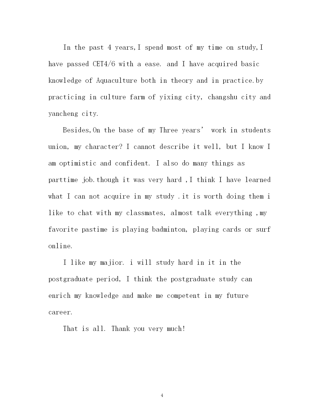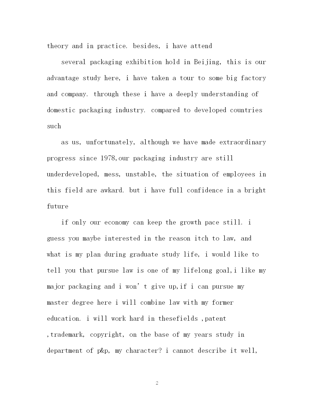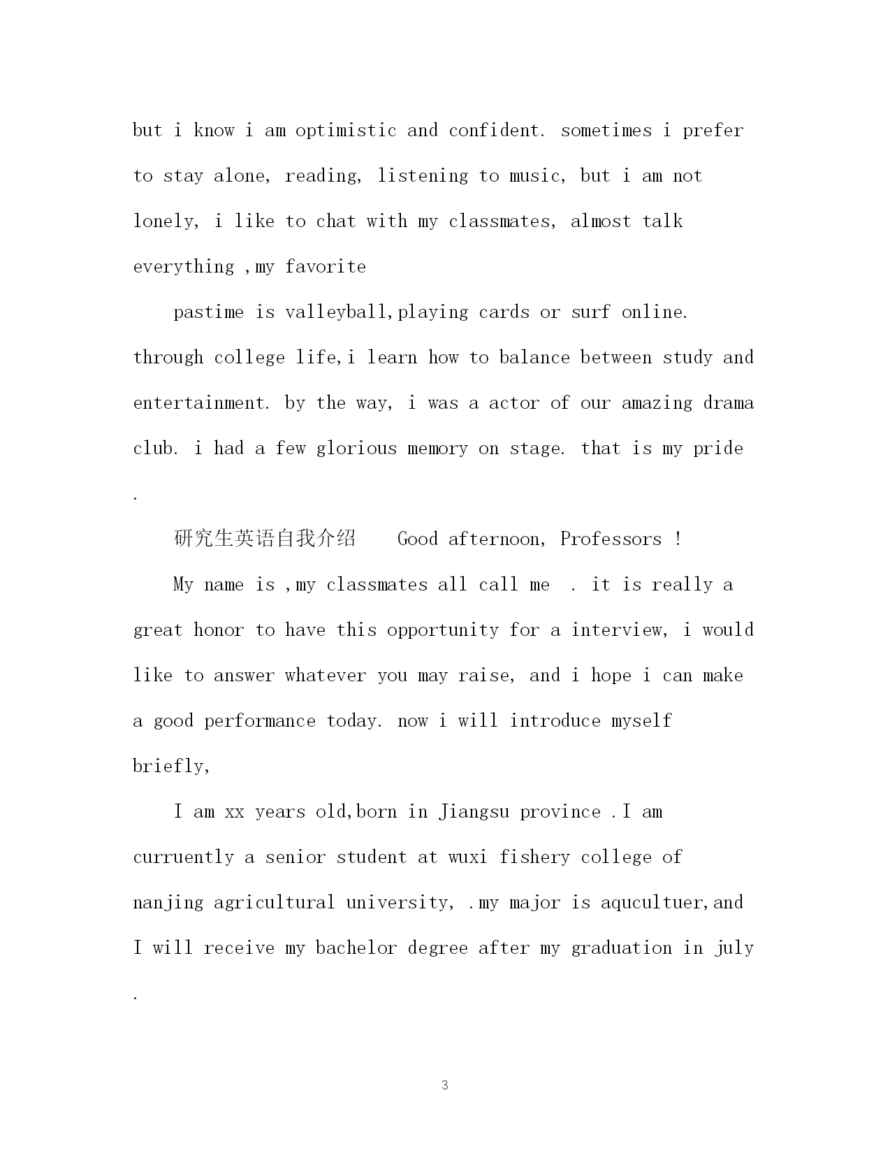 此资料由网络收集而来,如有侵权请告知上传者立即删除。资料共分享,我们负责传递知识。PAGEPAGE4研究生英语自我介绍2018研究生英语自我介绍研究生复试自我介绍分为两种:一种是中文介绍,一种是英文介绍。下面,应届毕业生网为大家整理了2018研究生的面试英语自我介绍,供大家参考,希望可以帮助到大家。研究生英语自我介绍goodmorning,mynameisjack,itisreallyagreathonortohavethisopportunityforainterview,iwouldliketoanswerwhateveryoumayraise,andihopeicanmakeagoodperformancetoday,eventuallyenrollinthisprestigiousuniversityinseptember.nowiwillintroducemyselfbriefly,iam21yearsold,borninheilongjiangprovince,northeastofchina,andiamcurruentlyaseniorstudentatbeijingXXuni.mymajorispackagingengineering.andiwillreceivemybachelordegreeaftermygraduationinjune.inthepast4years,ispendmostofmytimeonstudy,ihavepassedCET4/6withaease.andihaveacquiredbasicknowledgeofpackagingandpublishingbothintheoryandinpractice.besides,ihaveattendseveralpackagingexhibitionholdinBeijing,thisisouradvantagestudyhere,ihavetakenatourtosomebigfactoryandcompany.throughtheseihaveadeeplyunderstandingofdomesticpackagingindustry.comparedtodevelopedcountriessuchasus,unfortunately,althoughwehavemadeextraordinaryprogresssince1978,ourpackagingindustryarestillunderdeveloped,mess,unstable,thesituationofemployeesinthisfieldareawkard.butihavefullconfidenceinabrightfutureifonlyoureconomycankeepthegrowthpacestill.iguessyoumaybeinterestedinthereasonitchtolaw,andwhatismyplanduringgraduatestudylife,iwouldliketotellyouthatpursuelawisoneofmylifelonggoal,ilikemymajorpackagingandiwon’tgiveup,ificanpursuemymasterdegreehereiwillcombinelawwithmyformereducation.iwillworkhardinthesefields,patent,trademark,copyright,onthebaseofmyyearsstudyindepartmentofp&p,mycharacter?icannotdescribeitwell,butiknowiamoptimisticandconfident.sometimesiprefertostayalone,reading,listeningtomusic,butiamnotlonely,iliketochatwithmyclassmates,almosttalkeverything,myfavoritepastimeisvalleyball,playingcardsorsurfonline.throughcollegelife,ilearnhowtobalancebetweenstudyandentertainment.bytheway,iwasaactorofouramazingdramaclub.ihadafewgloriousmemoryonstage.thatismypride.研究生英语自我介绍Goodafternoon,Professors!M