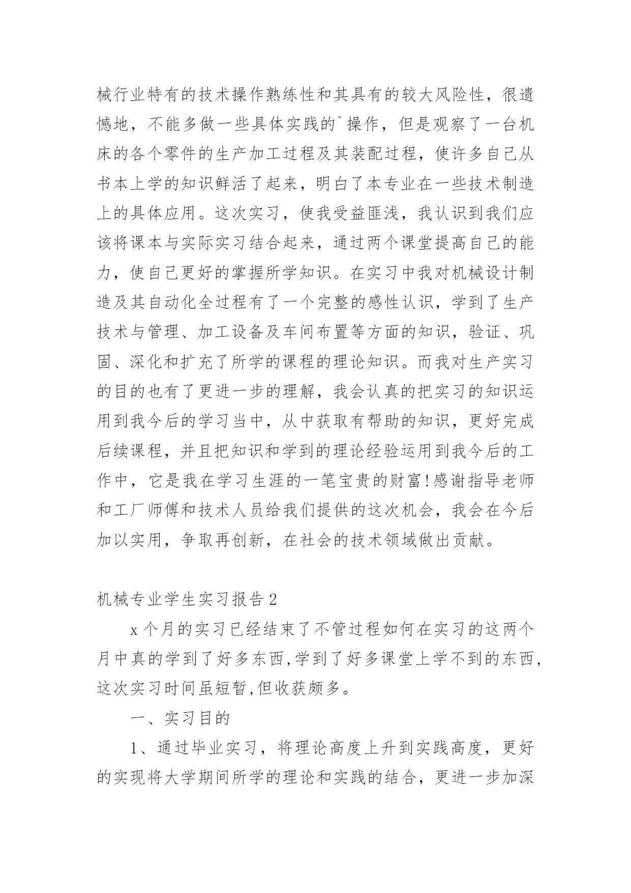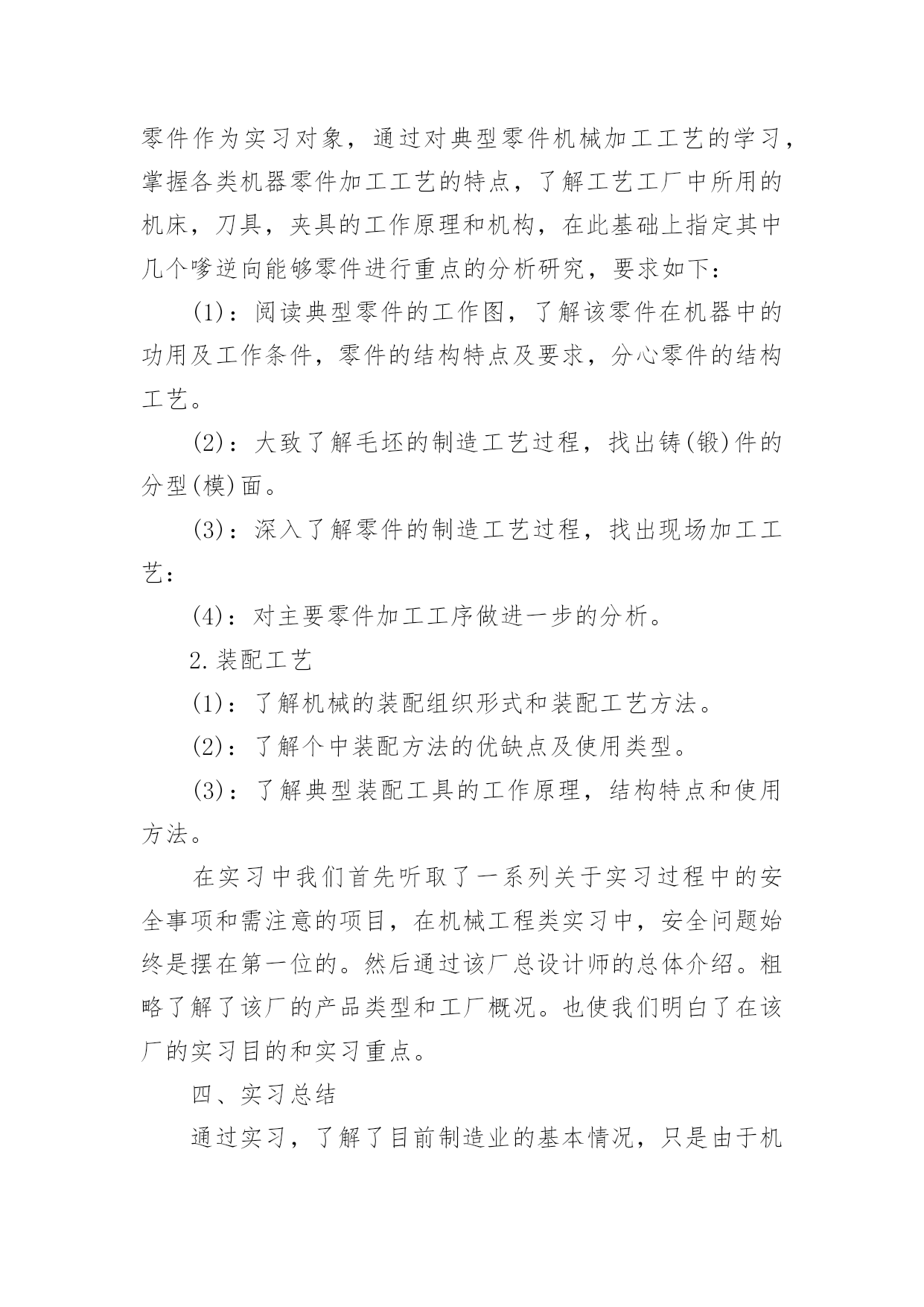 机械专业学生实习报告在现实生活中,我们都不可避免地要接触到报告,我们在写报告的时候要避免篇幅过长。相信很多朋友都对写报告感到非常苦恼吧,下面是小编精心整理的机械专业学生实习报告,希望能够帮助到大家。机械专业学生实习报告1今年寒假,学院为了使我们更多了解机电产品、设备,提高对机电工程制造技术的认识,加深机电在工业各领域应用的感性认识,开阔视野,了解相关设备及技术资料,熟悉典型零件的加工工艺,特意督促我们到一些拥有较多类型的机电一体化设备,生产技术较先进的工厂进行生产操作实习。于是,我在朋友的介绍下来到了西安博信机电设备厂进行生产实习。一、实习目的1、认识实习能培养我们全面思考的能力。如何运用液压传动等相关知识达到电动调节温湿度、如何更为简便的对系统进行控制等,都是值得我深思的地方。2、认识实习能培养我们灵活思考与解决问题的能力。所参观的生产车间很多都是一些继电器和控制阀的基本生产流程,让我想到了与课本知识相联系的重要性。3、实习培养我们较强的是读图与实践能力。通过实习,我们更详细的了解了和我们同专业的工作人员是如何工作的,虽然由于专业知识有限,我们了解的还不是很详细,但是我们对我们自己以后要做的作有了一个感性的认识,这样更有利于以后理论的学习,感性认识上升为理性认识。4、通过实习,广泛接触工人和听工人技术人员的专题报告,学习他们的好僧产经验,技术革新和科研成果,学习他们在四化建设中的贡献精神。5、通过参观有关工厂,掌握一台机器从毛坯到产品的整个生产过程,组织管理,设备选择和车间布置等方面的知识,扩大知识。6、通过记实习日记,写实习报告,锻炼与培养我们的观察,分析问题以及搜集和整理技术资料等方面的能力。二、实习时间20xx年x月x日至20xx年x月x日三、实习单位xx机电设备厂是致力于暖通空调自控产品研发、生产销售的专业设备服务提供商。本厂现有产品电动调节阀、电动平衡式调节阀、温湿度控制箱、水位显控仪、压差控制箱等。为了达到上述实习目的,生产实习的内容和要求有:x月x日,校内实习动员。老师给概括的讲了实习内容、实习要求以及实习中的安全问题。x月x日,实习准备。记录本、有关专业书籍、食宿用品等。x月x日,出发。1.机械零件的加工根据实习工厂的产品,选定几种典型零件作为实习对象,通过对典型零件机械加工工艺的学习,掌握各类机器零件加工工艺的特点,了解工艺工厂中所用的机床,刀具,夹具的工作原理和机构,在此基础上指定其中几个嗲逆向能够零件进行重点的分析研究,要求如下:(1):阅读典型零件的工作图,了解该零件在机器中的功用及工作条件,零件的结构特点及要求,分心零件的结构工艺。(2):大致了解毛坯的制造工艺过程,找出铸(锻)件的分型(模)面。(3):深入了解零件的制造工艺过程,找出现场加工工艺:(4):对主要零件加工工序做进一步的分析。2.装配工艺(1):了解机械的装配组织形式和装配工艺方法。(2):了解个中装配方法的优缺点及使用类型。(3):了解典型装配工具的工作原理,结构特点和使用方法。在实习中我们首先听取了一系列关于实习过程中的安全事项和需注意的项目,在机械工程类实习中,安全问题始终是摆在第一位的。然后通过该厂总设计师的总体介绍。粗略了解了该厂的产品类型和工厂概况。也使我们明白了在该厂的实习目的和实习重点。四、实习总结通过实习,了解了目前制造业的基本情况,只是由于机械行业特有的技术操作熟练性和其具有的较大风险性,很遗憾地,不能多做一些具体实践的`操作,但是观察了一台机床的各个零件的生产加工过程及其装配过程,使许多自己从书本上学的知识鲜活了起来,明白了本专业在一些技术制造上的具体应用。这次实习,使我受益匪浅,我认识到我们应该将课本与实际实习结合起来,通过两个课堂提高自己的能力,使自己更好的掌握所学知识。在实习中我对机械设计制造及其自动化全过程有了一个完整的感性认识,学到了生产技术与管理、加工设备及车间布置等方面的知识,验证、巩固、深化和扩充了所学的课程的理论知识。而我对生产实习的目的也有了更进一步的理解,我会认真的把实习的知识运用到我今后的学习当中,从中获取有帮助的知识,更好完成后续课程,并且把知识和学到的理论经验运用到我今后的工作中,它是我在学习生涯的一笔宝贵的财富!感谢指导老师和工厂师傅和技术人员给我们提供的这次机会,我会在今后加以实用,争取再创新,在社会的技术领域做出贡献。机械专业学生实习报告2x个月的实习已经结束了不管过程如何在实习的这两个月中真的学到了好多东西,学到了好多课堂上学不到的东西,这次实习时间虽短暂,但收获颇多。一、实习目的1、通过毕业实习,将理论高度上升到实践高度,更好的实现将大学期间所学的理论和实践的结合,更进一步加深对理论知识的理解,了解和掌握实际生产中的生产流程、工艺原理和技术要求,为今后学习和实际工作打下良