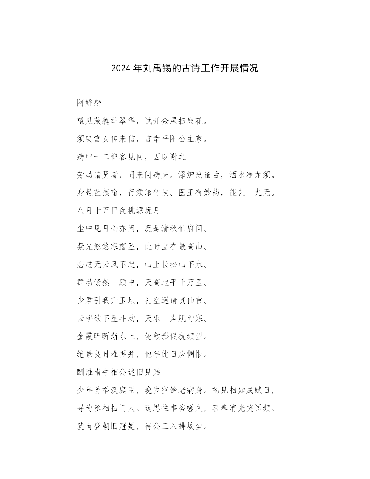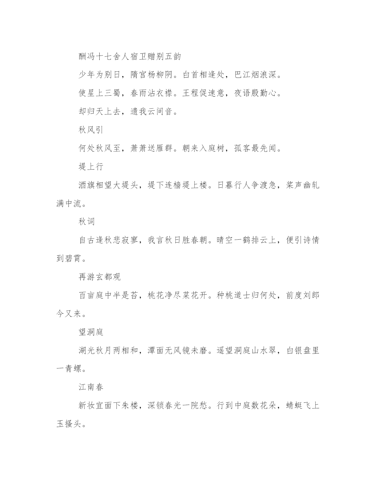 2024年刘禹锡的古诗工作开展情况阿娇怨望见葳蕤举翠华,试开金屋扫庭花。须臾宫女传来信,言幸平阳公主家。病中一二禅客见问,因以谢之劳动诸贤者,同来问病夫。添炉烹雀舌,洒水净龙须。身是芭蕉喻,行须筇竹扶。医王有妙药,能乞一丸无。八月十五日夜桃源玩月尘中见月心亦闲,况是清秋仙府间。凝光悠悠寒露坠,此时立在最高山。碧虚无云风不起,山上长松山下水。群动翛然一顾中,天高地平千万里。少君引我升玉坛,礼空遥请真仙官。云輧欲下星斗动,天乐一声肌骨寒。金霞昕昕渐东上,轮欹影促犹频望。绝景良时难再并,他年此日应惆怅。酬淮南牛相公述旧见贻少年曾忝汉庭臣,晚岁空馀老病身。初见相如成赋日,寻为丞相扫门人。追思往事咨嗟久,喜奉清光笑语频。犹有登朝旧冠冕,待公三入拂埃尘。酬冯十七舍人宿卫赠别五韵少年为别日,隋宫杨柳阴。白首相逢处,巴江烟浪深。使星上三蜀,春雨沾衣襟。王程促速意,夜语殷勤心。却归天上去,遗我云间音。秋风引何处秋风至,萧萧送雁群。朝来入庭树,孤客最先闻。堤上行酒旗相望大堤头,堤下连樯堤上楼。日暮行人争渡急,桨声幽轧满中流。秋词自古逢秋悲寂寥,我言秋日胜春朝。晴空一鹤排云上,便引诗情到碧霄。再游玄都观百亩庭中半是苔,桃花净尽菜花开。种桃道士归何处,前度刘郎今又来。望洞庭湖光秋月两相和,潭面无风镜未磨。遥望洞庭山水翠,白银盘里一青螺。江南春新妆宜面下朱楼,深锁春光一院愁。行到中庭数花朵,蜻蜓飞上玉搔头。竹枝白帝城头春草生,白盐山下蜀江清。南人上来歌一曲,北人莫上动乡情。竹枝瞿塘嘈嘈十二滩,此中道路古来难。长恨人心不如水,等闲平地起波澜。