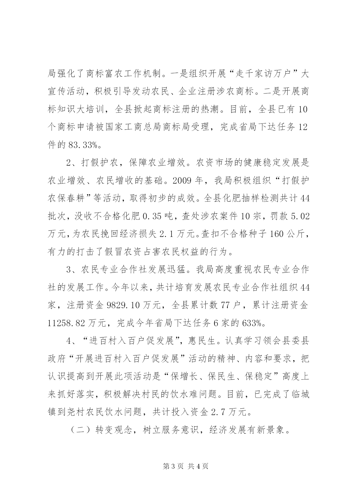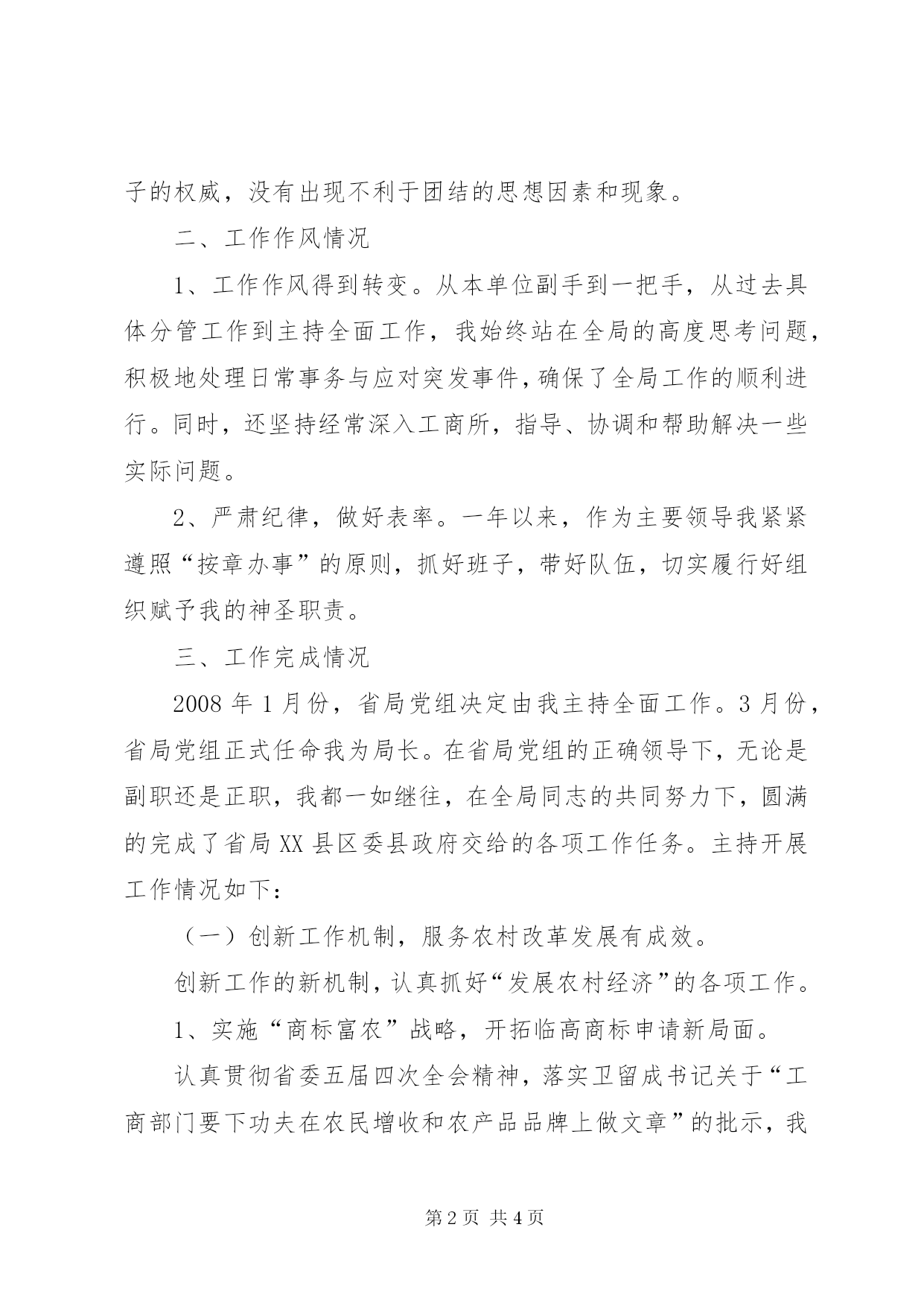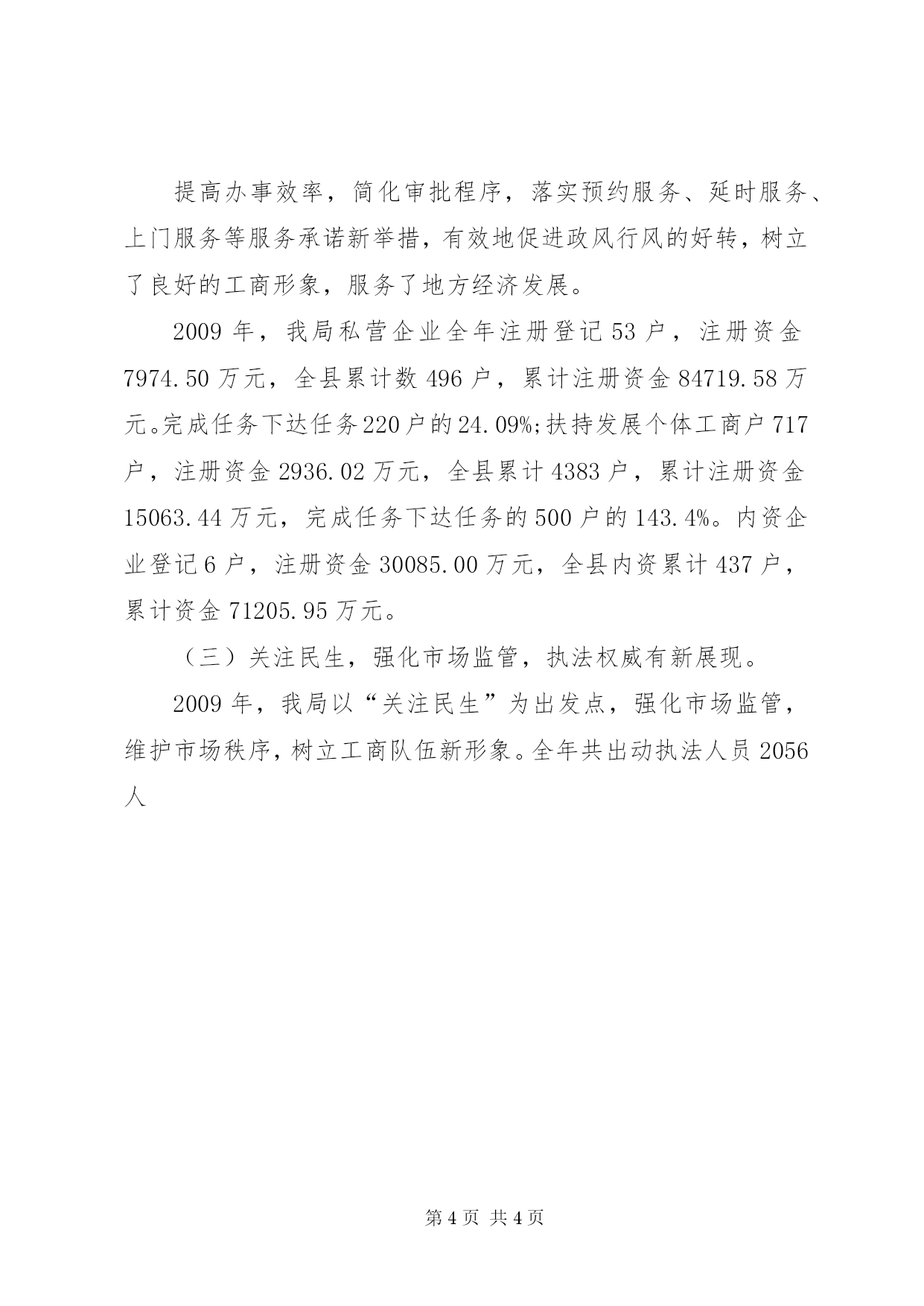 第PAGE\*Arabic\*MERGEFORMAT4页共NUMPAGES\*MERGEFORMAT4页工商局领导述职述廉报告工商局领导述职述廉报告2009年以来,在省工商局及县委县政府的正确领导下,我认真履行职责,始终围绕着全县工商行政管理中心工作和服务地方经济发展中心任务的“两个中心”,坚持监管与发展、监管与服务、监管与维权、监管与执法“四个统一”,推进制度化、规范化、程序化、法治化“四化建设”。学习实践科学发展观,真抓实干,开拓进取,兢兢业业,不断创新,以高度的政治责任感和饱满的工作热情,较好地完成省局XX县区委县政府交给的各项工作任务。下面,我从以下五个方面报告我个人2009年度的政治思想、工作作风和开展工作情况。一、政治思想1、学习政治思想理论。认真学习“三个代表”重要思想和学习实践科学发展观,增强自身的思想理论素质,紧紧围绕着全省工商行政管理的中心XX县区委县政府的中心开展工作,不断解放思想,不断创新,时刻保持与省局党组高度一致,实现驾驭全局工作本领的提高,增强服务人民意识。2、坚决贯彻民主集中制原则。涉及局里面重大事情均上党组会议或局长办公会议研究决定。在处事为人上,坚持诚实做人,踏实做事;在处理工作关系上,比较注意与副职沟通,维护好班子的权威,没有出现不利于团结的思想因素和现象。二、工作作风情况1、工作作风得到转变。从本单位副手到一把手,从过去具体分管工作到主持全面工作,我始终站在全局的高度思考问题,积极地处理日常事务与应对突发事件,确保了全局工作的顺利进行。同时,还坚持经常深入工商所,指导、协调和帮助解决一些实际问题。2、严肃纪律,做好表率。一年以来,作为主要领导我紧紧遵照“按章办事”的原则,抓好班子,带好队伍,切实履行好组织赋予我的神圣职责。三、工作完成情况2008年1月份,省局党组决定由我主持全面工作。3月份,省局党组正式任命我为局长。在省局党组的正确领导下,无论是副职还是正职,我都一如继往,在全局同志的共同努力下,圆满的完成了省局XX县区委县政府交给的各项工作任务。主持开展工作情况如下:(一)创新工作机制,服务农村改革发展有成效。创新工作的新机制,认真抓好“发展农村经济”的各项工作。1、实施“商标富农”战略,开拓临高商标申请新局面。认真贯彻省委五届四次全会精神,落实卫留成书记关于“工商部门要下功夫在农民增收和农产品品牌上做文章”的批示,我局强化了商标富农工作机制。一是组织开展“走千家访万户”大宣传活动,积极引导发动农民、企业注册涉农商标。二是开展商标知识大培训,全县掀起商标注册的热潮。目前,全县已有10个商标申请被国家工商总局商标局受理,完成省局下达任务12件的83.33%。2、打假护农,保障农业增效。农资市场的健康稳定发展是农业增效、农民增收的基础。2009年,我局积极组织“打假护农保春耕”等活动,取得初步的成效。全县化肥抽样检测共计44批次,没收不合格化肥0.35吨,查处涉农案件10宗,罚款5.02万元,为农民挽回经济损失2.1万元。查扣不合格种子160公斤,有力的打击了假冒农资占害农民权益的行为。3、农民专业合作社发展迅猛。我局高度重视农民专业合作社的发展工作。今年以来,共计培育发展农民专业合作社组织44家,注册资金9829.10万元,全县累计数77户,累计注册资金11258.82万元,完成今年省局下达任务6家的633%。4、“进百村入百户促发展”,惠民生。认真学习领会县委县政府“开展进百村入百户促发展”活动的精神、内容和要求,把认识提高到开展此项活动是“保增长、保民生、保稳定”高度上来抓好落实,积极解决村民的饮水难问题。目前,已完成了临城镇到尧村农民饮水问题,共计投入资金2.7万元。(二)转变观念,树立服务意识,经济发展有新景象。提高办事效率,简化审批程序,落实预约服务、延时服务、上门服务等服务承诺新举措,有效地促进政风行风的好转,树立了良好的工商形象,服务了地方经济发展。2009年,我局私营企业全年注册登记53户,注册资金7974.50万元,全县累计数496户,累计注册资金84719.58万元。完成任务下达任务220户的24.09%;扶持发展个体工商户717户,注册资金2936.02万元,全县累计4383户,累计注册资金15063.44万元,完成任务下达任务的500户的143.4%。内资企业登记6户,注册资金30085.00万元,全县内资累计437户,累计资金71205.95万元。(三)关注民生,强化市场监管,执法权威有新展现。2009年,我局以“关注民生”为出发点,强化市场监管,维护市场秩序,树立工商队伍新形象。全年共出动执法人员2056人