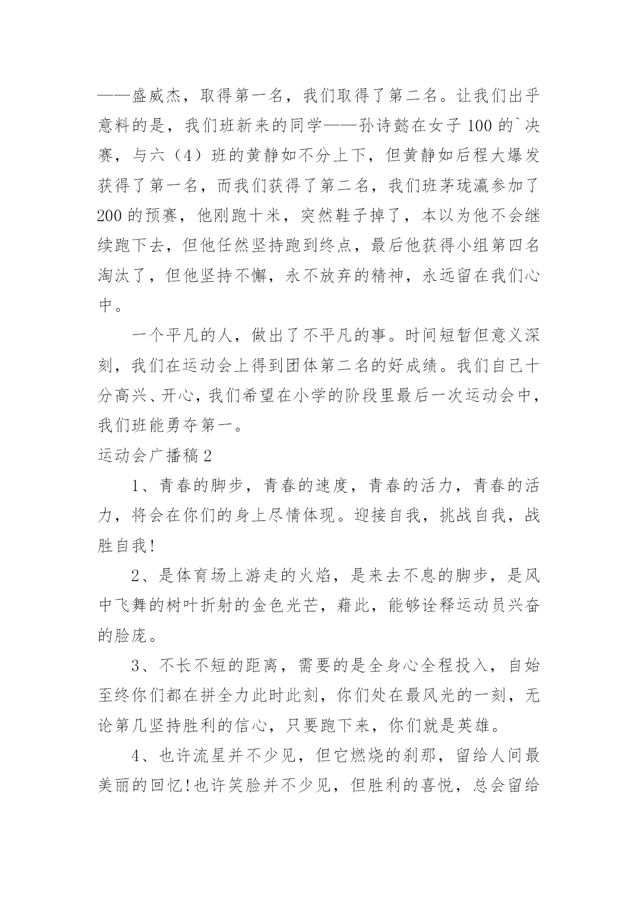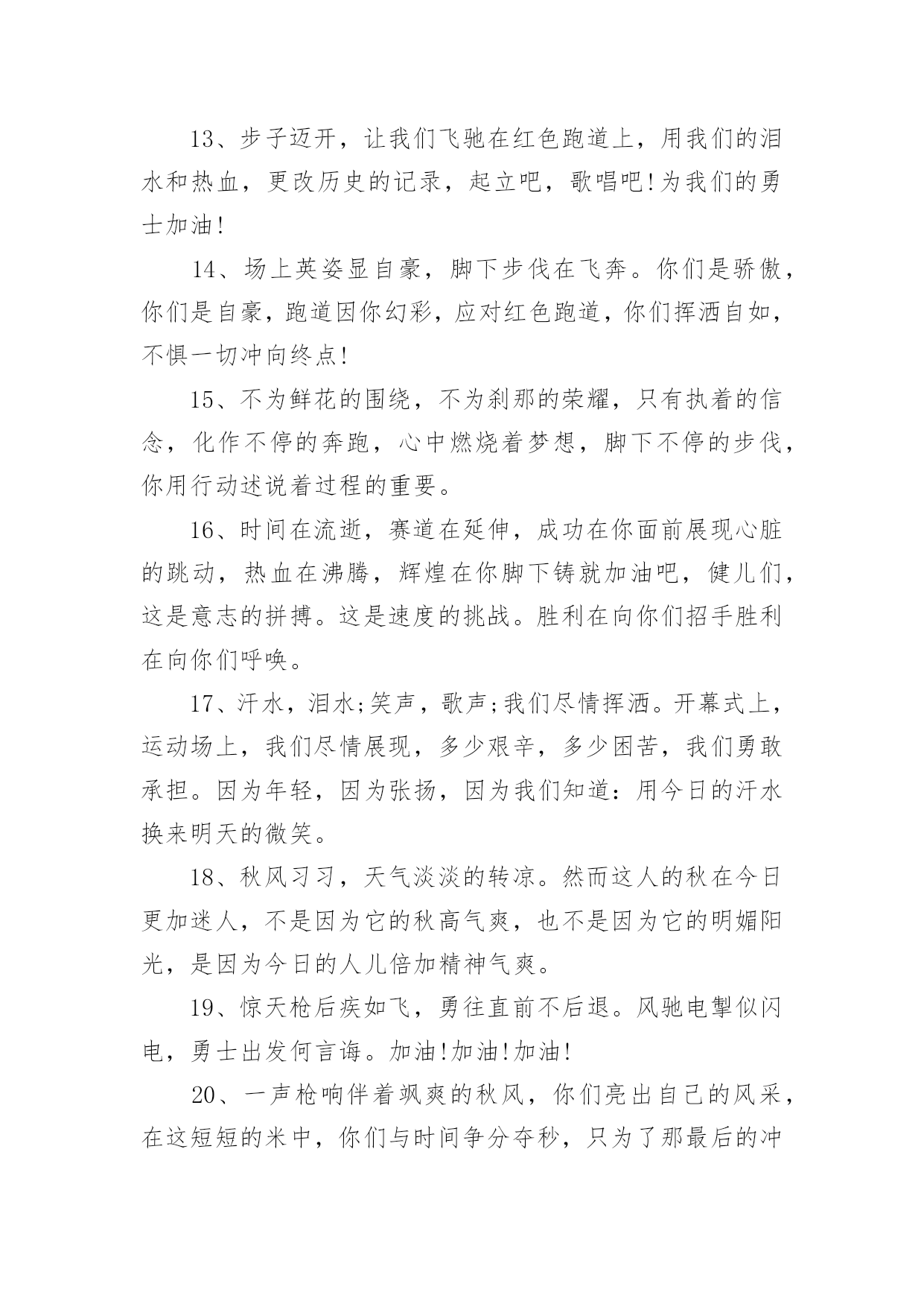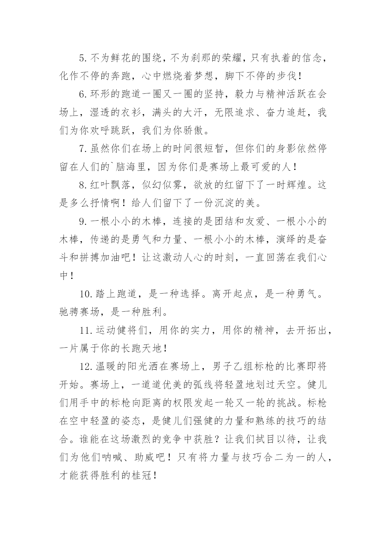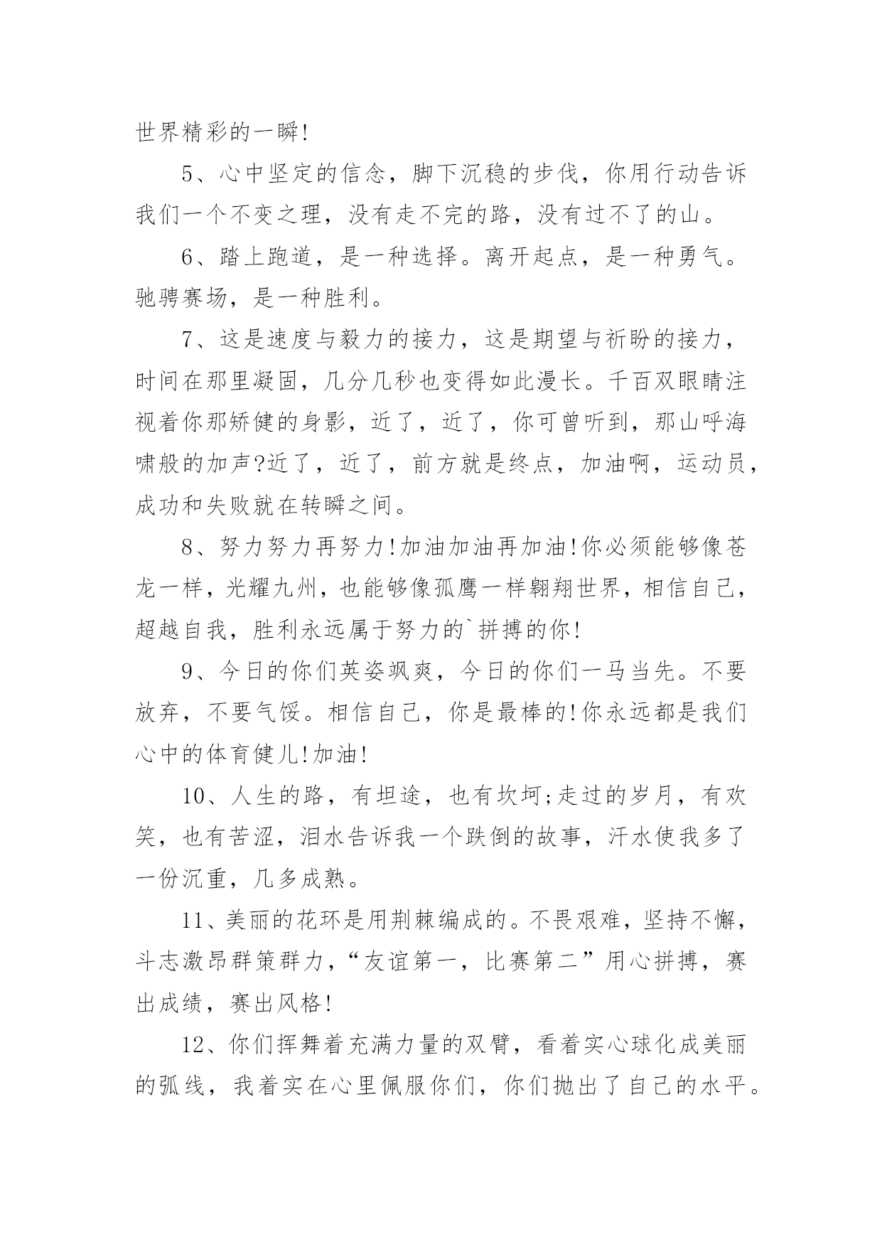 运动会广播稿运动会广播稿在广播站锻炼的学生,大家广播前一般都会提前做好广播稿,一份一流的广播稿能提高节目效果,那么广播稿应该怎么写才合适呢?以下是小编整理的运动会广播稿,欢迎阅读与收藏。运动会广播稿1秋风送爽、丹桂飘香,我们迎来了一学期一度的运动会,运动会上运动健儿们奋勇拼搏的为班争光,运动会上运动健儿们很辛苦,场下同学也辛苦,他们拼命地写广播稿,大家互相合作,在这次运动会里我们一定要努力取得优异的成绩。星期四早上,我们就进行800米的决赛,我们班的陈侃、赵誉汇、李佳宁都整装待发、跃跃欲试,终于“嘭”的一声响了,我们班的陈侃就想一只野豹冲了出去,不一会就成了第一名,老师又发令了,“嘭”这一声说明陈侃只有一圈了,陈侃发飚了,他像一支离弦的箭冲入终点,他取得了第一名的好成绩,而且他还破纪录。我们班的沙坑王子——盛威杰在跳远场地再现威风,他第一跳了3米34,别的参赛选手都惊吓了一下,出现了各种各样的失误,不是踩线,就是跳得很近,我们班的沙坑王子,轻易地进入了决赛,我们班的沙坑王子越战越勇,马上就要得第一名时,六(4)班新来的同学夏天宇,他猛地一跳,超越了我们班的“沙坑王子”——盛威杰,取得第一名,我们取得了第二名。让我们出乎意料的是,我们班新来的同学——孙诗懿在女子100的`决赛,与六(4)班的黄静如不分上下,但黄静如后程大爆发获得了第一名,而我们获得了第二名,我们班茅珑瀛参加了200的预赛,他刚跑十米,突然鞋子掉了,本以为他不会继续跑下去,但他任然坚持跑到终点,最后他获得小组第四名淘汰了,但他坚持不懈,永不放弃的精神,永远留在我们心中。一个平凡的人,做出了不平凡的事。时间短暂但意义深刻,我们在运动会上得到团体第二名的好成绩。我们自己十分高兴、开心,我们希望在小学的阶段里最后一次运动会中,我们班能勇夺第一。运动会广播稿21、青春的脚步,青春的速度,青春的活力,青春的活力,将会在你们的身上尽情体现。迎接自我,挑战自我,战胜自我!2、是体育场上游走的火焰,是来去不息的脚步,是风中飞舞的树叶折射的金色光芒,藉此,能够诠释运动员兴奋的脸庞。3、不长不短的距离,需要的是全身心全程投入,自始至终你们都在拼全力此时此刻,你们处在最风光的一刻,无论第几坚持胜利的信心,只要跑下来,你们就是英雄。4、也许流星并不少见,但它燃烧的刹那,留给人间最美丽的回忆!也许笑脸并不少见,但胜利的喜悦,总会留给世界精彩的一瞬!5、心中坚定的信念,脚下沉稳的步伐,你用行动告诉我们一个不变之理,没有走不完的路,没有过不了的山。6、踏上跑道,是一种选择。离开起点,是一种勇气。驰骋赛场,是一种胜利。7、这是速度与毅力的接力,这是期望与祈盼的接力,时间在那里凝固,几分几秒也变得如此漫长。千百双眼睛注视着你那矫健的身影,近了,近了,你可曾听到,那山呼海啸般的加声?近了,近了,前方就是终点,加油啊,运动员,成功和失败就在转瞬之间。8、努力努力再努力!加油加油再加油!你必须能够像苍龙一样,光耀九州,也能够像孤鹰一样翱翔世界,相信自己,超越自我,胜利永远属于努力的`拼搏的你!9、今日的你们英姿飒爽,今日的你们一马当先。不要放弃,不要气馁。相信自己,你是最棒的!你永远都是我们心中的体育健儿!加油!10、人生的路,有坦途,也有坎坷;走过的岁月,有欢笑,也有苦涩,泪水告诉我一个跌倒的故事,汗水使我多了一份沉重,几多成熟。11、美丽的花环是用荆棘编成的。不畏艰难,坚持不懈,斗志激昂群策群力,“友谊第一,比赛第二”用心拼搏,赛出成绩,赛出风格!12、你们挥舞着充满力量的双臂,看着实心球化成美丽的弧线,我着实在心里佩服你们,你们抛出了自己的水平。13、步子迈开,让我们飞驰在红色跑道上,用我们的泪水和热血,更改历史的记录,起立吧,歌唱吧!为我们的勇士加油!14、场上英姿显自豪,脚下步伐在飞奔。你们是骄傲,你们是自豪,跑道因你幻彩,应对红色跑道,你们挥洒自如,不惧一切冲向终点!15、不为鲜花的围绕,不为刹那的荣耀,只有执着的信念,化作不停的奔跑,心中燃烧着梦想,脚下不停的步伐,你用行动述说着过程的重要。16、时间在流逝,赛道在延伸,成功在你面前展现心脏的跳动,热血在沸腾,辉煌在你脚下铸就加油吧,健儿们,这是意志的拼搏。这是速度的挑战。胜利在向你们招手胜利在向你们呼唤。17、汗水,泪水;笑声,歌声;我们尽情挥洒。开幕式上,运动场上,我们尽情展现,多少艰辛,多少困苦,我们勇敢承担。因为年轻,因为张扬,因为我们知道:用今日的汗水换来明天的微笑。18、秋风习习,天气淡淡的转凉。然而这人的秋在今日更加迷人,不是因为它的秋高气爽,也不是因为它的明媚阳光,是因为今日的人儿倍加精神气爽。19、惊天枪后疾如飞,勇往直前不后退。风驰电掣似闪电,勇士出发何言诲。加油!加油!加油!20、一声枪响伴着飒爽的秋风,你们亮出自