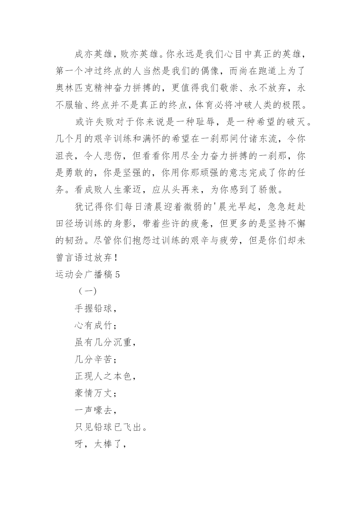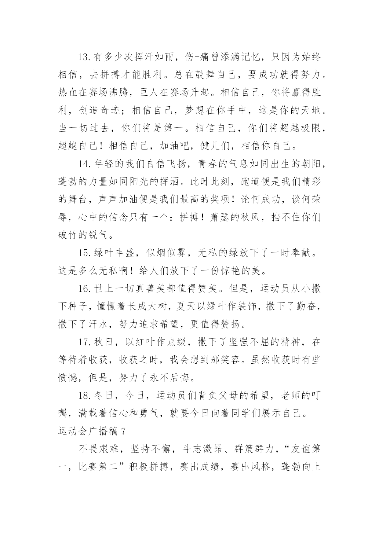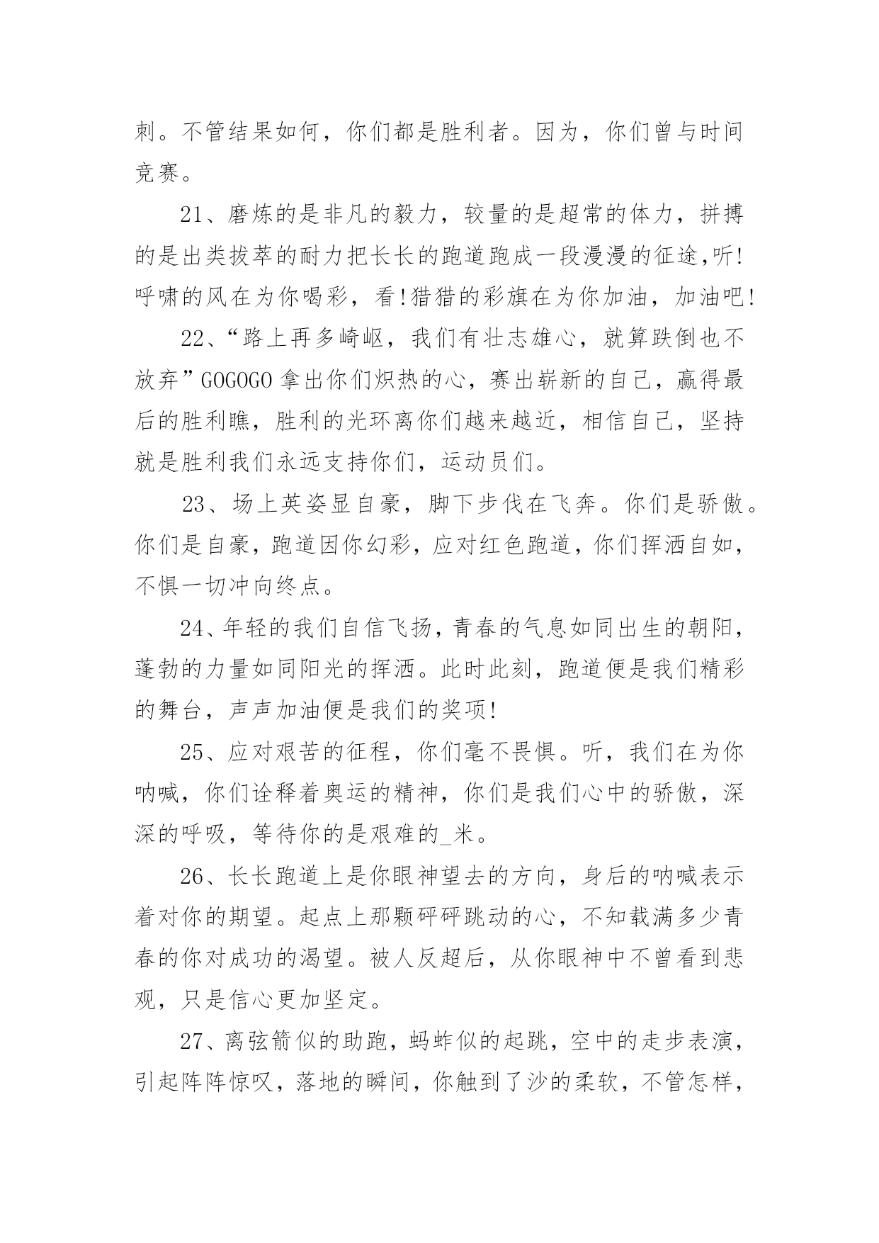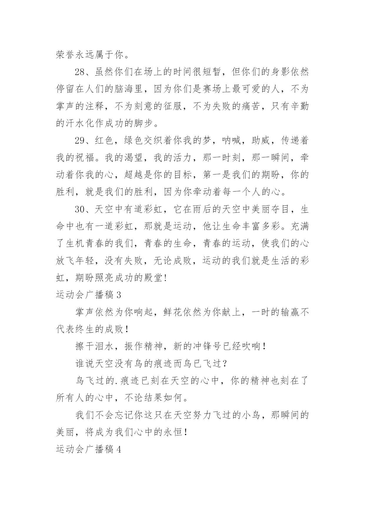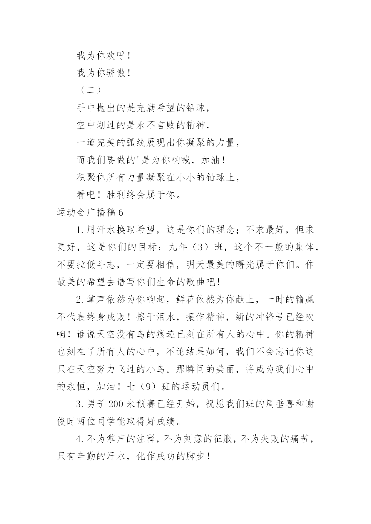 运动会广播稿运动会广播稿在广播站锻炼的学生,大家广播前一般都会提前做好广播稿,一份一流的广播稿能提高节目效果,那么广播稿应该怎么写才合适呢?以下是小编整理的运动会广播稿,欢迎阅读与收藏。运动会广播稿1秋风送爽、丹桂飘香,我们迎来了一学期一度的运动会,运动会上运动健儿们奋勇拼搏的为班争光,运动会上运动健儿们很辛苦,场下同学也辛苦,他们拼命地写广播稿,大家互相合作,在这次运动会里我们一定要努力取得优异的成绩。星期四早上,我们就进行800米的决赛,我们班的陈侃、赵誉汇、李佳宁都整装待发、跃跃欲试,终于“嘭”的一声响了,我们班的陈侃就想一只野豹冲了出去,不一会就成了第一名,老师又发令了,“嘭”这一声说明陈侃只有一圈了,陈侃发飚了,他像一支离弦的箭冲入终点,他取得了第一名的好成绩,而且他还破纪录。我们班的沙坑王子——盛威杰在跳远场地再现威风,他第一跳了3米34,别的参赛选手都惊吓了一下,出现了各种各样的失误,不是踩线,就是跳得很近,我们班的沙坑王子,轻易地进入了决赛,我们班的沙坑王子越战越勇,马上就要得第一名时,六(4)班新来的同学夏天宇,他猛地一跳,超越了我们班的“沙坑王子”——盛威杰,取得第一名,我们取得了第二名。让我们出乎意料的是,我们班新来的同学——孙诗懿在女子100的`决赛,与六(4)班的黄静如不分上下,但黄静如后程大爆发获得了第一名,而我们获得了第二名,我们班茅珑瀛参加了200的预赛,他刚跑十米,突然鞋子掉了,本以为他不会继续跑下去,但他任然坚持跑到终点,最后他获得小组第四名淘汰了,但他坚持不懈,永不放弃的精神,永远留在我们心中。一个平凡的人,做出了不平凡的事。时间短暂但意义深刻,我们在运动会上得到团体第二名的好成绩。我们自己十分高兴、开心,我们希望在小学的阶段里最后一次运动会中,我们班能勇夺第一。运动会广播稿21、青春的脚步,青春的速度,青春的活力,青春的活力,将会在你们的身上尽情体现。迎接自我,挑战自我,战胜自我!2、是体育场上游走的火焰,是来去不息的脚步,是风中飞舞的树叶折射的金色光芒,藉此,能够诠释运动员兴奋的脸庞。3、不长不短的距离,需要的是全身心全程投入,自始至终你们都在拼全力此时此刻,你们处在最风光的一刻,无论第几坚持胜利的信心,只要跑下来,你们就是英雄。4、也许流星并不少见,但它燃烧的刹那,留给人间最美丽的回忆!也许笑脸并不少见,但胜利的喜悦,总会留给世界精彩的一瞬!5、心中坚定的信念,脚下沉稳的步伐,你用行动告诉我们一个不变之理,没有走不完的路,没有过不了的山。6、踏上跑道,是一种选择。离开起点,是一种勇气。驰骋赛场,是一种胜利。7、这是速度与毅力的接力,这是期望与祈盼的接力,时间在那里凝固,几分几秒也变得如此漫长。千百双眼睛注视着你那矫健的身影,近了,近了,你可曾听到,那山呼海啸般的加声?近了,近了,前方就是终点,加油啊,运动员,成功和失败就在转瞬之间。8、努力努力再努力!加油加油再加油!你必须能够像苍龙一样,光耀九州,也能够像孤鹰一样翱翔世界,相信自己,超越自我,胜利永远属于努力的`拼搏的你!9、今日的你们英姿飒爽,今日的你们一马当先。不要放弃,不要气馁。相信自己,你是最棒的!你永远都是我们心中的体育健儿!加油!10、人生的路,有坦途,也有坎坷;走过的岁月,有欢笑,也有苦涩,泪水告诉我一个跌倒的故事,汗水使我多了一份沉重,几多成熟。11、美丽的花环是用荆棘编成的。不畏艰难,坚持不懈,斗志激昂群策群力,“友谊第一,比赛第二”用心拼搏,赛出成绩,赛出风格!12、你们挥舞着充满力量的双臂,看着实心球化成美丽的弧线,我着实在心里佩服你们,你们抛出了自己的水平。13、步子迈开,让我们飞驰在红色跑道上,用我们的泪水和热血,更改历史的记录,起立吧,歌唱吧!为我们的勇士加油!14、场上英姿显自豪,脚下步伐在飞奔。你们是骄傲,你们是自豪,跑道因你幻彩,应对红色跑道,你们挥洒自如,不惧一切冲向终点!15、不为鲜花的围绕,不为刹那的荣耀,只有执着的信念,化作不停的奔跑,心中燃烧着梦想,脚下不停的步伐,你用行动述说着过程的重要。16、时间在流逝,赛道在延伸,成功在你面前展现心脏的跳动,热血在沸腾,辉煌在你脚下铸就加油吧,健儿们,这是意志的拼搏。这是速度的挑战。胜利在向你们招手胜利在向你们呼唤。17、汗水,泪水;笑声,歌声;我们尽情挥洒。开幕式上,运动场上,我们尽情展现,多少艰辛,多少困苦,我们勇敢承担。因为年轻,因为张扬,因为我们知道:用今日的汗水换来明天的微笑。18、秋风习习,天气淡淡的转凉。然而这人的秋在今日更加迷人,不是因为它的秋高气爽,也不是因为它的明媚阳光,是因为今日的人儿倍加精神气爽。19、惊天枪后疾如飞,勇往直前不后退。风驰电掣似闪电,勇士出发何言诲。加油!加油!加油!20、一声枪响伴着飒爽的秋风,你们亮出自