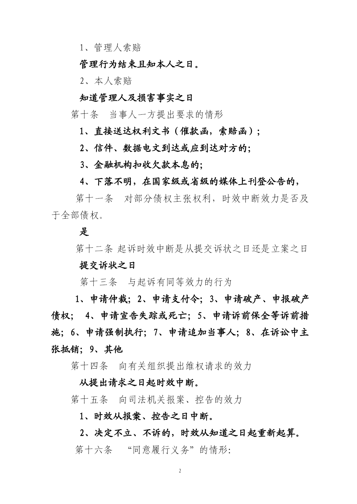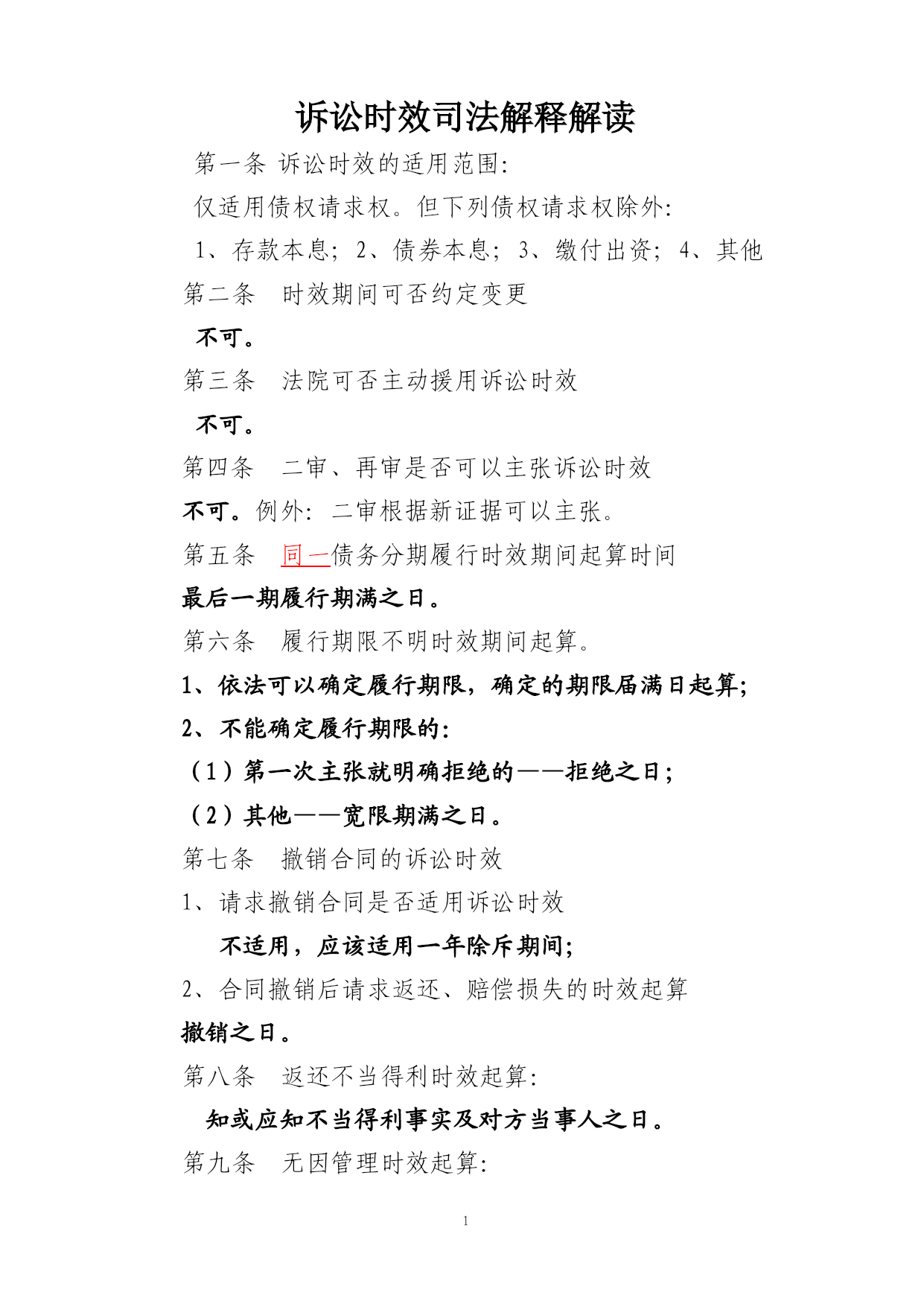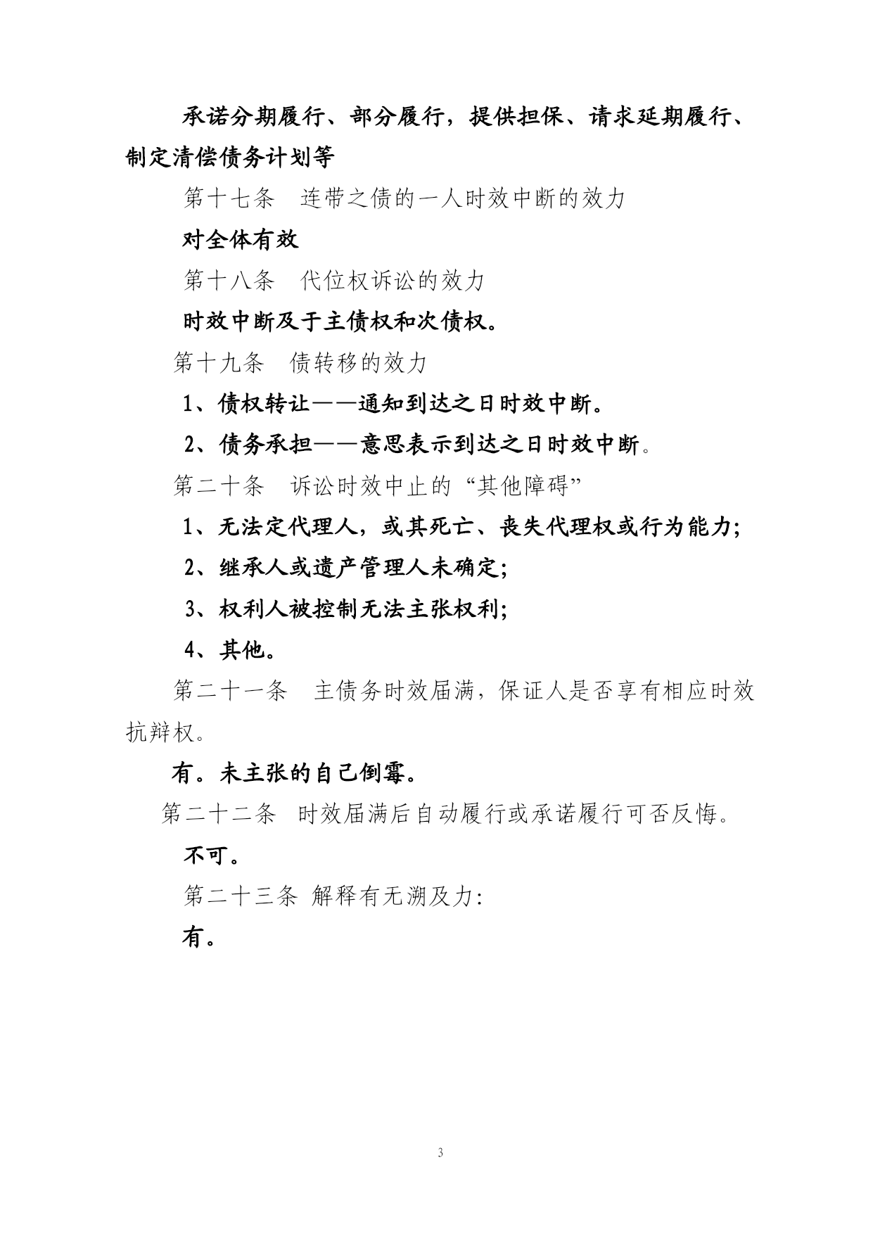 PAGEPAGE3诉讼时效司法解释解读第一条诉讼时效的适用范围:仅适用债权请求权。但下列债权请求权除外:1、存款本息;2、债券本息;3、缴付出资;4、其他第二条时效期间可否约定变更不可。第三条法院可否主动援用诉讼时效不可。第四条二审、再审是否可以主张诉讼时效不可。例外:二审根据新证据可以主张。第五条同一债务分期履行时效期间起算时间最后一期履行期满之日。第六条履行期限不明时效期间起算。1、依法可以确定履行期限,确定的期限届满日起算;2、不能确定履行期限的:(1)第一次主张就明确拒绝的——拒绝之日;(2)其他——宽限期满之日。第七条撤销合同的诉讼时效1、请求撤销合同是否适用诉讼时效不适用,应该适用一年除斥期间;2、合同撤销后请求返还、赔偿损失的时效起算撤销之日。第八条返还不当得利时效起算:知或应知不当得利事实及对方当事人之日。第九条无因管理时效起算:1、管理人索赔管理行为结束且知本人之日。2、本人索赔知道管理人及损害事实之日第十条当事人一方提出要求的情形1、直接送达权利文书(催款函,索赔函);2、信件、数据电文到达或应到达对方的;3、金融机构扣收欠款本息的;4、下落不明,在国家级或省级的媒体上刊登公告的,第十一条对部分债权主张权利,时效中断效力是否及于全部债权。是第十二条起诉时效中断是从提交诉状之日还是立案之日提交诉状之日第十三条与起诉有同等效力的行为1、申请仲裁;2、申请支付令;3、申请破产、申报破产债权;4、申请宣告失踪或死亡;5、申请诉前保全等诉前措施;6、申请强制执行;7、申请追加当事人;8、在诉讼中主张抵销;9、其他第十四条向有关组织提出维权请求的效力从提出请求之日起时效中断。第十五条向司法机关报案、控告的效力1、时效从报案、控告之日中断。2、决定不立、不诉的,时效从知道之日起重新起算。第十六条“同意履行义务”的情形:承诺分期履行、部分履行,提供担保、请求延期履行、制定清偿债务计划等第十七条连带之债的一人时效中断的效力对全体有效第十八条代位权诉讼的效力时效中断及于主债权和次债权。第十九条债转移的效力1、债权转让——通知到达之日时效中断。2、债务承担——意思表示到达之日时效中断。第二十条诉讼时效中止的“其他障碍”1、无法定代理人,或其死亡、丧失代理权或行为能力;2、继承人或遗产管理人未确定;3、权利人被控制无法主张权利;4、其他。第二十一条主债务时效届满,保证人是否享有相应时效抗辩权。有。未主张的自己倒霉。第二十二条时效届满后自动履行或承诺履行可否反悔。不可。第二十三条解释有无溯及力:有。