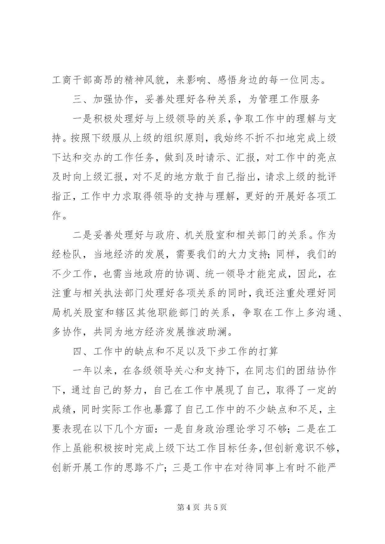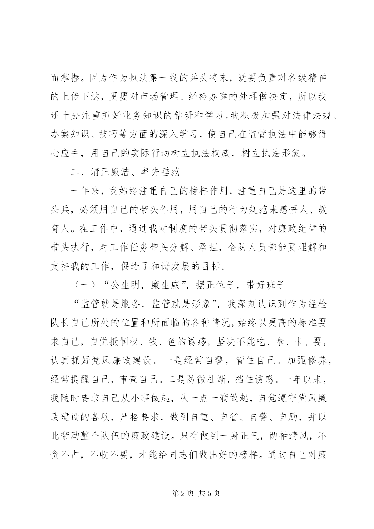 第PAGE\*Arabic\*MERGEFORMAT5页共NUMPAGES\*MERGEFORMAT5页工商部门检验队长个人述职述廉述职述廉报告我叫,现XX县区工商局经检队大队长,按照局党组的分工,我具体分管三个经检中队经济违法违章案件的查处工作。现将一年来的个人廉洁从政及党风廉政建设岗位职责情况报告如下:一年来,我始终坚持以邓小平理论和“三个代表”重要思想为指导,以加强执政能力建设为重点,坚持全心全意为人民服务的宗旨,做到依法行政、公正执法、文明执法。在局党组的正确领导下,认真落实县局提出的整体工作规划。带领全队人员服务市场经济发展,为地方经济发展保驾护航一、加强自身修养、增强经检队的凝聚力和战斗力(一)加强自身政治理论学习,注重政治理论学习一年来,我积极加强政治学习,并主动利用业余时间学习党和国家的有关方针、政策、法规,增强自身民族意识,加强爱国精神,落实全心全意为人民服务的宗旨。通过自身积极的学习,并带领全队人员积极探讨,全队人员的政治理论水平有了进一步提升,理论素养得以提高。我队人员识大体、顾大局的多了,大家理想信念更加坚定了,服务人民群众的意识更加强了。(二)努力钻研业务,注重全队人员的业务知识提升。作为一名经检队长,常年战斗在市场监管执法的第一线,不仅要有较高的政治素养,而且业务知识更要精、更要通、更要全面掌握。因为作为执法第一线的兵头将末,既要负责对各级精神的上传下达,更要对市场管理、经检办案的处理做决定,所以我还十分注重抓好业务知识的钻研和学习。我积极加强对法律法规、办案知识、技巧等方面的深入学习,使自己在监管执法中能够得心应手,用自己的实际行动树立执法权威,树立执法形象。二、清正廉洁、率先垂范一年来,我始终注重自己的榜样作用,注重自己是这里的带头兵,必须用自己的带头作用,用自己的行为规范来感悟人、教育人。在工作中,通过我对制度的带头贯彻落实,对廉政纪律的带头执行,对工作任务带头分解、承担,全队人员都能更理解和支持我的工作,促进了和谐发展的目标。(一)“公生明,廉生威”,摆正位子,带好班子“监管就是服务,监管就是形象”,我深刻认识到作为经检队长自己所处的位置和所面临的各种情况,始终以更高的标准要求自己,自觉抵制权、钱、色的诱惑,坚决不能吃、拿、卡、要,认真抓好党风廉政建设。一是经常自警,管住自己。加强修养,经常提醒自己,审查自己。二是防微杜渐,挡住诱惑。一年以来,我随时要求自己从小事做起,从一点一滴做起,自觉遵守党风廉政建设的各项,严格要求,做到自重、自省、自警、自励,并以此带动整个队伍的廉政建设。只有做到一身正气,两袖清风,不贪不占,不收不要,才能给同志们做出好的榜样。通过自己对廉政纪律的模范遵守,我队人员没有发生任何吃、拿、卡、要等不廉洁行为的发生。(二)制定工作制度,要率先垂范落实工作制度,落实“制度管人”的管理机制。制度是执行纪律的保证,只有落实制度管人、管事的管理机制才能促进工作的长远长足发展。通过对制度进行全面修订,工作中奖惩明确,责任到位,促进了在落实工作责任上有保障。有了制度,关键在落实,俗话说:“喊破嗓子,不如做出样子”,在贯彻落实制度中,我首先垂范落实,以身作则来遵守执行制度,使制度不因为任何人的意志改变而改变,用公平、公正的眼光来看待制度的落实。通过自己的模范遵守执行制度,全队上下一心,真正实现了使人人尽心工作,个个心情舒畅,在工作中寻找快乐,在事业中体现价值。(三)严格个人行为,示范遵守各项规定。在作风纪律方面,我始终严格按照国家公务员管理的有关规定要求自己,坚决服从组织的安排。在工作中我始终对照国家公务员的义务和责任,对照工商干部做人的准则和标准要求自己,一年来我积极组织并主动参与单位的各项工作,我没有因为自己是领导而放纵自己,而是更加清楚一个经检队长身上的担子。我始终严格按照工作作息时间要求自己,始终严守工作纪律,保守工作秘密,严格履行职责,通过自己在工作中的一言一行来体现工商干部高昂的精神风貌,来影响、感悟身边的每一位同志。三、加强协作,妥善处理好各种关系,为管理工作服务一是积极处理好与上级领导的关系,争取工作中的理解与支持。按照下级服从上级的组织原则,我始终不折不扣地完成上级下达和交办的工作任务,做到及时请示、汇报,对工作中的亮点及时向上级汇报,对不足的地方敢于自己指出,请求上级的批评指正,工作中力求取得领导的支持与理解,更好的开展好各项工作。二是妥善处理好与政府、机关股室和相关部门的关系。作为经检队,当地经济的发展,需要我们的大力支持;同样,我们的不少工作,也需当地政府的协调、统一领导才能完成,因此,在注重与相关执法部门处理好各项关系的同时,我还注重处理好同局机关股室和辖区其他职能部门的关系,争取在工作上多沟通、多协作,共同为地方经济发展推波助澜。四、