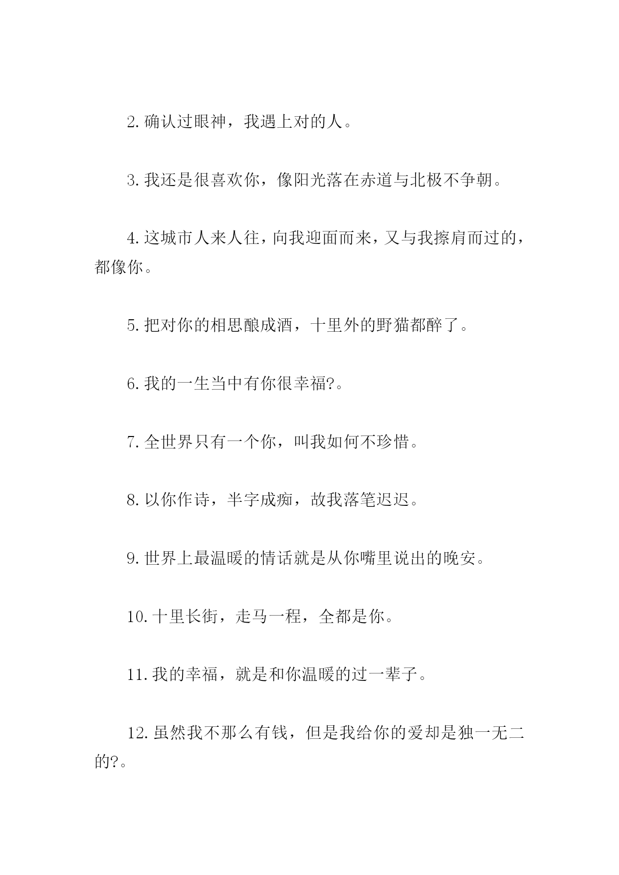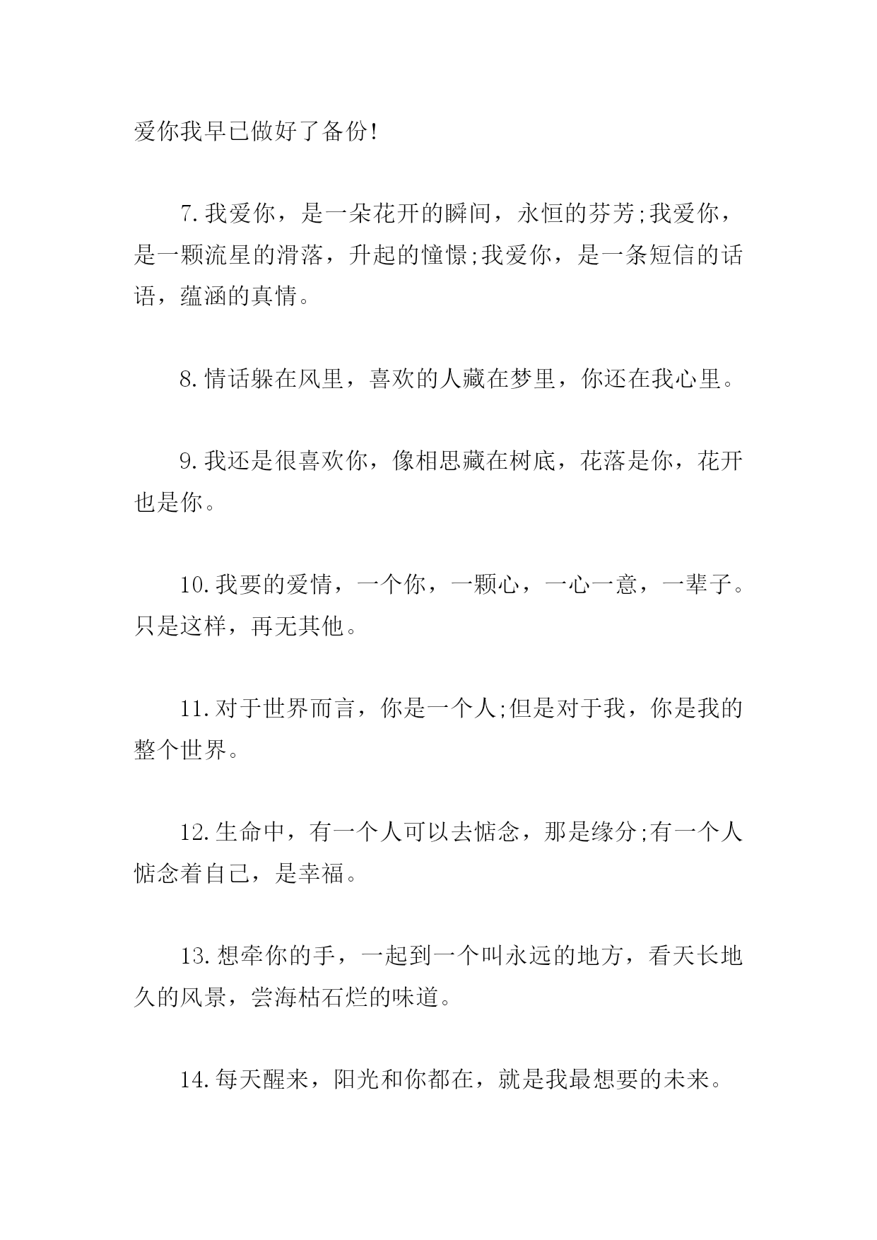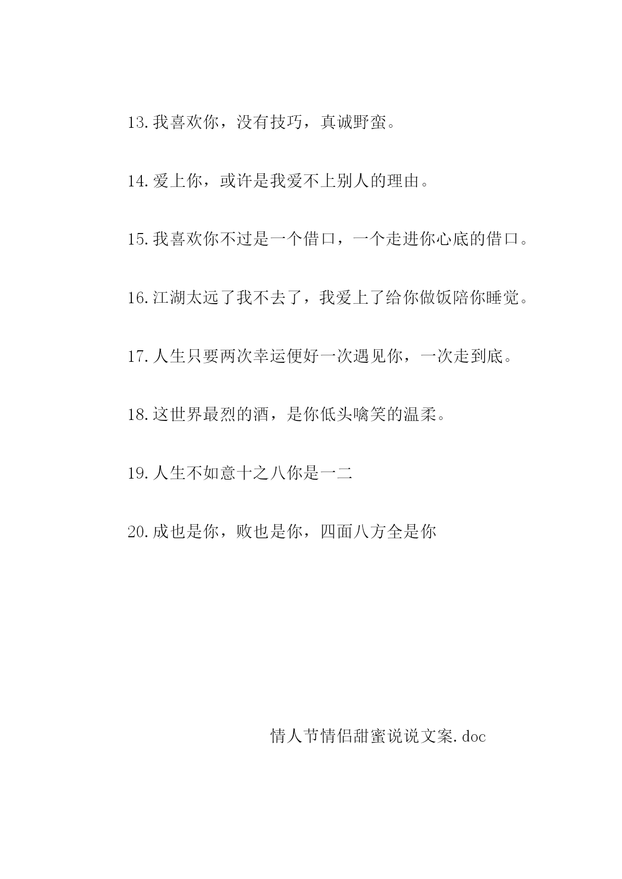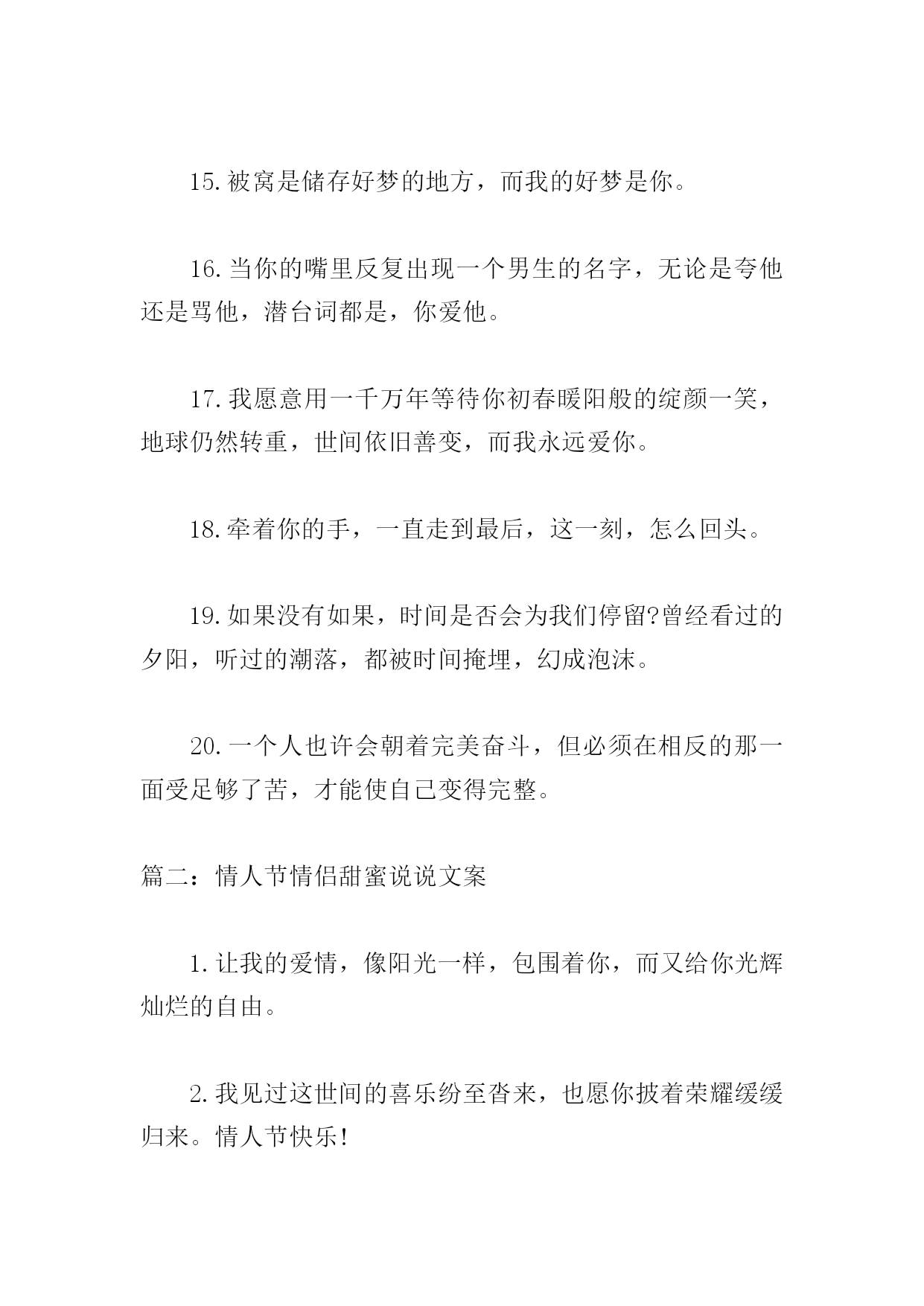 情人节情侣甜蜜说说文案篇一:情人节情侣甜蜜说说文案1.就这样陪你一直走,再久也不会累;陪你在夏日街头漫步,为你撑伞遮挡阳光;为你递上一杯凉茶,让你倍感清凉。这个夏日,有你更美2.遇到你,是我一生的缘分;牵着你,是我一生的快乐;爱上你,是我一生的幸运。今生有你相伴,是我一生的幸福。3.相爱,就是要感恩对方的优点,容忍对方的缺点,因为爱就是坚持在一起。4.你在心里称之为“灵魂伴侣”的人,是那个每一分每一秒每一件事情都想和你一起做的人5.最长久的情,是平淡中的不离不弃;最贴心的暖,是风雨中的相依相伴。6.遇见你是我的缘份,爱上你是我的情份,守着你是我的本份,陪着你是我的福份。今生爱你爱得有点过份,来世爱你我早已做好了备份!7.我爱你,是一朵花开的瞬间,永恒的芬芳;我爱你,是一颗流星的滑落,升起的憧憬;我爱你,是一条短信的话语,蕴涵的真情。8.情话躲在风里,喜欢的人藏在梦里,你还在我心里。9.我还是很喜欢你,像相思藏在树底,花落是你,花开也是你。10.我要的爱情,一个你,一颗心,一心一意,一辈子。只是这样,再无其他。11.对于世界而言,你是一个人;但是对于我,你是我的整个世界。12.生命中,有一个人可以去惦念,那是缘分;有一个人惦念着自己,是幸福。13.想牵你的手,一起到一个叫永远的地方,看天长地久的风景,尝海枯石烂的味道。14.每天醒来,阳光和你都在,就是我最想要的未来。15.被窝是储存好梦的地方,而我的好梦是你。16.当你的嘴里反复出现一个男生的名字,无论是夸他还是骂他,潜台词都是,你爱他。17.我愿意用一千万年等待你初春暖阳般的绽颜一笑,地球仍然转重,世间依旧善变,而我永远爱你。18.牵着你的手,一直走到最后,这一刻,怎么回头。19.如果没有如果,时间是否会为我们停留?曾经看过的夕阳,听过的潮落,都被时间掩埋,幻成泡沫。20.一个人也许会朝着完美奋斗,但必须在相反的那一面受足够了苦,才能使自己变得完整。篇二:情人节情侣甜蜜说说文案1.让我的爱情,像阳光一样,包围着你,而又给你光辉灿烂的自由。2.我见过这世间的喜乐纷至沓来,也愿你披着荣耀缓缓归来。情人节快乐!3.喜欢是藏不住的,所以这是理直气壮的宣告4.茫茫人海中,相识了你,是一种缘分,只希望用我的真诚,换取你的真情。亲爱的,情人节快乐!5.我喜欢的东西不多,只有这片蓝天,还有那个傻姑娘。6.我将永远忠于自己,披星戴月奔向理想和你。7.我是个俗人,爱吃火锅爱喝奶茶,你呢?8.总会有一个人,跨过千山万水来到你面前,让你再次相信爱情。9.每天早上醒来,看见你和阳光都在,那就是我想要的未来。10.我们都喜欢光,虽然转瞬即逝,但你还是你,有我一喊就心颤的名字。11.我今天有点疑惑爱情究竟是什么你可不可以告诉我12.我要亲手给你幸福,别人我不放心。亲爱的,情人节快乐!13.多谢你如此耀眼,做我平淡岁月里的星辰。情人节快乐!14.我攒了好久的温柔和爱现在全部给你。15.小事听你,大事听我,不过我们家不会有大事发生16.我见过万物生长喜鹊在枝头歌唱欢快的树叶迎风鼓掌你在奔向我的途中笑意满庞17.每一天醒来,你的清影就在我眼前转。18.我想变得有趣,变得特别,变成你眼里的一点星光。19.像所有人认为的那样,你就是我整个世界。20.我这个人啊,满身阴暗,还总想着给你一点阳光。我喜欢你,没有技巧,真诚野蛮。篇三:情人节情侣甜蜜说说文案1.无一爱字,句句深情。2.确认过眼神,我遇上对的人。3.我还是很喜欢你,像阳光落在赤道与北极不争朝。4.这城市人来人往,向我迎面而来,又与我擦肩而过的,都像你。5.把对你的相思酿成酒,十里外的野猫都醉了。6.我的一生当中有你很幸福?。7.全世界只有一个你,叫我如何不珍惜。8.以你作诗,半字成痴,故我落笔迟迟。9.世界上最温暖的情话就是从你嘴里说出的晚安。10.十里长街,走马一程,全都是你。11.我的幸福,就是和你温暖的过一辈子。12.虽然我不那么有钱,但是我给你的爱却是独一无二的?。13.我喜欢你,没有技巧,真诚野蛮。14.爱上你,或许是我爱不上别人的理由。15.我喜欢你不过是一个借口,一个走进你心底的借口。16.江湖太远了我不去了,我爱上了给你做饭陪你睡觉。17.人生只要两次幸运便好一次遇见你,一次走到底。18.这世界最烈的酒,是你低头噙笑的温柔。19.人生不如意十之八你是一二20.成也是你,败也是你,四面八方全是你情人节情侣甜蜜说说文案.doc