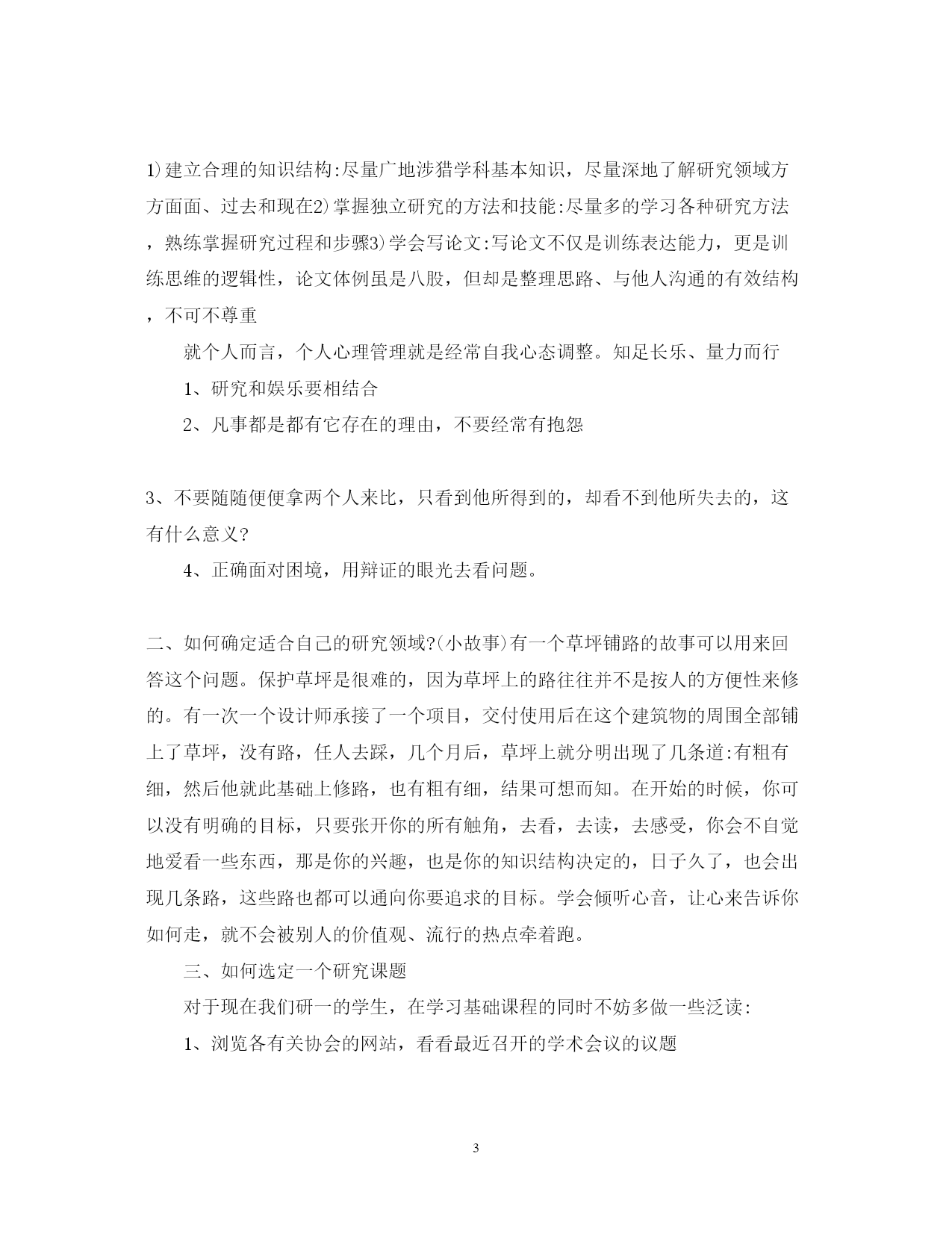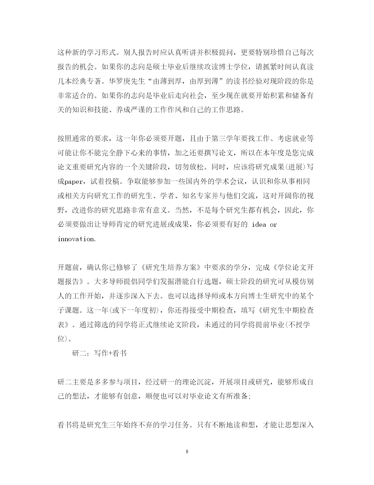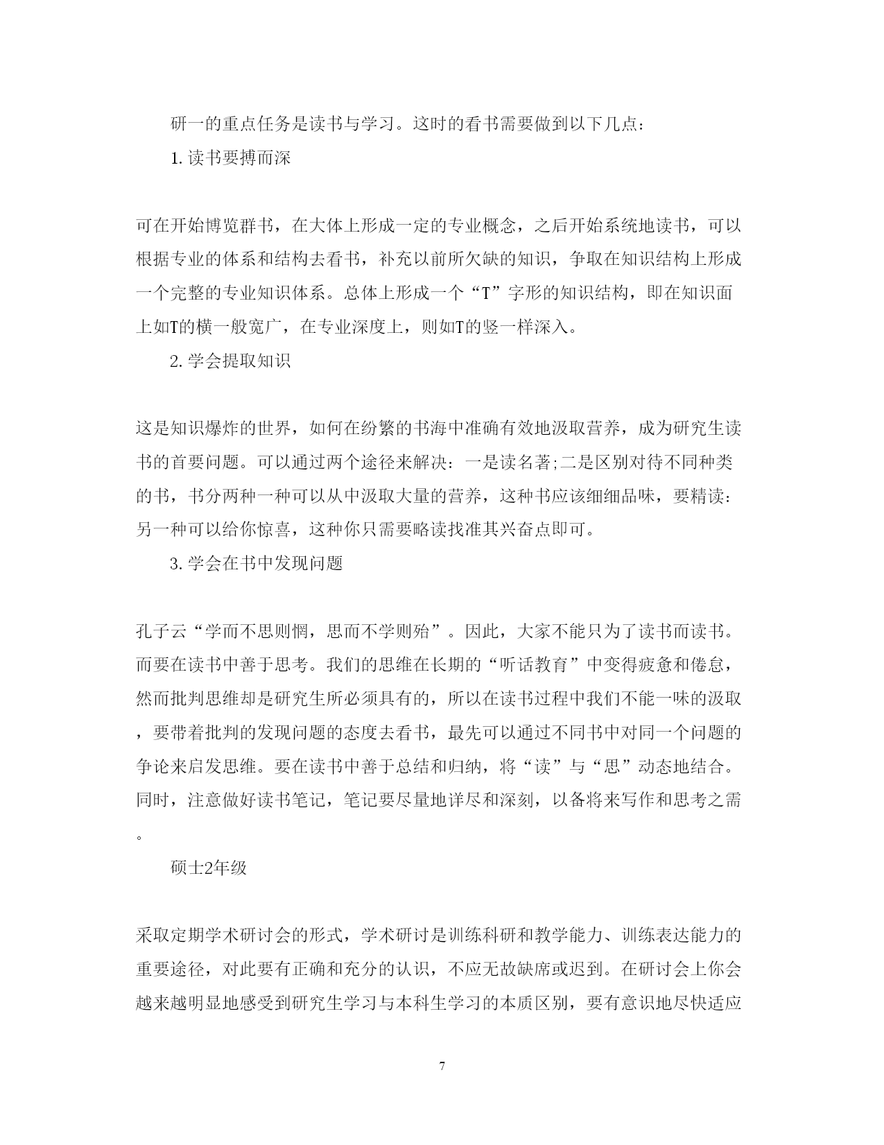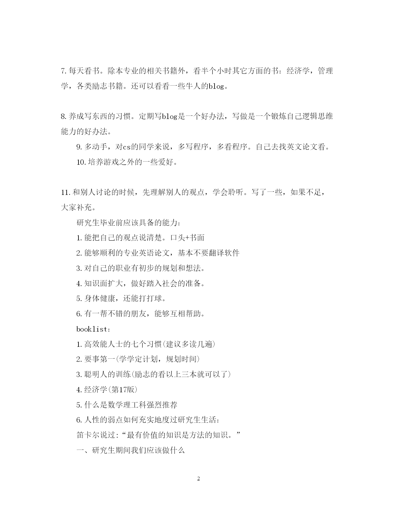 此资料由网络收集而来,如有侵权请告知上传者立即删除。资料共分享,我们负责传递知识。PAGEPAGE10大学生研究生期间学习计划书格式为了让自己的学习生活变得充实,大学生是如何制定学习计划的?下面是范文网小编收集整理的研究生学习计划,欢迎阅读。研究生学习计划篇一上海大学一位姓崔的老师说:“不可否认的是,研究生面临着比较大的生存压力,但是要平衡自己的方向,在没有生存威胁的情况下,要专注于学习。”他表示,在社会心理普遍比较浮躁的情况下,就要求研究生要拿出宽广的视野来,权衡自己眼前的利益和长远发展的基础,“疯狂做兼职是没有自信的表现。”他认为,研究生要从长远来看,看到社会整体的发展趋势,坚定发展的信念,不为暂时的困难所束缚,尤其是不要被眼前一时的较小的物质利益所蒙蔽。“在校研究生100万,在我国整个人口结构中占的比例是非常低的。研究生仍然是社会的精英群体,既然是精英群体,就要有责任感和使命感。”研究生期间应该做的事情:1.养成锻炼身体的习惯,30以前你找病,30以后病找你。2.如果你学的专业,中国不是最好的,那么请好好学英语,请不要说什么英语教育是毒瘤的狗屁话,研究生毕业前,至少也要达到能够进行英语面试的准备。3.努力做一个善良的人,学着改变自己,控制自己的欲望。善待你周围的人。4.学习时间管理的方法,订计划,执行计划。这个习惯会让你终身受益。5.学习怎么使用googlescholar,包括各类搜索方法6.争取每一个能让自己能力增强的机会(实习,比赛之类的),个人建议大家要努力争取实习机会,和导师好好商量,3个月的相关领域的实习会对能力的帮助很大。对找好的工作也是一个有利的筹码。7.每天看书。除本专业的相关书籍外,看半个小时其它方面的书:经济学,管理学,各类励志书籍。还可以看看一些牛人的blog。8.养成写东西的习惯。定期写blog是一个好办法,写做是一个锻炼自己逻辑思维能力的好办法。9.多动手,对cs的同学来说,多写程序,多看程序。自己去找英文论文看。10.培养游戏之外的一些爱好。11.和别人讨论的时候,先理解别人的观点,学会聆听。写了一些,如果不足,大家补充。研究生毕业前应该具备的能力:1.能把自己的观点说清楚。口头+书面2.能够顺利的专业英语论文,基本不要翻译软件3.对自己的职业有初步的规划和想法。4.知识面扩大,做好踏入社会的准备。5.身体健康,还能打打球。6.有一帮不错的朋友,能够互相帮助。booklist:1.高效能人士的七个习惯(建议多读几遍)2.要事第一(学学定计划,规划时间)3.聪明人的训练(励志的看以上三本就可以了)4.经济学(第17版)5.什么是数学理工科强烈推荐6.人性的弱点如何充实地度过研究生生活:笛卡尔说过:“最有价值的知识是方法的知识。”一、研究生期间我们应该做什么1)建立合理的知识结构:尽量广地涉猎学科基本知识,尽量深地了解研究领域方方面面、过去和现在2)掌握独立研究的方法和技能:尽量多的学习各种研究方法,熟练掌握研究过程和步骤3)学会写论文:写论文不仅是训练表达能力,更是训练思维的逻辑性,论文体例虽是八股,但却是整理思路、与他人沟通的有效结构,不可不尊重就个人而言,个人心理管理就是经常自我心态调整。知足长乐、量力而行1、研究和娱乐要相结合2、凡事都是都有它存在的理由,不要经常有抱怨3、不要随随便便拿两个人来比,只看到他所得到的,却看不到他所失去的,这有什么意义?4、正确面对困境,用辩证的眼光去看问题。二、如何确定适合自己的研究领域?(小故事)有一个草坪铺路的故事可以用来回答这个问题。保护草坪是很难的,因为草坪上的路往往并不是按人的方便性来修的。有一次一个设计师承接了一个项目,交付使用后在这个建筑物的周围全部铺上了草坪,没有路,任人去踩,几个月后,草坪上就分明出现了几条道:有粗有细,然后他就此基础上修路,也有粗有细,结果可想而知。在开始的时候,你可以没有明确的目标,只要张开你的所有触角,去看,去读,去感受,你会不自觉地爱看一些东西,那是你的兴趣,也是你的知识结构决定的,日子久了,也会出现几条路,这些路也都可以通向你要追求的目标。学会倾听心音,让心来告诉你如何走,就不会被别人的价值观、流行的热点牵着跑。三、如何选定一个研究课题对于现在我们研一的学生,在学习基础课程的同时不妨多做一些泛读:1、浏览各有关协会的网站,看看最近召开的学术会议的议题2、翻翻国内有关的期刊,看看最近这些年大家都在忙什么根据你自己的知识结构,你会很自然地有所倾向,再多看看你感兴趣的话题,比较之后,也许就形成了你的论文选题了。听过一句话,不管现在的专业是不是热门,或者多么地不堪,但是,一旦不爱自己的专业,自甘平庸,那毕业的时候真的死