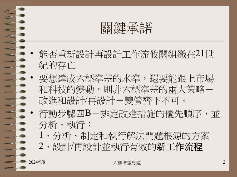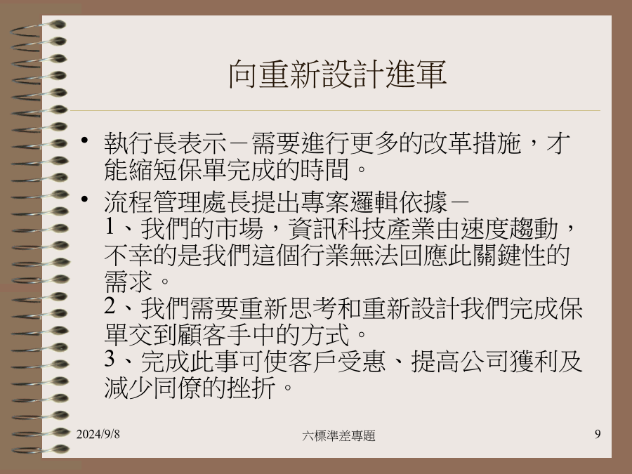 六標準差TheSixSigmaWay關鍵承諾流程設計/再設計的關鍵步驟六標準差應用在流程設計/再設計的好處六標準差應用在流程設計/再設計的好處展開流程設計/再設計的重要條件展開流程設計/再設計的重要條件案例-電腦斷訊保險公司(COLA)向重新設計進軍Define:界定重新設計的目標、規模及要求COLA完成保單原流程釐清產出和要求的步驟界定流程設計/再設計「可」與「勿」做的事Measure:設定績效的底線流程設計/再設計衡量的「可」與「勿」Analysis-建構重新設計的基礎流程價值分析價值分析步驟流程時間分析流程設計/再設計分析的「可」與「勿做的事小型的抗爭Improve-設計與執行新流程新完成保單流程流程進展和管理選項檢討與精調設計精調完成保單流程執行新流程COLA的活力流程設計/再設計改進的「可」與「勿做的事