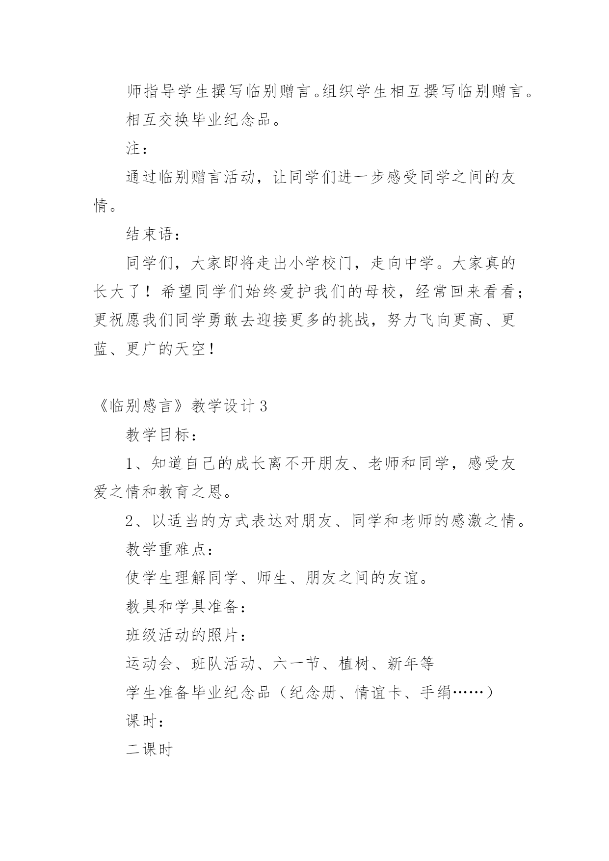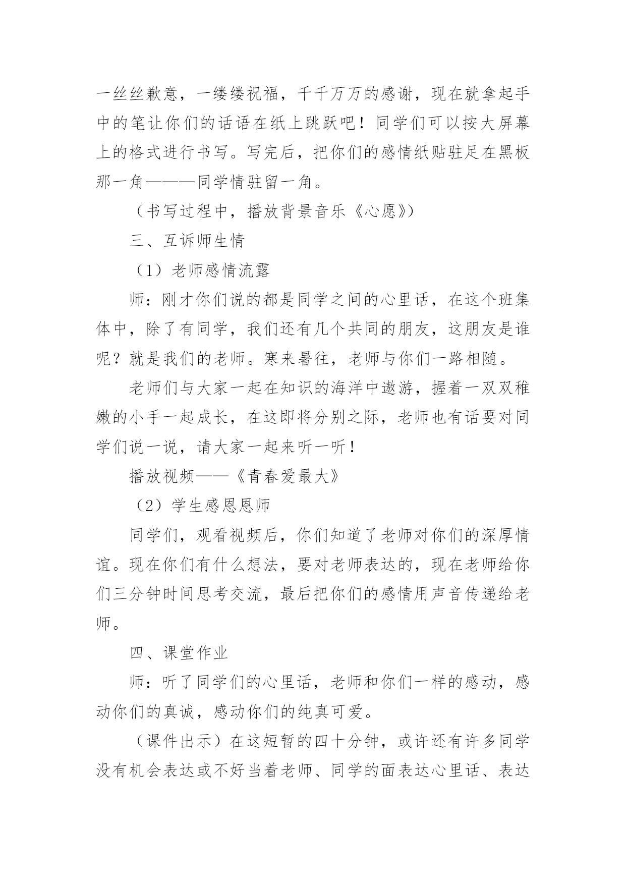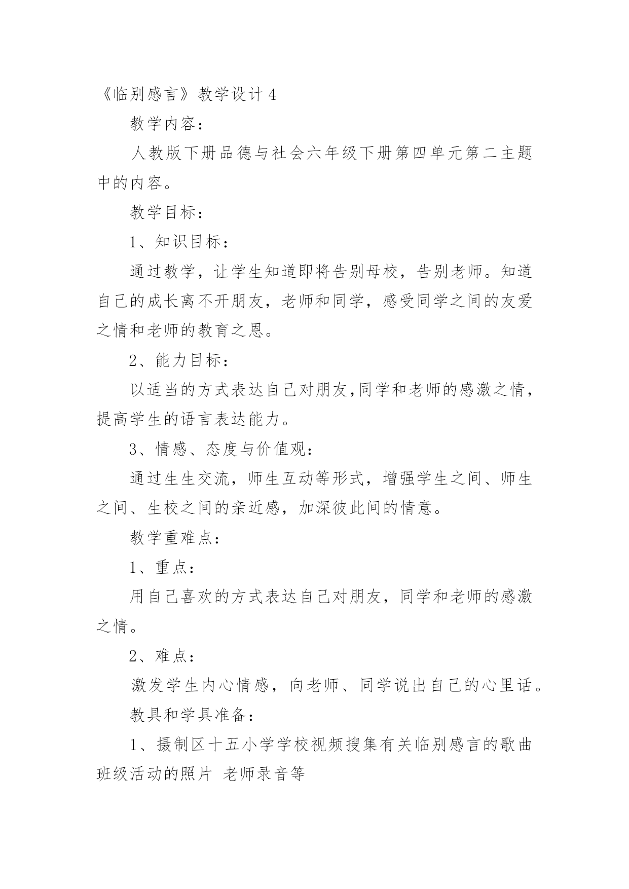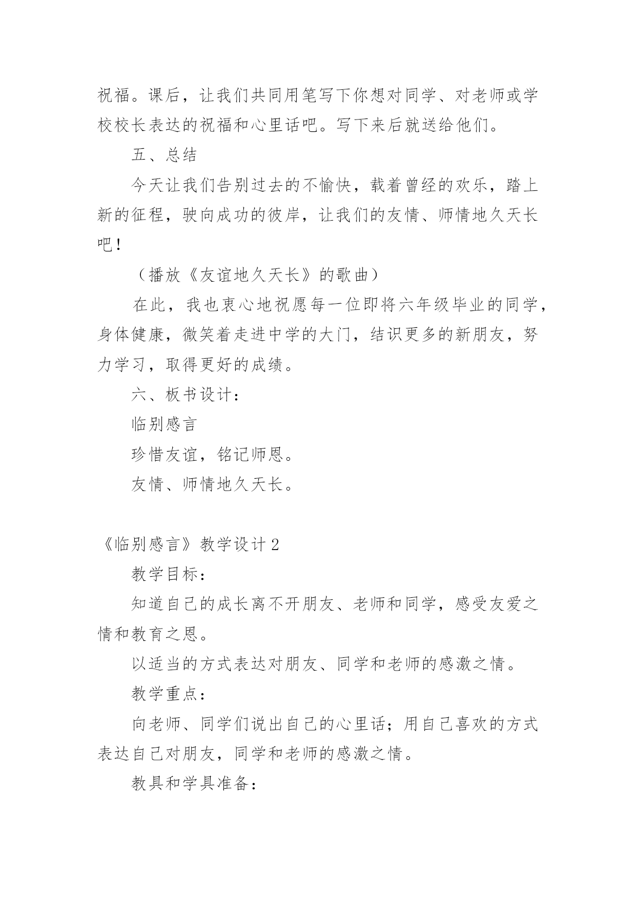 《临别感言》教学设计在生活、工作和学习中,我们常常会因经历的人和事不同而产生新的感想,这时可以通过写感言的方式将其记录下来。那么到底应该如何写感言呢?以下是小编为大家整理的《临别感言》教学设计,仅供参考,大家一起来看看吧。《临别感言》教学设计1教学内容:人教版下册品德与社会六年级下册第四单元第二主题中的内容。教学目标:1、知识目标:通过教学,让学生知道即将告别母校,告别老师。知道自己的成长离不开朋友,老师和同学,感受同学之间的友爱之情和老师的教育之恩。2、能力目标:以适当的方式表达自己对朋友,同学和老师的感激之情,提高学生的语言表达能力。3、情感、态度与价值观:通过生生交流,师生互动等形式,增强学生之间、师生之间、生校之间的亲近感,加深彼此间的情意。教学重难点:1、重点:用自己喜欢的方式表达自己对朋友,同学和老师的感激之情。2、难点:激发学生内心情感,向老师、同学说出自己的心里话。教学时间:1课时执教班级:志和小学六(2)班授课时间:20xx年5月12日教学过程:一、古诗词朗诵导入1、诗歌朗诵《赠汪伦》2、老师要问大家一个问题,刚才朗诵的这首诗,哪位同学知道诗人表达了什么感情?(学生回答)再美的相遇也有离别的时候,就像再过两个月,我们就要和自己无忧无虑的童年、和尊敬的老师、亲爱的同学们、美丽的母校告别了。在这即将离别的时刻,你一定是心潮澎湃,感慨万千,今天就让我们敞开心扉,说说自己的心里话,说说临别时的感言吧。(板书课题)二、说说心里话。活动一:对同学说的心里话。1、《视频:说说心里话》,触及学生心灵。(1)师:首先,咱们听一听视频中同学的心里话。(2)播放《视频:说说心里话》在这五年的时光里,同学们有欢乐也有悲伤,有误解也有原谅,面对离别大家应该有很多话要对同学和朋友说吧,一丝丝歉意,一缕缕祝福,千千万万的感谢,现在就拿起手中的笔让你们的话语在纸上跳跃吧!同学们可以按大屏幕上的格式进行书写。写完后,把你们的感情纸贴驻足在黑板那一角———同学情驻留一角。(书写过程中,播放背景音乐《心愿》)三、互诉师生情(1)老师感情流露师:刚才你们说的都是同学之间的心里话,在这个班集体中,除了有同学,我们还有几个共同的朋友,这朋友是谁呢?就是我们的老师。寒来暑往,老师与你们一路相随。老师们与大家一起在知识的海洋中遨游,握着一双双稚嫩的小手一起成长,在这即将分别之际,老师也有话要对同学们说一说,请大家一起来听一听!播放视频——《青春爱最大》(2)学生感恩恩师同学们,观看视频后,你们知道了老师对你们的深厚情谊。现在你们有什么想法,要对老师表达的,现在老师给你们三分钟时间思考交流,最后把你们的感情用声音传递给老师。四、课堂作业师:听了同学们的心里话,老师和你们一样的感动,感动你们的真诚,感动你们的纯真可爱。(课件出示)在这短暂的四十分钟,或许还有许多同学没有机会表达或不好当着老师、同学的面表达心里话、表达祝福。课后,让我们共同用笔写下你想对同学、对老师或学校校长表达的祝福和心里话吧。写下来后就送给他们。五、总结今天让我们告别过去的不愉快,载着曾经的欢乐,踏上新的征程,驶向成功的彼岸,让我们的友情、师情地久天长吧!(播放《友谊地久天长》的歌曲)在此,我也衷心地祝愿每一位即将六年级毕业的同学,身体健康,微笑着走进中学的大门,结识更多的新朋友,努力学习,取得更好的成绩。六、板书设计:临别感言珍惜友谊,铭记师恩。友情、师情地久天长。《临别感言》教学设计2教学目标:知道自己的成长离不开朋友、老师和同学,感受友爱之情和教育之恩。以适当的方式表达对朋友、同学和老师的感激之情。教学重点:向老师、同学们说出自己的心里话;用自己喜欢的方式表达自己对朋友,同学和老师的感激之情。教具和学具准备:班级活动的照片:运动会、班队活动、六一节、植树、新年等学生准备毕业纪念品(纪念册、情谊卡、手绢……)教学过程:导语:似乎在一转眼间,我们就要小学毕业了。此时此刻,老师的心情很复杂——有点儿高兴,还有点失落;有点儿期待,也有点担心;当然,还有些难过,舍不得我们这个班级,舍不得我们每一位同学,那么同学们呢?生答:略活动一:回顾共同的生活老师出示该班学生的集体活动照片,分组轮换看,讨论回顾学校共同生活点滴;指引同学走出教室,看看我们生活5年的校园,走走我们奔跑过的操场,和教过我们的老师说说话;注:这两项活动旨在让学生看到熟悉的地方,熟悉的人,回顾难忘的往事,为后面的激情表述做铺垫。活动二:说说心理话师:同学们,班级就像一个大家庭,我们在一起度过了一千多个日子,同学之间就如同兄弟姐妹,老师如同家长,我们相处的点点滴滴都涌在心头,毕业在即,就聊一聊我们的心理话吧!生:略注:主要为学生之间吐露心声创设情景,或表达歉意;或表示感谢;或表达留恋之情……。要引导学生知道自己的成长离不开同学的帮助
