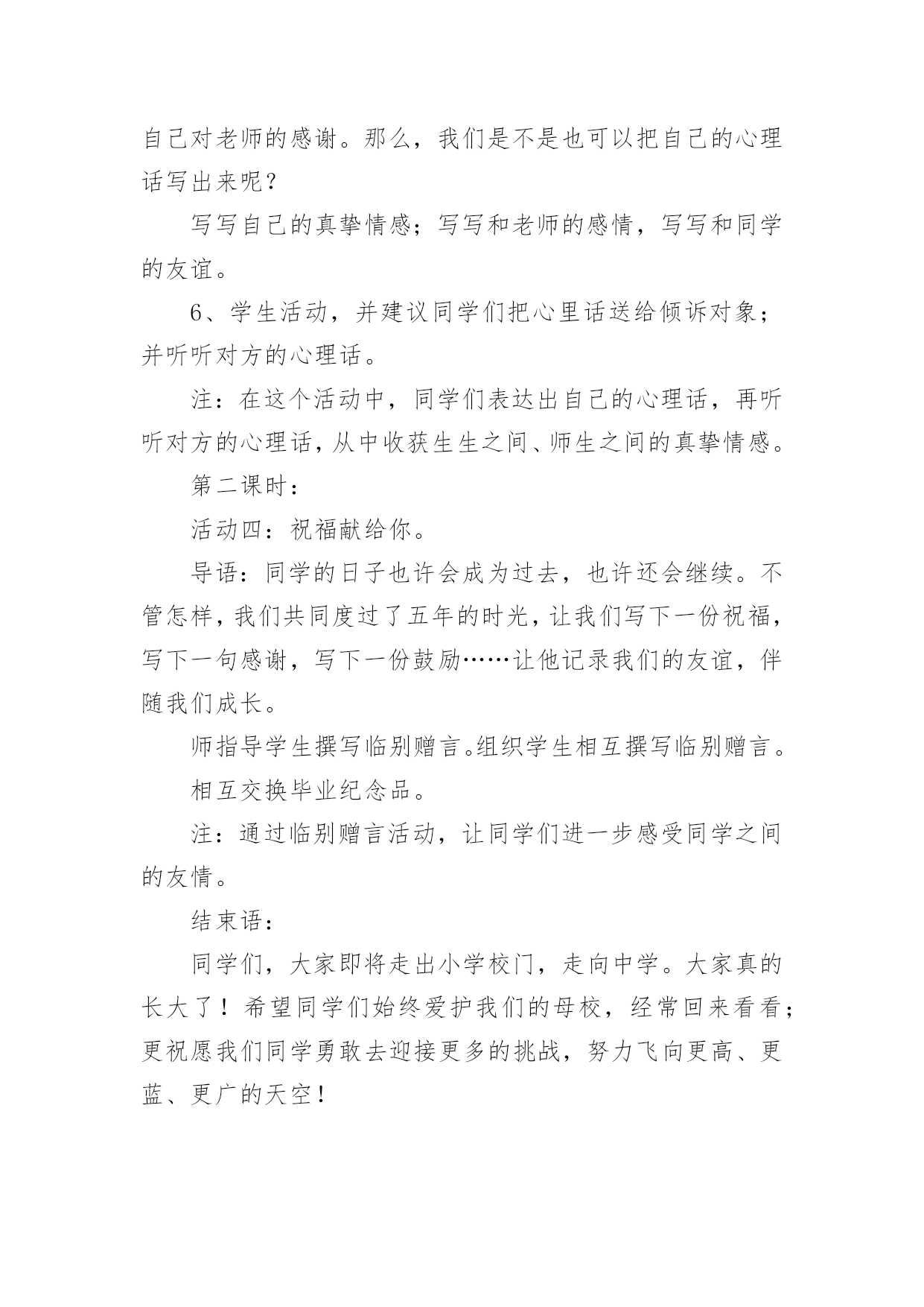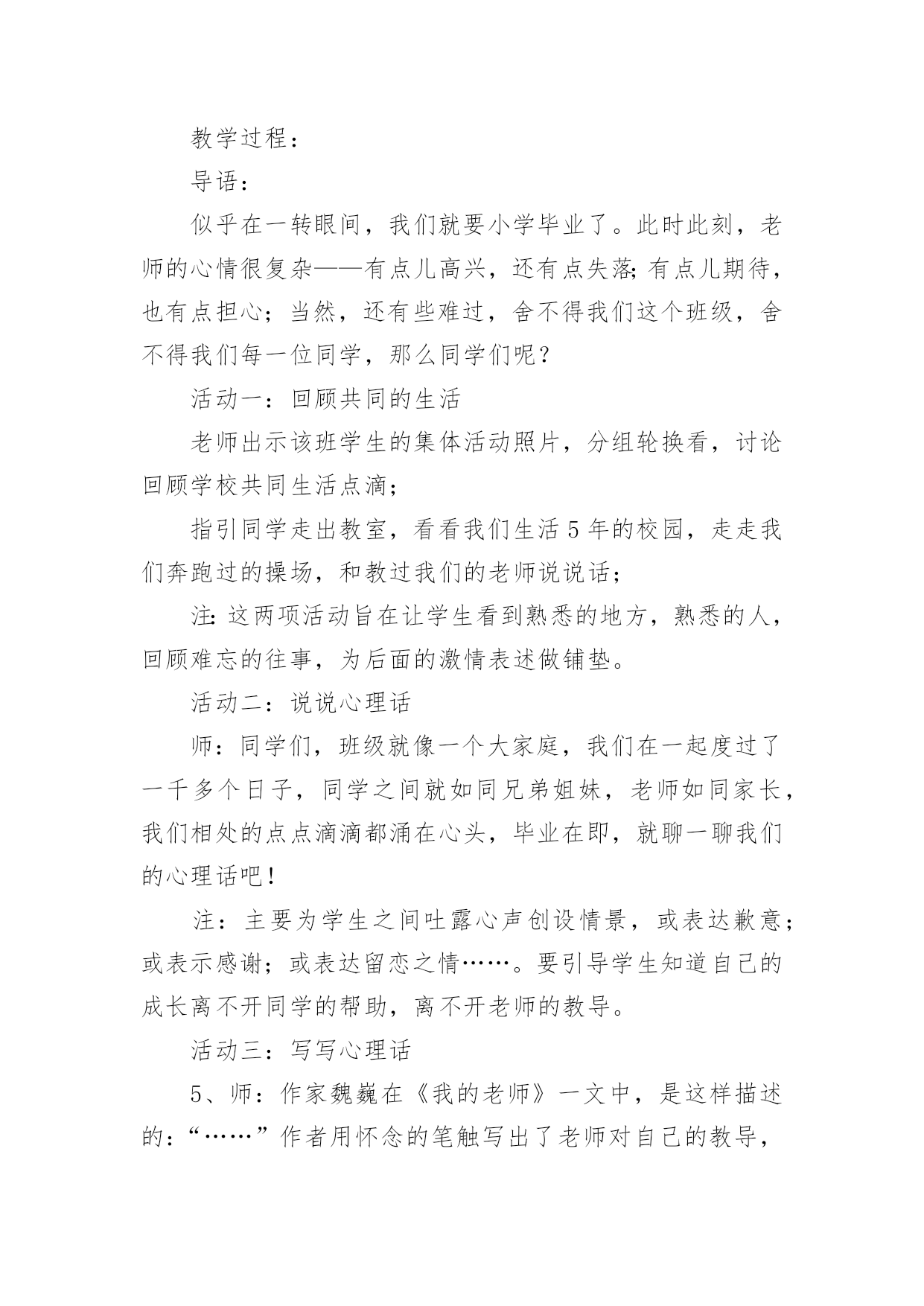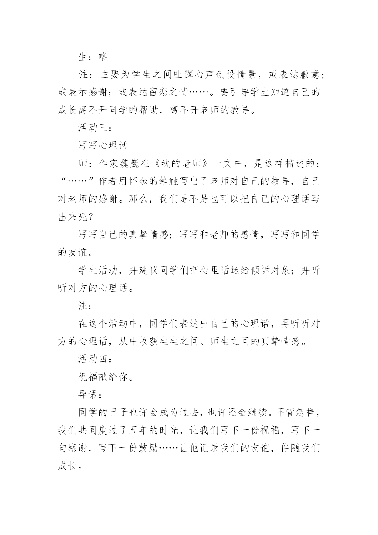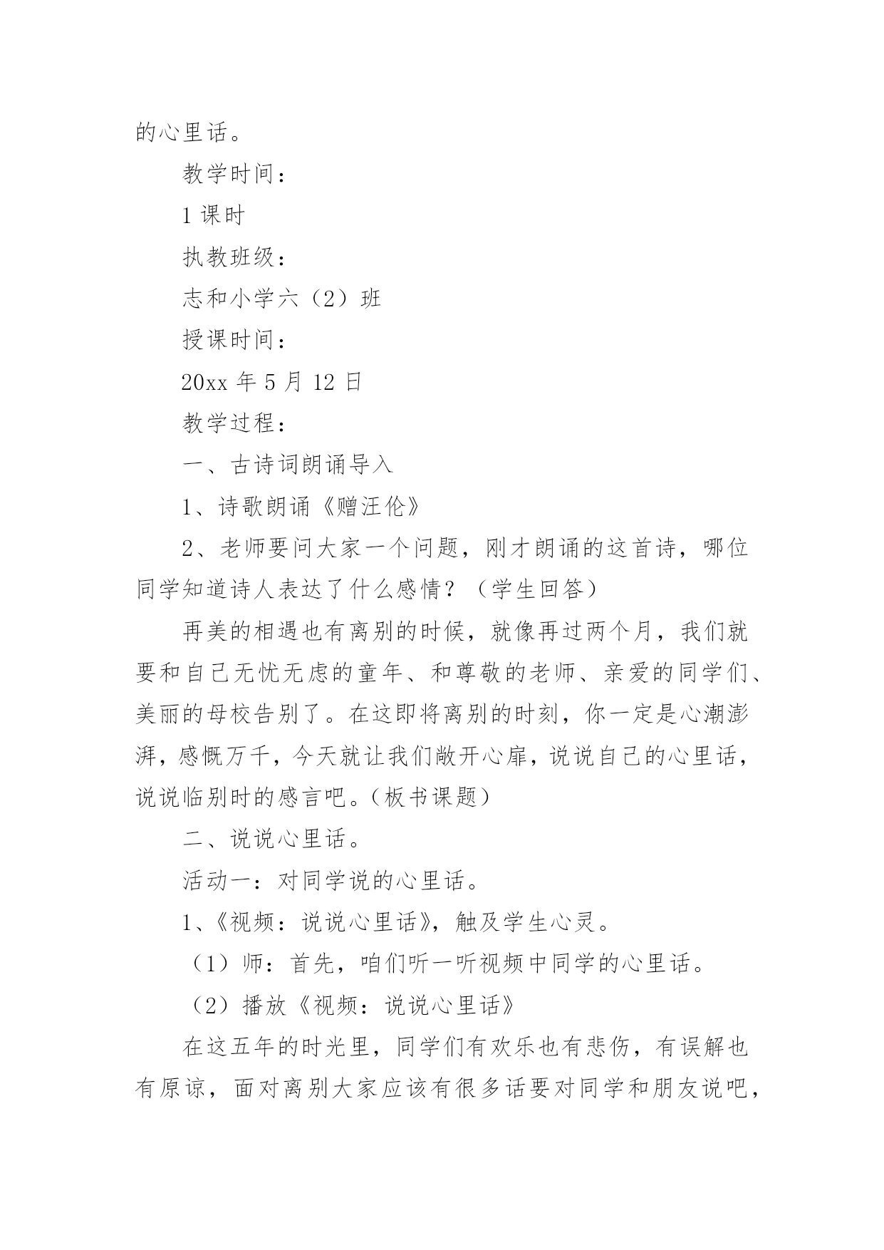 《临别感言》教学设计在生活、工作和学习中,我们常常会因经历的人和事不同而产生新的感想,这时可以通过写感言的方式将其记录下来。那么到底应该如何写感言呢?以下是小编为大家整理的《临别感言》教学设计,仅供参考,大家一起来看看吧。《临别感言》教学设计1教学内容:人教版下册品德与社会六年级下册第四单元第二主题中的内容。教学目标:1、知识目标:通过教学,让学生知道即将告别母校,告别老师。知道自己的成长离不开朋友,老师和同学,感受同学之间的友爱之情和老师的教育之恩。2、能力目标:以适当的方式表达自己对朋友,同学和老师的感激之情,提高学生的语言表达能力。3、情感、态度与价值观:通过生生交流,师生互动等形式,增强学生之间、师生之间、生校之间的亲近感,加深彼此间的情意。教学重难点:1、重点:用自己喜欢的方式表达自己对朋友,同学和老师的感激之情。2、难点:激发学生内心情感,向老师、同学说出自己的心里话。教学时间:1课时执教班级:志和小学六(2)班授课时间:20xx年5月12日教学过程:一、古诗词朗诵导入1、诗歌朗诵《赠汪伦》2、老师要问大家一个问题,刚才朗诵的这首诗,哪位同学知道诗人表达了什么感情?(学生回答)再美的相遇也有离别的时候,就像再过两个月,我们就要和自己无忧无虑的童年、和尊敬的老师、亲爱的同学们、美丽的母校告别了。在这即将离别的时刻,你一定是心潮澎湃,感慨万千,今天就让我们敞开心扉,说说自己的心里话,说说临别时的感言吧。(板书课题)二、说说心里话。活动一:对同学说的心里话。1、《视频:说说心里话》,触及学生心灵。(1)师:首先,咱们听一听视频中同学的心里话。(2)播放《视频:说说心里话》在这五年的时光里,同学们有欢乐也有悲伤,有误解也有原谅,面对离别大家应该有很多话要对同学和朋友说吧,一丝丝歉意,一缕缕祝福,千千万万的感谢,现在就拿起手中的笔让你们的话语在纸上跳跃吧!同学们可以按大屏幕上的格式进行书写。写完后,把你们的感情纸贴驻足在黑板那一角———同学情驻留一角。(书写过程中,播放背景音乐《心愿》)三、互诉师生情(1)老师感情流露师:刚才你们说的都是同学之间的心里话,在这个班集体中,除了有同学,我们还有几个共同的朋友,这朋友是谁呢?就是我们的老师。寒来暑往,老师与你们一路相随。老师们与大家一起在知识的海洋中遨游,握着一双双稚嫩的小手一起成长,在这即将分别之际,老师也有话要对同学们说一说,请大家一起来听一听!播放视频——《青春爱最大》(2)学生感恩恩师同学们,观看视频后,你们知道了老师对你们的深厚情谊。现在你们有什么想法,要对老师表达的,现在老师给你们三分钟时间思考交流,最后把你们的感情用声音传递给老师。四、课堂作业师:听了同学们的心里话,老师和你们一样的感动,感动你们的真诚,感动你们的纯真可爱。(课件出示)在这短暂的四十分钟,或许还有许多同学没有机会表达或不好当着老师、同学的面表达心里话、表达祝福。课后,让我们共同用笔写下你想对同学、对老师或学校校长表达的祝福和心里话吧。写下来后就送给他们。五、总结今天让我们告别过去的不愉快,载着曾经的欢乐,踏上新的征程,驶向成功的彼岸,让我们的友情、师情地久天长吧!(播放《友谊地久天长》的歌曲)在此,我也衷心地祝愿每一位即将六年级毕业的同学,身体健康,微笑着走进中学的大门,结识更多的新朋友,努力学习,取得更好的成绩。六、板书设计:临别感言珍惜友谊,铭记师恩。友情、师情地久天长。《临别感言》教学设计2教学目标:知道自己的成长离不开朋友、老师和同学,感受友爱之情和教育之恩。以适当的方式表达对朋友、同学和老师的感激之情。教学重点:向老师、同学们说出自己的心里话;用自己喜欢的方式表达自己对朋友,同学和老师的感激之情。教具和学具准备:班级活动的照片:运动会、班队活动、六一节、植树、新年等学生准备毕业纪念品(纪念册、情谊卡、手绢……)教学过程:导语:似乎在一转眼间,我们就要小学毕业了。此时此刻,老师的心情很复杂——有点儿高兴,还有点失落;有点儿期待,也有点担心;当然,还有些难过,舍不得我们这个班级,舍不得我们每一位同学,那么同学们呢?生答:略活动一:回顾共同的生活老师出示该班学生的集体活动照片,分组轮换看,讨论回顾学校共同生活点滴;指引同学走出教室,看看我们生活5年的校园,走走我们奔跑过的操场,和教过我们的老师说说话;注:这两项活动旨在让学生看到熟悉的地方,熟悉的人,回顾难忘的往事,为后面的激情表述做铺垫。活动二:说说心理话师:同学们,班级就像一个大家庭,我们在一起度过了一千多个日子,同学之间就如同兄弟姐妹,老师如同家长,我们相处的点点滴滴都涌在心头,毕业在即,就聊一聊我们的心理话吧!生:略注:主要为学生之间吐露心声创设情景,或表达歉意;或表示感谢;或表达留恋之情……。要引导学生知道自己的成长离不开同学的帮助