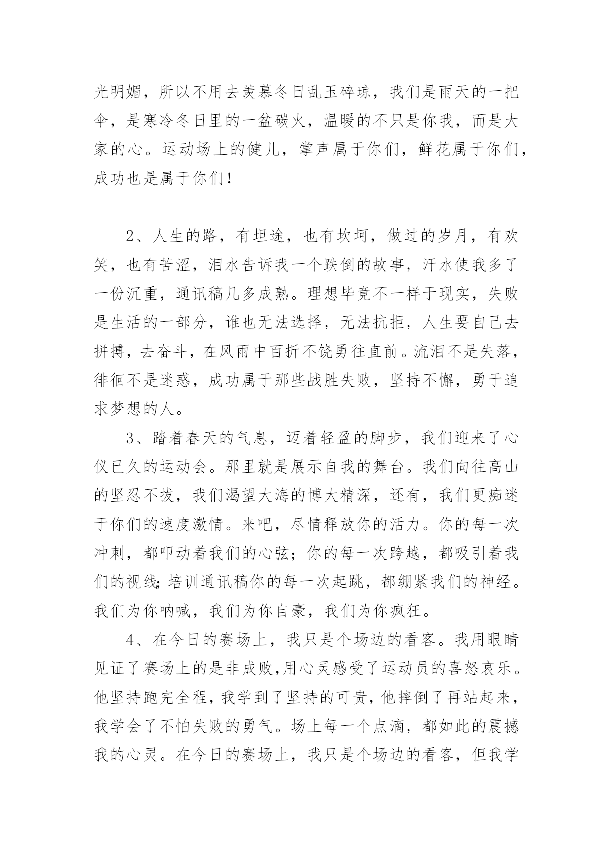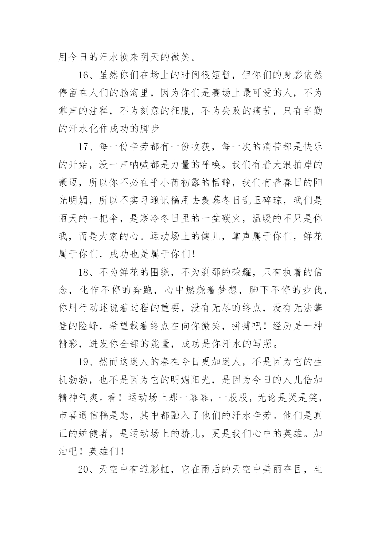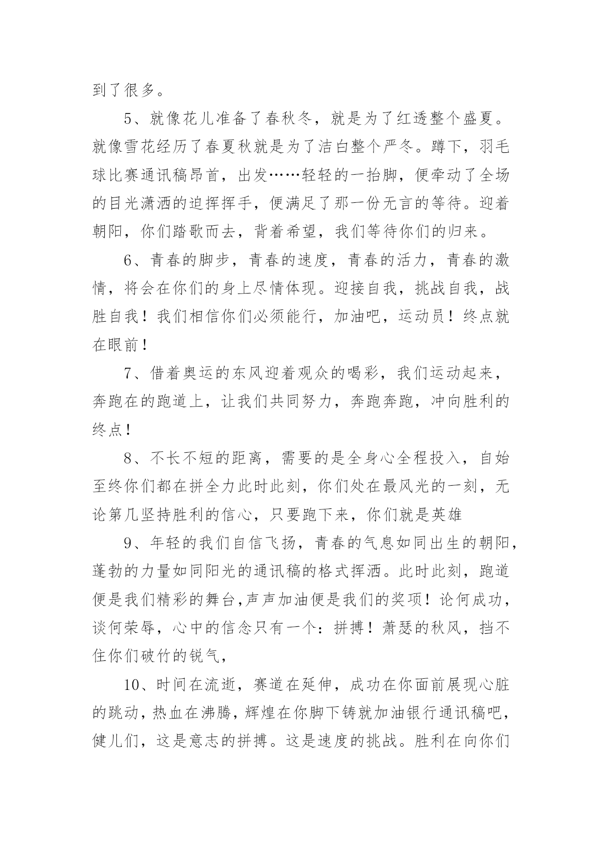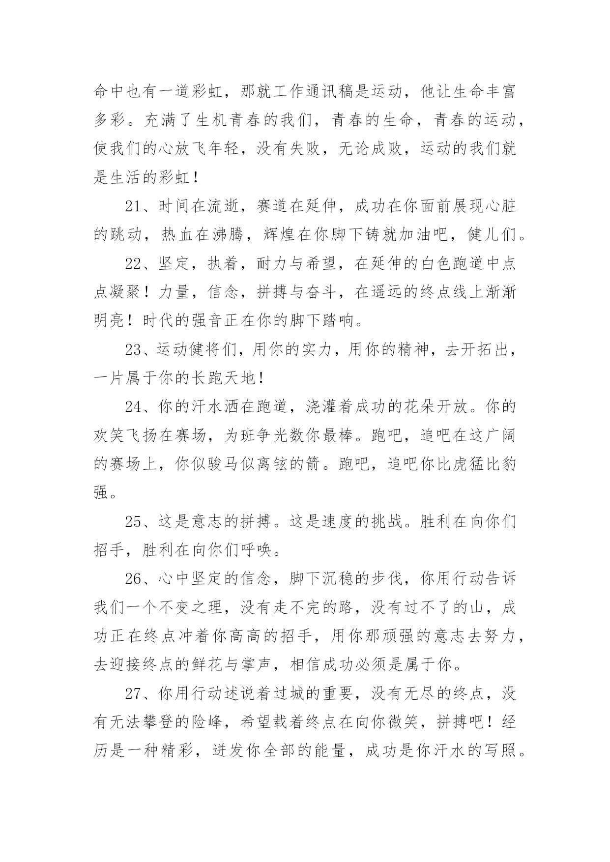 运动会加油稿运动会加油稿[精选]在现实社会中,各种加油稿频频出现,加油稿有着正向的鼓动作用。怎样写加油稿才能更好地发挥其做用呢?下面是小编收集整理的运动会加油稿,欢迎阅读与收藏。运动会加油稿1失败者倒下的时候,生命又怎能屹立!歪歪斜斜的身影,又怎耐的住风雨的洗礼。你若有一个不屈的灵魂,脚下才会有一方坚实的土地。昨天的失败已经过去,胜利不仅仅是一个美好的话题。望着绿茵场上你愈渐沉重的步伐,赛前鼓励你的'豪言壮语已变得苍白无力,此刻的我只有沉默,只能在心底为你默默地祈祷和祝福。明知赛场上的五千米是你的极限,你为什么还要义无返顾地去挑战?我想因为终点是一座辉煌的里程碑,上面篆刻着蓬勃青春的注释——爱拼才会赢。运动会加油稿21、每一份辛劳都有一份收获,每一次的痛苦都是快乐的开始,没一声呐喊都是力量的呼唤。我们有着大浪拍岸的豪迈,所以你不必在乎小荷初露的恬静,我们有着春日的阳光明媚,所以不用去羡慕冬日乱玉碎琼,我们是雨天的一把伞,是寒冷冬日里的一盆碳火,温暖的不只是你我,而是大家的心。运动场上的健儿,掌声属于你们,鲜花属于你们,成功也是属于你们!2、人生的路,有坦途,也有坎坷,做过的岁月,有欢笑,也有苦涩,泪水告诉我一个跌倒的故事,汗水使我多了一份沉重,通讯稿几多成熟。理想毕竟不一样于现实,失败是生活的一部分,谁也无法选择,无法抗拒,人生要自己去拼搏,去奋斗,在风雨中百折不饶勇往直前。流泪不是失落,徘徊不是迷惑,成功属于那些战胜失败,坚持不懈,勇于追求梦想的人。3、踏着春天的气息,迈着轻盈的脚步,我们迎来了心仪已久的运动会。那里就是展示自我的舞台。我们向往高山的坚忍不拔,我们渴望大海的博大精深,还有,我们更痴迷于你们的速度激情。来吧,尽情释放你的活力。你的每一次冲刺,都叩动着我们的心弦;你的每一次跨越,都吸引着我们的视线;培训通讯稿你的每一次起跳,都绷紧我们的神经。我们为你呐喊,我们为你自豪,我们为你疯狂。4、在今日的赛场上,我只是个场边的看客。我用眼睛见证了赛场上的是非成败,用心灵感受了运动员的喜怒哀乐。他坚持跑完全程,我学到了坚持的可贵,他摔倒了再站起来,我学会了不怕失败的勇气。场上每一个点滴,都如此的震撼我的心灵。在今日的赛场上,我只是个场边的看客,但我学到了很多。5、就像花儿准备了春秋冬,就是为了红透整个盛夏。就像雪花经历了春夏秋就是为了洁白整个严冬。蹲下,羽毛球比赛通讯稿昂首,出发……轻轻的一抬脚,便牵动了全场的目光潇洒的迫挥挥手,便满足了那一份无言的等待。迎着朝阳,你们踏歌而去,背着希望,我们等待你们的归来。6、青春的脚步,青春的速度,青春的活力,青春的激情,将会在你们的身上尽情体现。迎接自我,挑战自我,战胜自我!我们相信你们必须能行,加油吧,运动员!终点就在眼前!7、借着奥运的东风迎着观众的喝彩,我们运动起来,奔跑在的跑道上,让我们共同努力,奔跑奔跑,冲向胜利的终点!8、不长不短的距离,需要的是全身心全程投入,自始至终你们都在拼全力此时此刻,你们处在最风光的一刻,无论第几坚持胜利的信心,只要跑下来,你们就是英雄9、年轻的我们自信飞扬,青春的气息如同出生的朝阳,蓬勃的力量如同阳光的通讯稿的格式挥洒。此时此刻,跑道便是我们精彩的舞台,声声加油便是我们的奖项!论何成功,谈何荣辱,心中的信念只有一个:拼搏!萧瑟的秋风,挡不住你们破竹的锐气,10、时间在流逝,赛道在延伸,成功在你面前展现心脏的跳动,热血在沸腾,辉煌在你脚下铸就加油银行通讯稿吧,健儿们,这是意志的拼搏。这是速度的挑战。胜利在向你们招手,胜利在向你们呼唤。11、也许流星并不少见,但它燃烧的刹那,留给人间最美丽的回忆!也许笑脸并不少见,但胜利的喜悦,总会留给世界精彩的一瞬!是的,那些以前美妙的东西只有短短的一瞬间,但那却把最辉煌的一刻留给了人间。胜利,是每个人所追求的,胜利的喜悦,是胜利与重新开始的转折,胜利是新的开始!12、心中坚定的信念,脚下沉稳的步伐,你用行动告诉我们一个不变之理,没有走不完的路,没有过不了的山,成功正在终点冲着你高高的招手,用你那顽强的意志去努力,去迎接终点的鲜花与掌声,相信成功必须是属于你。13、广阔的绿茵场,是为你们搭建的舞台。张扬吧,年轻的心,我们将为你永远喝彩!泰戈尔在诗中说,天空没有翅膀的影子,但我已飞过;艾青对朋友说,也许有人到达不了彼岸,但我们共同拥有大海。也许你们没有显赫的成绩,但运动场上留下了你们的足迹。也许你们没有奖品,但我们心中留下了你们拼搏的身影。所有的努力都是为了迎接这一刹那,所有的拼搏都是为了这一声令下。14、坚定,执着,耐力与希望,在延伸的白色跑道中点点凝聚!力量,信念,拼搏与奋斗,在遥远的终点线上渐渐明如何写通讯稿亮!时代的强音正在你的脚下踏响。15、汗水,泪水;笑声,歌声;我们尽情挥洒。开幕式上,运动场上煤矿通
