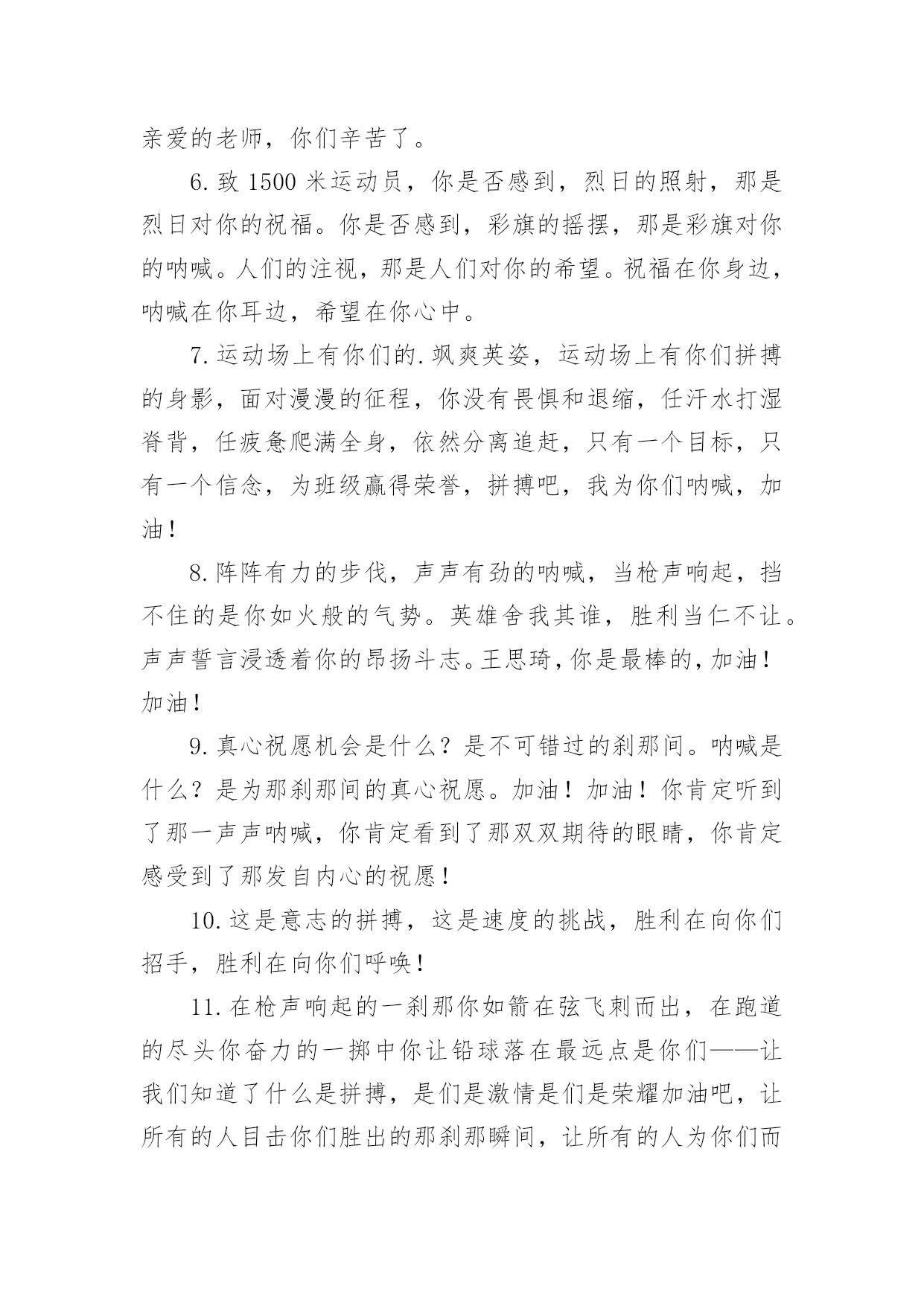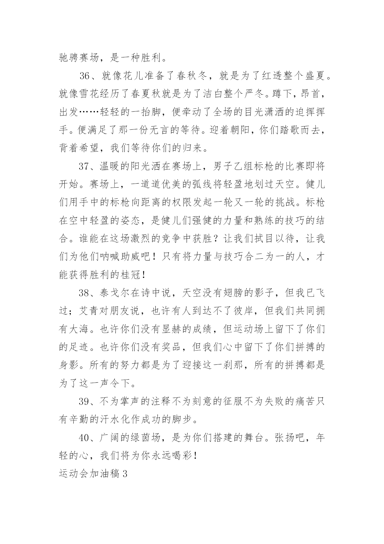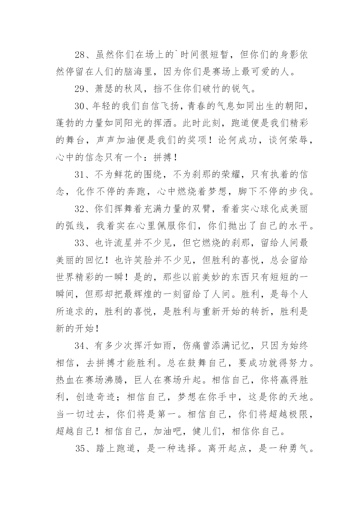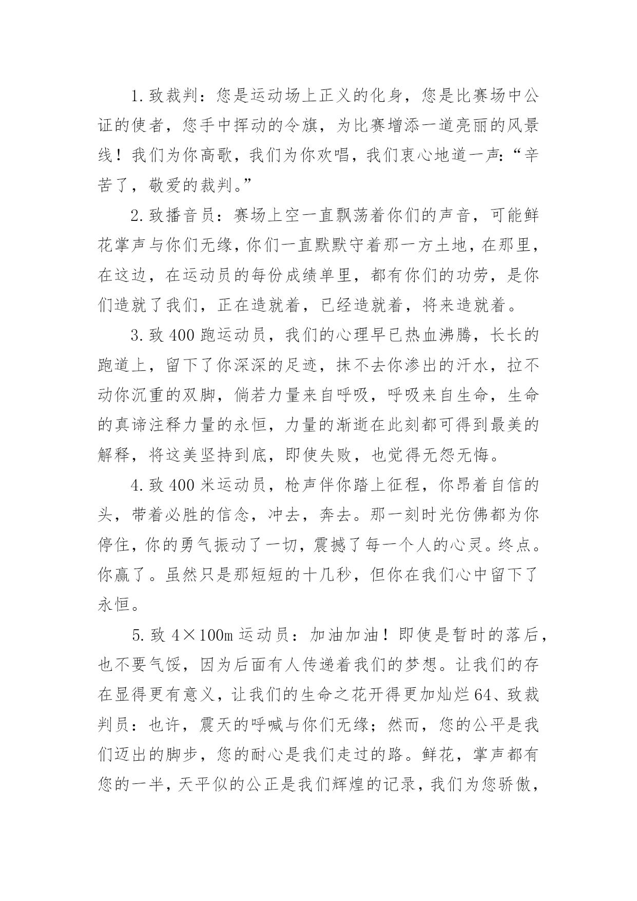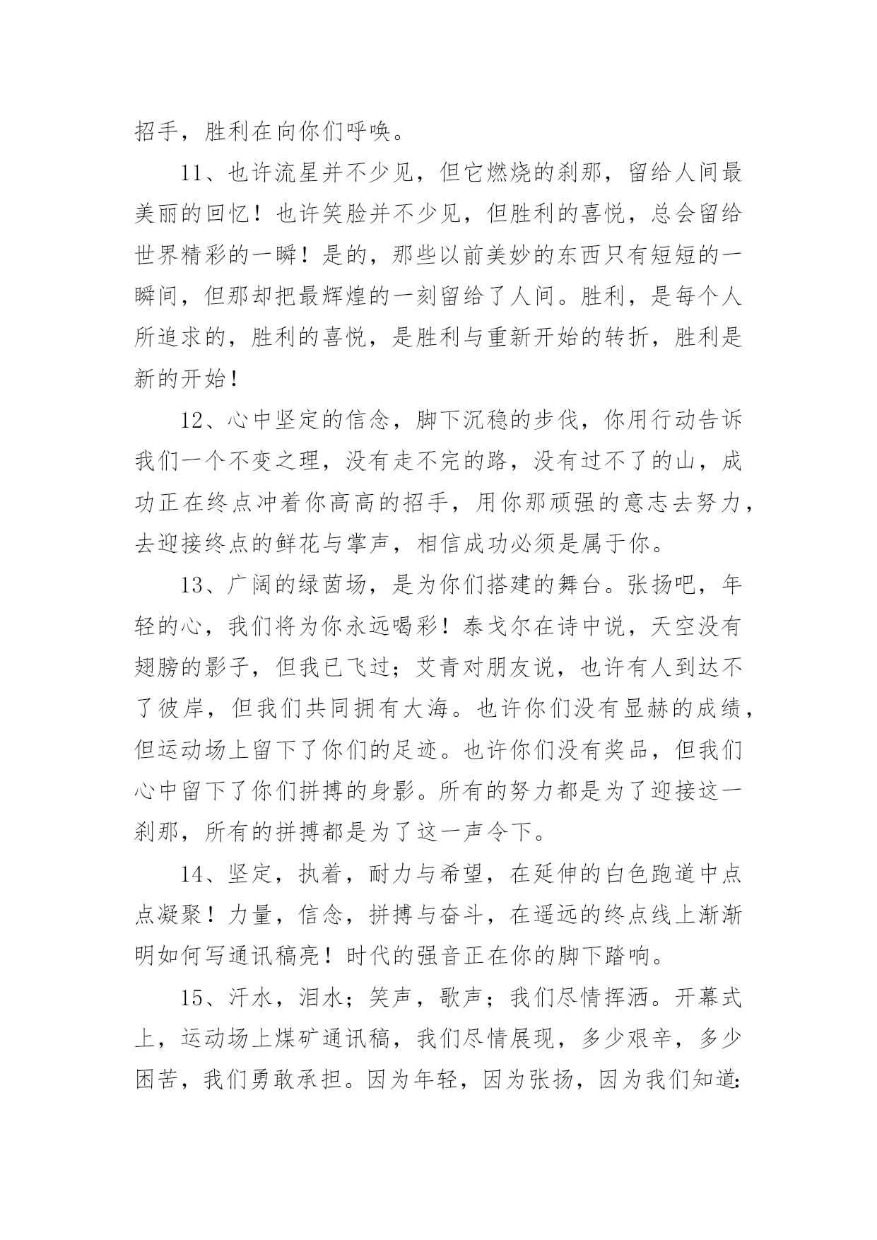 运动会加油稿运动会加油稿[精选]在现实社会中,各种加油稿频频出现,加油稿有着正向的鼓动作用。怎样写加油稿才能更好地发挥其做用呢?下面是小编收集整理的运动会加油稿,欢迎阅读与收藏。运动会加油稿1失败者倒下的时候,生命又怎能屹立!歪歪斜斜的身影,又怎耐的住风雨的洗礼。你若有一个不屈的灵魂,脚下才会有一方坚实的土地。昨天的失败已经过去,胜利不仅仅是一个美好的话题。望着绿茵场上你愈渐沉重的步伐,赛前鼓励你的'豪言壮语已变得苍白无力,此刻的我只有沉默,只能在心底为你默默地祈祷和祝福。明知赛场上的五千米是你的极限,你为什么还要义无返顾地去挑战?我想因为终点是一座辉煌的里程碑,上面篆刻着蓬勃青春的注释——爱拼才会赢。运动会加油稿21、每一份辛劳都有一份收获,每一次的痛苦都是快乐的开始,没一声呐喊都是力量的呼唤。我们有着大浪拍岸的豪迈,所以你不必在乎小荷初露的恬静,我们有着春日的阳光明媚,所以不用去羡慕冬日乱玉碎琼,我们是雨天的一把伞,是寒冷冬日里的一盆碳火,温暖的不只是你我,而是大家的心。运动场上的健儿,掌声属于你们,鲜花属于你们,成功也是属于你们!2、人生的路,有坦途,也有坎坷,做过的岁月,有欢笑,也有苦涩,泪水告诉我一个跌倒的故事,汗水使我多了一份沉重,通讯稿几多成熟。理想毕竟不一样于现实,失败是生活的一部分,谁也无法选择,无法抗拒,人生要自己去拼搏,去奋斗,在风雨中百折不饶勇往直前。流泪不是失落,徘徊不是迷惑,成功属于那些战胜失败,坚持不懈,勇于追求梦想的人。3、踏着春天的气息,迈着轻盈的脚步,我们迎来了心仪已久的运动会。那里就是展示自我的舞台。我们向往高山的坚忍不拔,我们渴望大海的博大精深,还有,我们更痴迷于你们的速度激情。来吧,尽情释放你的活力。你的每一次冲刺,都叩动着我们的心弦;你的每一次跨越,都吸引着我们的视线;培训通讯稿你的每一次起跳,都绷紧我们的神经。我们为你呐喊,我们为你自豪,我们为你疯狂。4、在今日的赛场上,我只是个场边的看客。我用眼睛见证了赛场上的是非成败,用心灵感受了运动员的喜怒哀乐。他坚持跑完全程,我学到了坚持的可贵,他摔倒了再站起来,我学会了不怕失败的勇气。场上每一个点滴,都如此的震撼我的心灵。在今日的赛场上,我只是个场边的看客,但我学到了很多。5、就像花儿准备了春秋冬,就是为了红透整个盛夏。就像雪花经历了春夏秋就是为了洁白整个严冬。蹲下,羽毛球比赛通讯稿昂首,出发……轻轻的一抬脚,便牵动了全场的目光潇洒的迫挥挥手,便满足了那一份无言的等待。迎着朝阳,你们踏歌而去,背着希望,我们等待你们的归来。6、青春的脚步,青春的速度,青春的活力,青春的激情,将会在你们的身上尽情体现。迎接自我,挑战自我,战胜自我!我们相信你们必须能行,加油吧,运动员!终点就在眼前!7、借着奥运的东风迎着观众的喝彩,我们运动起来,奔跑在的跑道上,让我们共同努力,奔跑奔跑,冲向胜利的终点!8、不长不短的距离,需要的是全身心全程投入,自始至终你们都在拼全力此时此刻,你们处在最风光的一刻,无论第几坚持胜利的信心,只要跑下来,你们就是英雄9、年轻的我们自信飞扬,青春的气息如同出生的朝阳,蓬勃的力量如同阳光的通讯稿的格式挥洒。此时此刻,跑道便是我们精彩的舞台,声声加油便是我们的奖项!论何成功,谈何荣辱,心中的信念只有一个:拼搏!萧瑟的秋风,挡不住你们破竹的锐气,10、时间在流逝,赛道在延伸,成功在你面前展现心脏的跳动,热血在沸腾,辉煌在你脚下铸就加油银行通讯稿吧,健儿们,这是意志的拼搏。这是速度的挑战。胜利在向你们招手,胜利在向你们呼唤。11、也许流星并不少见,但它燃烧的刹那,留给人间最美丽的回忆!也许笑脸并不少见,但胜利的喜悦,总会留给世界精彩的一瞬!是的,那些以前美妙的东西只有短短的一瞬间,但那却把最辉煌的一刻留给了人间。胜利,是每个人所追求的,胜利的喜悦,是胜利与重新开始的转折,胜利是新的开始!12、心中坚定的信念,脚下沉稳的步伐,你用行动告诉我们一个不变之理,没有走不完的路,没有过不了的山,成功正在终点冲着你高高的招手,用你那顽强的意志去努力,去迎接终点的鲜花与掌声,相信成功必须是属于你。13、广阔的绿茵场,是为你们搭建的舞台。张扬吧,年轻的心,我们将为你永远喝彩!泰戈尔在诗中说,天空没有翅膀的影子,但我已飞过;艾青对朋友说,也许有人到达不了彼岸,但我们共同拥有大海。也许你们没有显赫的成绩,但运动场上留下了你们的足迹。也许你们没有奖品,但我们心中留下了你们拼搏的身影。所有的努力都是为了迎接这一刹那,所有的拼搏都是为了这一声令下。14、坚定,执着,耐力与希望,在延伸的白色跑道中点点凝聚!力量,信念,拼搏与奋斗,在遥远的终点线上渐渐明如何写通讯稿亮!时代的强音正在你的脚下踏响。15、汗水,泪水;笑声,歌声;我们尽情挥洒。开幕式上,运动场上煤矿通