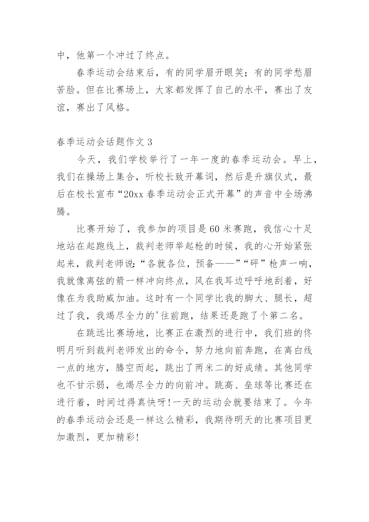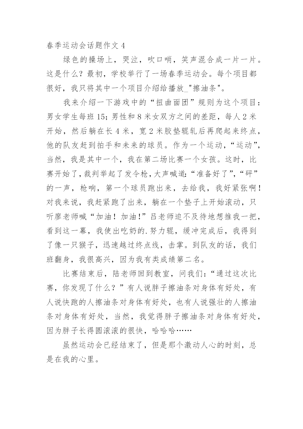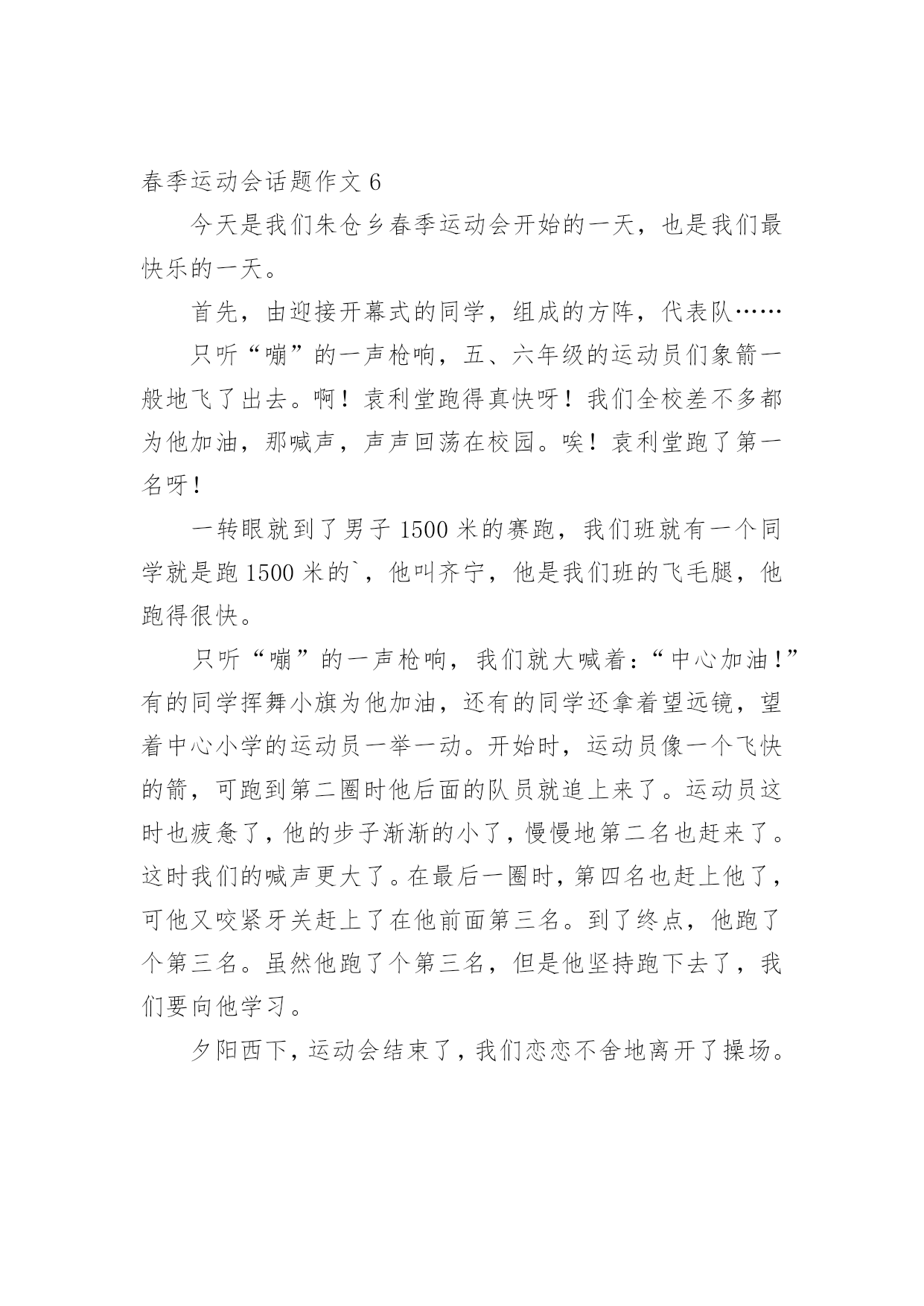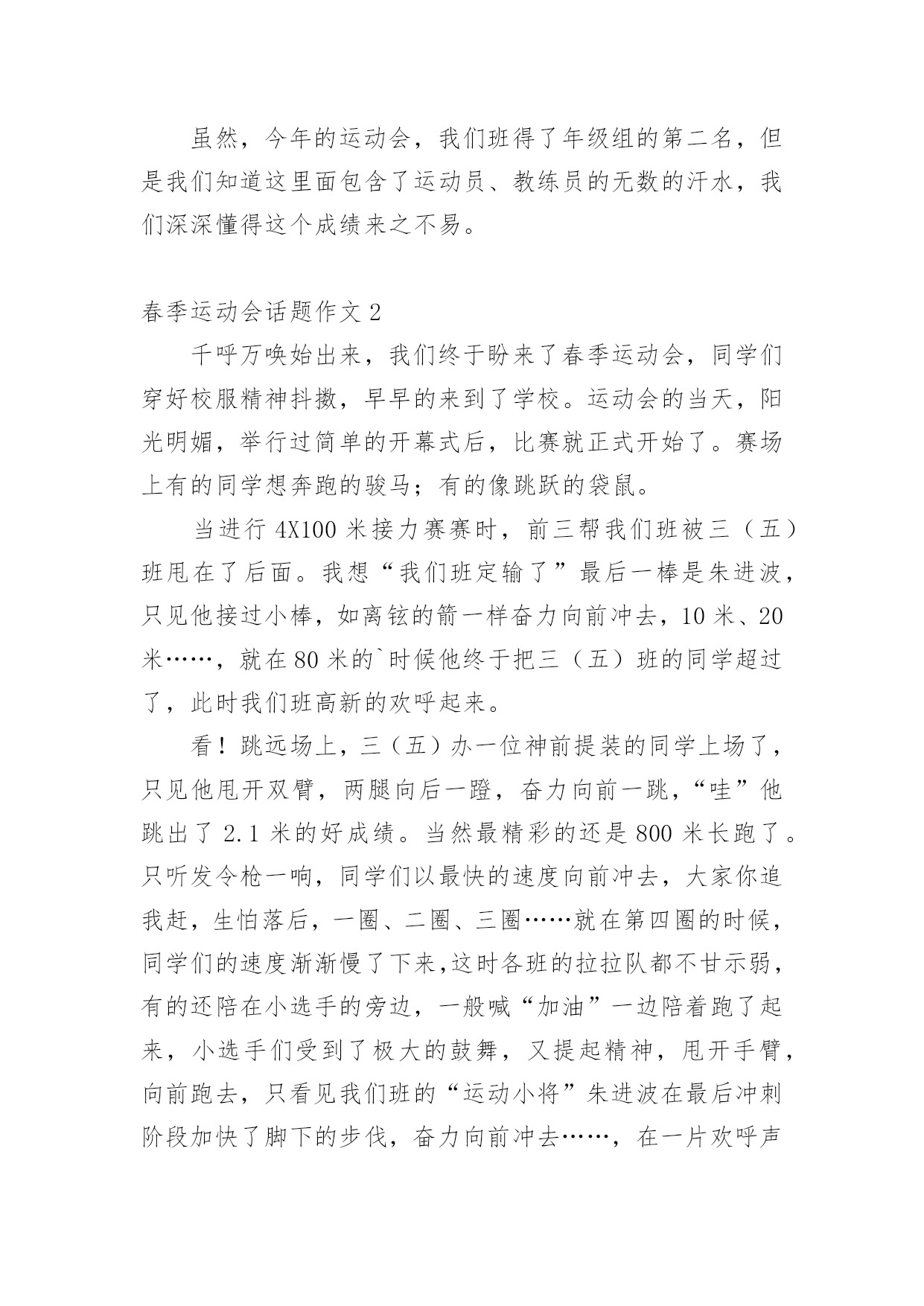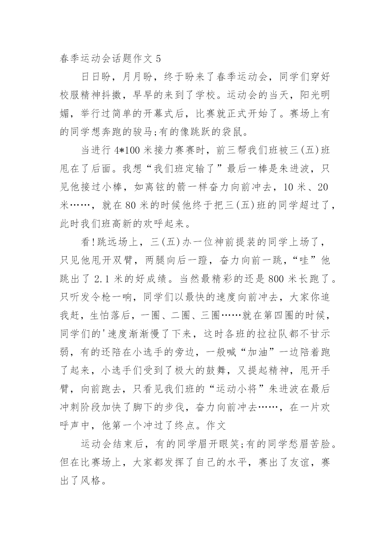 春季运动会话题作文在日常学习、工作抑或是生活中,大家对作文都不陌生吧,作文根据体裁的不同可以分为记叙文、说明文、应用文、议论文。相信写作文是一个让许多人都头痛的问题,下面是小编为大家整理的春季运动会话题作文,仅供参考,希望能够帮助到大家。春季运动会话题作文1今天是一年一度的运动会,老师带领我们来到了操场上,这里早已人山人海,大哥哥们挥着彩旗,大姐姐们舞着彩带。运动员个个精神振奋,神采飞扬。他们不断地向观众挥手、微笑。接着鼓号齐鸣,声乐阵阵。运动会开始了,我们班第一个上场的是李潇倩,只见她压了压腿,拱了拱腰,正在做着比赛前的热身。枪声响过,李潇倩紧攥拳头,飞奔向前。距离终点只有10米、9米、……1米,“耶!”李潇倩胜出了!我们全班欢呼起来。接着男子800米跑开始了,我们班派出了荆国琛,只见他在跑道上像离弦的箭一样飞跑,可是一不注意被五年级的大哥哥绊倒了,摔了一跤,结果我们倒数第一。现在场上正在进行女子200米跑的比赛,我们班的李若愚像是一匹脱缰的野马奔腾而去,这时她汗流满面,明显的.体力不支。我们便大声喊道:“李若愚加油!”尽管她用尽全身力气,也仅仅得了第三名。虽然,今年的运动会,我们班得了年级组的第二名,但是我们知道这里面包含了运动员、教练员的无数的汗水,我们深深懂得这个成绩来之不易。春季运动会话题作文2千呼万唤始出来,我们终于盼来了春季运动会,同学们穿好校服精神抖擞,早早的来到了学校。运动会的当天,阳光明媚,举行过简单的开幕式后,比赛就正式开始了。赛场上有的同学想奔跑的骏马;有的像跳跃的袋鼠。当进行4X100米接力赛赛时,前三帮我们班被三(五)班甩在了后面。我想“我们班定输了”最后一棒是朱进波,只见他接过小棒,如离铉的箭一样奋力向前冲去,10米、20米……,就在80米的`时候他终于把三(五)班的同学超过了,此时我们班高新的欢呼起来。看!跳远场上,三(五)办一位神前提装的同学上场了,只见他甩开双臂,两腿向后一蹬,奋力向前一跳,“哇”他跳出了2.1米的好成绩。当然最精彩的还是800米长跑了。只听发令枪一响,同学们以最快的速度向前冲去,大家你追我赶,生怕落后,一圈、二圈、三圈……就在第四圈的时候,同学们的速度渐渐慢了下来,这时各班的拉拉队都不甘示弱,有的还陪在小选手的旁边,一般喊“加油”一边陪着跑了起来,小选手们受到了极大的鼓舞,又提起精神,甩开手臂,向前跑去,只看见我们班的“运动小将”朱进波在最后冲刺阶段加快了脚下的步伐,奋力向前冲去……,在一片欢呼声中,他第一个冲过了终点。春季运动会结束后,有的同学眉开眼笑;有的同学愁眉苦脸。但在比赛场上,大家都发挥了自己的水平,赛出了友谊,赛出了风格。春季运动会话题作文3今天,我们学校举行了一年一度的春季运动会。早上,我们在操场上集合,听校长致开幕词,然后是升旗仪式,最后在校长宣布“20xx春季运动会正式开幕”的声音中全场沸腾。比赛开始了,我参加的项目是60米赛跑,我信心十足地站在起跑线上,裁判老师举起枪的时候,我的心开始紧张起来,裁判老师说:“各就各位,预备——”“砰”枪声一响,我就像离弦的箭一样冲向终点,风在我耳边呼呼地刮着,好像在为我助威加油。这时有一个同学比我的脚大、腿长,超过了我,我竭尽全力的'往前跑,结果还是跑了个第二名。在跳远比赛场地,比赛正在激烈的进行中,我们班的佟明月听到裁判老师发出的命令,努力地向前奔跑,在离白线一点的地方,腾空而起,跳出了两米二的好成绩。其他同学也不甘示弱,也竭尽全力的向前冲。跳高、垒球等比赛还在进行着,时间过得真快呀!一天的运动会就要结束了。今年的春季运动会还是一样这么精彩,我期待明天的比赛项目更加激烈,更加精彩!春季运动会话题作文4绿色的操场上,哭泣,吹口哨,笑声混合成一片一片。这是什么?最初,学校举行了一场春季运动会。每个项目都很好,我只将其中一个项目介绍给播放_"擦油条"。我来介绍一下游戏中的“扭曲面团”规则为这个项目:男女学生每班15;男性和8米女双方之间的差距,每人2米开始,然后躺在长4米,宽2米胶垫辊轧后再爬起来终点,他的队友赶到拍手和未来的球员。作为一个运动,“运动”,当然,我是其中一个,我在第二场比赛一个女孩。这时,比赛开始了,裁判举起了发令枪,大声喊道:“准备好了”,“砰”的一声,枪响,第一个球员跑出来,去给我,我好紧张啊!对我来说,我赶紧跑了出来,躺在一个垫子上开始滚动,只听廖老师喊“加油!加油!”吕老师迫不及待地想推我一把,看到这一幕,我使出吃奶的.努力辊,缓冲完成后,我得到了像一只猴子,迅速越过终点线,击掌。到队友的话,我们班翻身,我很高兴,因为我有类成绩第二名。比赛结束后,陆老师回到教室,问我们:“通过这次比赛,你发现了什么?”有人说胖子擦油条对身体有好处,有人说快跑的人擦油条对身体有好处,也有人说强壮的人擦油条对身体有好