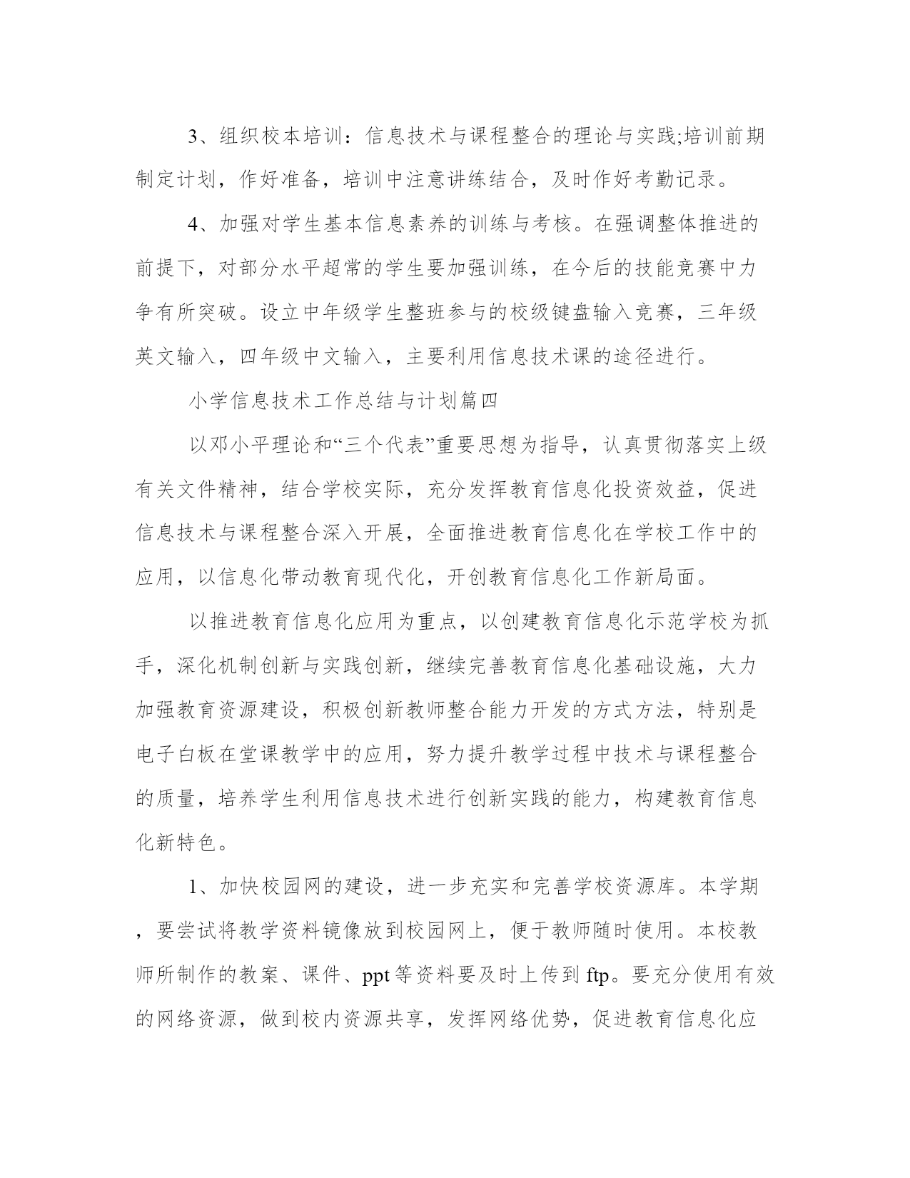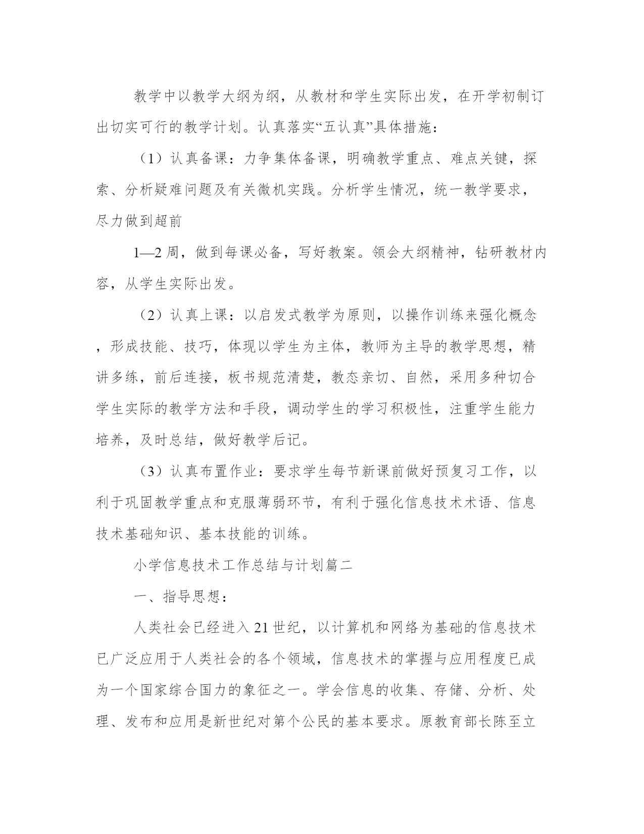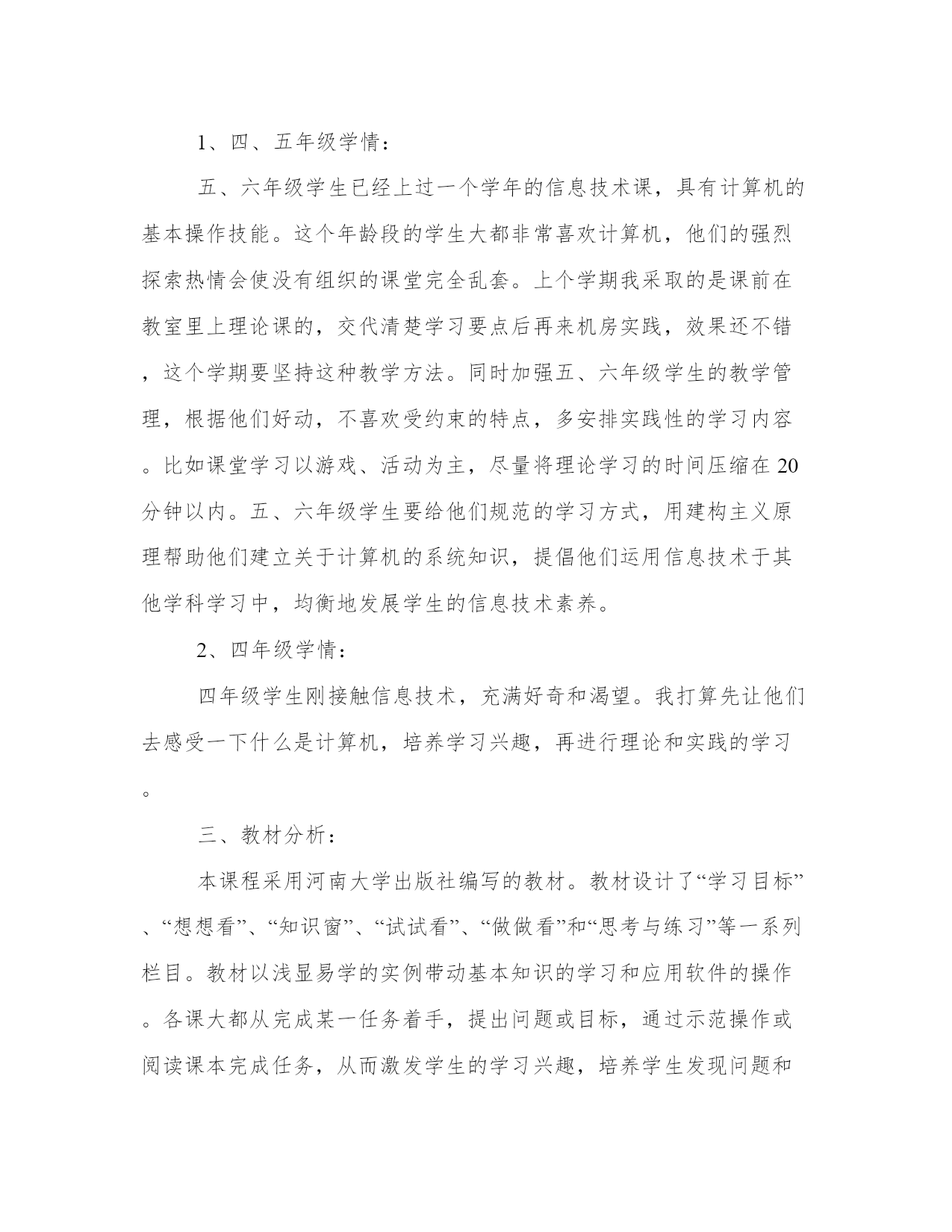 小学信息技术工作总结与计划(5篇)时间流逝得如此之快,前方等待着我们的是新的机遇和挑战,是时候开始写计划了。计划书写有哪些要求呢?我们怎样才能写好一篇计划呢?下面是小编带来的优秀计划范文,希望大家能够喜欢!小学信息技术工作总结与计划篇一本学期五年级共三个班级,学生对学习计算机有了一定的基础,但是也有一部分学生基本知识与技能的也没有掌握,大部分学生都喜好计算机,少部分学生正确使用计算机的习惯还没形成,考虑到五年级学生本学期的上课特点,所以,本学期将继续激发学生学习计算机的兴趣外,着重继续巩固和加深对word的学习,让学生能尽量熟悉和使用word,提高学生对计算机的应用能力,努力让每个学生都能学到知识,提高计算机的应用能力,为下阶段的计算机学习打下较扎实的基础。二、教材分析本学期采用的是福建教育出版社出版的新版教材五年级上册,它包括以下几方面内容:总共四个单元,第一单元主要内容是交个新朋友,共4课,通过了解电脑及windows20xx,完成一些与学生学习生活相关联的任务,进而掌握完成这些任务所需要的操作技能;第二单元主要内容是学用键盘,共4课,在这一单元中,要让学生学习对键盘的灵活运用,学会输入文字;第三单元主要内容是美妙的图画世界,让学生学会画图的基本方法和步骤、技巧;第四单元主要内容是文件操作能手,让学生掌握基本的文字输入方法。三、教学目标1、知识与技能要求掌握的具体知识点如下:认识word,熟悉word软件的界面;工具栏的选择;输入、删除文字;选定文字的方法;保存文档;打开文档;改变文字的字体、字号、颜色等;认识电脑中的图标,会申请电子邮箱,发送和接收电子邮件。2、过程与方法培养学生对信息技术的兴趣和意识,让学生了解和掌握信息技术基本知识和技能,了解信息技术的发展及应用对人类日常生活和科学技术的深刻影响。3、情感态度与价值观通过信息技术课程使学生具有获取信息、传输信息、处理信息和应用信息的能力,教育学生正确认识和理解与信息技术相关的文化、伦理和社会等问题,负责任地使用信息技术;培养学生良好的信息素养,把信息技术作为支持终身学习和合作学习手手段,为适应信息社会的学习、工作和生活打下必要的基础。四、教学措施教学中以教学大纲为纲,从教材和学生实际出发,在开学初制订出切实可行的教学计划。认真落实“五认真”具体措施:(1)认真备课:力争集体备课,明确教学重点、难点关键,探索、分析疑难问题及有关微机实践。分析学生情况,统一教学要求,尽力做到超前1—2周,做到每课必备,写好教案。领会大纲精神,钻研教材内容,从学生实际出发。(2)认真上课:以启发式教学为原则,以操作训练来强化概念,形成技能、技巧,体现以学生为主体,教师为主导的教学思想,精讲多练,前后连接,板书规范清楚,教态亲切、自然,采用多种切合学生实际的教学方法和手段,调动学生的学习积极性,注重学生能力培养,及时总结,做好教学后记。(3)认真布置作业:要求学生每节新课前做好预复习工作,以利于巩固教学重点和克服薄弱环节,有利于强化信息技术术语、信息技术基础知识、基本技能的训练。小学信息技术工作总结与计划篇二一、指导思想:人类社会已经进入21世纪,以计算机和网络为基础的信息技术已广泛应用于人类社会的各个领域,信息技术的掌握与应用程度已成为一个国家综合国力的象征之一。学会信息的收集、存储、分析、处理、发布和应用是新世纪对第个公民的基本要求。原教育部长陈至立在中小学信息技术教育会议上指出:“过去的十年中,互联网的多媒体技术已成为拓展人类能力的创造性工具,为了适应科学技术高速发展及经济全球化的挑战,发达国家已经开始把注意力放在培养学生一系列的能力上,特别要求学生具备筛选和获取信息、准确地鉴别信息的真伪、创造性加工和处理信息的能力,并把学生掌握和运用信息技术的能力作为与读、写、算一样重要的新的终生有用的基础能力。在知识经济时代,信息素养已成为科学素养的重要基础。”二、教学目标四年级:1、认识计算机的硬件组成,正确的开关机,了解计算机在日常生活中的应用。2、简单使用计算机,了解键盘、鼠标的使用,能输入简单的文字。五年级:1、掌握文字录入的基本方法,养成正确的姿势,科学的指法,培养盲打的习惯。2、认识操作系统,了解应用软件,了解windows中文件、文件夹的基本操作,学习使用附件中的画图程序。六年级认识软盘、光盘等存储介质,掌握使用windows附件中的录音机、计算器等应用程序。学习使用word文字处理软件,进行文字处理。1、四、五年级学情:五、六年级学生已经上过一个学年的信息技术课,具有计算机的基本操作技能。这个年龄段的学生大都非常喜欢计算机,他们的强烈探索热情会使没有组织的课堂完全乱套。上个学期我采取的是课前在教室里上理论课的,交