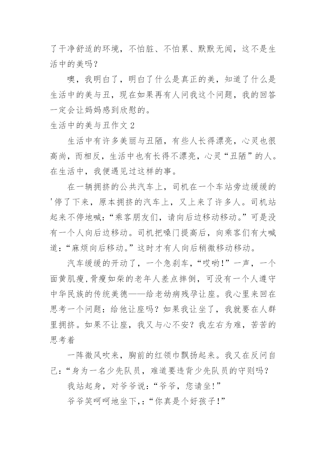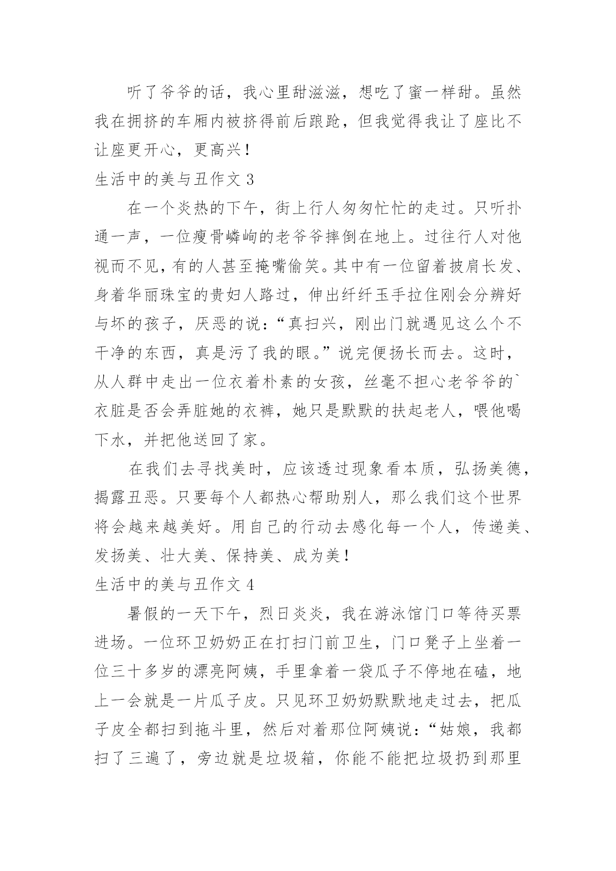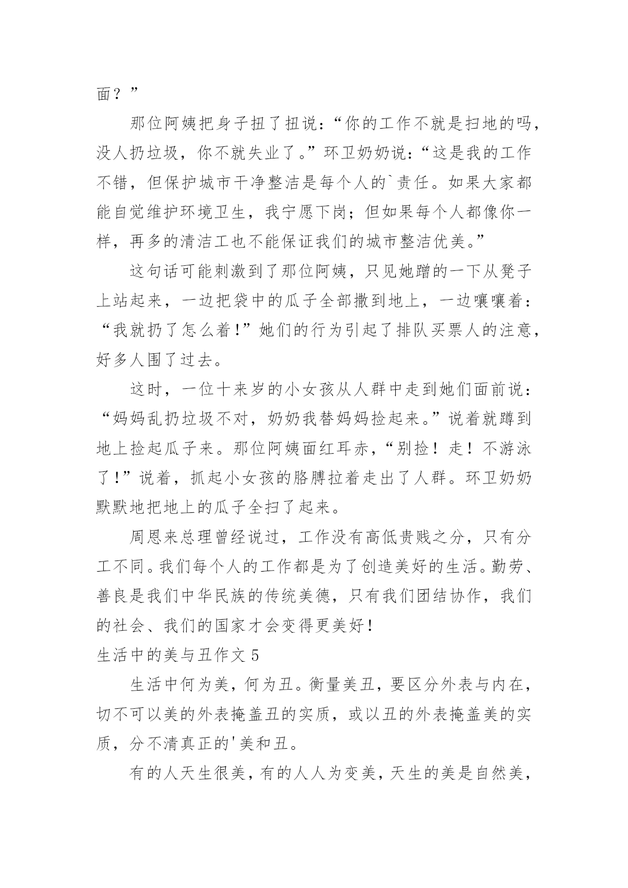 生活中的美与丑作文生活中的美与丑作文(精选30篇)在平凡的学习、工作、生活中,大家一定都接触过作文吧,作文一定要做到主题集中,围绕同一主题作深入阐述,切忌东拉西扯,主题涣散甚至无主题。那么,怎么去写作文呢?下面是小编收集整理的生活中的美与丑作文,仅供参考,欢迎大家阅读。生活中的美与丑作文1在我幼小无知时,不知道什么是生活中的美与丑。如果有人问我是明星美还是清洁工美,我会毫不犹豫地回答:“明星美!明星美!”每次听了我的回答,妈妈总是摇摇头说:“晨曦还没长大。”我问妈妈为什么,她只是笑一笑。今年春节,妈妈带我去鲁南书城买书,我非常高兴。可是一到书城门口,一切兴致都消失了,除了人以外,只见书城门口到处是垃圾:香蕉皮、食品袋、纸盒等,五花八门地洒满一地。让人不解的是,一个完整无缺的垃圾桶就在旁边。看到这些垃圾,就像看到了扔垃圾的那些人的一张张丑陋的脸、一个个丑陋的心灵。无疑这就是生活中的丑。正当我沉思的时侯,有种声音把我唤醒了---是清洁工在打扫卫生。多神奇的`一刹那,清洁工阿姨拿着一把大扫帚,轻轻一扫,肮脏的地面就像变了魔术似的,垃圾一扫而光,地面露出了它久违的清洁的笑脸。清洁工用自己的辛勤劳动为大家换来了干净舒适的环境,不怕脏、不怕累、默默无闻,这不是生活中的美吗?噢,我明白了,明白了什么是真正的美,知道了什么是生活中的美与丑,现在如果再有人问我这个问题,我的回答一定会让妈妈感到欣慰的。生活中的美与丑作文2生活中有许多美丽与丑陋,有些人长得漂亮,心灵也很高尚,而相反,生活中也有长得不漂亮,心灵“丑陋”的人。在生活中,我便遇见过这样的事。在一辆拥挤的公共汽车上,司机在一个车站旁边缓缓的'停了下来,原本拥挤的汽车上,又上来了许多人。司机站起来不停地喊:“乘客朋友们,请向后边移动移动。”可是没有一个人向后边移动。司机把嗓门提高后,向乘客们有大喊道:“麻烦向后移动。”这时才有人向后稍微移动移动。汽车缓缓的开动了,一个急刹车,“哎哟!”一声,一个面黄肌瘦,骨瘦如柴的老年人差点摔倒,可没有一个人遵守中华民族的传统美德——给老幼病残孕让座。我心里来回在思考一个问题:给他让座吗?如果我让坐了,我就要在人群里拥挤。如果不让座,我又与心不安?我左右为难,苦苦的思考着一阵微风吹来,胸前的红领巾飘扬起来。我又在反问自己:“身为一名少先队员,难道要违背少先队员的守则吗?我站起身,对爷爷说:“爷爷,您请坐!”爷爷笑呵呵地坐下,:“你真是个好孩子!”听了爷爷的话,我心里甜滋滋,想吃了蜜一样甜。虽然我在拥挤的车厢内被挤得前后踉跄,但我觉得我让了座比不让座更开心,更高兴!生活中的美与丑作文3在一个炎热的下午,街上行人匆匆忙忙的走过。只听扑通一声,一位瘦骨嶙峋的老爷爷摔倒在地上。过往行人对他视而不见,有的人甚至掩嘴偷笑。其中有一位留着披肩长发、身着华丽珠宝的贵妇人路过,伸出纤纤玉手拉住刚会分辨好与坏的孩子,厌恶的说:“真扫兴,刚出门就遇见这么个不干净的东西,真是污了我的眼。”说完便扬长而去。这时,从人群中走出一位衣着朴素的女孩,丝毫不担心老爷爷的`衣脏是否会弄脏她的衣裤,她只是默默的扶起老人,喂他喝下水,并把他送回了家。在我们去寻找美时,应该透过现象看本质,弘扬美德,揭露丑恶。只要每个人都热心帮助别人,那么我们这个世界将会越来越美好。用自己的行动去感化每一个人,传递美、发扬美、壮大美、保持美、成为美!生活中的美与丑作文4暑假的一天下午,烈日炎炎,我在游泳馆门口等待买票进场。一位环卫奶奶正在打扫门前卫生,门口凳子上坐着一位三十多岁的漂亮阿姨,手里拿着一袋瓜子不停地在磕,地上一会就是一片瓜子皮。只见环卫奶奶默默地走过去,把瓜子皮全都扫到拖斗里,然后对着那位阿姨说:“姑娘,我都扫了三遍了,旁边就是垃圾箱,你能不能把垃圾扔到那里面?”那位阿姨把身子扭了扭说:“你的工作不就是扫地的吗,没人扔垃圾,你不就失业了。”环卫奶奶说:“这是我的工作不错,但保护城市干净整洁是每个人的`责任。如果大家都能自觉维护环境卫生,我宁愿下岗;但如果每个人都像你一样,再多的清洁工也不能保证我们的城市整洁优美。”这句话可能刺激到了那位阿姨,只见她蹭的一下从凳子上站起来,一边把袋中的瓜子全部撒到地上,一边嚷嚷着:“我就扔了怎么着!”她们的行为引起了排队买票人的注意,好多人围了过去。这时,一位十来岁的小女孩从人群中走到她们面前说:“妈妈乱扔垃圾不对,奶奶我替妈妈捡起来。”说着就蹲到地上捡起瓜子来。那位阿姨面红耳赤,“别捡!走!不游泳了!”说着,抓起小女孩的胳膊拉着走出了人群。环卫奶奶默默地把地上的瓜子全扫了起来。周恩来总理曾经说过,工作没有高低贵贱之分,只有分工不同。我们每个人的工作都是为了创造美好的生活。勤劳、善良是我们中华民族的传统美德,只有我们团结协作,我们的社会、我们的国家才会变得更美好!生活
