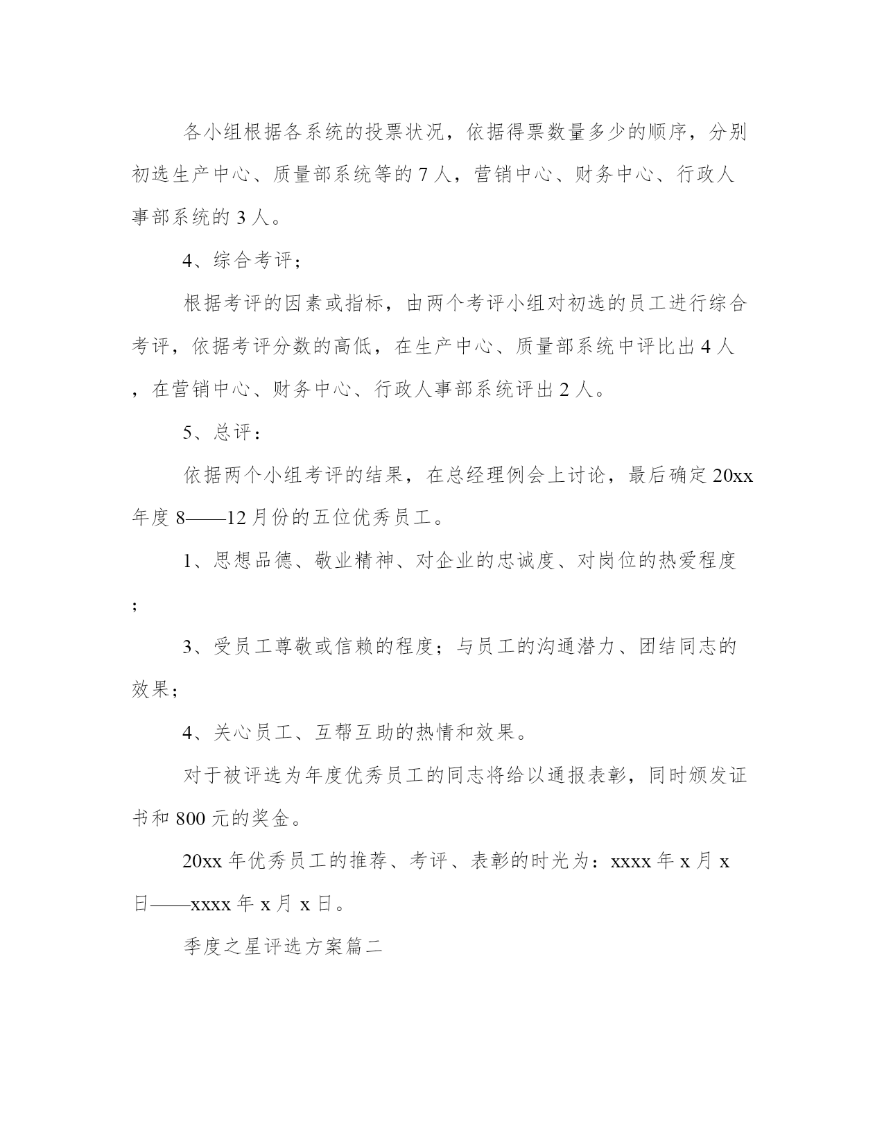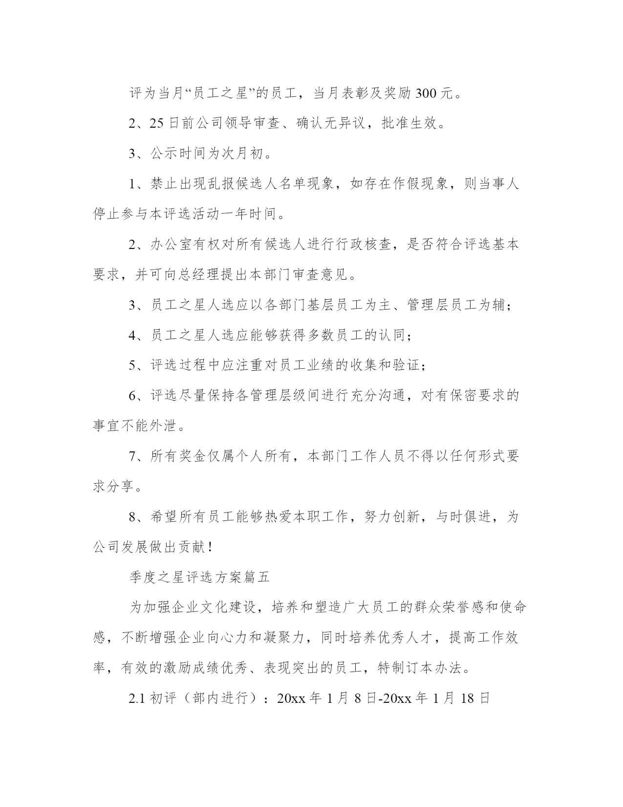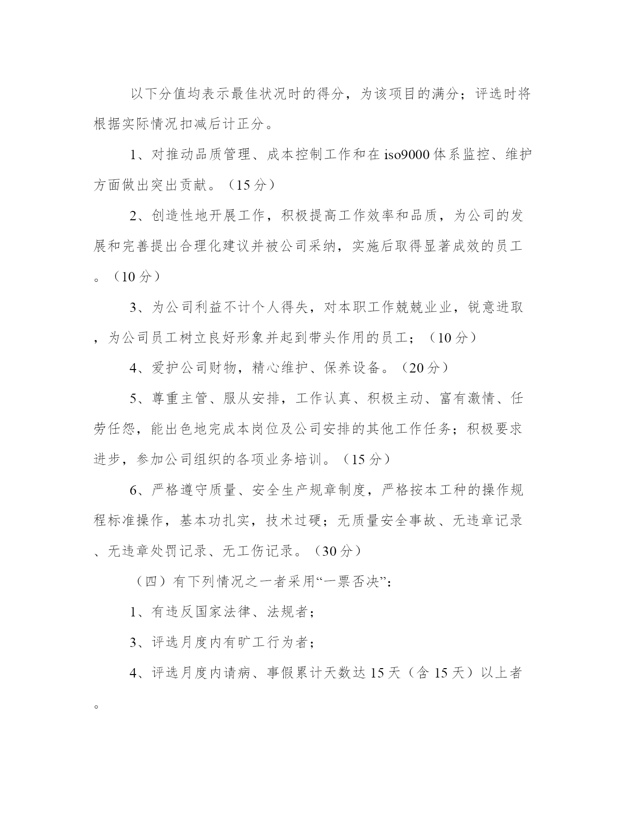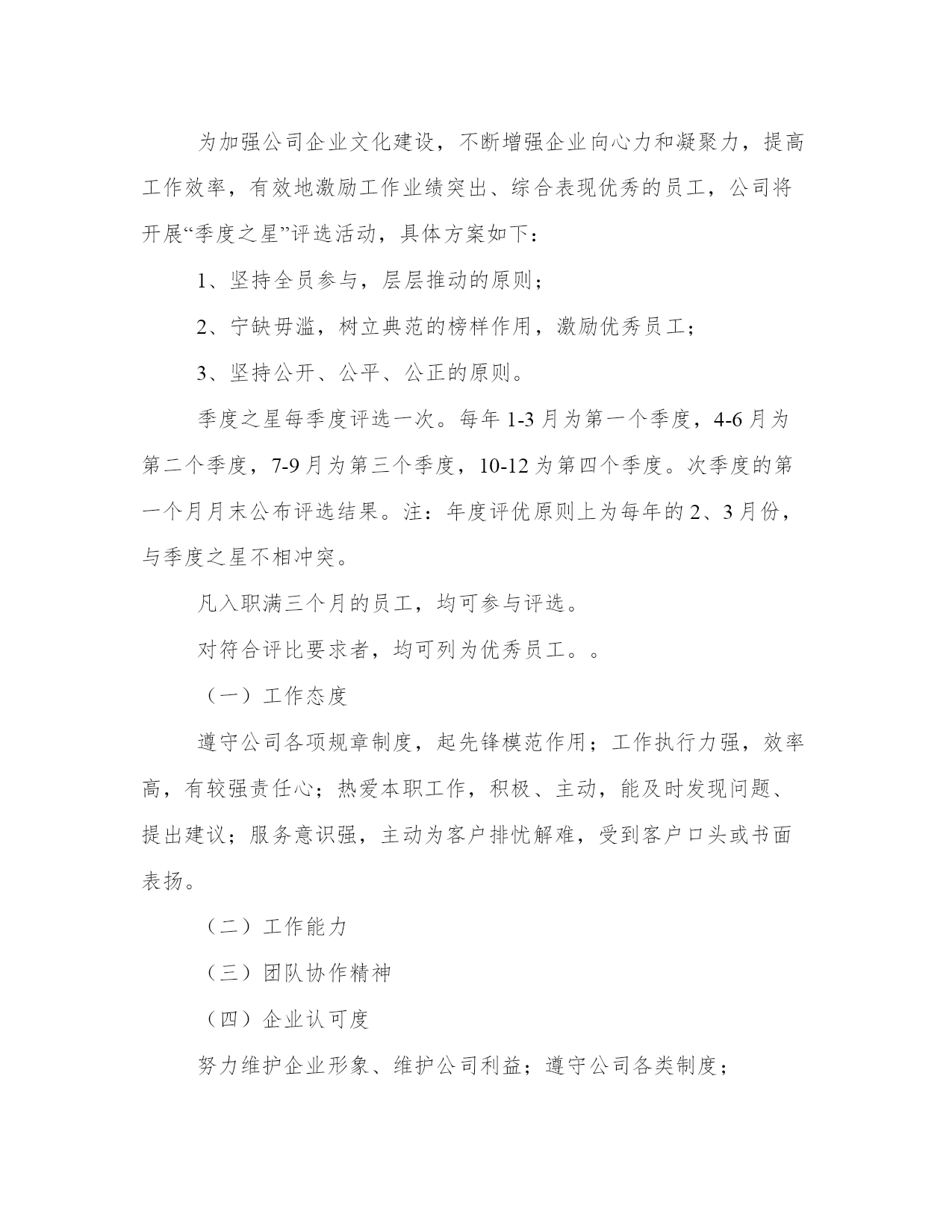最热季度之星评选方案(案例14篇)方案的制定需要充分的调研和分析,了解问题的本质和背景才能找到最佳解决方案。一个有效的方案应该具有合理的时间安排和优先级排序。这些范文不仅局限于某个领域,适用于各行各业的方案制定。季度之星评选方案篇一为了弘扬我公司的企业精神,展现我公司优秀员工的风采,构成人人争当先进、人人争为公司的发展做贡献的良好氛围,公司决定今后每年开展评选“十位优秀员工”的活动。根据公司五个系统的特征和员工岗位的多重性,为了体现和增强评选的先进性、代表性、权威性,我们采取的方法是:先由基层推荐,然后分生产中心、质量部等系统和营销中心、财务中心、行政人事部等系统的两大系统进行初选、由对应两个考评小组分别进行初评,最后经总经理例会讨论确定。1、成立两个考评小组:2、基层推荐:采取无记名方式投票、推荐,每位员工需推荐本部门员工一名,同时推荐本系统其他部门员工一名。3、初选:各小组根据各系统的投票状况,依据得票数量多少的顺序,分别初选生产中心、质量部系统等的7人,营销中心、财务中心、行政人事部系统的3人。4、综合考评;根据考评的因素或指标,由两个考评小组对初选的员工进行综合考评,依据考评分数的高低,在生产中心、质量部系统中评比出4人,在营销中心、财务中心、行政人事部系统评出2人。5、总评:依据两个小组考评的结果,在总经理例会上讨论,最后确定20xx年度8——12月份的五位优秀员工。1、思想品德、敬业精神、对企业的忠诚度、对岗位的热爱程度;3、受员工尊敬或信赖的程度;与员工的沟通潜力、团结同志的效果;4、关心员工、互帮互助的热情和效果。对于被评选为年度优秀员工的同志将给以通报表彰,同时颁发证书和800元的奖金。20xx年优秀员工的推荐、考评、表彰的时光为:xxxx年x月x日——xxxx年x月x日。季度之星评选方案篇二为加强公司企业文化建设,不断增强企业向心力和凝聚力,提高工作效率,有效地激励工作业绩突出、综合表现优秀的员工,公司将开展“季度之星”评选活动,具体方案如下:1、坚持全员参与,层层推动的原则;2、宁缺毋滥,树立典范的榜样作用,激励优秀员工;3、坚持公开、公平、公正的原则。季度之星每季度评选一次。每年1-3月为第一个季度,4-6月为第二个季度,7-9月为第三个季度,10-12为第四个季度。次季度的第一个月月末公布评选结果。注:年度评优原则上为每年的2、3月份,与季度之星不相冲突。凡入职满三个月的员工,均可参与评选。对符合评比要求者,均可列为优秀员工。。(一)工作态度遵守公司各项规章制度,起先锋模范作用;工作执行力强,效率高,有较强责任心;热爱本职工作,积极、主动,能及时发现问题、提出建议;服务意识强,主动为客户排忧解难,受到客户口头或书面表扬。(二)工作能力(三)团队协作精神(四)企业认可度努力维护企业形象、维护公司利益;遵守公司各类制度;采用自荐、他荐、领导推荐的方法,拟定“季度之星”候选人名单6、员工优秀事迹报道、嘉奖等(次季度第一个月末完成)。具体事项由人力资源部负责组织实施。2、获得“季度之星”的员工,将作为年终个人评比先进的依据;总经办根据公示情况确定入选名单并予以奖励:给予每人300元现金奖励。本办法于20xx年10月1日起实施。季度之星评选方案篇三为了更加全面了解、评价公司员工的工作成绩,提高工作效率,提倡公司向上的`风气,有效地激励表现优秀的员工并树立公司模范,从而提高企业管理和精神文明建设水平,完成公司下达的各项任务指标,树立全心全意争创一流的竞争意识,充分调动广大职工的积极性和创造性,特制订本方案。“优秀员工奖”尽量控制在5%比例内。1、优秀员工奖候选人推荐办法此次评选按工作实际出发,以“民主、公开、公平”为原则,采取班组推荐为主、个人自荐与主管推荐为辅相结合的办法。2)个人自荐的,必须有5名以上员工联名推荐并由推荐人签字确认,推荐人签名指标只能使用2次,超过无效。2、优秀员工评选程序评选工作由办公室负责牵头组织,以各部门为单位对本部门员工评选推荐,要求各部门在总结员工工作的基础上,注重实际的考核,优中选优,切实按照评选条件进行公平、公正评选,确保优秀员工得到应有荣誉。推荐上来的`候选人通过部门负责人筛选填写优秀员工推荐表上报总经理办公室进行汇总;经公司司务会议讨论确定获奖名单。参加评选对象:需在公司任职时间一年以上的员工(高层干部及部门负责人不参与公司优秀员工评选)参加评选基本条件,具备以下全部条件者可参与公司优秀员工评选:1、遵纪守法,遵守公司各项规章制度,无旷工、迟到、早退现象,无违法乱纪行为,评选期内,无因违反纪律而受到公司处罚或通报批评。2、遵守考勤纪律,连续2个月满勤,请假总天数少于15天,其中病