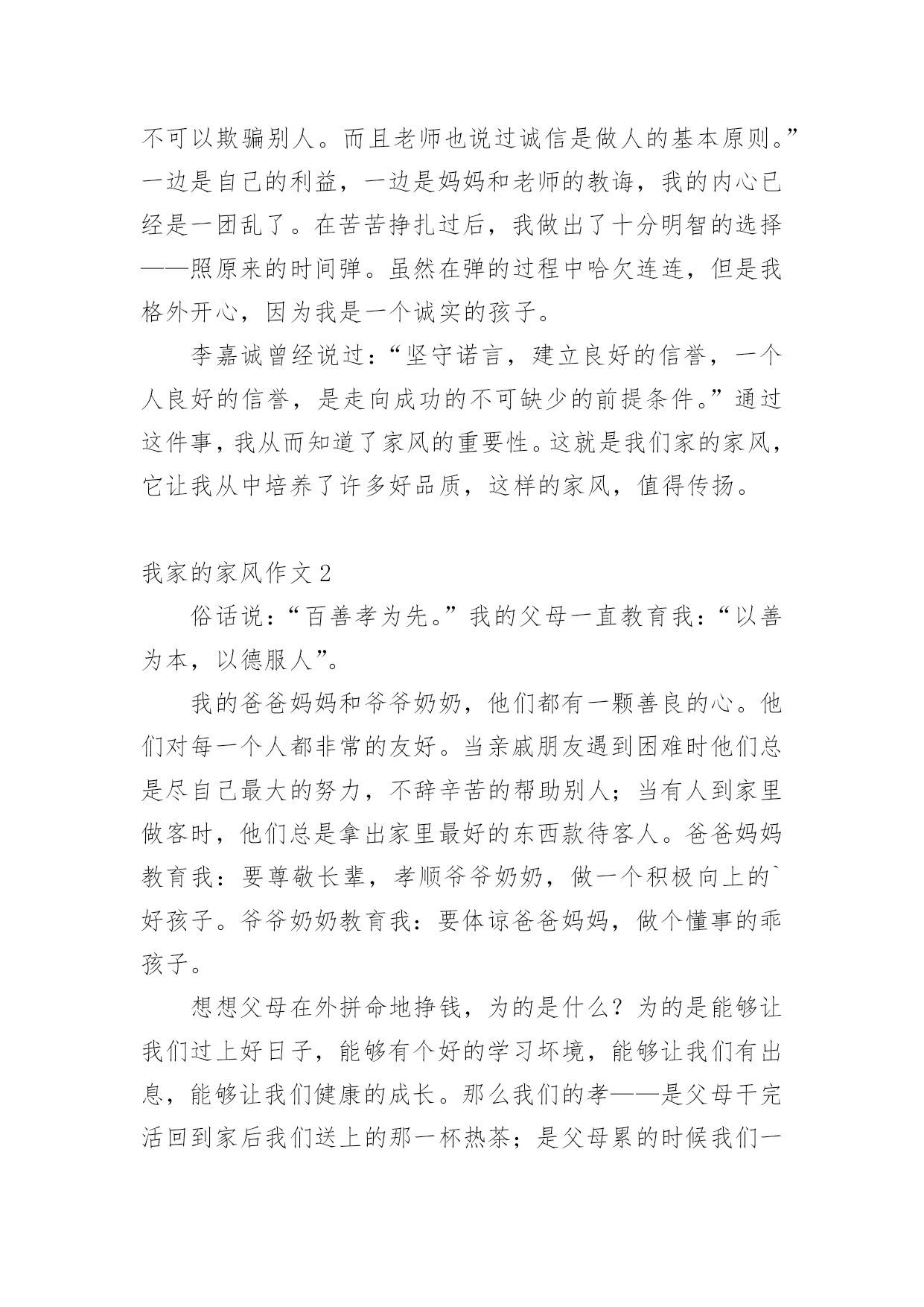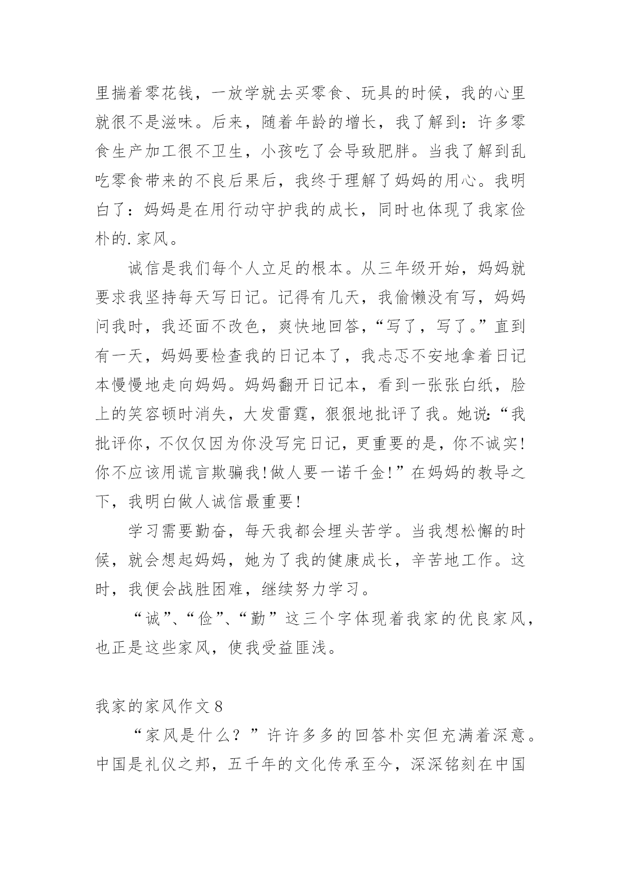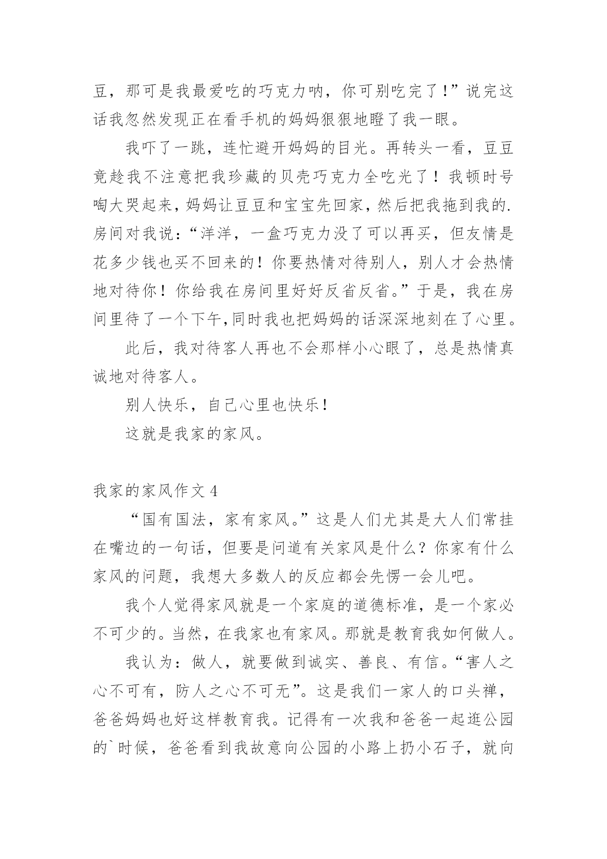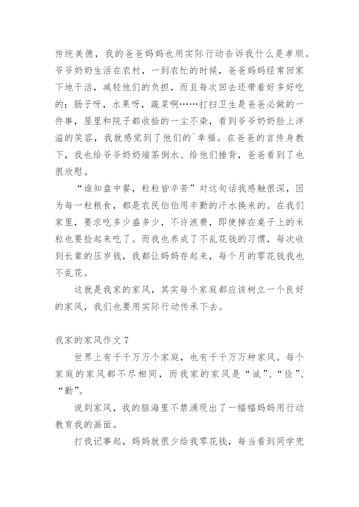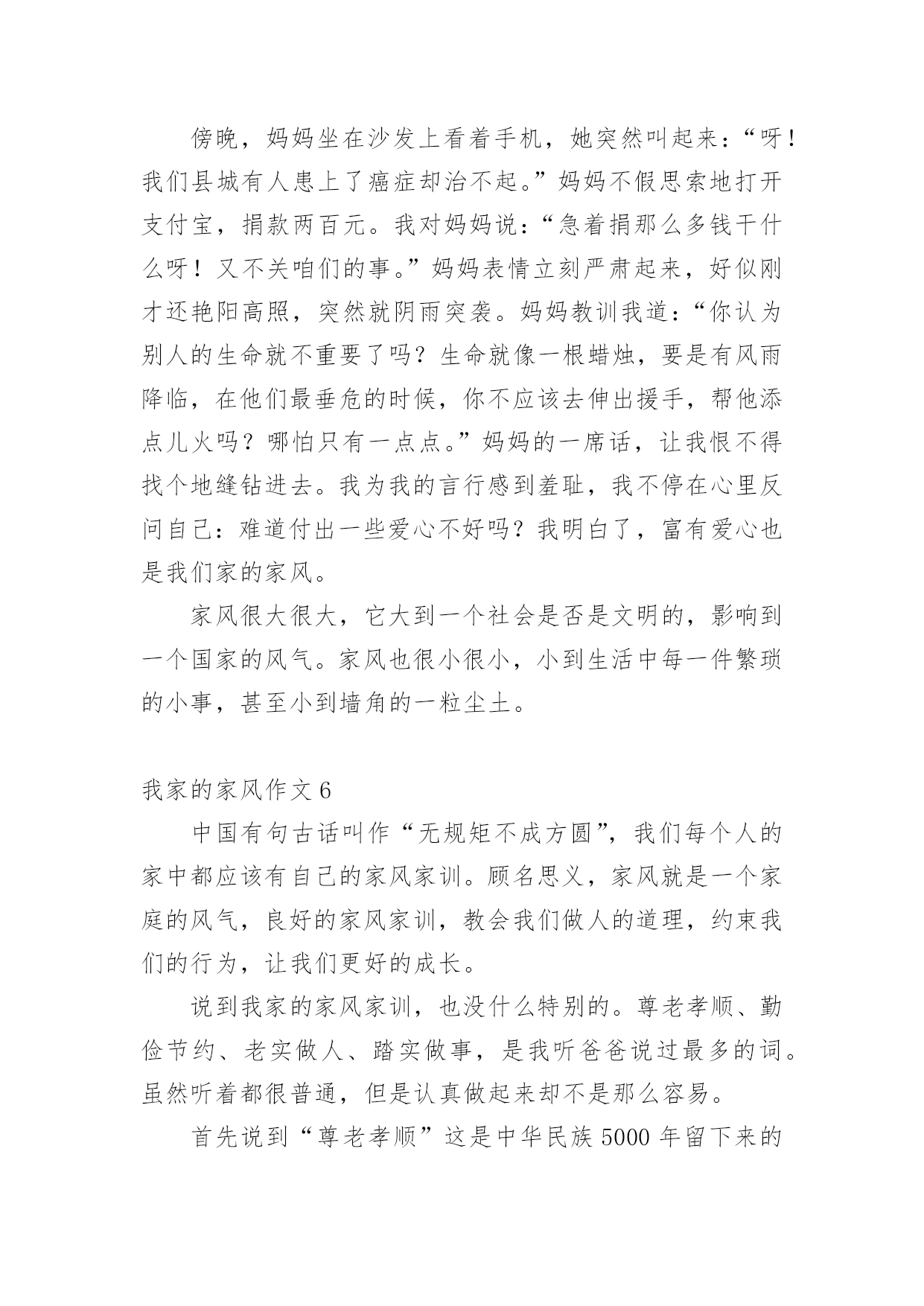 我家的家风作文[实用]我家的家风作文在日常学习、工作和生活中,大家都跟作文打过交道吧,作文是由文字组成,经过人的思想考虑,通过语言组织来表达一个主题意义的文体。为了让您在写作文时更加简单方便,以下是小编为大家整理的我家的家风作文,仅供参考,欢迎大家阅读。我家的家风作文1每个家庭都有自己的家风,有的信奉孝敬之风,有的突出学习之风,有的展现勤劳之风,有的倡导节俭之风。正所谓家风,就是一个家庭的好习惯、风气,指的是一个家庭的所有人遵守的生活习惯。在我家里,也有家风。它教会了我如何做一个诚实守信的人。妈妈经常教育我要做一个诚实的人。记得有一个晚上,作业非常多,做到九点还没有做完,而且我还要完成一项十分艰巨的任务——弹古筝。在考级的来临之际,我每天都要和时间赛跑,不断地练习。奋斗多时,我终于把作业做完了。但一抬头看到了眼前的`古筝,心一下子又凉了。毕竟要接受现实,我只好“恭敬不如从命”了。刚刚开始弹,我那不争气的眼皮就在打架了。这时,我的心里突然蹦出了一个想法:我可以偷工减料,少弹二十分钟,反正妈妈也不知道。但是心中的另一个自己说道:“妈妈教导我待人要诚实守信,不可以欺骗别人。而且老师也说过诚信是做人的基本原则。”一边是自己的利益,一边是妈妈和老师的教诲,我的内心已经是一团乱了。在苦苦挣扎过后,我做出了十分明智的选择——照原来的时间弹。虽然在弹的过程中哈欠连连,但是我格外开心,因为我是一个诚实的孩子。李嘉诚曾经说过:“坚守诺言,建立良好的信誉,一个人良好的信誉,是走向成功的不可缺少的前提条件。”通过这件事,我从而知道了家风的重要性。这就是我们家的家风,它让我从中培养了许多好品质,这样的家风,值得传扬。我家的家风作文2俗话说:“百善孝为先。”我的父母一直教育我:“以善为本,以德服人”。我的爸爸妈妈和爷爷奶奶,他们都有一颗善良的心。他们对每一个人都非常的友好。当亲戚朋友遇到困难时他们总是尽自己最大的努力,不辞辛苦的帮助别人;当有人到家里做客时,他们总是拿出家里最好的东西款待客人。爸爸妈妈教育我:要尊敬长辈,孝顺爷爷奶奶,做一个积极向上的`好孩子。爷爷奶奶教育我:要体谅爸爸妈妈,做个懂事的乖孩子。想想父母在外拼命地挣钱,为的是什么?为的是能够让我们过上好日子,能够有个好的学习坏境,能够让我们有出息,能够让我们健康的成长。那么我们的孝——是父母干完活回到家后我们送上的那一杯热茶;是父母累的时候我们一句安慰的话;是父母晚上回家后我们端上的洗脚水;是让父母不断看到我们成绩的进步;是我们能够健康的成长,有一个健康的身体。放学回家,我看见奶奶正在吃力的搬东西,便过去帮忙,奶奶向我满意的笑了一笑,其实啊!老人也需要爱护,晚上,我看见爸爸正在工作,爸爸亲切的拍了拍我的肩膀,其实啊!爸爸也需要别人的关心。妈妈给我织了一件毛衣,我高兴地穿在身上,连连说:“真好看,真好看,妈妈可真是心灵手巧啊!妈妈欣慰的笑了,其实啊!妈妈也需要别人的赞美。孝是一种美德,我一定要铭记着我的家风,孝敬父母,尊敬师长,为自己的人生奠定坚定的基础,踏出坚定的步伐,成为国家的栋梁之才!我家的家风作文3大多数人家里都有家风,我家当然也不例外。所谓家风,就是一个家庭传承以久的规矩,或者说是长辈对你最常说的一句话。要看一个人人品如何,首先就要看他家的家风。我家的家风就是:待人热情。这是我妈妈对我最常说一句话,所以我们家时时刻刻都充满了欢乐。有一次,我招呼我的小伙伴豆豆和宝宝到我家里来玩。那时候我还很小,不懂事,也不管他们爱不爱玩,就把一盒《大富翁》拿出来一起玩。玩着玩着,豆豆便到我的零食柜里翻找零食。当他把我珍藏的贝壳巧克力翻出来时,我有些舍不得,就对他说:“豆豆,那可是我最爱吃的巧克力呐,你可别吃完了!”说完这话我忽然发现正在看手机的妈妈狠狠地瞪了我一眼。我吓了一跳,连忙避开妈妈的目光。再转头一看,豆豆竟趁我不注意把我珍藏的贝壳巧克力全吃光了!我顿时号啕大哭起来,妈妈让豆豆和宝宝先回家,然后把我拖到我的.房间对我说:“洋洋,一盒巧克力没了可以再买,但友情是花多少钱也买不回来的!你要热情对待别人,别人才会热情地对待你!你给我在房间里好好反省反省。”于是,我在房间里待了一个下午,同时我也把妈妈的话深深地刻在了心里。此后,我对待客人再也不会那样小心眼了,总是热情真诚地对待客人。别人快乐,自己心里也快乐!这就是我家的家风。我家的家风作文4“国有国法,家有家风。”这是人们尤其是大人们常挂在嘴边的一句话,但要是问道有关家风是什么?你家有什么家风的问题,我想大多数人的反应都会先愣一会儿吧。我个人觉得家风就是一个家庭的道德标准,是一个家必不可少的。当然,在我家也有家风。那就是教育我如何做人。我认为:做人,就要做到诚实、善良、有信。“害人之心不可有,防人之心不可无”。这是我们一家人的口头禅,爸爸妈妈也好这
