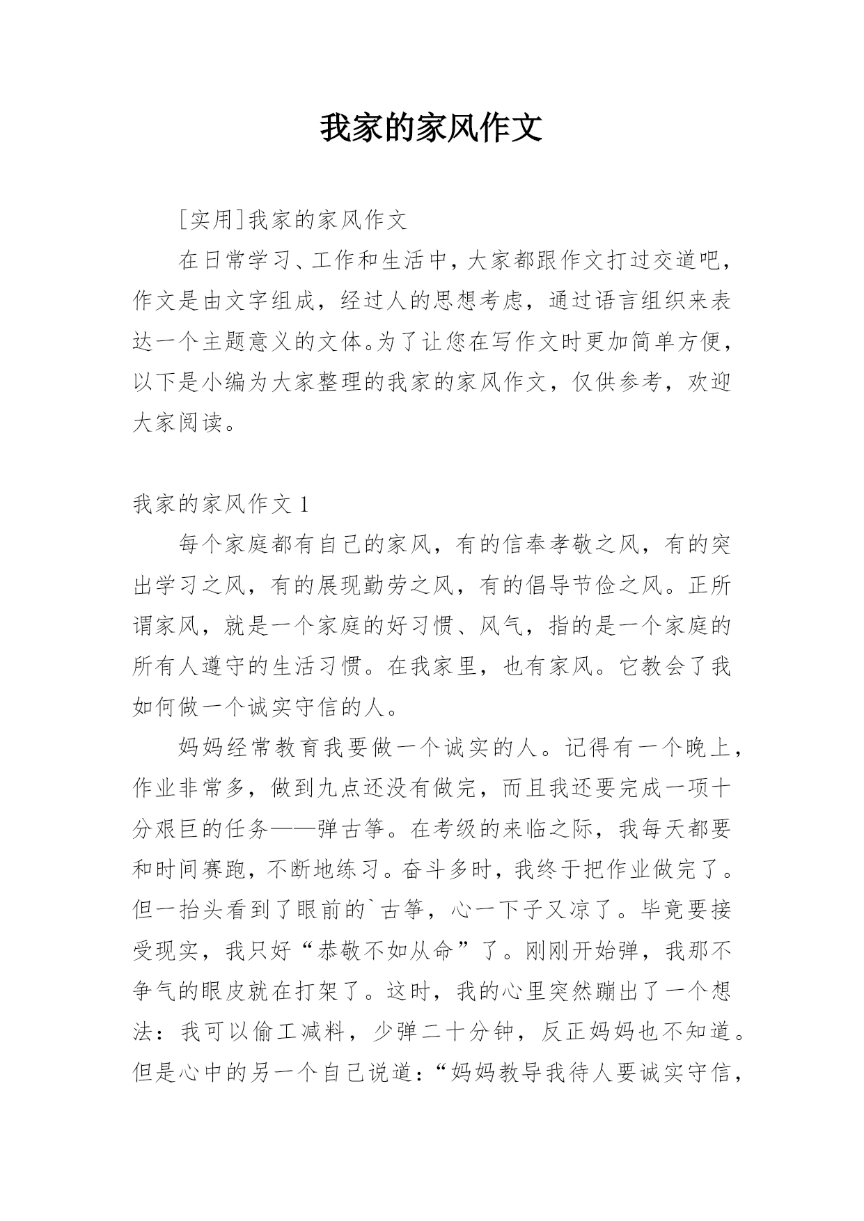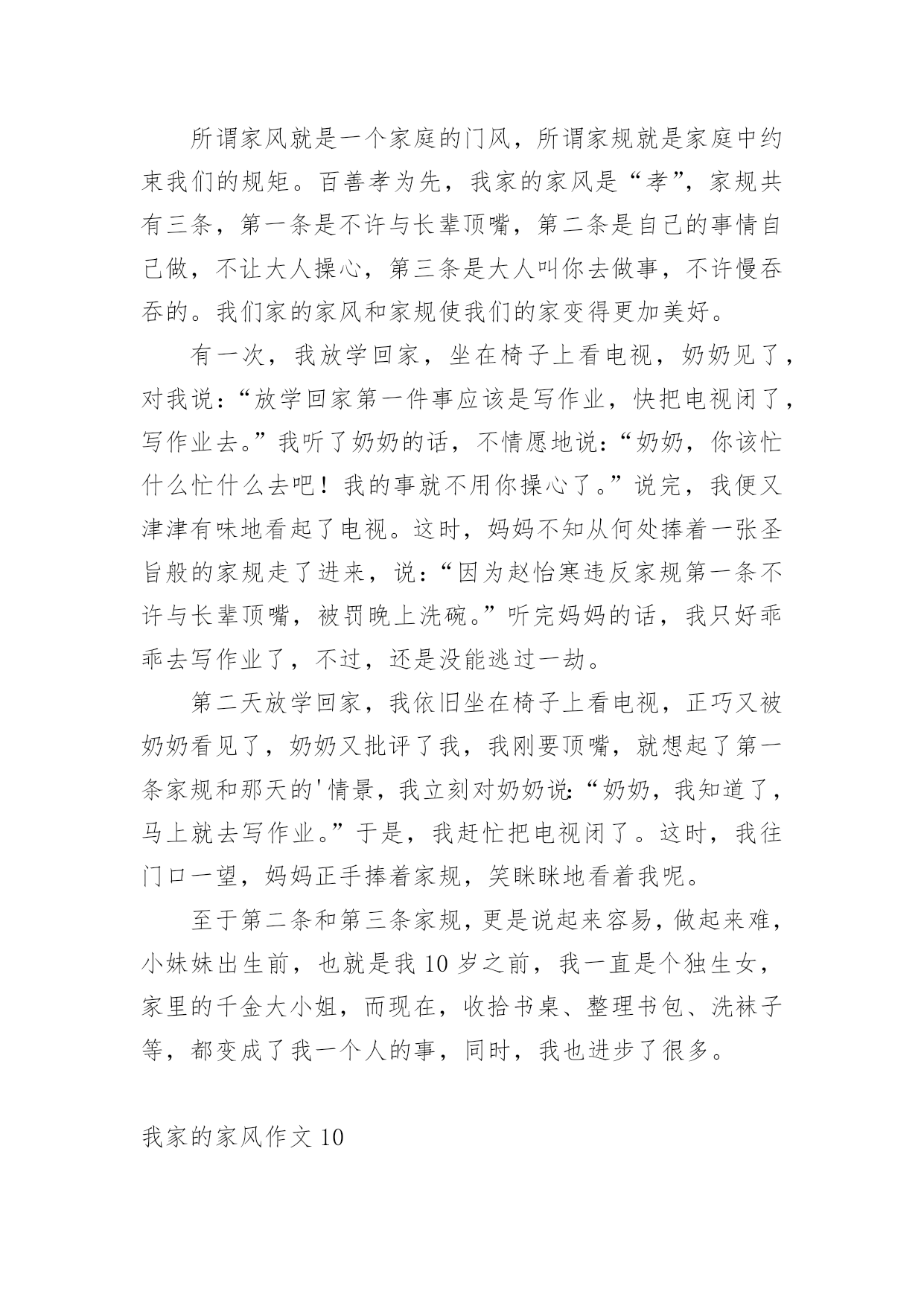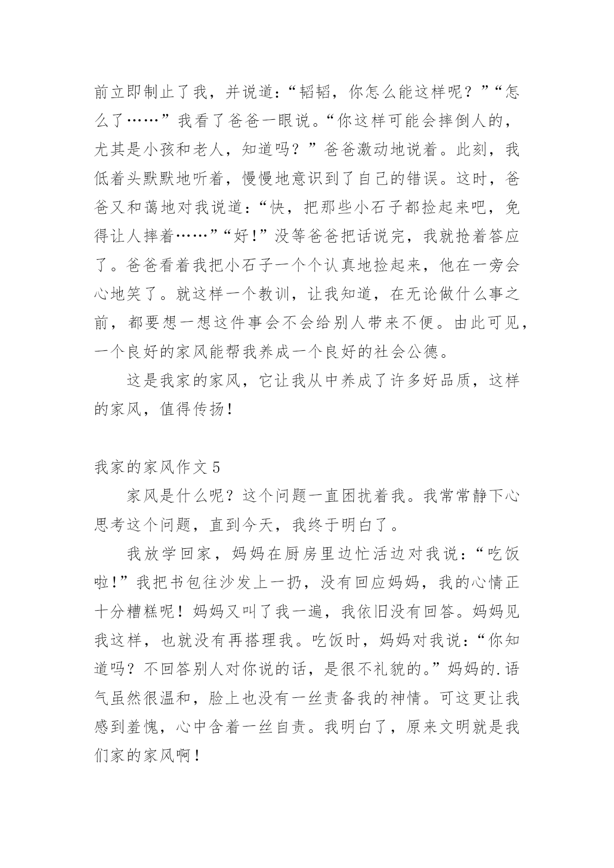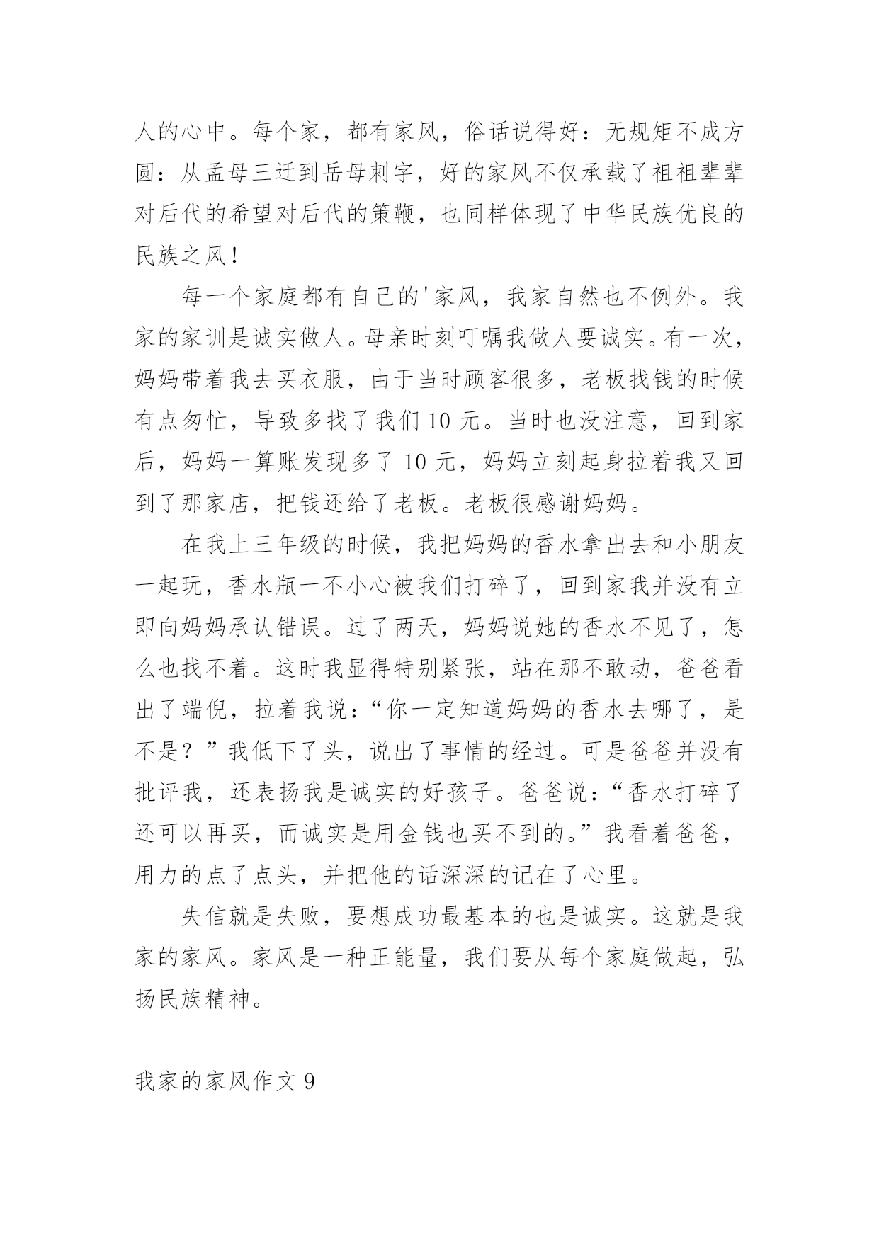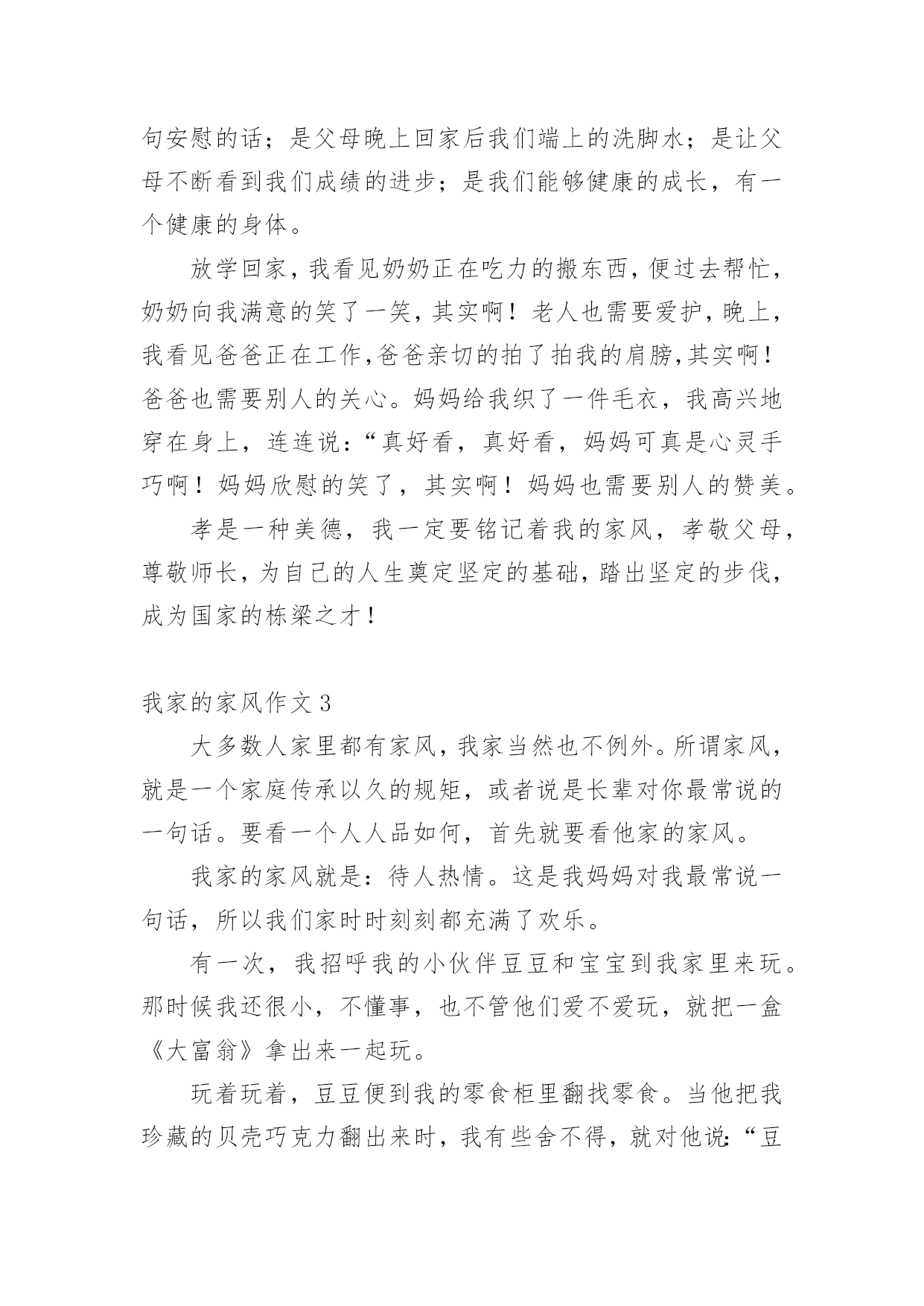我家的家风作文[实用]我家的家风作文在日常学习、工作和生活中,大家都跟作文打过交道吧,作文是由文字组成,经过人的思想考虑,通过语言组织来表达一个主题意义的文体。为了让您在写作文时更加简单方便,以下是小编为大家整理的我家的家风作文,仅供参考,欢迎大家阅读。我家的家风作文1每个家庭都有自己的家风,有的信奉孝敬之风,有的突出学习之风,有的展现勤劳之风,有的倡导节俭之风。正所谓家风,就是一个家庭的好习惯、风气,指的是一个家庭的所有人遵守的生活习惯。在我家里,也有家风。它教会了我如何做一个诚实守信的人。妈妈经常教育我要做一个诚实的人。记得有一个晚上,作业非常多,做到九点还没有做完,而且我还要完成一项十分艰巨的任务——弹古筝。在考级的来临之际,我每天都要和时间赛跑,不断地练习。奋斗多时,我终于把作业做完了。但一抬头看到了眼前的`古筝,心一下子又凉了。毕竟要接受现实,我只好“恭敬不如从命”了。刚刚开始弹,我那不争气的眼皮就在打架了。这时,我的心里突然蹦出了一个想法:我可以偷工减料,少弹二十分钟,反正妈妈也不知道。但是心中的另一个自己说道:“妈妈教导我待人要诚实守信,不可以欺骗别人。而且老师也说过诚信是做人的基本原则。”一边是自己的利益,一边是妈妈和老师的教诲,我的内心已经是一团乱了。在苦苦挣扎过后,我做出了十分明智的选择——照原来的时间弹。虽然在弹的过程中哈欠连连,但是我格外开心,因为我是一个诚实的孩子。李嘉诚曾经说过:“坚守诺言,建立良好的信誉,一个人良好的信誉,是走向成功的不可缺少的前提条件。”通过这件事,我从而知道了家风的重要性。这就是我们家的家风,它让我从中培养了许多好品质,这样的家风,值得传扬。我家的家风作文2俗话说:“百善孝为先。”我的父母一直教育我:“以善为本,以德服人”。我的爸爸妈妈和爷爷奶奶,他们都有一颗善良的心。他们对每一个人都非常的友好。当亲戚朋友遇到困难时他们总是尽自己最大的努力,不辞辛苦的帮助别人;当有人到家里做客时,他们总是拿出家里最好的东西款待客人。爸爸妈妈教育我:要尊敬长辈,孝顺爷爷奶奶,做一个积极向上的`好孩子。爷爷奶奶教育我:要体谅爸爸妈妈,做个懂事的乖孩子。想想父母在外拼命地挣钱,为的是什么?为的是能够让我们过上好日子,能够有个好的学习坏境,能够让我们有出息,能够让我们健康的成长。那么我们的孝——是父母干完活回到家后我们送上的那一杯热茶;是父母累的时候我们一句安慰的话;是父母晚上回家后我们端上的洗脚水;是让父母不断看到我们成绩的进步;是我们能够健康的成长,有一个健康的身体。放学回家,我看见奶奶正在吃力的搬东西,便过去帮忙,奶奶向我满意的笑了一笑,其实啊!老人也需要爱护,晚上,我看见爸爸正在工作,爸爸亲切的拍了拍我的肩膀,其实啊!爸爸也需要别人的关心。妈妈给我织了一件毛衣,我高兴地穿在身上,连连说:“真好看,真好看,妈妈可真是心灵手巧啊!妈妈欣慰的笑了,其实啊!妈妈也需要别人的赞美。孝是一种美德,我一定要铭记着我的家风,孝敬父母,尊敬师长,为自己的人生奠定坚定的基础,踏出坚定的步伐,成为国家的栋梁之才!我家的家风作文3大多数人家里都有家风,我家当然也不例外。所谓家风,就是一个家庭传承以久的规矩,或者说是长辈对你最常说的一句话。要看一个人人品如何,首先就要看他家的家风。我家的家风就是:待人热情。这是我妈妈对我最常说一句话,所以我们家时时刻刻都充满了欢乐。有一次,我招呼我的小伙伴豆豆和宝宝到我家里来玩。那时候我还很小,不懂事,也不管他们爱不爱玩,就把一盒《大富翁》拿出来一起玩。玩着玩着,豆豆便到我的零食柜里翻找零食。当他把我珍藏的贝壳巧克力翻出来时,我有些舍不得,就对他说:“豆豆,那可是我最爱吃的巧克力呐,你可别吃完了!”说完这话我忽然发现正在看手机的妈妈狠狠地瞪了我一眼。我吓了一跳,连忙避开妈妈的目光。再转头一看,豆豆竟趁我不注意把我珍藏的贝壳巧克力全吃光了!我顿时号啕大哭起来,妈妈让豆豆和宝宝先回家,然后把我拖到我的.房间对我说:“洋洋,一盒巧克力没了可以再买,但友情是花多少钱也买不回来的!你要热情对待别人,别人才会热情地对待你!你给我在房间里好好反省反省。”于是,我在房间里待了一个下午,同时我也把妈妈的话深深地刻在了心里。此后,我对待客人再也不会那样小心眼了,总是热情真诚地对待客人。别人快乐,自己心里也快乐!这就是我家的家风。我家的家风作文4“国有国法,家有家风。”这是人们尤其是大人们常挂在嘴边的一句话,但要是问道有关家风是什么?你家有什么家风的问题,我想大多数人的反应都会先愣一会儿吧。我个人觉得家风就是一个家庭的道德标准,是一个家必不可少的。当然,在我家也有家风。那就是教育我如何做人。我认为:做人,就要做到诚实、善良、有信。“害人之心不可有,防人之心不可无”。这是我们一家人的口头禅,爸爸妈妈也好这