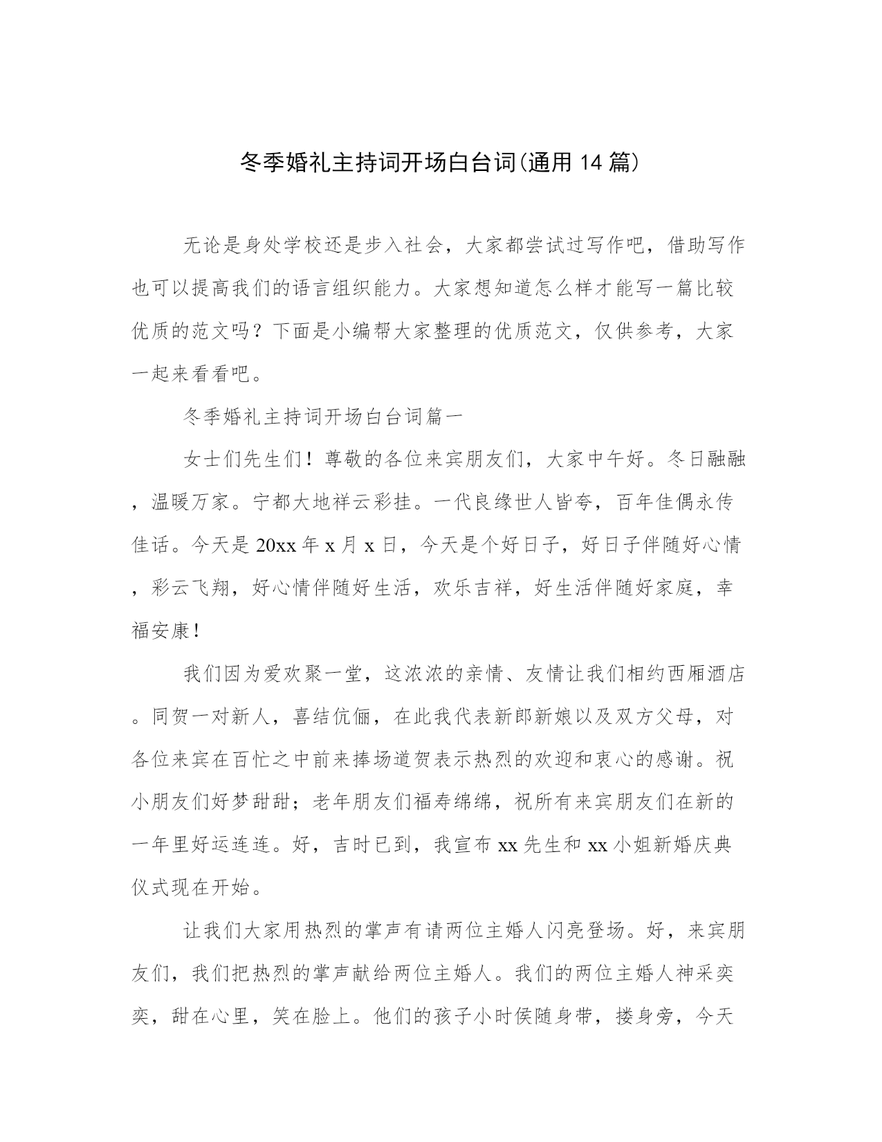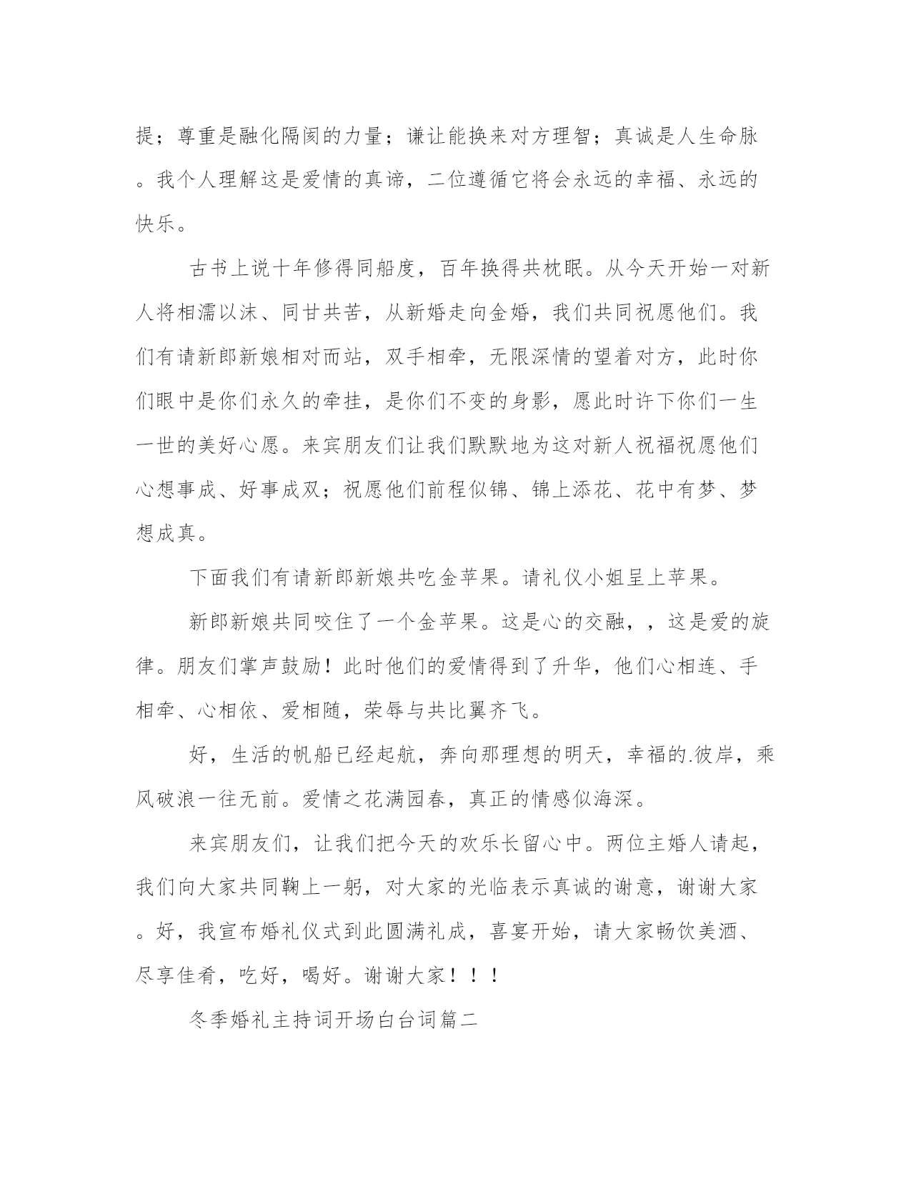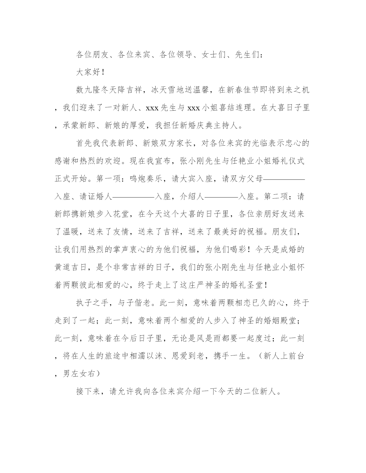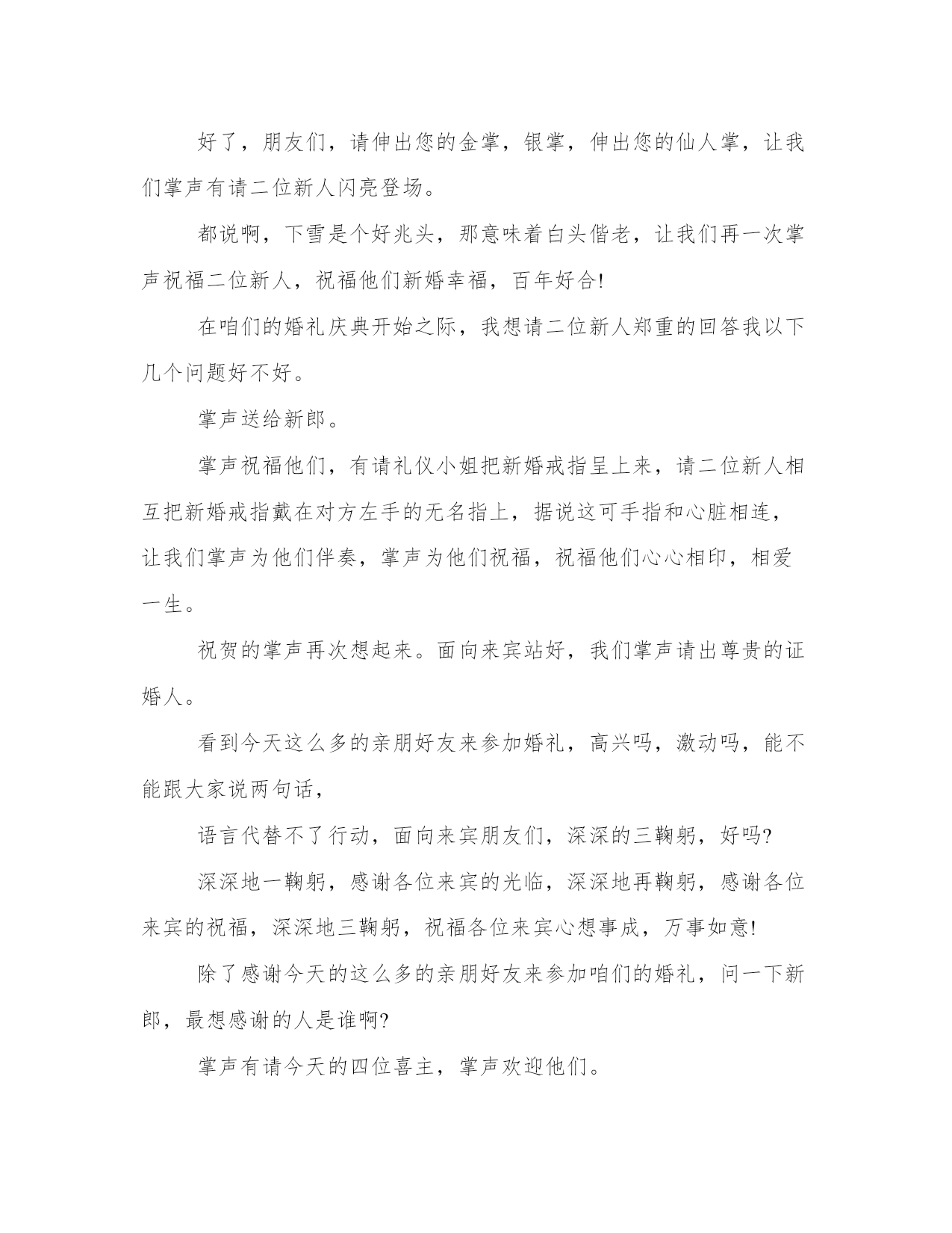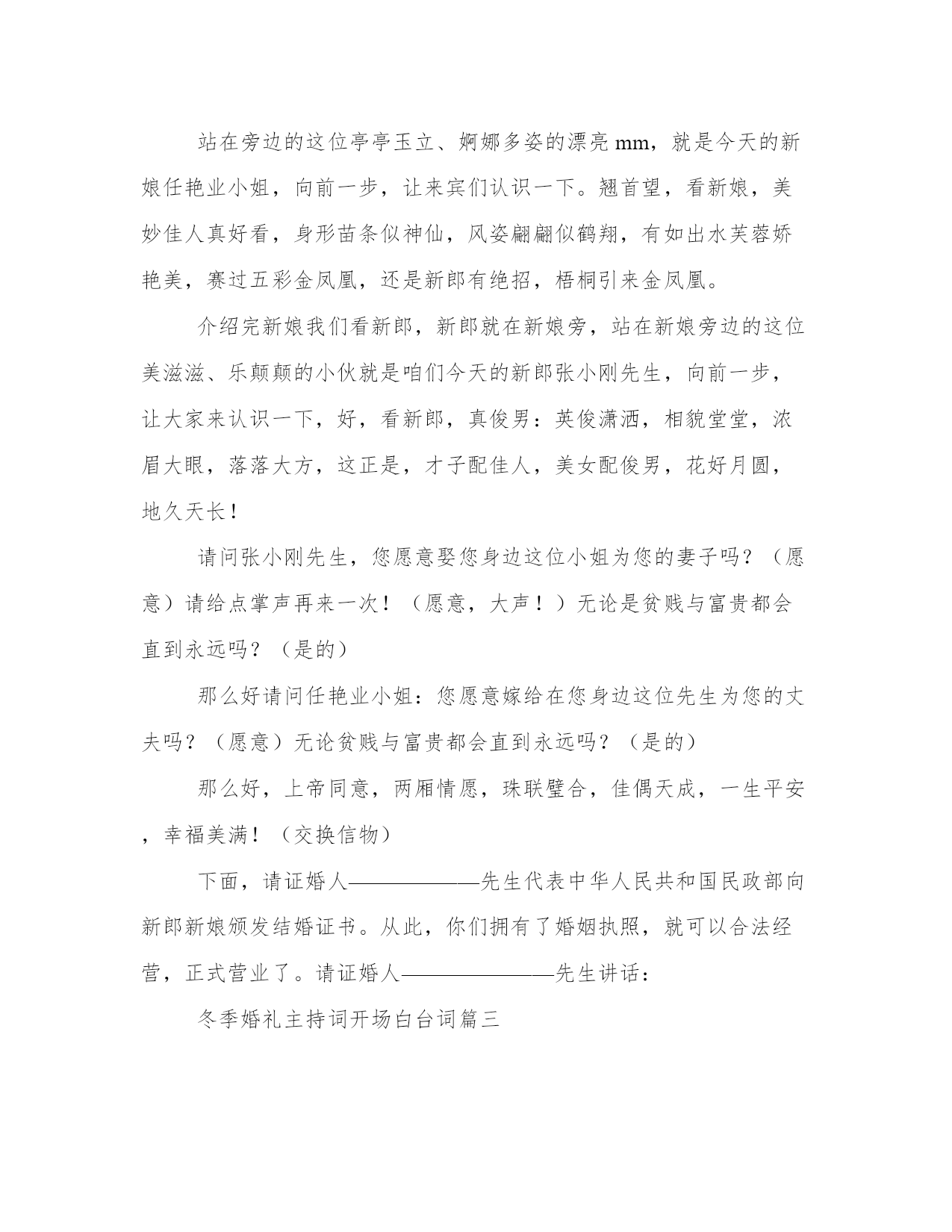 冬季婚礼主持词开场白台词(通用14篇)无论是身处学校还是步入社会,大家都尝试过写作吧,借助写作也可以提高我们的语言组织能力。大家想知道怎么样才能写一篇比较优质的范文吗?下面是小编帮大家整理的优质范文,仅供参考,大家一起来看看吧。冬季婚礼主持词开场白台词篇一女士们先生们!尊敬的各位来宾朋友们,大家中午好。冬日融融,温暖万家。宁都大地祥云彩挂。一代良缘世人皆夸,百年佳偶永传佳话。今天是20xx年x月x日,今天是个好日子,好日子伴随好心情,彩云飞翔,好心情伴随好生活,欢乐吉祥,好生活伴随好家庭,幸福安康!我们因为爱欢聚一堂,这浓浓的亲情、友情让我们相约西厢酒店。同贺一对新人,喜结伉俪,在此我代表新郎新娘以及双方父母,对各位来宾在百忙之中前来捧场道贺表示热烈的欢迎和衷心的感谢。祝小朋友们好梦甜甜;老年朋友们福寿绵绵,祝所有来宾朋友们在新的一年里好运连连。好,吉时已到,我宣布xx先生和xx小姐新婚庆典仪式现在开始。让我们大家用热烈的掌声有请两位主婚人闪亮登场。好,来宾朋友们,我们把热烈的掌声献给两位主婚人。我们的两位主婚人神采奕奕,甜在心里,笑在脸上。他们的孩子小时侯随身带,搂身旁,今天长大了,结婚了,这多么富有成就感,我建议大家用热烈的掌声,给两位喜东道喜了。好,两位请坐。来宾朋友们,激动人心的时刻到来了。让我们共同倒计时,来迎接这激动人心的时刻:5、4、3、2、1,青春将在这里展现,浪漫将在这里回荡!来宾朋友们,热烈的掌声响起来,我们有请新郎新娘步入婚礼殿堂。爱情成就幸福路,幸福路上迎新人。他们像鸳鸯戏水,又似彩蝶纷飞,含情默默,暗送秋波,今天他们终于走到了一起,爱到了一起,让我们把热烈的掌声献给他们。好,我们的主人公新郎新娘已经漫步来到了台前。大家请看我们的新郎高大威武,英俊潇洒,大家说帅不帅?我们的新娘更是温柔靓丽、秀美端庄,大家说美不美?他们的结合是天作之合、珠联璧合、情投意合、志同道合!接下来,有请新郎新娘共同回答我们一个问题,新郎新娘,从今天开始,你们相濡以沫、相爱如出,永远不离不弃,永远呵护对方、爱护对方,你们愿意吗?有三个答案a愿意,b非常愿意,c非常非常愿意。来宾作证、天地作证,这正是情深谱成连心曲,意合浇开并蒂花,喜看恋人成佳偶,今日共建幸福家。美满姻缘情深意切,和睦家庭地久天长。一拜宾朋接下来呢,我们举行中华民族的传统礼拜仪式,有请新郎新娘向前一步,朋友是天、朋友是地,有了朋友顶天立地;朋友是风、朋友是雨,有了朋友呼风唤雨,我们把这第一拜献给在座的所有亲朋好友,一鞠躬。亲相聚、朋满座,感谢大家来祝贺,二鞠躬;鞠个躬、敬个礼,感谢大家来道喜,朋友们掌声不热烈,是不是新郎新娘鞠躬度数不够,是不是?有请来宾朋友们配合,我们的掌声越热烈,新郎新娘鞠躬度数越深,我们的掌声不停呢,新郎新娘就不起来,大家说好不好?新郎新娘说好不好?三鞠躬,逢喜事、乐开怀,还望大家多往来,谢谢大家。二拜高堂水有源头,树有根,终生难忘父母恩,能有今朝喜庆日,拜谢父母表孝心。请面向父母,父母用勤劳的双手给了我们幸福的家园,是母亲用甘甜的乳汁哺育我们长大。等就等这一天,盼就盼这一刻,为了儿女们的幸福,为了儿女们有一个温馨的小家,做父母的再苦再累也心甘情愿。这父爱比天高、这母爱比地大,父母的恩情儿女们一辈子也难以报答。今天我们不拜天,不拜地,就拜这父母深情厚意。一鞠躬,感谢父母的养育之恩;二鞠躬,感谢父母操办婚事;三鞠躬,祝愿父母大人也祝愿天下所有父亲母亲福寿安康。三对拜在这温馨浪漫的一天,在这激动人心的一刻,一对新人等啊等、盼啊盼,终于瓜熟蒂落、喜结良缘。这就是天赐的甘露换来了金色的收获;练就的琼浆,酿成了甜蜜的生活。接下来,请新郎新娘相对站好,谁鞠躬的度数深呢,就表示对对方的爱越深。一鞠躬,不打架、不拌嘴、不生气、不后悔;二鞠躬,讲道理、明是非、相互信任理解万岁;这三鞠躬一定头碰头,而且要碰出响声来,这是你们夫妻的合声,夫妻头碰头,好事才开头,幸福的日子有奔头。好,向前半步,三鞠躬,爱情之花并蒂开,明年喜得双胞胎。下面,履行我们婚礼的合法手续,有请证婚人为这对新人证婚。感谢证婚人的精彩证婚,请坐!今天在我们的来宾当中呢,有几位是来自我们新娘娘家的的贵宾,是你们的到来使我们的婚宴大厅更加喜气洋洋、喜气生辉。在这里我们再次响起掌声,对你们的到来表示热烈的欢迎。好,我们有请新亲代表新娘的姨夫致辞,大家掌声欢迎。好谢谢,请坐。大家掌声不要停止,有请我们今天的喜东x先生致欢迎词,好谢谢!我想一对新人也一定不辜负长辈们的希望,相亲相爱、白头偕老,学习工作、争分夺秒,尊老爱幼是越过越好。英才成佳偶,祥柳舒心成美景;良缘连两心,喜满人间凤鸾祥。良辰美景最好时,交换信物表忠诚。有请礼仪小姐呈上。好,请向大家展示你们各自为心上