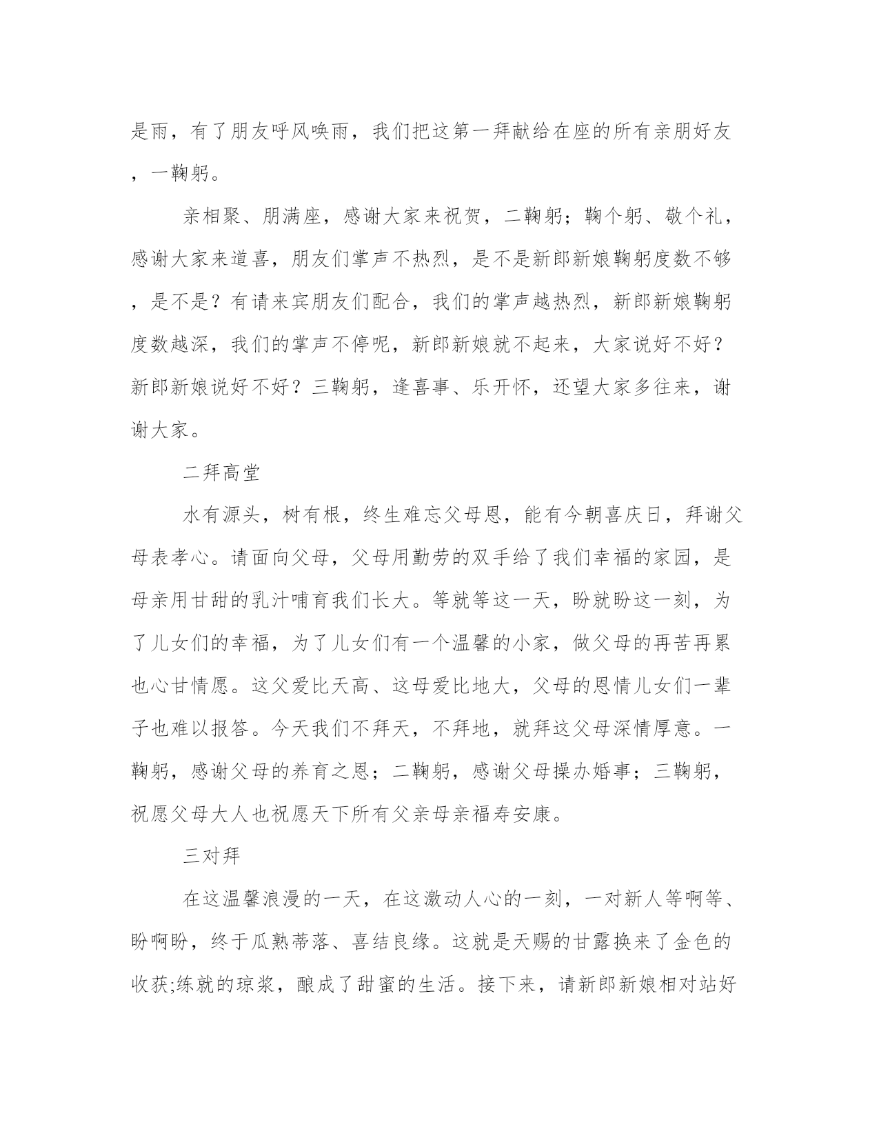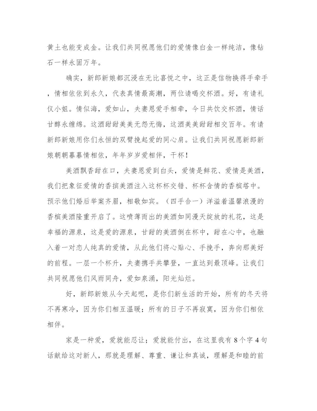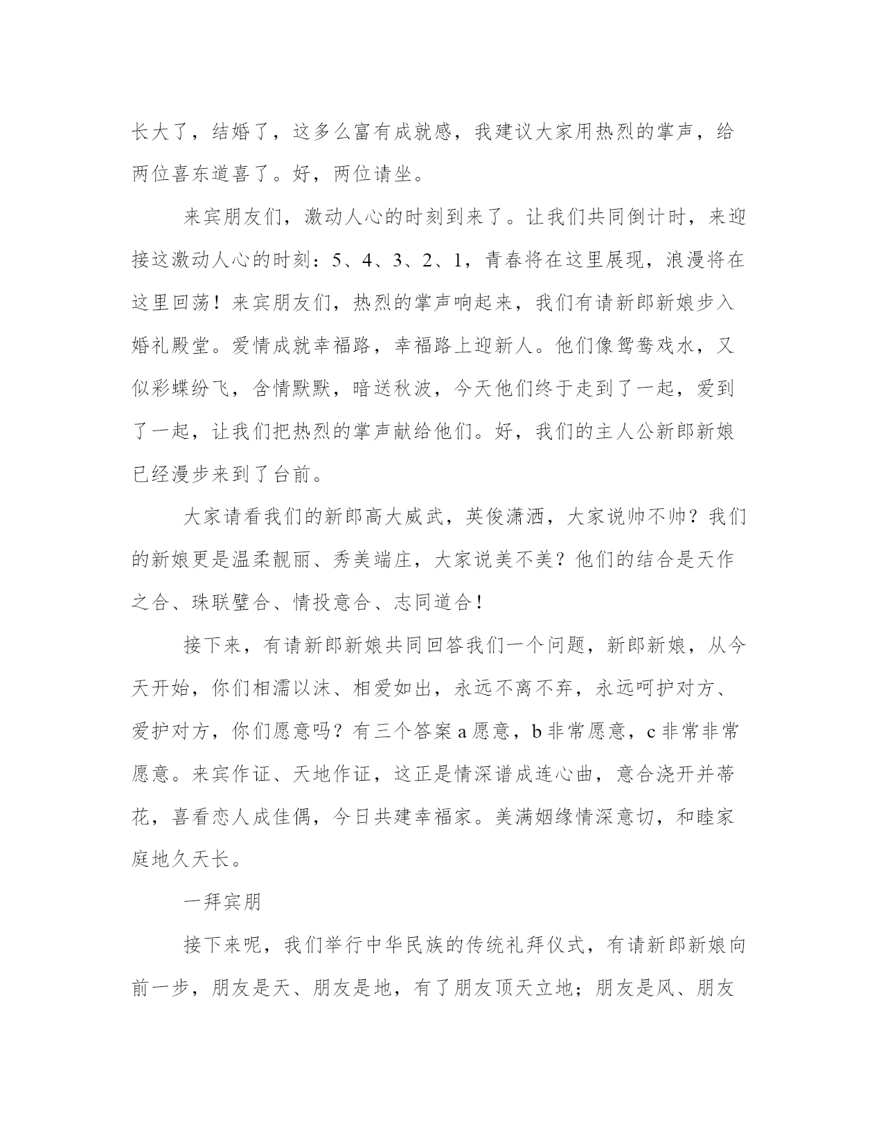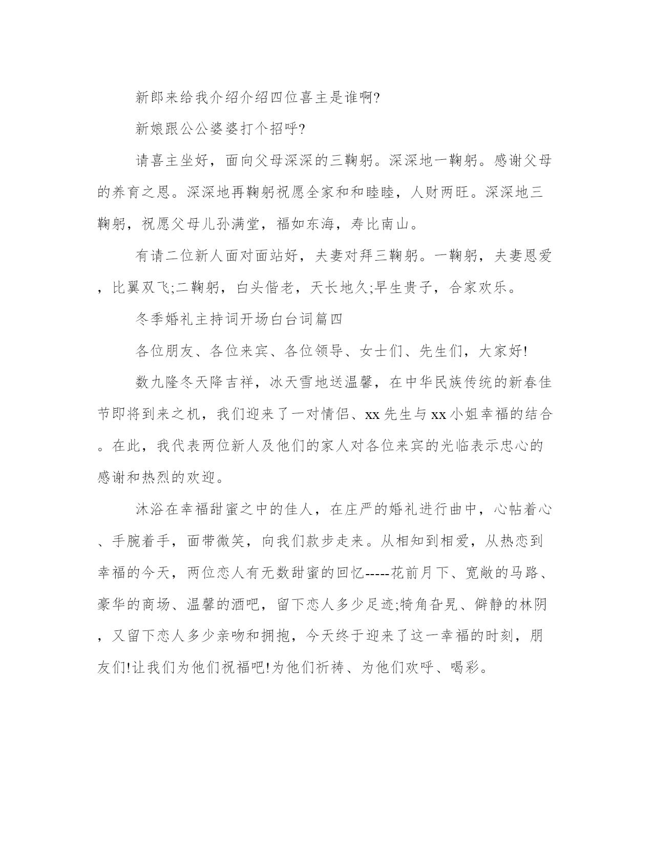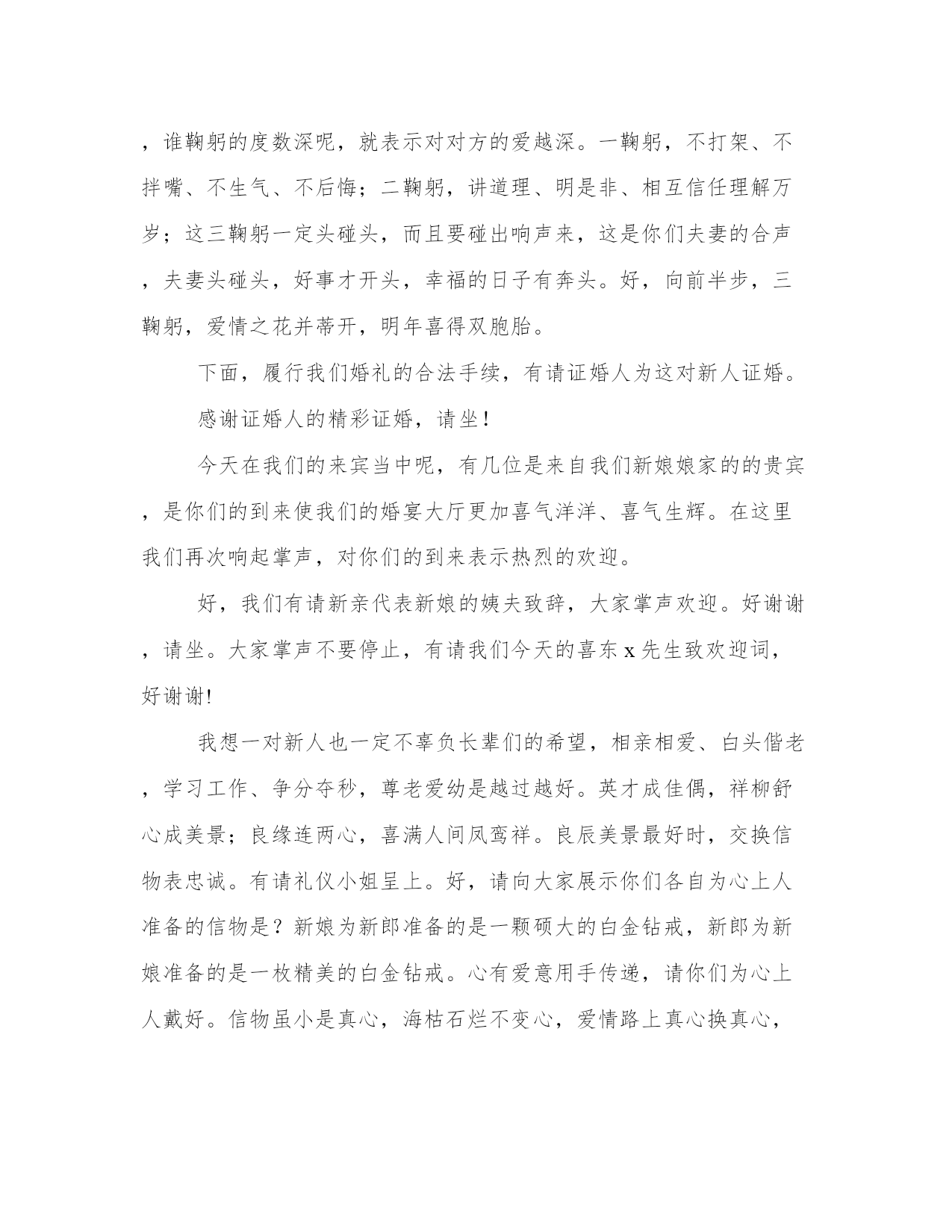 冬季婚礼主持词开场白台词(通用14篇)无论是身处学校还是步入社会,大家都尝试过写作吧,借助写作也可以提高我们的语言组织能力。大家想知道怎么样才能写一篇比较优质的范文吗?下面是小编帮大家整理的优质范文,仅供参考,大家一起来看看吧。冬季婚礼主持词开场白台词篇一女士们先生们!尊敬的各位来宾朋友们,大家中午好。冬日融融,温暖万家。宁都大地祥云彩挂。一代良缘世人皆夸,百年佳偶永传佳话。今天是20xx年x月x日,今天是个好日子,好日子伴随好心情,彩云飞翔,好心情伴随好生活,欢乐吉祥,好生活伴随好家庭,幸福安康!我们因为爱欢聚一堂,这浓浓的亲情、友情让我们相约西厢酒店。同贺一对新人,喜结伉俪,在此我代表新郎新娘以及双方父母,对各位来宾在百忙之中前来捧场道贺表示热烈的欢迎和衷心的感谢。祝小朋友们好梦甜甜;老年朋友们福寿绵绵,祝所有来宾朋友们在新的一年里好运连连。好,吉时已到,我宣布xx先生和xx小姐新婚庆典仪式现在开始。让我们大家用热烈的掌声有请两位主婚人闪亮登场。好,来宾朋友们,我们把热烈的掌声献给两位主婚人。我们的两位主婚人神采奕奕,甜在心里,笑在脸上。他们的孩子小时侯随身带,搂身旁,今天长大了,结婚了,这多么富有成就感,我建议大家用热烈的掌声,给两位喜东道喜了。好,两位请坐。来宾朋友们,激动人心的时刻到来了。让我们共同倒计时,来迎接这激动人心的时刻:5、4、3、2、1,青春将在这里展现,浪漫将在这里回荡!来宾朋友们,热烈的掌声响起来,我们有请新郎新娘步入婚礼殿堂。爱情成就幸福路,幸福路上迎新人。他们像鸳鸯戏水,又似彩蝶纷飞,含情默默,暗送秋波,今天他们终于走到了一起,爱到了一起,让我们把热烈的掌声献给他们。好,我们的主人公新郎新娘已经漫步来到了台前。大家请看我们的新郎高大威武,英俊潇洒,大家说帅不帅?我们的新娘更是温柔靓丽、秀美端庄,大家说美不美?他们的结合是天作之合、珠联璧合、情投意合、志同道合!接下来,有请新郎新娘共同回答我们一个问题,新郎新娘,从今天开始,你们相濡以沫、相爱如出,永远不离不弃,永远呵护对方、爱护对方,你们愿意吗?有三个答案a愿意,b非常愿意,c非常非常愿意。来宾作证、天地作证,这正是情深谱成连心曲,意合浇开并蒂花,喜看恋人成佳偶,今日共建幸福家。美满姻缘情深意切,和睦家庭地久天长。一拜宾朋接下来呢,我们举行中华民族的传统礼拜仪式,有请新郎新娘向前一步,朋友是天、朋友是地,有了朋友顶天立地;朋友是风、朋友是雨,有了朋友呼风唤雨,我们把这第一拜献给在座的所有亲朋好友,一鞠躬。亲相聚、朋满座,感谢大家来祝贺,二鞠躬;鞠个躬、敬个礼,感谢大家来道喜,朋友们掌声不热烈,是不是新郎新娘鞠躬度数不够,是不是?有请来宾朋友们配合,我们的掌声越热烈,新郎新娘鞠躬度数越深,我们的掌声不停呢,新郎新娘就不起来,大家说好不好?新郎新娘说好不好?三鞠躬,逢喜事、乐开怀,还望大家多往来,谢谢大家。二拜高堂水有源头,树有根,终生难忘父母恩,能有今朝喜庆日,拜谢父母表孝心。请面向父母,父母用勤劳的双手给了我们幸福的家园,是母亲用甘甜的乳汁哺育我们长大。等就等这一天,盼就盼这一刻,为了儿女们的幸福,为了儿女们有一个温馨的小家,做父母的再苦再累也心甘情愿。这父爱比天高、这母爱比地大,父母的恩情儿女们一辈子也难以报答。今天我们不拜天,不拜地,就拜这父母深情厚意。一鞠躬,感谢父母的养育之恩;二鞠躬,感谢父母操办婚事;三鞠躬,祝愿父母大人也祝愿天下所有父亲母亲福寿安康。三对拜在这温馨浪漫的一天,在这激动人心的一刻,一对新人等啊等、盼啊盼,终于瓜熟蒂落、喜结良缘。这就是天赐的甘露换来了金色的收获;练就的琼浆,酿成了甜蜜的生活。接下来,请新郎新娘相对站好,谁鞠躬的度数深呢,就表示对对方的爱越深。一鞠躬,不打架、不拌嘴、不生气、不后悔;二鞠躬,讲道理、明是非、相互信任理解万岁;这三鞠躬一定头碰头,而且要碰出响声来,这是你们夫妻的合声,夫妻头碰头,好事才开头,幸福的日子有奔头。好,向前半步,三鞠躬,爱情之花并蒂开,明年喜得双胞胎。下面,履行我们婚礼的合法手续,有请证婚人为这对新人证婚。感谢证婚人的精彩证婚,请坐!今天在我们的来宾当中呢,有几位是来自我们新娘娘家的的贵宾,是你们的到来使我们的婚宴大厅更加喜气洋洋、喜气生辉。在这里我们再次响起掌声,对你们的到来表示热烈的欢迎。好,我们有请新亲代表新娘的姨夫致辞,大家掌声欢迎。好谢谢,请坐。大家掌声不要停止,有请我们今天的喜东x先生致欢迎词,好谢谢!我想一对新人也一定不辜负长辈们的希望,相亲相爱、白头偕老,学习工作、争分夺秒,尊老爱幼是越过越好。英才成佳偶,祥柳舒心成美景;良缘连两心,喜满人间凤鸾祥。良辰美景最好时,交换信物表忠诚。有请礼仪小姐呈上。好,请向大家展示你们各自为心上