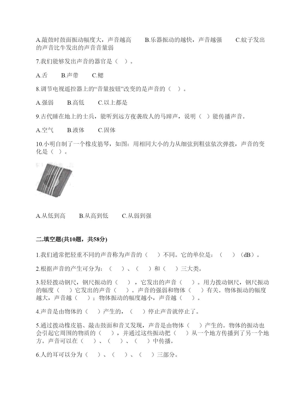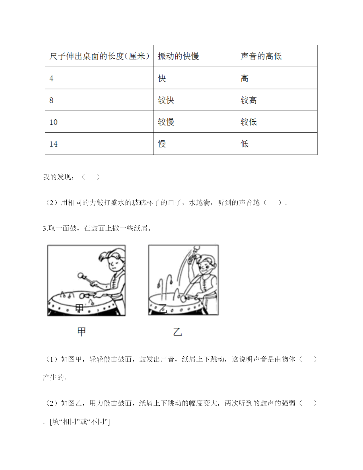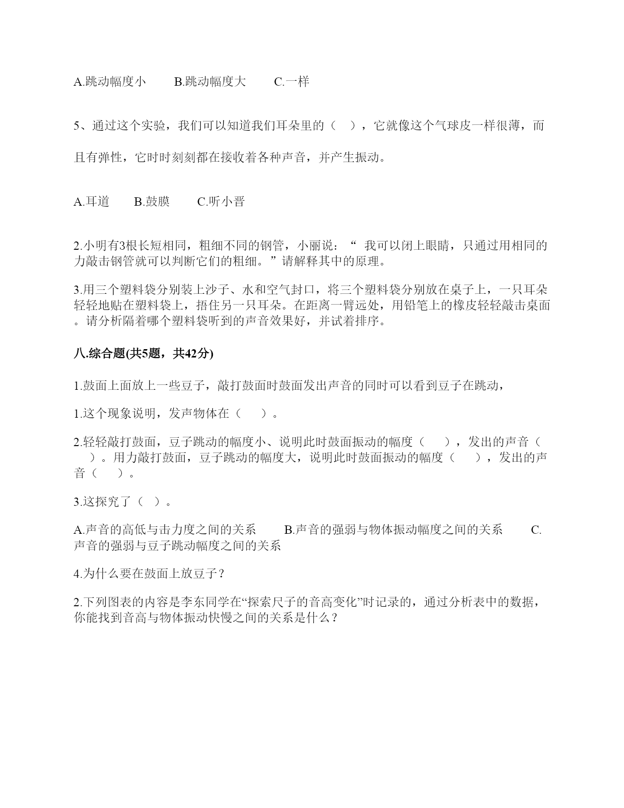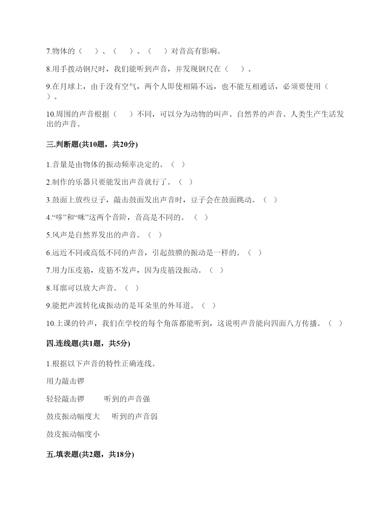 小学科学《声音》综合练习题一.选择题(共10题,共20分)1.用相同的力敲击相同长度,粗细不同的钢管,发出的声音最低的是()。A.B.C.2.电视机的声音太小了,用遥控器把声音调大了一些。在这个过程中,电视机的()。A.声音强弱发生了变化B.声音高低发生了变化C.声音音色发生了变化3.小明用手摸着自己的喉结并说话,体会喉结在振动的感觉;小红在桌上用手按住钢尺然后拨动钢尺伸出桌面的那部分,观察尺子的状态;小强在鼓面上放一些碎纸屑然后敲击鼓面,观察纸屑的状态。这三位同学研究的问题是()。A.声音是怎样产生的B.声音的强弱C.声音的高低4.橡皮筋拉得越紧,拨弹时发出的声音越()。A.响B.轻C.不一定听到5.如图是我国古代的乐器编钟,用小锤敲击它们,会发出悦耳的声音。我们发现,当小锤敲击时,越小的编钟发出的声音()。A.越高B.越强C.越低6.下列关于声音说法正确的是()。A.敲鼓时鼓面振动幅度大,声音越高B.乐器振动的越快,声音越强C.蚊子发出的声音比牛发出的声音音量弱7.我们能够发出声音的器官是()。A.舌B.声带C.鳃8.调节电视遥控器上的“音量按钮”改变的是声音的()。A.强弱B.高低C.以上都是9.古代睡在地上的士兵,能听到远方夜袭敌人的马蹄声,说明()能传播声音。A.空气B.液体C.固体10.小明自制了一个橡皮筋琴,如图:用相同大小的力从细弦到粗弦依次弹拨,声音的变化是()。A.从低到高B.从高到低C.从弱到强二.填空题(共10题,共58分)1.我们通常把轻重不同的声音称为声音的()不同。它的单位是:()(dB)。2.根据声音的产生可分为:()、()和()三大类。3.轻轻拨动钢尺,钢尺振动的(),它发出的声音()。用力拨动钢尺,钢尺振动的幅度()它发出的声音()。声音的强弱和物体()有关。物体振动的幅度越大,声音越();物体振动的幅度越小,声音越()。4.声音是由物体的()产生的,()停止声音就停止了。5.通过拨动橡皮筋、敲击鼓面和音叉发现,声音是由物体()产生的。物体的振动也会引起它周围的物质的(),并通过这些振动把()从一个地方传播到了另一个地方。声音可以在()、()、()中传播。6.人的耳可以分为()、()、()三部分。7.物体的()、()、()对音高有影响。8.用手拨动钢尺时,我们能听到声音,并发现钢尺在()。9.在月球上,由于没有空气,两个人即使相隔不远,也不能互相通话,必须要使用()。10.周围的声音根据()不同,可以分为动物的叫声、自然界的声音、人类生产生活发出的声音。三.判断题(共10题,共20分)1.音量是由物体的振动频率决定的。()2.制作的乐器只要能发出声音就行了。()3.鼓面上放些豆子,敲击鼓面发出声音时,豆子会在鼓面跳动。()4.“哆”和“咪”这两个音阶,音高是不同的。()5.风声是自然界发出的声音。()6.远近不同或高低不同的声音,引起鼓膜的振动是一样的。()7.用力压皮筋,皮筋不发声,因为皮筋没振动。()8.耳廓可以放大声音。()9.能把声波转化成振动的是耳朵里的外耳道。()10.上课的铃声,我们在学校的每个角落都能听到,这说明声音能向四面八方传播。()四.连线题(共1题,共5分)1.根据以下声音的特性正确连线。用力敲击锣轻轻敲击锣听到的声音强鼓皮振动幅度大听到的声音弱鼓皮振动幅度小五.填表题(共2题,共18分)1.根据你对耳朵的了解,完成下表。2.探究尺子发出声音的音高变化实验记录表。六.简答题(共5题,共25分)1.二胡只有两根弦,它是怎样发出高低不同、强弱不同的声音的?2.闪电和雷同时在云层产生,在夏季的雨夜,我们总是先看到闪电,后听到雷声,请对这种现象进行合理解释。3.在相同力量下,能影响弦发出高低不同声音的因素有哪些?4.我们通常用哪些词来描述听到的声音?5.宇航员在太空中工作时,需要借助电子通信设备才能进行沟通,为什么?七.材料题(共3题,共20分)1.下图是乐用橡皮筋将一块绷紧的气球皮扎在杯口上,并在气球皮上撒一些碎纸屑,然后在杯子的上方敲击音叉观察实验现象,根据实验装置图完成下列问题。1、这是模拟()的装置。A.物体振动产生声音B.耳朵鼓膜振动C.液体溶解2、实验中敲击普叉发出的声音通过()传到气球皮上。A.音叉B.空气C.杯子3、实验时用力敲击音叉,观察到气球皮上的碎纸屑()。A.被音叉吸引B.不动C.在气球皮上跳动4、实验时用力敲音叉,气球皮上的碎纸屑跳动幅度与轻敲时相比,()。A.跳动幅度小B.跳动幅度大C.一样5、通过这个实验,我们可以知道我们耳朵里的(),它就像这个气球皮一样很薄,而且有弹性,它时时刻刻都在接收着各种声音
