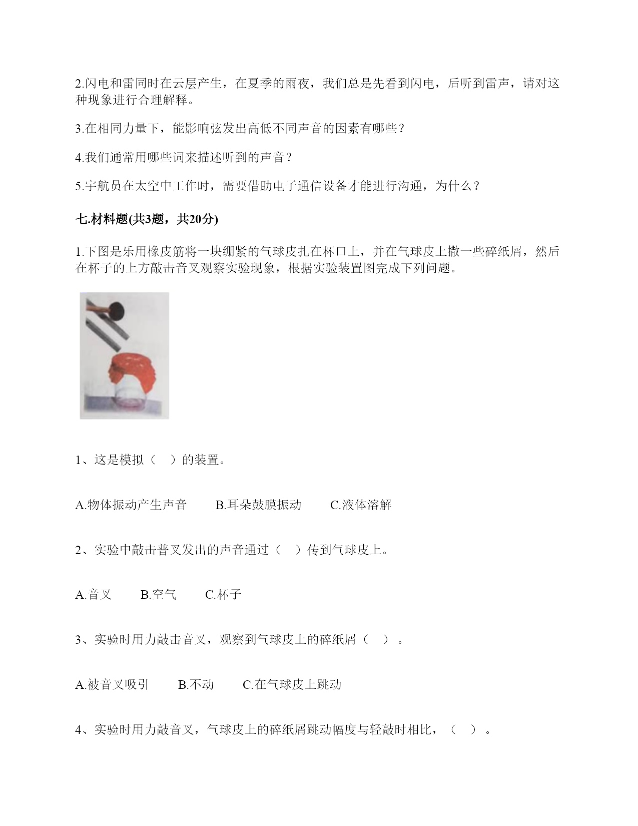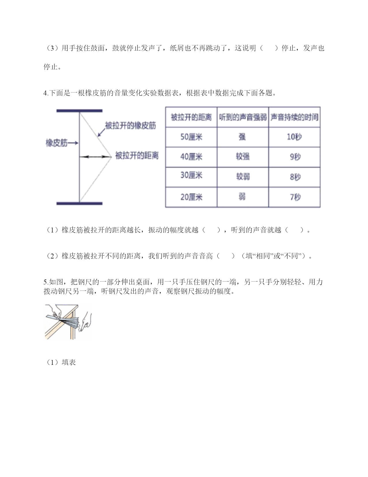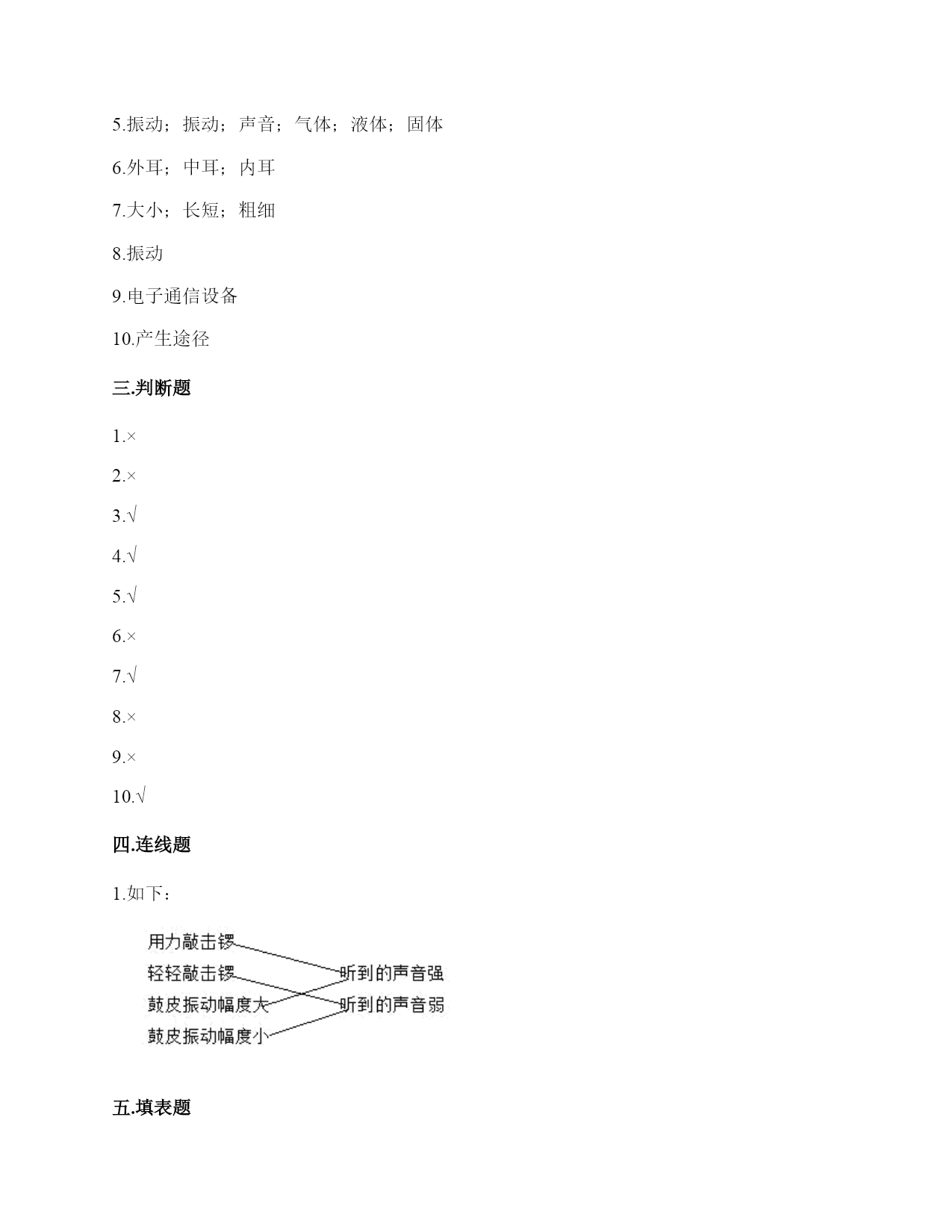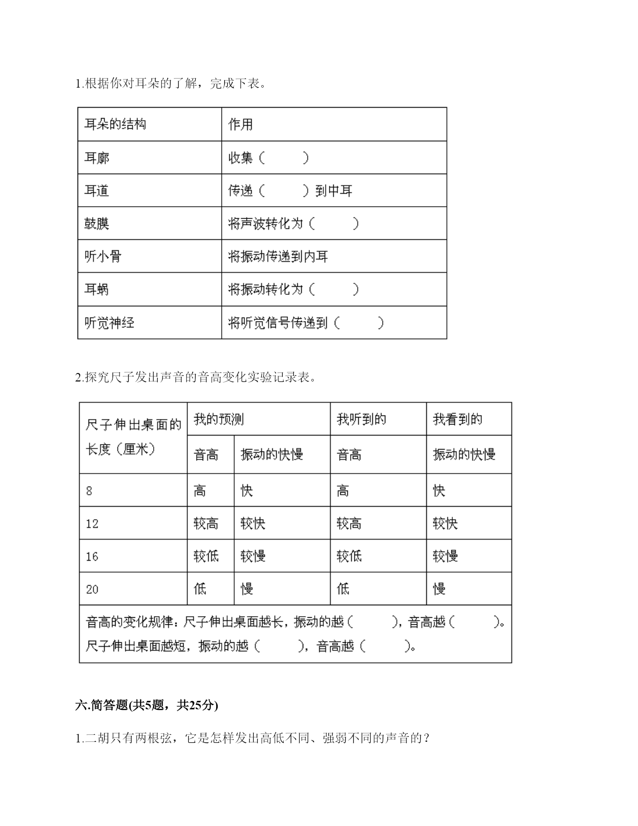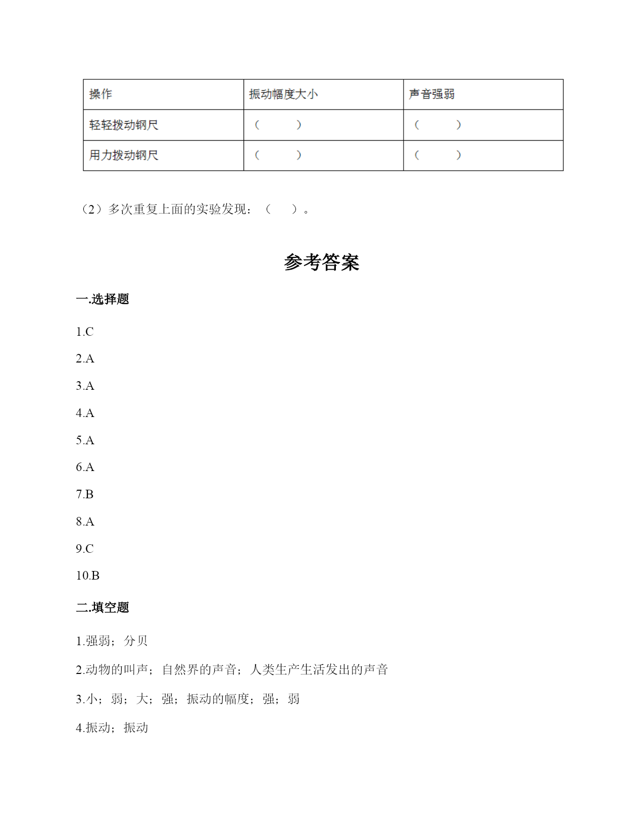 小学科学《声音》综合练习题一.选择题(共10题,共20分)1.用相同的力敲击相同长度,粗细不同的钢管,发出的声音最低的是()。A.B.C.2.电视机的声音太小了,用遥控器把声音调大了一些。在这个过程中,电视机的()。A.声音强弱发生了变化B.声音高低发生了变化C.声音音色发生了变化3.小明用手摸着自己的喉结并说话,体会喉结在振动的感觉;小红在桌上用手按住钢尺然后拨动钢尺伸出桌面的那部分,观察尺子的状态;小强在鼓面上放一些碎纸屑然后敲击鼓面,观察纸屑的状态。这三位同学研究的问题是()。A.声音是怎样产生的B.声音的强弱C.声音的高低4.橡皮筋拉得越紧,拨弹时发出的声音越()。A.响B.轻C.不一定听到5.如图是我国古代的乐器编钟,用小锤敲击它们,会发出悦耳的声音。我们发现,当小锤敲击时,越小的编钟发出的声音()。A.越高B.越强C.越低6.下列关于声音说法正确的是()。A.敲鼓时鼓面振动幅度大,声音越高B.乐器振动的越快,声音越强C.蚊子发出的声音比牛发出的声音音量弱7.我们能够发出声音的器官是()。A.舌B.声带C.鳃8.调节电视遥控器上的“音量按钮”改变的是声音的()。A.强弱B.高低C.以上都是9.古代睡在地上的士兵,能听到远方夜袭敌人的马蹄声,说明()能传播声音。A.空气B.液体C.固体10.小明自制了一个橡皮筋琴,如图:用相同大小的力从细弦到粗弦依次弹拨,声音的变化是()。A.从低到高B.从高到低C.从弱到强二.填空题(共10题,共58分)1.我们通常把轻重不同的声音称为声音的()不同。它的单位是:()(dB)。2.根据声音的产生可分为:()、()和()三大类。3.轻轻拨动钢尺,钢尺振动的(),它发出的声音()。用力拨动钢尺,钢尺振动的幅度()它发出的声音()。声音的强弱和物体()有关。物体振动的幅度越大,声音越();物体振动的幅度越小,声音越()。4.声音是由物体的()产生的,()停止声音就停止了。5.通过拨动橡皮筋、敲击鼓面和音叉发现,声音是由物体()产生的。物体的振动也会引起它周围的物质的(),并通过这些振动把()从一个地方传播到了另一个地方。声音可以在()、()、()中传播。6.人的耳可以分为()、()、()三部分。7.物体的()、()、()对音高有影响。8.用手拨动钢尺时,我们能听到声音,并发现钢尺在()。9.在月球上,由于没有空气,两个人即使相隔不远,也不能互相通话,必须要使用()。10.周围的声音根据()不同,可以分为动物的叫声、自然界的声音、人类生产生活发出的声音。三.判断题(共10题,共20分)1.音量是由物体的振动频率决定的。()2.制作的乐器只要能发出声音就行了。()3.鼓面上放些豆子,敲击鼓面发出声音时,豆子会在鼓面跳动。()4.“哆”和“咪”这两个音阶,音高是不同的。()5.风声是自然界发出的声音。()6.远近不同或高低不同的声音,引起鼓膜的振动是一样的。()7.用力压皮筋,皮筋不发声,因为皮筋没振动。()8.耳廓可以放大声音。()9.能把声波转化成振动的是耳朵里的外耳道。()10.上课的铃声,我们在学校的每个角落都能听到,这说明声音能向四面八方传播。()四.连线题(共1题,共5分)1.根据以下声音的特性正确连线。用力敲击锣轻轻敲击锣听到的声音强鼓皮振动幅度大听到的声音弱鼓皮振动幅度小五.填表题(共2题,共18分)1.根据你对耳朵的了解,完成下表。2.探究尺子发出声音的音高变化实验记录表。六.简答题(共5题,共25分)1.二胡只有两根弦,它是怎样发出高低不同、强弱不同的声音的?2.闪电和雷同时在云层产生,在夏季的雨夜,我们总是先看到闪电,后听到雷声,请对这种现象进行合理解释。3.在相同力量下,能影响弦发出高低不同声音的因素有哪些?4.我们通常用哪些词来描述听到的声音?5.宇航员在太空中工作时,需要借助电子通信设备才能进行沟通,为什么?七.材料题(共3题,共20分)1.下图是乐用橡皮筋将一块绷紧的气球皮扎在杯口上,并在气球皮上撒一些碎纸屑,然后在杯子的上方敲击音叉观察实验现象,根据实验装置图完成下列问题。1、这是模拟()的装置。A.物体振动产生声音B.耳朵鼓膜振动C.液体溶解2、实验中敲击普叉发出的声音通过()传到气球皮上。A.音叉B.空气C.杯子3、实验时用力敲击音叉,观察到气球皮上的碎纸屑()。A.被音叉吸引B.不动C.在气球皮上跳动4、实验时用力敲音叉,气球皮上的碎纸屑跳动幅度与轻敲时相比,()。A.跳动幅度小B.跳动幅度大C.一样5、通过这个实验,我们可以知道我们耳朵里的(),它就像这个气球皮一样很薄,而且有弹性,它时时刻刻都在接收着各种声音