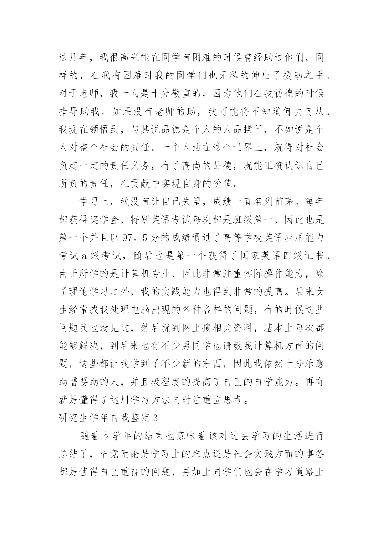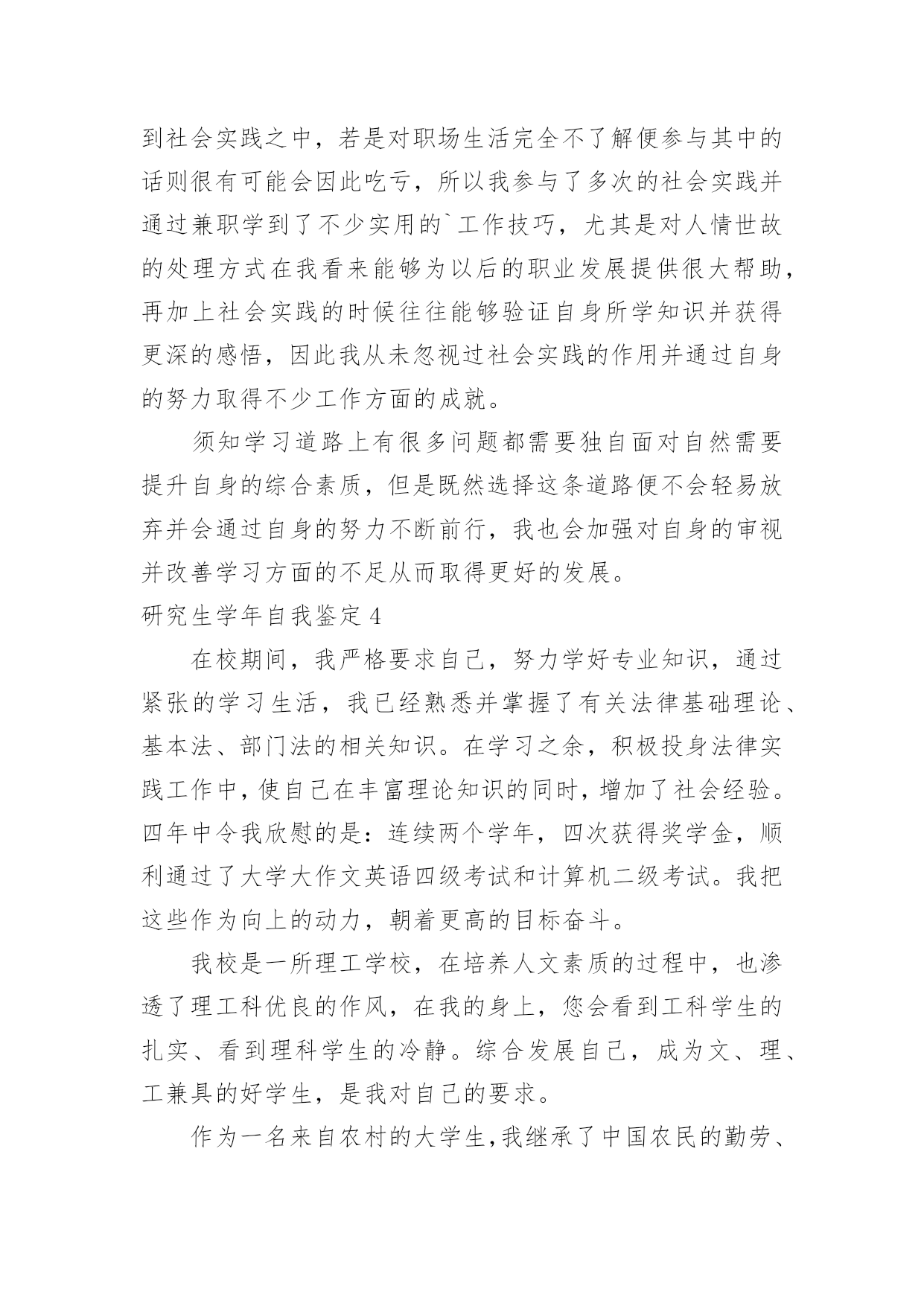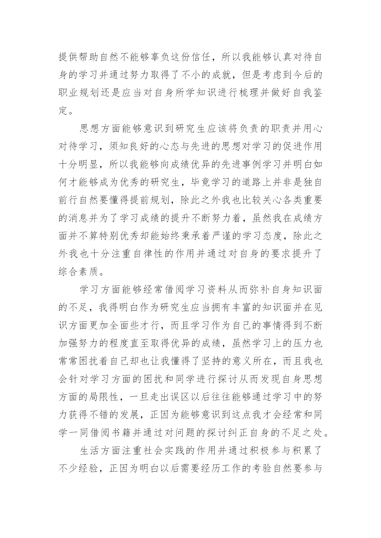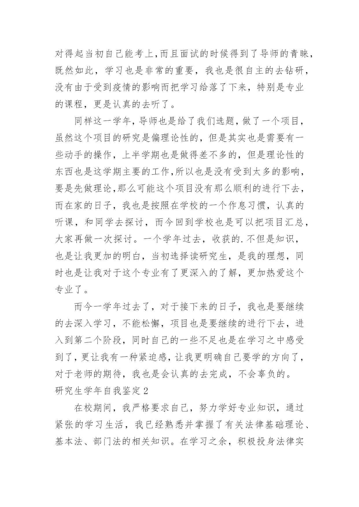 研究生学年自我鉴定研究生学年自我鉴定集锦15篇自我鉴定是对自己过去某一阶段的学习或工作的自我分析和总结,写自我鉴定有利于我们工作能力的提高,为此我们要做好总结,写好自我鉴定。我们该怎么去写自我鉴定呢?以下是小编整理的研究生学年自我鉴定,欢迎阅读,希望大家能够喜欢。研究生学年自我鉴定1读研究生的这一年,我也是有很大的收获,和本科不一样,我们的专业更加的深入,而且要学的东西真的特别的多,我也是在这一学年里有了很大的进步,同时对于这一学年我也是感觉到自身不懂的知识有很多,也是学得越多,更有更深的知识在等待着我去钻研,去学习,我也是对于这一学年来做一个自我的鉴定。这一年里,我跟着导师学习,无论是书本的知识,或者项目的工作,我都是认真的去做,去学,上学期的时候,还是在学校里面,但是这个学期,却是由于受到疫情的影响,一整个学期都是在家里,虽然如此,但是我们的项目也依旧正常的进行,只是从面对面的沟通到了线上视频的沟通,和同学和导师一起的探讨,我也是尝试了不一样的方式,虽然大家不见面,但是项目的进度却是意外的顺利,也是我们都认真的去钻研了,没有松懈,既然是研究生了,那么更是要对得起当初自己能考上,而且面试的时候得到了导师的青睐,既然如此,学习也是非常的重要,我也是很自主的去钻研,没有由于受到疫情的影响而把学习给落了下来,特别是专业的课程,更是认真的去听了。同样这一学年,导师也是给了我们选题,做了一个项目,虽然这个项目的研究是偏理论性的,但是其实也是需要有一些动手的操作,上半学期也是做得差不多的,但是理论性的东西也是这学期主要的工作,所以也是没有受到太多的影响,要是先做理论,那么可能这个项目没有那么顺利的进行下去,而在家的日子,我也是按照在学校的一个作息习惯,认真的听课,和同学去探讨,而今回到学校也是可以把项目汇总,大家再做一次探讨。一个学年过去,收获的.不但是知识,也是让我更加的明白,当初选择读研究生,是我的理想,同时也是让我对于这个专业有了更深入的了解,更加热爱这个专业了。而今一学年过去了,对于接下来的日子,我也是要继续的去深入学习,不能松懈,项目也是要继续的进行下去,进入到第二个阶段,同时自己的一些不足也是在学习之中感受到了,更让我有一种紧迫感,让我更明确自己要学的方向了,对于老师的期待,我也是会认真的去完成,不会辜负的。研究生学年自我鉴定2在校期间,我严格要求自己,努力学好专业知识,通过紧张的学习生活,我已经熟悉并掌握了有关法律基础理论、基本法、部门法的相关知识。在学习之余,积极投身法律实践工作中,使自己在丰富理论知识的同时,增加了社会经验。四年中令我欣慰的是:连续两个学年,四次获得奖学金,顺利通过了学作文英语四级考试和计算机二级考试。我把这些作为向上的动力,朝着更高的目标奋斗。在学期间,我始终以提高自身的综合素质为目标,以自我的全面发展为努力方向,树立正确的人生观、价值观和世界观。为适应社会发展的需求,我认真学习各种专业知识,发挥自己的特长;挖掘自身的潜力,结合每年的暑期社会实践机会,从而逐步提高了自己的学习能力和分析处理问题的能力以及一定的协调组织和管理能力。思想上,令我最自豪的事情是经过不断的努力学习和提高自己,我顺利的加入了中国,并且成为一名光荣的党员。感觉就象在自己的生命上添上了神圣的一笔,转化成为一种无形的力量在鼓励我,在督促我,在时时刻刻的检查我,让我在思想行为方面能够作风优良、待人诚恳,能较好处理人际关际,处事冷静稳健,能合理地统筹安排生活中的事务。为社会为学校为同学为身边的人做事不再是觉得是一种累赘,而是很乐意的去做并且能够得到满足和快乐,不会去想做好自己的事情,别人的事情少管。并且一直在追求人格的升华,注重自己的品行。我崇拜有巨人格魅力的人,并一直希望自己也能做到。在学生活中,我坚持着自我省且努力的完善自己的人格。现在我理解道理,乐于助人不仅能铸造高尚的品德,而且自身也会得到很多利益,助别人的.同时也是在助自己。回顾这几年,我很高兴能在同学有困难的时候曾经助过他们,同样的,在我有困难时我的同学们也无私的伸出了援助之手。对于老师,我一向是十分敬重的,因为他们在我彷徨的时候指导助我。如果没有老师的助,我可能将不知道何去何从。我现在领悟到,与其说品德是个人的人品操行,不如说是个人对整个社会的责任。一个人活在这个世界上,就得对社会负起一定的责任义务,有了高尚的品德,就能正确认识自己所负的责任,在贡献中实现自身的价值。学习上,我没有让自己失望,成绩一直名列前茅。每年都获得奖学金,特别英语考试每次都是班级第一,因此也是第一个并且以97。5分的成绩通过了高等学校英语应用能力考试a级考试,随后也是第一个获得了国家英语四级证书。由于所学的是计算机专业,因此非常注重实际操作能力,除了理论学习之外,我的实践能力也得到非常的提高。后来女