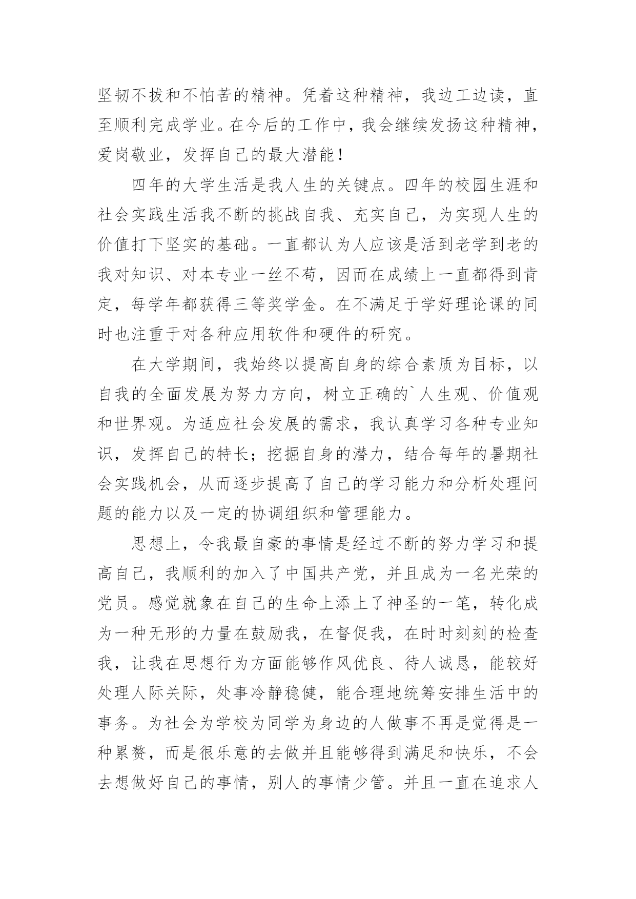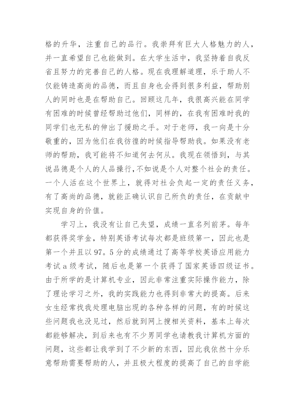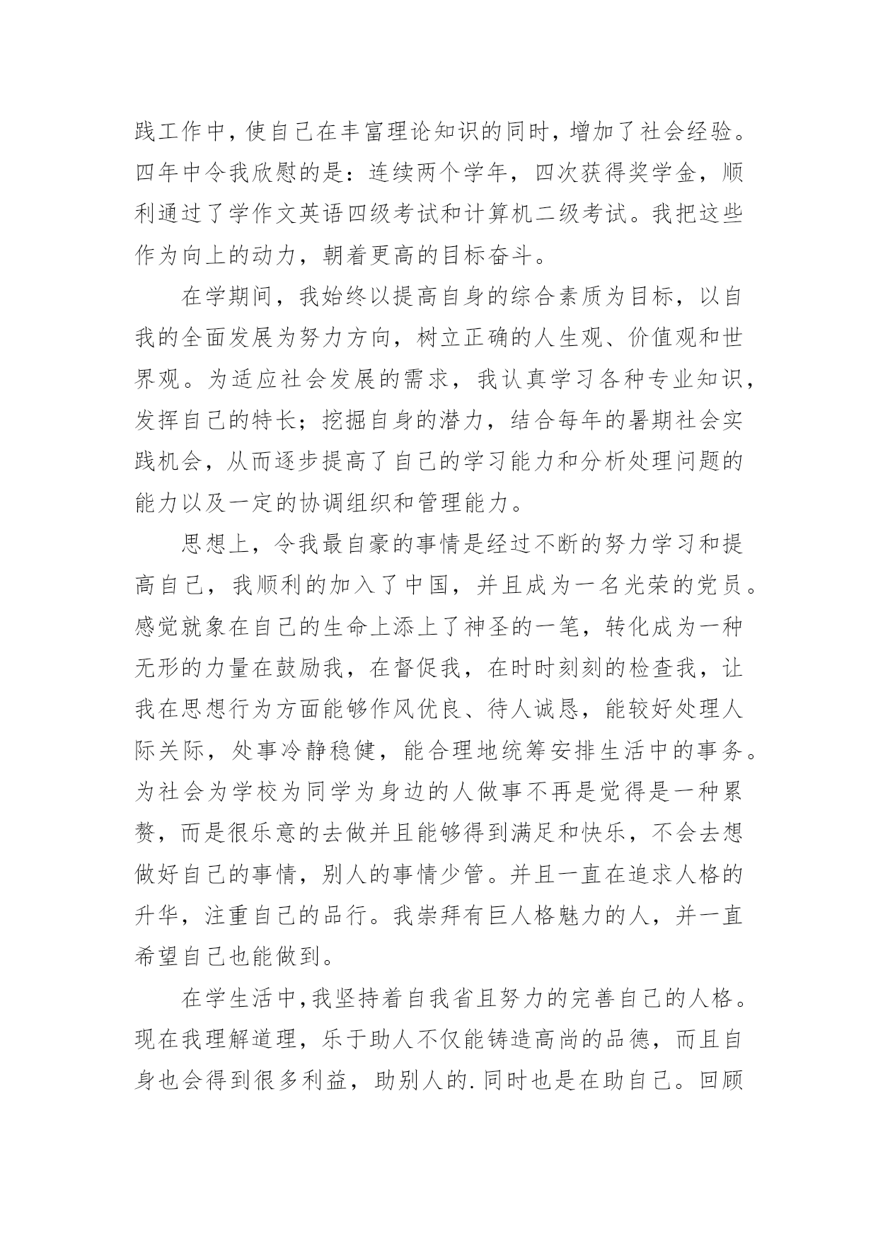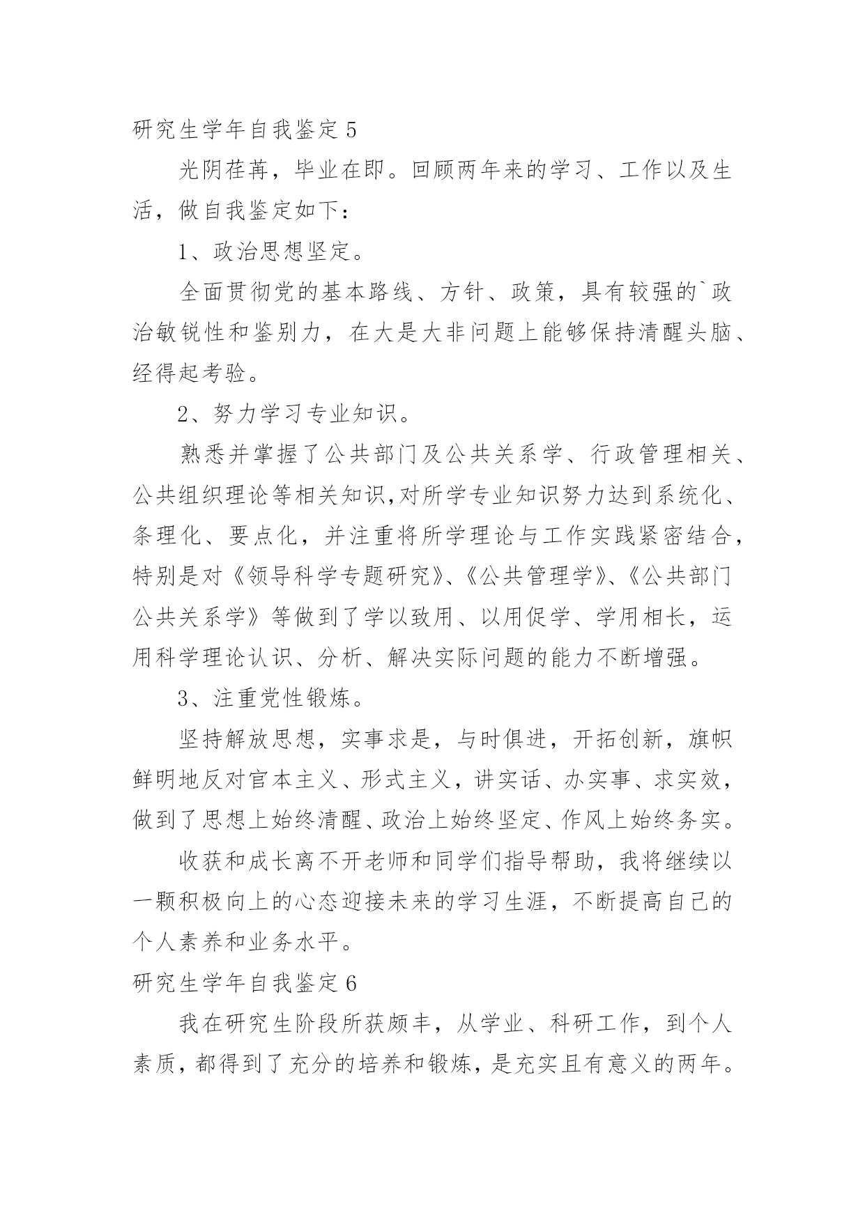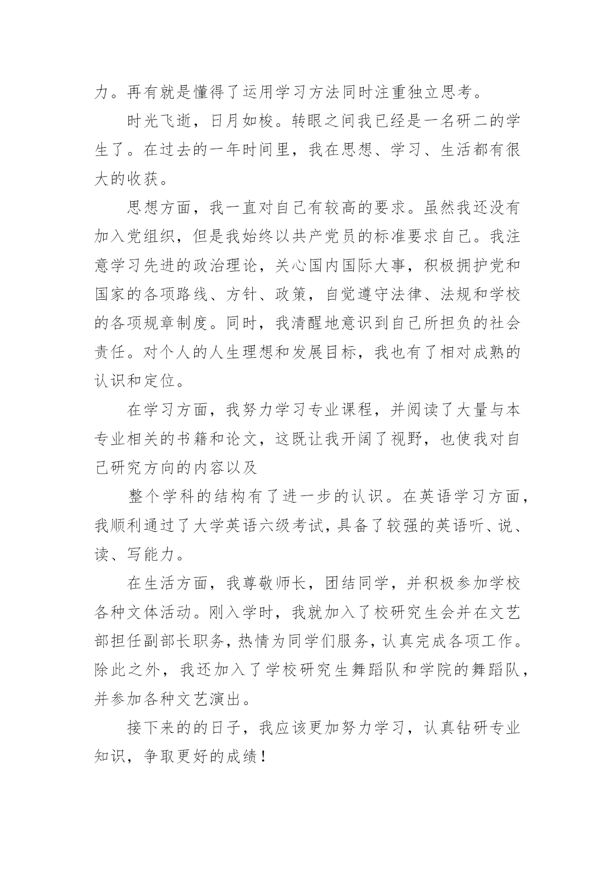 研究生学年自我鉴定研究生学年自我鉴定集锦15篇自我鉴定是对自己过去某一阶段的学习或工作的自我分析和总结,写自我鉴定有利于我们工作能力的提高,为此我们要做好总结,写好自我鉴定。我们该怎么去写自我鉴定呢?以下是小编整理的研究生学年自我鉴定,欢迎阅读,希望大家能够喜欢。研究生学年自我鉴定1读研究生的这一年,我也是有很大的收获,和本科不一样,我们的专业更加的深入,而且要学的东西真的特别的多,我也是在这一学年里有了很大的进步,同时对于这一学年我也是感觉到自身不懂的知识有很多,也是学得越多,更有更深的知识在等待着我去钻研,去学习,我也是对于这一学年来做一个自我的鉴定。这一年里,我跟着导师学习,无论是书本的知识,或者项目的工作,我都是认真的去做,去学,上学期的时候,还是在学校里面,但是这个学期,却是由于受到疫情的影响,一整个学期都是在家里,虽然如此,但是我们的项目也依旧正常的进行,只是从面对面的沟通到了线上视频的沟通,和同学和导师一起的探讨,我也是尝试了不一样的方式,虽然大家不见面,但是项目的进度却是意外的顺利,也是我们都认真的去钻研了,没有松懈,既然是研究生了,那么更是要对得起当初自己能考上,而且面试的时候得到了导师的青睐,既然如此,学习也是非常的重要,我也是很自主的去钻研,没有由于受到疫情的影响而把学习给落了下来,特别是专业的课程,更是认真的去听了。同样这一学年,导师也是给了我们选题,做了一个项目,虽然这个项目的研究是偏理论性的,但是其实也是需要有一些动手的操作,上半学期也是做得差不多的,但是理论性的东西也是这学期主要的工作,所以也是没有受到太多的影响,要是先做理论,那么可能这个项目没有那么顺利的进行下去,而在家的日子,我也是按照在学校的一个作息习惯,认真的听课,和同学去探讨,而今回到学校也是可以把项目汇总,大家再做一次探讨。一个学年过去,收获的.不但是知识,也是让我更加的明白,当初选择读研究生,是我的理想,同时也是让我对于这个专业有了更深入的了解,更加热爱这个专业了。而今一学年过去了,对于接下来的日子,我也是要继续的去深入学习,不能松懈,项目也是要继续的进行下去,进入到第二个阶段,同时自己的一些不足也是在学习之中感受到了,更让我有一种紧迫感,让我更明确自己要学的方向了,对于老师的期待,我也是会认真的去完成,不会辜负的。研究生学年自我鉴定2在校期间,我严格要求自己,努力学好专业知识,通过紧张的学习生活,我已经熟悉并掌握了有关法律基础理论、基本法、部门法的相关知识。在学习之余,积极投身法律实践工作中,使自己在丰富理论知识的同时,增加了社会经验。四年中令我欣慰的是:连续两个学年,四次获得奖学金,顺利通过了学作文英语四级考试和计算机二级考试。我把这些作为向上的动力,朝着更高的目标奋斗。在学期间,我始终以提高自身的综合素质为目标,以自我的全面发展为努力方向,树立正确的人生观、价值观和世界观。为适应社会发展的需求,我认真学习各种专业知识,发挥自己的特长;挖掘自身的潜力,结合每年的暑期社会实践机会,从而逐步提高了自己的学习能力和分析处理问题的能力以及一定的协调组织和管理能力。思想上,令我最自豪的事情是经过不断的努力学习和提高自己,我顺利的加入了中国,并且成为一名光荣的党员。感觉就象在自己的生命上添上了神圣的一笔,转化成为一种无形的力量在鼓励我,在督促我,在时时刻刻的检查我,让我在思想行为方面能够作风优良、待人诚恳,能较好处理人际关际,处事冷静稳健,能合理地统筹安排生活中的事务。为社会为学校为同学为身边的人做事不再是觉得是一种累赘,而是很乐意的去做并且能够得到满足和快乐,不会去想做好自己的事情,别人的事情少管。并且一直在追求人格的升华,注重自己的品行。我崇拜有巨人格魅力的人,并一直希望自己也能做到。在学生活中,我坚持着自我省且努力的完善自己的人格。现在我理解道理,乐于助人不仅能铸造高尚的品德,而且自身也会得到很多利益,助别人的.同时也是在助自己。回顾这几年,我很高兴能在同学有困难的时候曾经助过他们,同样的,在我有困难时我的同学们也无私的伸出了援助之手。对于老师,我一向是十分敬重的,因为他们在我彷徨的时候指导助我。如果没有老师的助,我可能将不知道何去何从。我现在领悟到,与其说品德是个人的人品操行,不如说是个人对整个社会的责任。一个人活在这个世界上,就得对社会负起一定的责任义务,有了高尚的品德,就能正确认识自己所负的责任,在贡献中实现自身的价值。学习上,我没有让自己失望,成绩一直名列前茅。每年都获得奖学金,特别英语考试每次都是班级第一,因此也是第一个并且以97。5分的成绩通过了高等学校英语应用能力考试a级考试,随后也是第一个获得了国家英语四级证书。由于所学的是计算机专业,因此非常注重实际操作能力,除了理论学习之外,我的实践能力也得到非常的提高。后来女