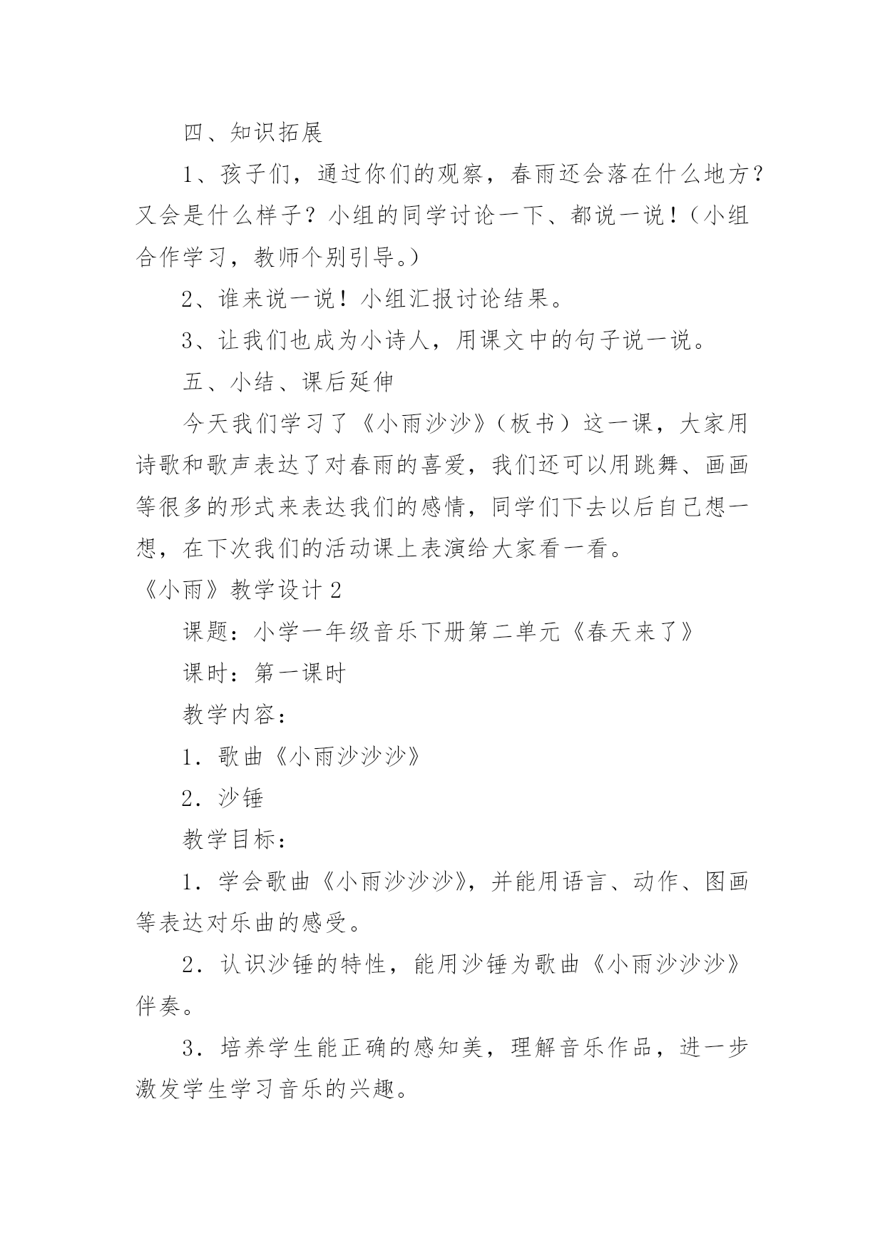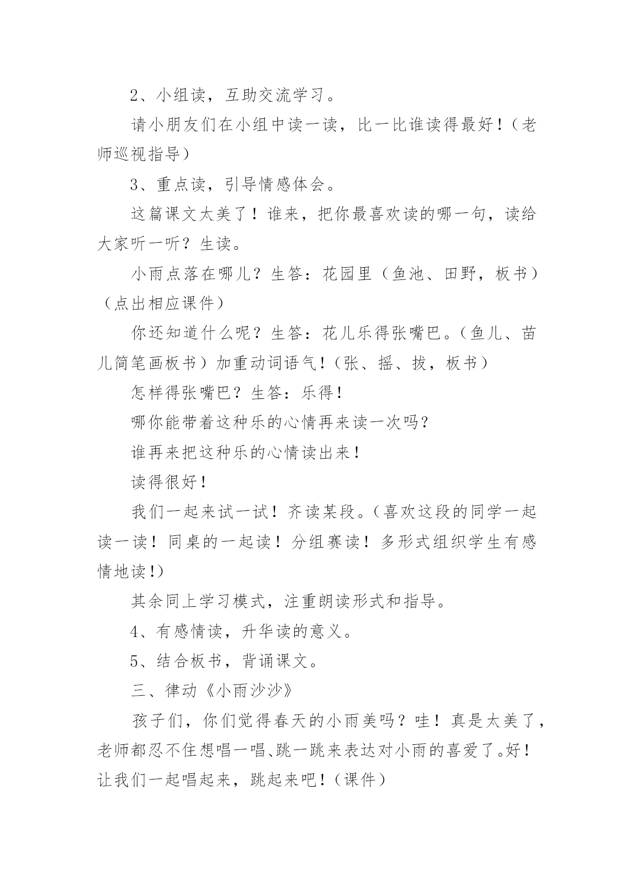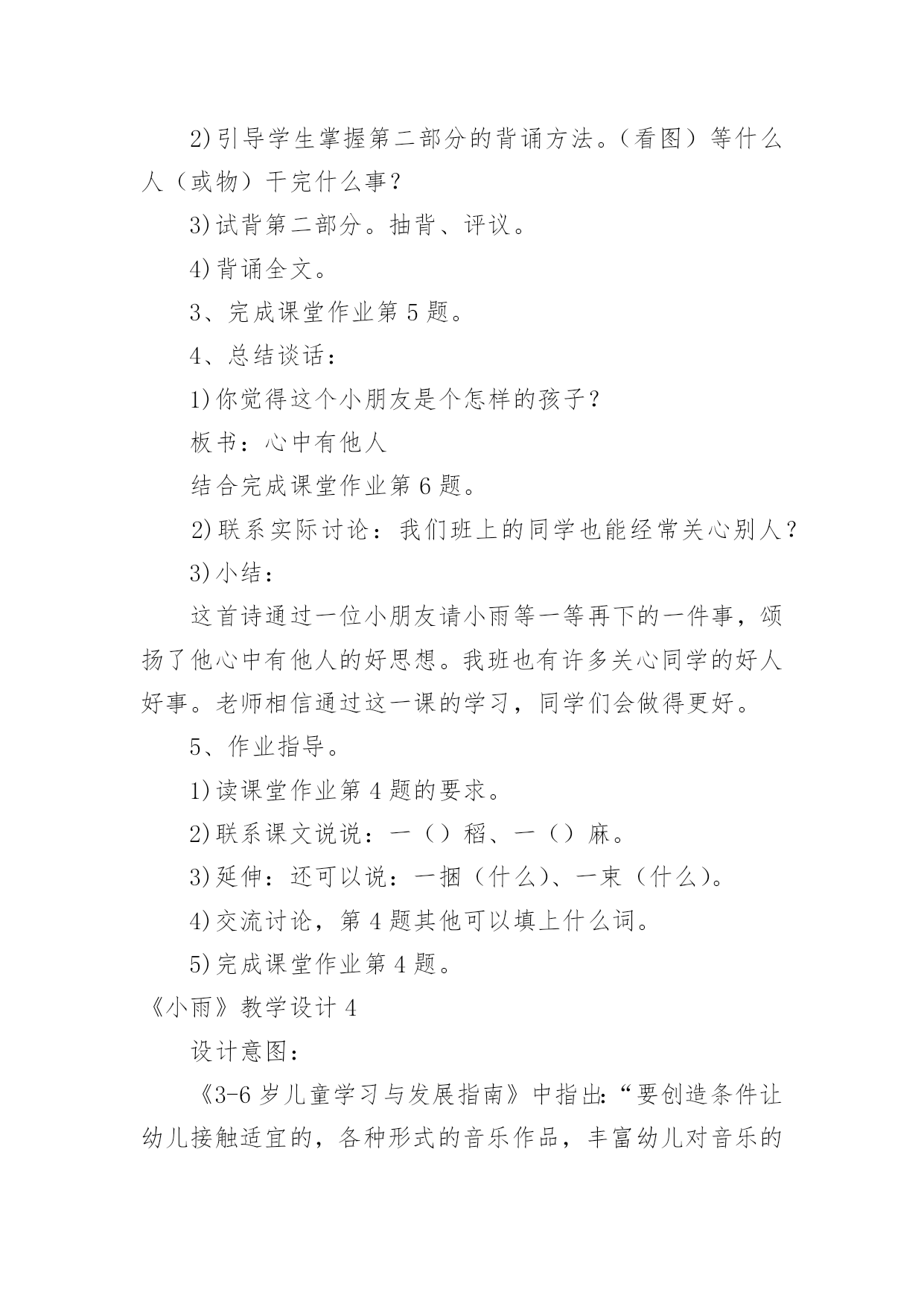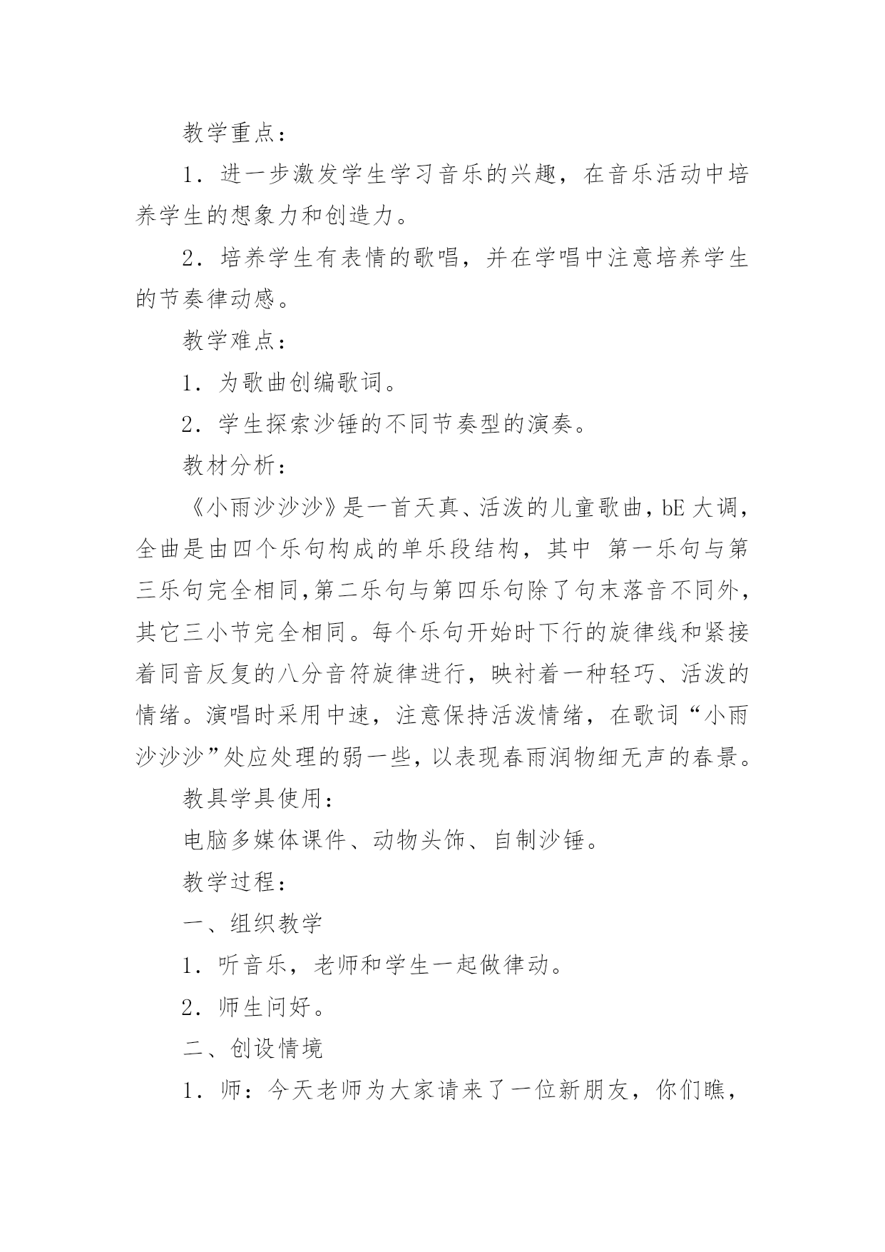 《小雨》教学设计《小雨》教学设计作为一位不辞辛劳的人民教师,时常需要编写教学设计,借助教学设计可使学生在单位时间内能够学到更多的知识。写教学设计需要注意哪些格式呢?下面是小编为大家整理的《小雨》教学设计,仅供参考,希望能够帮助到大家。《小雨》教学设计1教学课题:小雨沙沙教学课时:本课第二课时教学内容:西师版小语教材第一册教学要求:1、能正确、连贯,有感情地朗读课文。2、能将创设的情境与生活实践相结合,体验春天的美丽。3、通过反复朗读体会春雨滋润万物的美好情景,产生热爱春天,热爱大自然的情感。4、可以背诵课文。教学重、难点:1、能有感情地朗读课文。2、培养学生热爱春天,热爱大自然的情感。教学准备:教师:多媒体课件教学过程:一、创设情境,揭示课题。1、引入课题师:小朋友们,在这寒冷的冬天里,你们想看到美丽的春天吗?(想)春姑娘给我们带来了春风,也送来了沙沙的春雨!(课件)雨点儿落下来了。让我们一起来学习一首有关春雨的诗歌《小雨沙沙》(课件点题、齐读课题)。2、巩固生字认识还有几位好朋友,也和春姑娘一起来到了我们这儿。看看还认识他们吗?课件中认生字(抽生认读:雨、沙、点、园、儿、乐、得、张、巴、尾),注重学生纠错!二、课文学习1、抽生读,了解学生情况。看来,同学们已经把生字朋友牢牢地记住了。谁来读一读课文,让我们再看一看,大家读书的情况!(抽生读)哪位小朋友的字音读得更准、课文读得更熟!谁再来读一遍!你认为他读得怎么样?(学生评一评!说到有感情朗读更好!)2、小组读,互助交流学习。请小朋友们在小组中读一读,比一比谁读得最好!(老师巡视指导)3、重点读,引导情感体会。这篇课文太美了!谁来,把你最喜欢读的哪一句,读给大家听一听?生读。小雨点落在哪儿?生答:花园里(鱼池、田野,板书)(点出相应课件)你还知道什么呢?生答:花儿乐得张嘴巴。(鱼儿、苗儿简笔画板书)加重动词语气!(张、摇、拔,板书)怎样得张嘴巴?生答:乐得!哪你能带着这种乐的心情再来读一次吗?谁再来把这种乐的心情读出来!读得很好!我们一起来试一试!齐读某段。(喜欢这段的同学一起读一读!同桌的一起读!分组赛读!多形式组织学生有感情地读!)其余同上学习模式,注重朗读形式和指导。4、有感情读,升华读的意义。5、结合板书,背诵课文。三、律动《小雨沙沙》孩子们,你们觉得春天的小雨美吗?哇!真是太美了,老师都忍不住想唱一唱、跳一跳来表达对小雨的喜爱了。好!让我们一起唱起来,跳起来吧!(课件)四、知识拓展1、孩子们,通过你们的观察,春雨还会落在什么地方?又会是什么样子?小组的同学讨论一下、都说一说!(小组合作学习,教师个别引导。)2、谁来说一说!小组汇报讨论结果。3、让我们也成为小诗人,用课文中的句子说一说。五、小结、课后延伸今天我们学习了《小雨沙沙》(板书)这一课,大家用诗歌和歌声表达了对春雨的喜爱,我们还可以用跳舞、画画等很多的形式来表达我们的感情,同学们下去以后自己想一想,在下次我们的活动课上表演给大家看一看。《小雨》教学设计2课题:小学一年级音乐下册第二单元《春天来了》课时:第一课时教学内容:1.歌曲《小雨沙沙沙》2.沙锤教学目标:1.学会歌曲《小雨沙沙沙》,并能用语言、动作、图画等表达对乐曲的感受。2.认识沙锤的特性,能用沙锤为歌曲《小雨沙沙沙》伴奏。3.培养学生能正确的感知美,理解音乐作品,进一步激发学生学习音乐的兴趣。教学重点:1.进一步激发学生学习音乐的兴趣,在音乐活动中培养学生的想象力和创造力。2.培养学生有表情的歌唱,并在学唱中注意培养学生的节奏律动感。教学难点:1.为歌曲创编歌词。2.学生探索沙锤的不同节奏型的演奏。教材分析:《小雨沙沙沙》是一首天真、活泼的儿童歌曲,bE大调,全曲是由四个乐句构成的单乐段结构,其中第一乐句与第三乐句完全相同,第二乐句与第四乐句除了句末落音不同外,其它三小节完全相同。每个乐句开始时下行的旋律线和紧接着同音反复的八分音符旋律进行,映衬着一种轻巧、活泼的情绪。演唱时采用中速,注意保持活泼情绪,在歌词“小雨沙沙沙”处应处理的弱一些,以表现春雨润物细无声的春景。教具学具使用:电脑多媒体课件、动物头饰、自制沙锤。教学过程:一、组织教学1.听音乐,老师和学生一起做律动。2.师生问好。二、创设情境1.师:今天老师为大家请来了一位新朋友,你们瞧,她是谁?(多媒体课件:春姑娘)春姑娘一到,大地会发生怎样的变化呢?你观察过吗?2.教师朗诵一段描写春天的散文。(多媒体课件:春天景色)3.教师:你能用最美的一句话或一个词语来描述春天的景色吗?4.教师:让我们跳着舞到音乐中去寻找春天吧。(听音乐跟老师表演《春天在哪里》)三、学唱歌曲1.教师:春天太美了,大家都这么高兴,地里的种子耐不住寂寞了,他想钻出头,可是怎么也钻出来,怎么办?谁能帮得了他?(学生答:小雨)