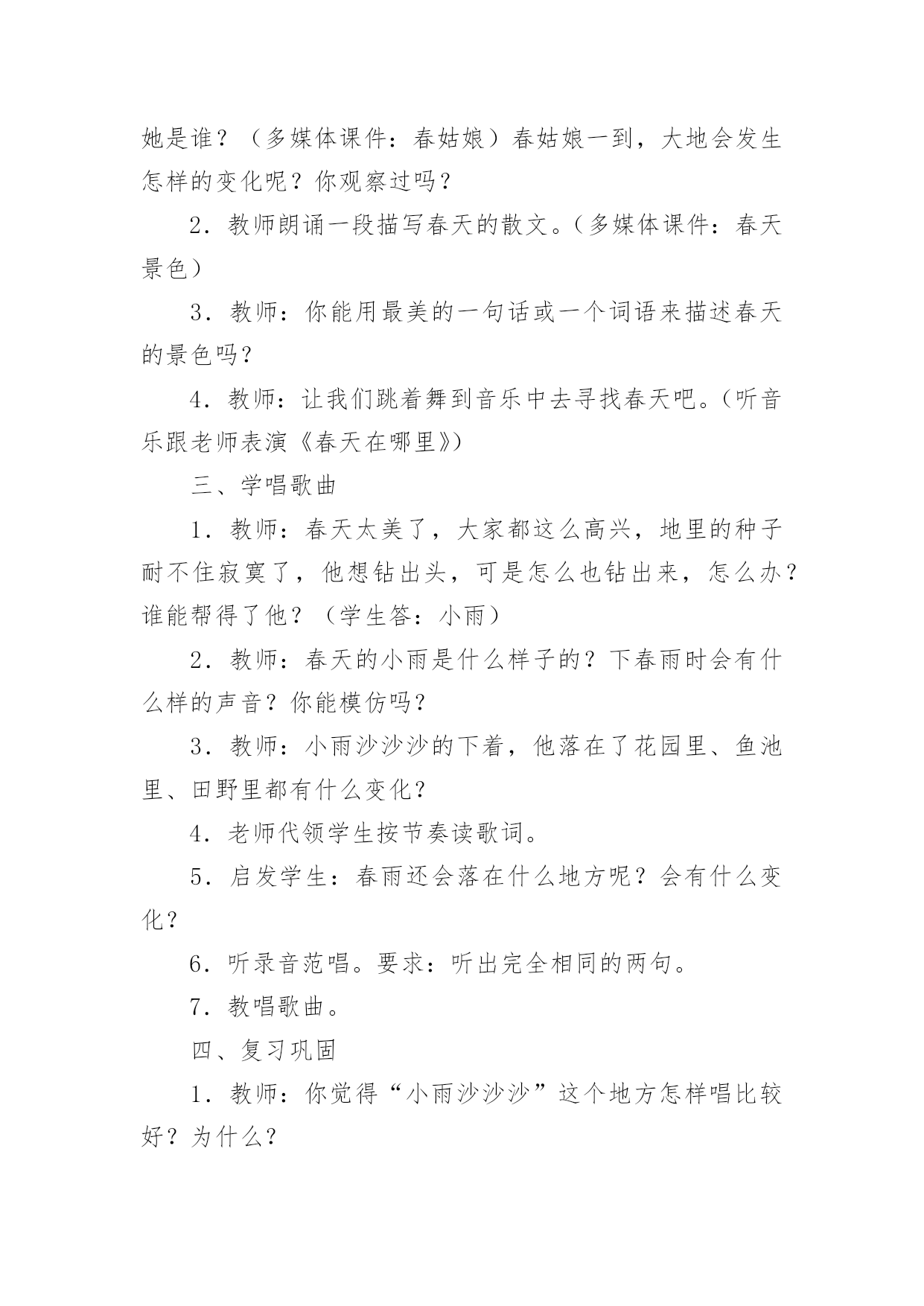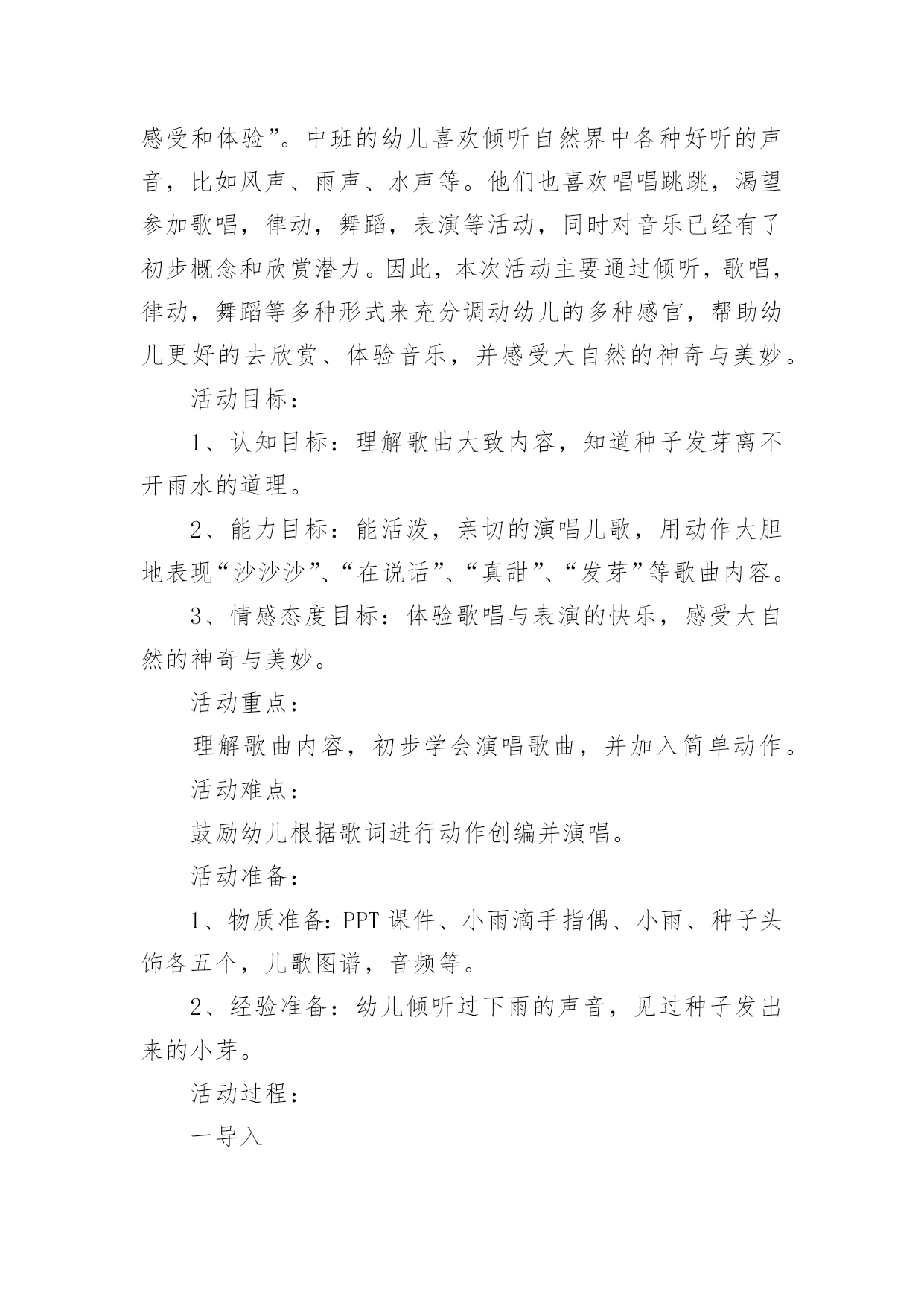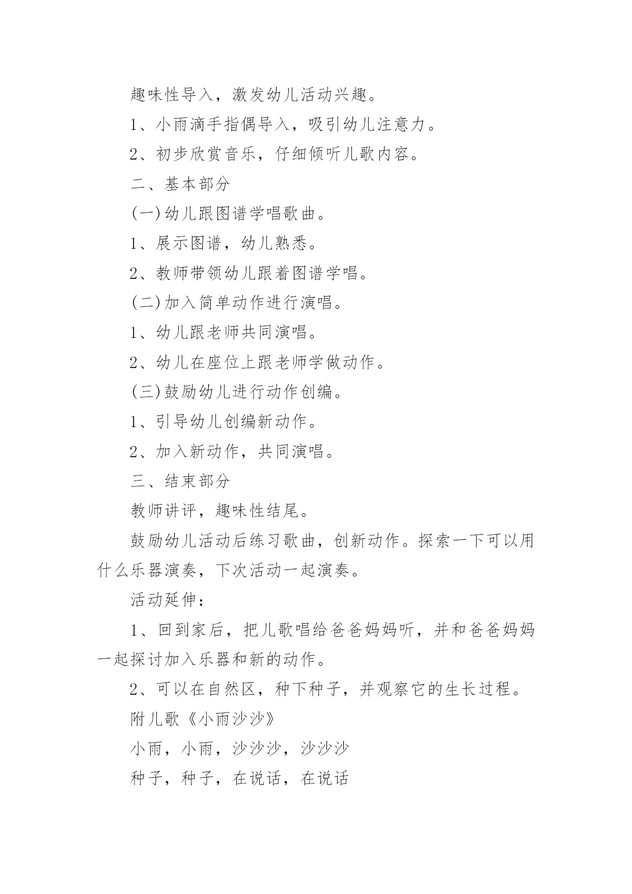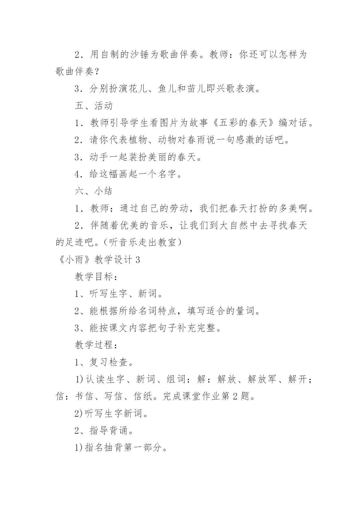 《小雨》教学设计《小雨》教学设计作为一位不辞辛劳的人民教师,时常需要编写教学设计,借助教学设计可使学生在单位时间内能够学到更多的知识。写教学设计需要注意哪些格式呢?下面是小编为大家整理的《小雨》教学设计,仅供参考,希望能够帮助到大家。《小雨》教学设计1教学课题:小雨沙沙教学课时:本课第二课时教学内容:西师版小语教材第一册教学要求:1、能正确、连贯,有感情地朗读课文。2、能将创设的情境与生活实践相结合,体验春天的美丽。3、通过反复朗读体会春雨滋润万物的美好情景,产生热爱春天,热爱大自然的情感。4、可以背诵课文。教学重、难点:1、能有感情地朗读课文。2、培养学生热爱春天,热爱大自然的情感。教学准备:教师:多媒体课件教学过程:一、创设情境,揭示课题。1、引入课题师:小朋友们,在这寒冷的冬天里,你们想看到美丽的春天吗?(想)春姑娘给我们带来了春风,也送来了沙沙的春雨!(课件)雨点儿落下来了。让我们一起来学习一首有关春雨的诗歌《小雨沙沙》(课件点题、齐读课题)。2、巩固生字认识还有几位好朋友,也和春姑娘一起来到了我们这儿。看看还认识他们吗?课件中认生字(抽生认读:雨、沙、点、园、儿、乐、得、张、巴、尾),注重学生纠错!二、课文学习1、抽生读,了解学生情况。看来,同学们已经把生字朋友牢牢地记住了。谁来读一读课文,让我们再看一看,大家读书的情况!(抽生读)哪位小朋友的字音读得更准、课文读得更熟!谁再来读一遍!你认为他读得怎么样?(学生评一评!说到有感情朗读更好!)2、小组读,互助交流学习。请小朋友们在小组中读一读,比一比谁读得最好!(老师巡视指导)3、重点读,引导情感体会。这篇课文太美了!谁来,把你最喜欢读的哪一句,读给大家听一听?生读。小雨点落在哪儿?生答:花园里(鱼池、田野,板书)(点出相应课件)你还知道什么呢?生答:花儿乐得张嘴巴。(鱼儿、苗儿简笔画板书)加重动词语气!(张、摇、拔,板书)怎样得张嘴巴?生答:乐得!哪你能带着这种乐的心情再来读一次吗?谁再来把这种乐的心情读出来!读得很好!我们一起来试一试!齐读某段。(喜欢这段的同学一起读一读!同桌的一起读!分组赛读!多形式组织学生有感情地读!)其余同上学习模式,注重朗读形式和指导。4、有感情读,升华读的意义。5、结合板书,背诵课文。三、律动《小雨沙沙》孩子们,你们觉得春天的小雨美吗?哇!真是太美了,老师都忍不住想唱一唱、跳一跳来表达对小雨的喜爱了。好!让我们一起唱起来,跳起来吧!(课件)四、知识拓展1、孩子们,通过你们的观察,春雨还会落在什么地方?又会是什么样子?小组的同学讨论一下、都说一说!(小组合作学习,教师个别引导。)2、谁来说一说!小组汇报讨论结果。3、让我们也成为小诗人,用课文中的句子说一说。五、小结、课后延伸今天我们学习了《小雨沙沙》(板书)这一课,大家用诗歌和歌声表达了对春雨的喜爱,我们还可以用跳舞、画画等很多的形式来表达我们的感情,同学们下去以后自己想一想,在下次我们的活动课上表演给大家看一看。《小雨》教学设计2课题:小学一年级音乐下册第二单元《春天来了》课时:第一课时教学内容:1.歌曲《小雨沙沙沙》2.沙锤教学目标:1.学会歌曲《小雨沙沙沙》,并能用语言、动作、图画等表达对乐曲的感受。2.认识沙锤的特性,能用沙锤为歌曲《小雨沙沙沙》伴奏。3.培养学生能正确的感知美,理解音乐作品,进一步激发学生学习音乐的兴趣。教学重点:1.进一步激发学生学习音乐的兴趣,在音乐活动中培养学生的想象力和创造力。2.培养学生有表情的歌唱,并在学唱中注意培养学生的节奏律动感。教学难点:1.为歌曲创编歌词。2.学生探索沙锤的不同节奏型的演奏。教材分析:《小雨沙沙沙》是一首天真、活泼的儿童歌曲,bE大调,全曲是由四个乐句构成的单乐段结构,其中第一乐句与第三乐句完全相同,第二乐句与第四乐句除了句末落音不同外,其它三小节完全相同。每个乐句开始时下行的旋律线和紧接着同音反复的八分音符旋律进行,映衬着一种轻巧、活泼的情绪。演唱时采用中速,注意保持活泼情绪,在歌词“小雨沙沙沙”处应处理的弱一些,以表现春雨润物细无声的春景。教具学具使用:电脑多媒体课件、动物头饰、自制沙锤。教学过程:一、组织教学1.听音乐,老师和学生一起做律动。2.师生问好。二、创设情境1.师:今天老师为大家请来了一位新朋友,你们瞧,她是谁?(多媒体课件:春姑娘)春姑娘一到,大地会发生怎样的变化呢?你观察过吗?2.教师朗诵一段描写春天的散文。(多媒体课件:春天景色)3.教师:你能用最美的一句话或一个词语来描述春天的景色吗?4.教师:让我们跳着舞到音乐中去寻找春天吧。(听音乐跟老师表演《春天在哪里》)三、学唱歌曲1.教师:春天太美了,大家都这么高兴,地里的种子耐不住寂寞了,他想钻出头,可是怎么也钻出来,怎么办?谁能帮得了他?(学生答:小雨)