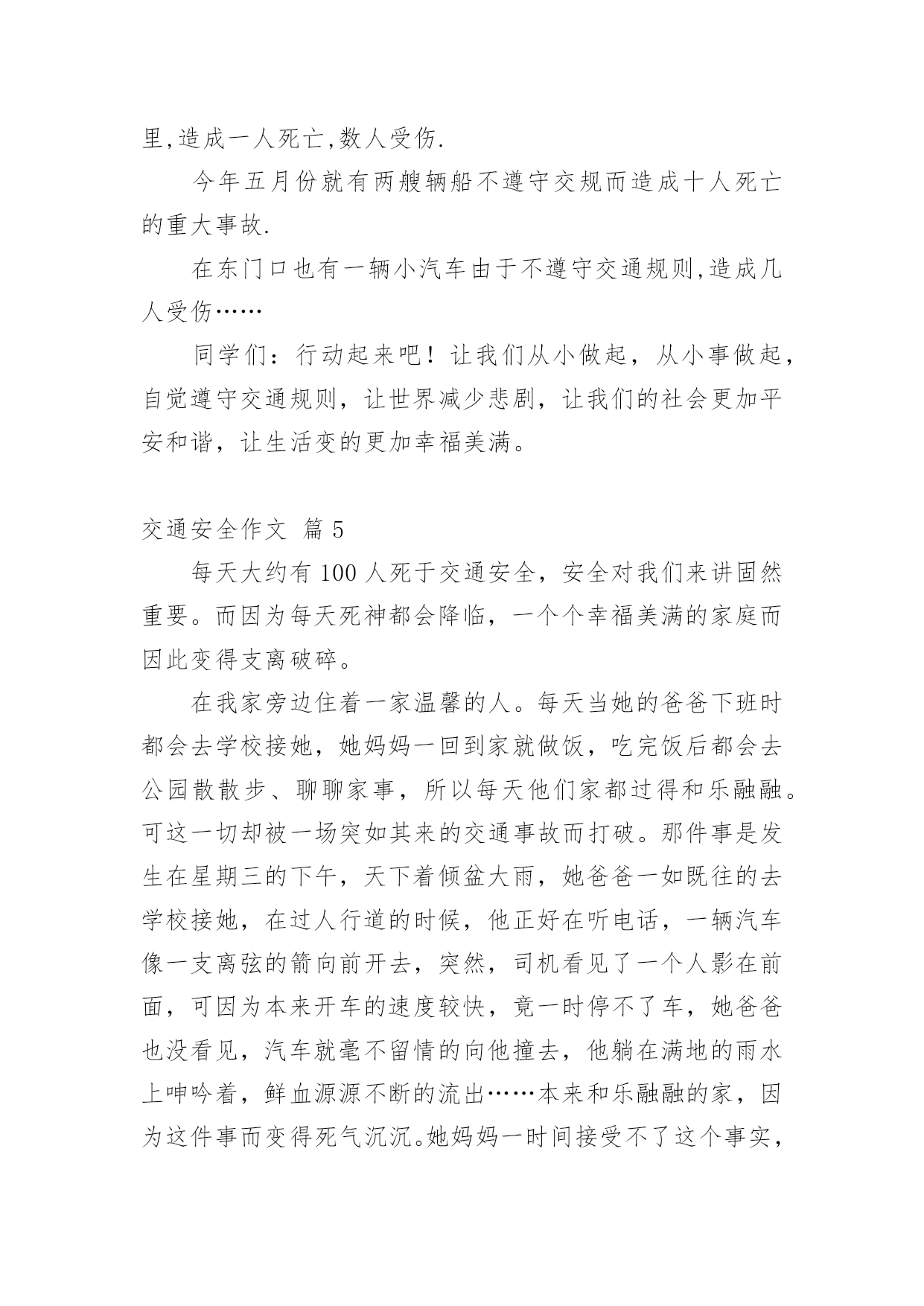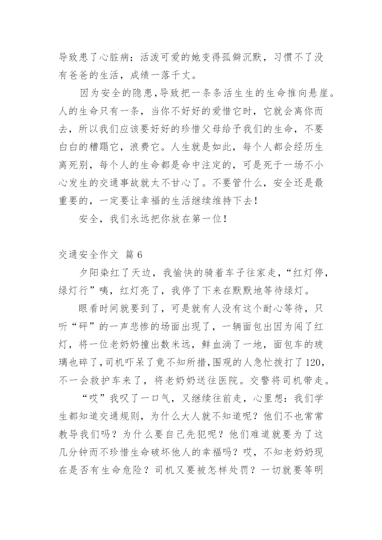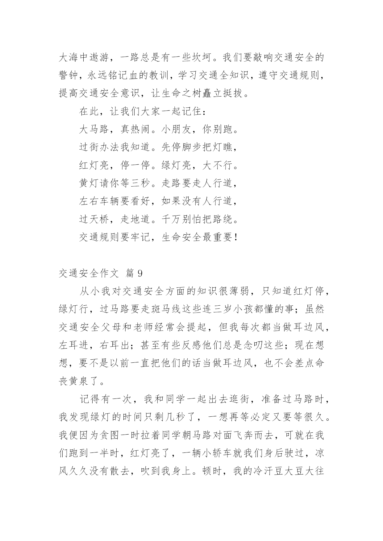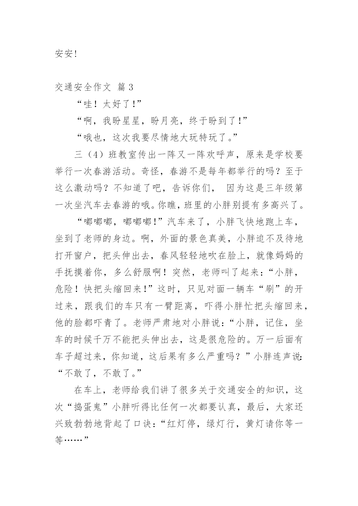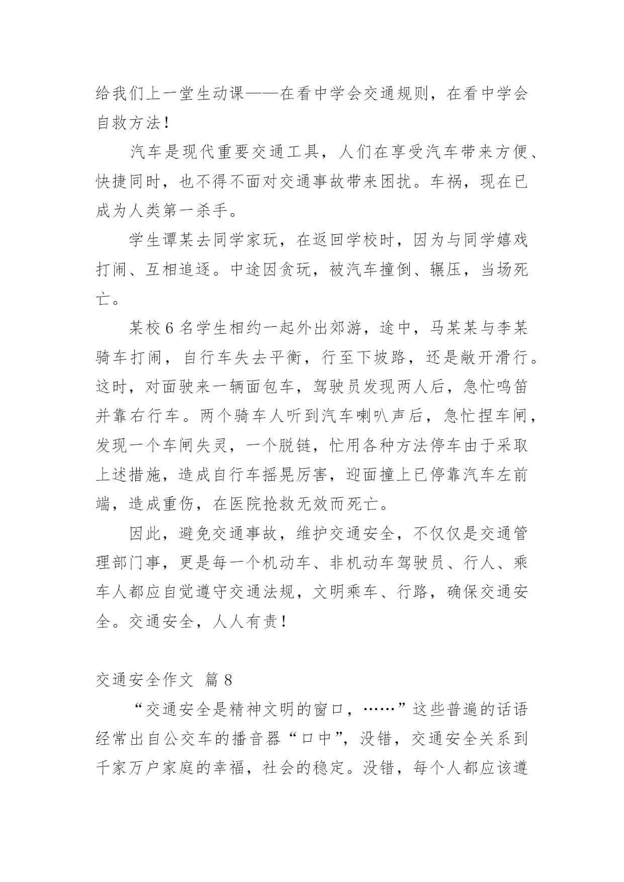 交通安全作文【精品】交通安全作文汇编十篇在日常学习、工作抑或是生活中,大家都写过作文,肯定对各类作文都很熟悉吧,根据写作命题的特点,作文可以分为命题作文和非命题作文。一篇什么样的作文才能称之为优秀作文呢?以下是小编为大家整理的交通安全作文10篇,仅供参考,大家一起来看看吧。交通安全作文篇1人让车,让出一片温情,让出一片秩序;车让人,让出一片安全,让出一片理解。在这个世界上,只有人与车互相谦让,才能尽可能地避免交通事故的发生,减少死亡的人数,珍爱宝贵的生命。生命是惟一的,是宝贵的,世界因为有了生命而变的精彩。您的生命,您珍惜吗?要想生命得到保障,那就请您遵守交通规则,维护交通秩序。交通安全作文篇2铁路在我们的生活中有着不可缺少的地位,但近几年来,全国各地铁路事故屡屡发生,很大程度上是由于乘客缺乏必要的安全知识。安全与生命紧紧相连,有些人就是因为不注意安全才受到了血的教训。以前在电视看到过一个新闻:两辆高铁不小心发生了相撞,导致39人死亡,192人受伤,造成了惨不忍睹的悲剧。但悲剧发生的根本原因在于地铁工作人员的工作作风使高铁安全存在漏洞。这件事不由地让人深深反思。很多人或许都这样想过:出事故这种事不可能会发生在我的身上。从而导致没有注意一系列的安全隐患,最后,要么受了些伤,要么甚至失去自己的生命!的确科技的突飞猛进给我们带来了不少的便利,不过我们也应该有足够的安全意识。在等待列车的时候,千万不要因为火车没停稳就着急上车或下车;乘火车或速度较快的车时不能把头伸出窗外,以免碰到一些硬的物体导致受伤;玩耍时,尽量不要选择靠近轨道的地方或轨道上进行以免过往的碰到列车,发生危险。新闻上经常会播出一些比如“某某高铁相撞、某某铁路发生事故了”等事例,我们要从这些事故中懂得安全的重要性,不要轻易让悲剧重演。其次,还要加强铁路知识,知道怎样的行为是对的,怎样是错的。我们要时刻记得,生命只有一次,只有平安才是最重要的。相信大家都在公路上看过一看、二慢、三通过,那在铁路上也是一样。记得小时候,周围的人就总是说:“不能到马路上去玩啊!”,而在铁路上又何尝不一样呢?最后,想要告诉大家的就是:“安全防范,人人有责”不应该只是一句口号。人的生命是宝贵而短暂的,大家都应该珍惜生命,远离事故,让“安全”这个永恒的主题深深烙印在我们每一个人的脑海!让我们的每一天,每一刻都平平安安!交通安全作文篇3“哇!太好了!”“啊,我盼星星,盼月亮,终于盼到了!”“哦也,这次我要尽情地大玩特玩了。”三(4)班教室传出一阵又一阵欢呼声,原来是学校要举行一次春游活动。奇怪,春游不是每年都举行的吗?至于这么激动吗?不知道了吧,告诉你们,因为这是三年级第一次坐汽车去春游的哦。你瞧,班里的小胖别提有多高兴了。“嘟嘟嘟,嘟嘟嘟!”汽车来了,小胖飞快地跑上车,坐到了老师的身边。啊,外面的景色真美,小胖迫不及待地打开窗户,把头伸出去,春风轻轻地吹在脸上,就像妈妈的手抚摸着你,多么舒服啊!突然,老师叫了起来:“小胖,危险!快把头缩回来!”这时,只见对面一辆车“刷”的开过来,跟我们的车只有一臂距离,吓得小胖忙把头缩回来,他的脸都吓青了。老师严肃地对小胖说:“小胖,记住,坐车的时候千万不能把头伸出去,这是很危险的。万一后面有车子超过来,你知道,这后果有多么严重吗?”小胖连声说:“不敢了,不敢了。”在车上,老师给我们讲了很多关于交通安全的知识,这次“捣蛋鬼”小胖听得比任何一次都要认真,最后,大家还兴致勃勃地背起了口诀:“红灯停,绿灯行,黄灯请你等一等……”交通安全作文篇4幼时交通知识的童谣,我都能倒背如流.稍大一些时,我上了小学,老师也告诉我们:人车各行其道,走路要走人行道,要靠右边,穿过马路要走斑马线,红灯停,绿灯行。随着经济繁荣的发展,交通事业迅猛发达,车辆川流不息地在公路上行驶,交通事故时常走进我们的生活,直接面对,而无法回避。因此,交通安全,人人须知,而我就有过这样的经历。记得有一次,下午放学的时候,我和表姐手挽手一起回家.当走到表姐家对面的街头时,需要绕道过马路,我和表姐想都没想,就想直接过马路.我们连左右的车辆都没看就奔了过去.正当我们奔到马路中央时,突然一辆摩托车飞驰而来,只差几厘米就把我和表姐撞倒了.当时,我吓得只打多哆嗦,表姐也吓得楞在了马路中央.那个骑摩托车的叔叔"嗖"的一声就把车停了下来,严厉的对我们说"小朋友,以后过马路的时候千万不要横穿马路,要先看左右的车辆,要等车辆过了才能过去,你们记住了!"从那以后,我就深刻的意识到遵守交通规则的重要性。爸爸曾告诉我,有些人抱着侥幸的心理。认为就一次不遵守交通规则没关系,不会出问题。但是,正因为他们有这样的心理,才会出现车祸惨象,也使人间少了多少的欢乐和笑声?是呀!多少家庭由于违反交通规则而惨遭人间悲剧:今年大年初一一辆汽车超速驾车就
