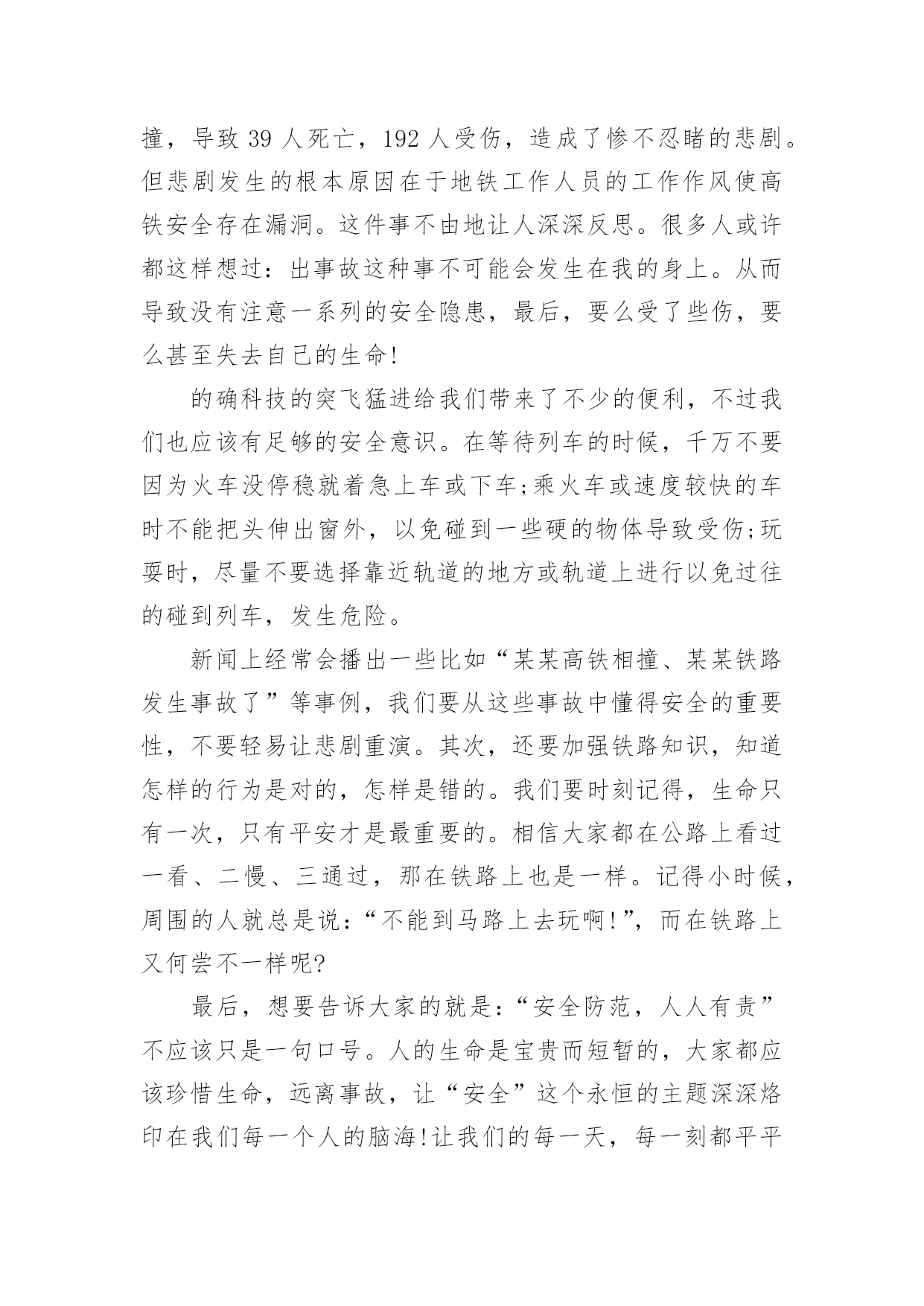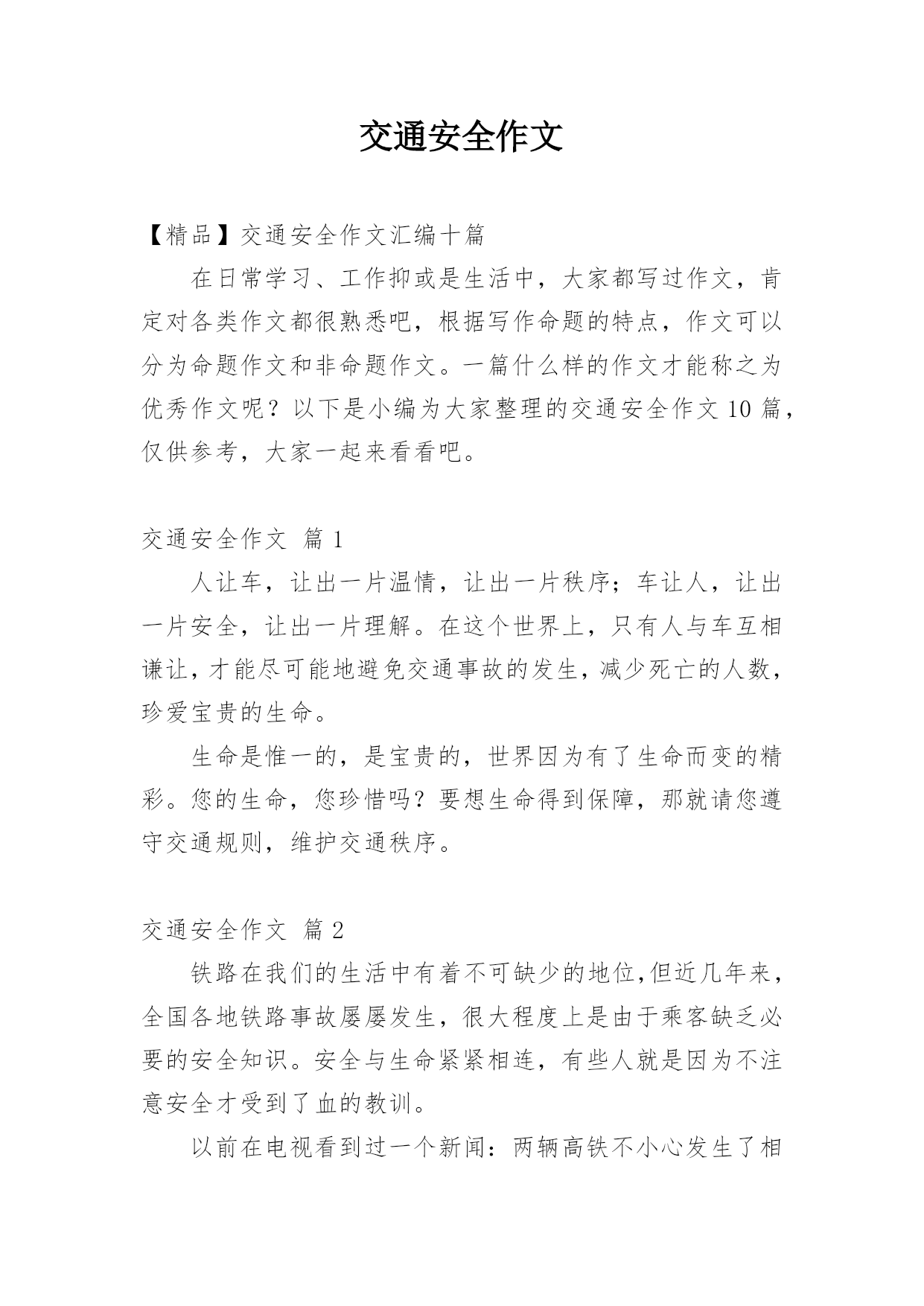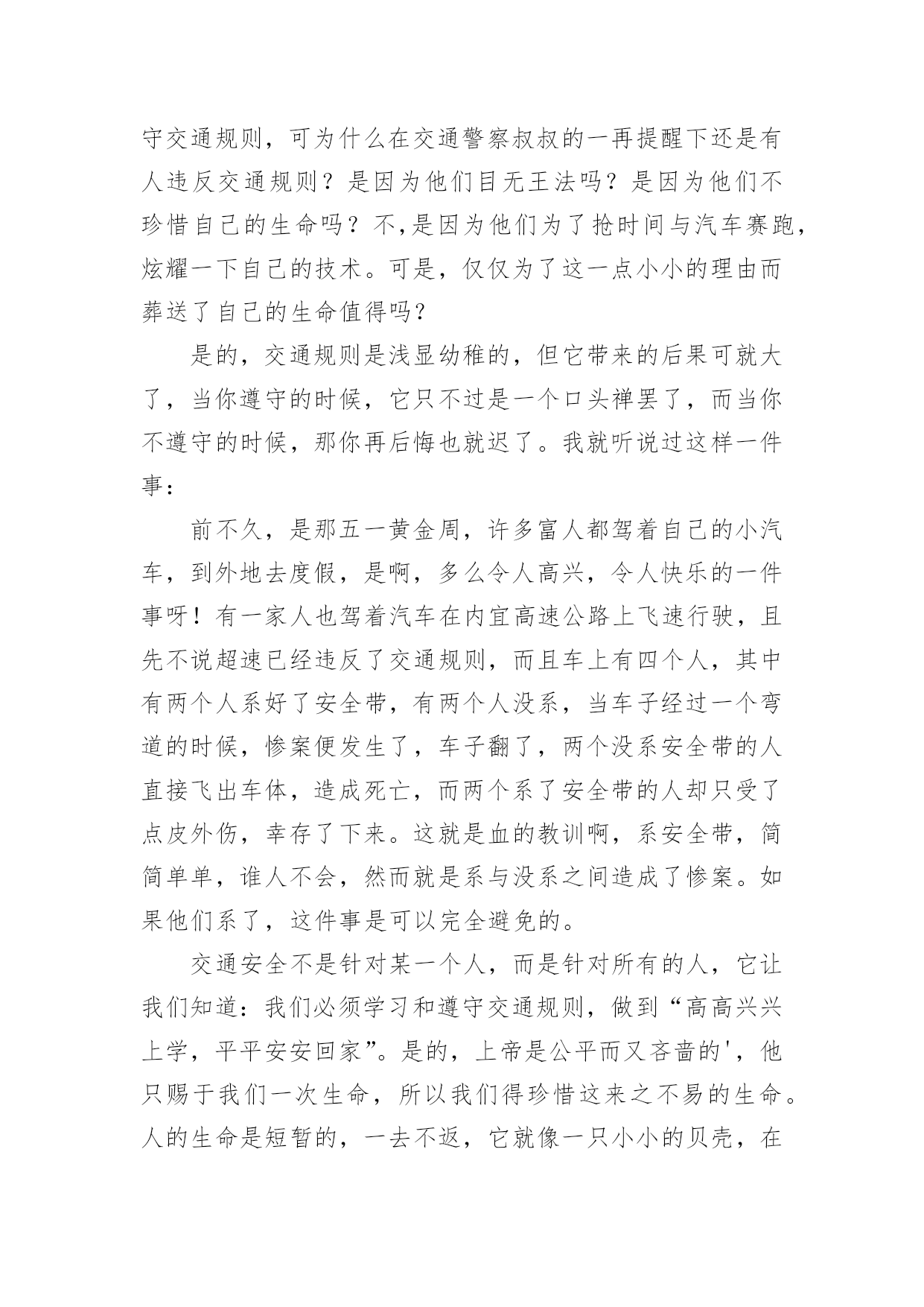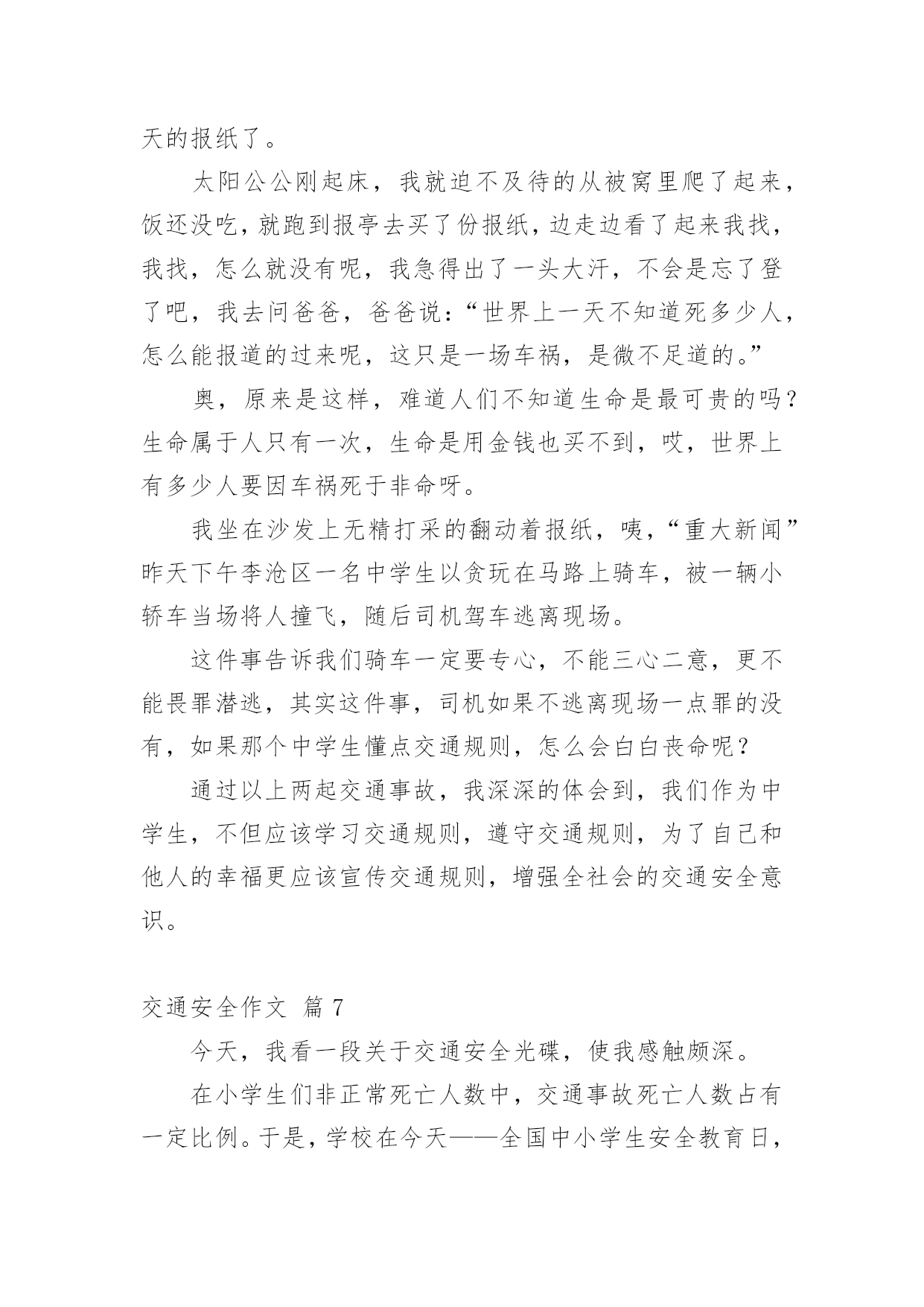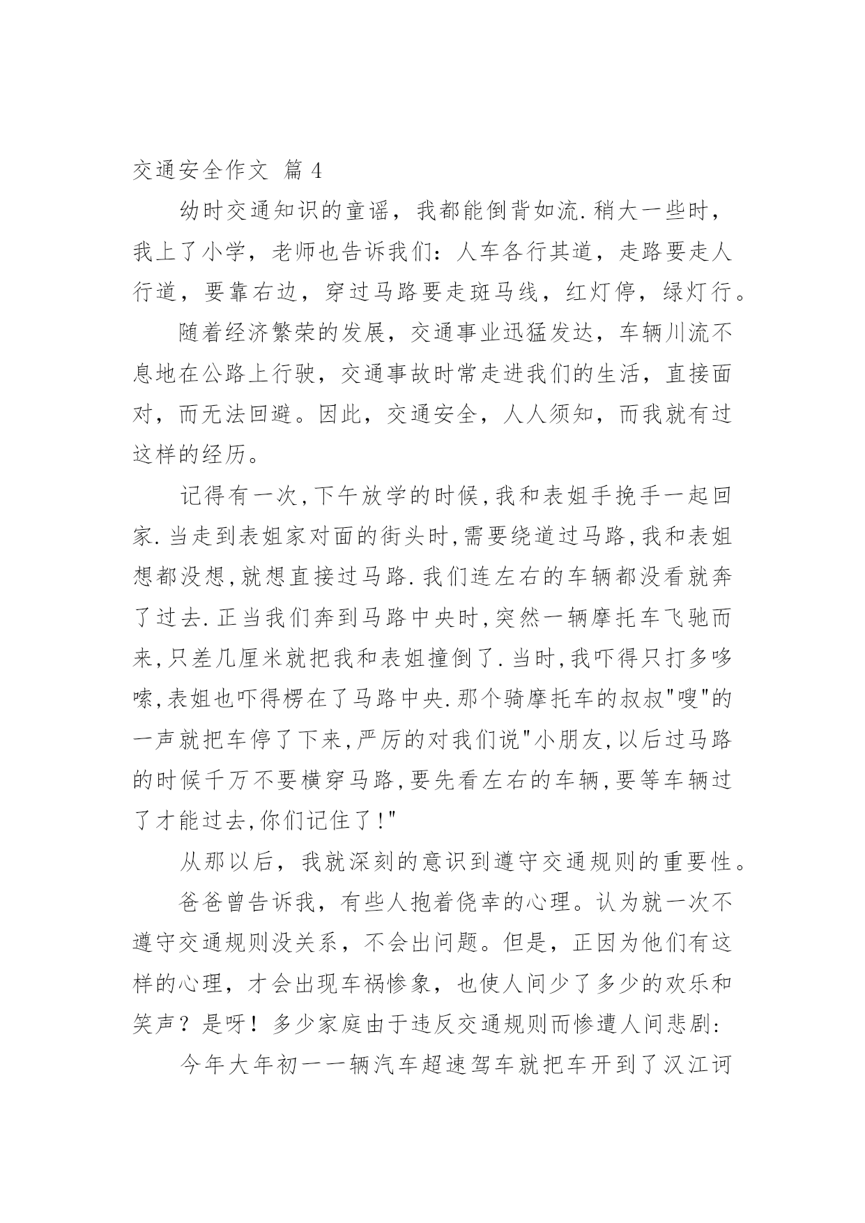 交通安全作文【精品】交通安全作文汇编十篇在日常学习、工作抑或是生活中,大家都写过作文,肯定对各类作文都很熟悉吧,根据写作命题的特点,作文可以分为命题作文和非命题作文。一篇什么样的作文才能称之为优秀作文呢?以下是小编为大家整理的交通安全作文10篇,仅供参考,大家一起来看看吧。交通安全作文篇1人让车,让出一片温情,让出一片秩序;车让人,让出一片安全,让出一片理解。在这个世界上,只有人与车互相谦让,才能尽可能地避免交通事故的发生,减少死亡的人数,珍爱宝贵的生命。生命是惟一的,是宝贵的,世界因为有了生命而变的精彩。您的生命,您珍惜吗?要想生命得到保障,那就请您遵守交通规则,维护交通秩序。交通安全作文篇2铁路在我们的生活中有着不可缺少的地位,但近几年来,全国各地铁路事故屡屡发生,很大程度上是由于乘客缺乏必要的安全知识。安全与生命紧紧相连,有些人就是因为不注意安全才受到了血的教训。以前在电视看到过一个新闻:两辆高铁不小心发生了相撞,导致39人死亡,192人受伤,造成了惨不忍睹的悲剧。但悲剧发生的根本原因在于地铁工作人员的工作作风使高铁安全存在漏洞。这件事不由地让人深深反思。很多人或许都这样想过:出事故这种事不可能会发生在我的身上。从而导致没有注意一系列的安全隐患,最后,要么受了些伤,要么甚至失去自己的生命!的确科技的突飞猛进给我们带来了不少的便利,不过我们也应该有足够的安全意识。在等待列车的时候,千万不要因为火车没停稳就着急上车或下车;乘火车或速度较快的车时不能把头伸出窗外,以免碰到一些硬的物体导致受伤;玩耍时,尽量不要选择靠近轨道的地方或轨道上进行以免过往的碰到列车,发生危险。新闻上经常会播出一些比如“某某高铁相撞、某某铁路发生事故了”等事例,我们要从这些事故中懂得安全的重要性,不要轻易让悲剧重演。其次,还要加强铁路知识,知道怎样的行为是对的,怎样是错的。我们要时刻记得,生命只有一次,只有平安才是最重要的。相信大家都在公路上看过一看、二慢、三通过,那在铁路上也是一样。记得小时候,周围的人就总是说:“不能到马路上去玩啊!”,而在铁路上又何尝不一样呢?最后,想要告诉大家的就是:“安全防范,人人有责”不应该只是一句口号。人的生命是宝贵而短暂的,大家都应该珍惜生命,远离事故,让“安全”这个永恒的主题深深烙印在我们每一个人的脑海!让我们的每一天,每一刻都平平安安!交通安全作文篇3“哇!太好了!”“啊,我盼星星,盼月亮,终于盼到了!”“哦也,这次我要尽情地大玩特玩了。”三(4)班教室传出一阵又一阵欢呼声,原来是学校要举行一次春游活动。奇怪,春游不是每年都举行的吗?至于这么激动吗?不知道了吧,告诉你们,因为这是三年级第一次坐汽车去春游的哦。你瞧,班里的小胖别提有多高兴了。“嘟嘟嘟,嘟嘟嘟!”汽车来了,小胖飞快地跑上车,坐到了老师的身边。啊,外面的景色真美,小胖迫不及待地打开窗户,把头伸出去,春风轻轻地吹在脸上,就像妈妈的手抚摸着你,多么舒服啊!突然,老师叫了起来:“小胖,危险!快把头缩回来!”这时,只见对面一辆车“刷”的开过来,跟我们的车只有一臂距离,吓得小胖忙把头缩回来,他的脸都吓青了。老师严肃地对小胖说:“小胖,记住,坐车的时候千万不能把头伸出去,这是很危险的。万一后面有车子超过来,你知道,这后果有多么严重吗?”小胖连声说:“不敢了,不敢了。”在车上,老师给我们讲了很多关于交通安全的知识,这次“捣蛋鬼”小胖听得比任何一次都要认真,最后,大家还兴致勃勃地背起了口诀:“红灯停,绿灯行,黄灯请你等一等……”交通安全作文篇4幼时交通知识的童谣,我都能倒背如流.稍大一些时,我上了小学,老师也告诉我们:人车各行其道,走路要走人行道,要靠右边,穿过马路要走斑马线,红灯停,绿灯行。随着经济繁荣的发展,交通事业迅猛发达,车辆川流不息地在公路上行驶,交通事故时常走进我们的生活,直接面对,而无法回避。因此,交通安全,人人须知,而我就有过这样的经历。记得有一次,下午放学的时候,我和表姐手挽手一起回家.当走到表姐家对面的街头时,需要绕道过马路,我和表姐想都没想,就想直接过马路.我们连左右的车辆都没看就奔了过去.正当我们奔到马路中央时,突然一辆摩托车飞驰而来,只差几厘米就把我和表姐撞倒了.当时,我吓得只打多哆嗦,表姐也吓得楞在了马路中央.那个骑摩托车的叔叔"嗖"的一声就把车停了下来,严厉的对我们说"小朋友,以后过马路的时候千万不要横穿马路,要先看左右的车辆,要等车辆过了才能过去,你们记住了!"从那以后,我就深刻的意识到遵守交通规则的重要性。爸爸曾告诉我,有些人抱着侥幸的心理。认为就一次不遵守交通规则没关系,不会出问题。但是,正因为他们有这样的心理,才会出现车祸惨象,也使人间少了多少的欢乐和笑声?是呀!多少家庭由于违反交通规则而惨遭人间悲剧:今年大年初一一辆汽车超速驾车就