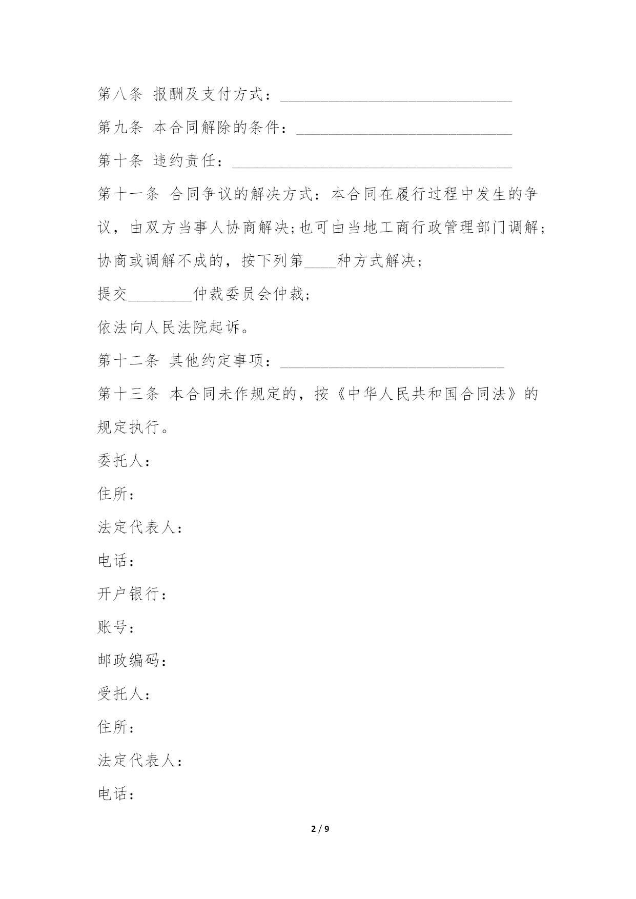 PAGE9/NUMPAGES9司法鉴定委托合同委托合是将自己的权利委托他人行使,签订司法鉴定委托合同需要注意什么呢?以下是查字典我为大家整理的司法鉴定委托合同范文,欢迎参考阅读。司法鉴定委托合同范文篇一委托人:____________________签订地点:_________________________受托人:____________________签订时间:________年______月______日第一条委托人委托受托人处理________________事务的。第二条受托人处理委托事务的权限与具体要求_____________________________________第三条委托期限自____年____月____日至____年____月____日止。第四条委托人允许受托人把委托处理的事务转委托给第三人处理。第五条受托人有将委托事务处理情况向委托方报告的义务。第六条受托人将处理委托事务所取得的财产转交给委托人的时间、地点及方式____________第七条委托人支付受托人处理委托事务所付费用的时间、方式:________________________第八条报酬及支付方式:_____________________________第九条本合同解除的条件:___________________________第十条违约责任:___________________________________第十一条合同争议的解决方式:本合同在履行过程中发生的争议,由双方当事人协商解决;也可由当地工商行政管理部门调解;协商或调解不成的,按下列第____种方式解决;提交________仲裁委员会仲裁;依法向人民法院起诉。第十二条其他约定事项:____________________________第十三条本合同未作规定的,按《中华人民共和国合同法》的规定执行。委托人:住所:法定代表人:电话:开户银行:账号:邮政编码:受托人:住所:法定代表人:电话:开户银行:账号:邮政编码:司法鉴定委托合同范文篇二甲方:_________________乙方:_________________甲、乙双方经协商达成以下合同:1.甲方委托乙方代理a.高新技术企业资格认定;代理费_________元人民币b.内资企业工商登记注册;代理费_________元人民币c.税务登记等手续;代理费____元人民币d.一般纳税人登记;代理费_________元人民币e.外商独资高新技术企业立项审批、工商登记注册;代理费_________元人民币f.中外合资高新技术企业立项审批、工商登记注册;代理费_________元人民币g.企业变更登记、改制登记、内、外资互转变更登记;代理费_________元人民币h.网上申报内资高新技术企业资格复核;代理费_________元人民币i.网上申报新产品认证;代理费_________元人民币j.软件产品著作权登记;代理费_________元人民币k.双软认定;代理费_________元人民币l.申报自营进出口权代理费_________元人民币m.申报财政、统计月报;代理费_________元人民币n.其他_________________________________________。合计收费_________元人民币2.甲方负责向乙方提供申办企业的原始材料、相关资料、计算机用户名及密码,并保证在程序规定的时间内及时签字、盖章。3.甲方应对所提供材料的真实性承担相应的法律责任。4.乙方负责向甲方提供所需材料清单,负责整理和起草申办企业的有关文件,并负责提供相关政策、法规的咨询服务。5.乙方应在甲方提供材料齐备的情况下,尽快完成申办材料的起草、组织、上网、装订、催办等工作,并按规定的期限完成委托代理事项。6.甲方在委托代理的同时应付给乙方委托事项总金额的50%款项,甲方在取得工商执照或其他委托事项完成后,再付给乙方其余款项。7.甲方可按以下方式向乙方支付相关费用:a.以汇款方式汇入乙方帐户,并及时将汇票传真给乙方;b.以支票或现金方式直接到办公地点支付和结算。8.遇有特殊情况或合同未尽事宜,双方另行协商解决。甲方:_________代表人:________________年____月____日乙方:_________代表人:________________年____月____日司法鉴定委托合同范文篇三委托方:____________________受托方:____________________双方经协商一致就委托事务达成如下协议:一、委托事项受托方授权受托方办理有关购买________的各项事宜。二、委托授权范围1.购买________________。2.________的购入价应掌握在人民币_______