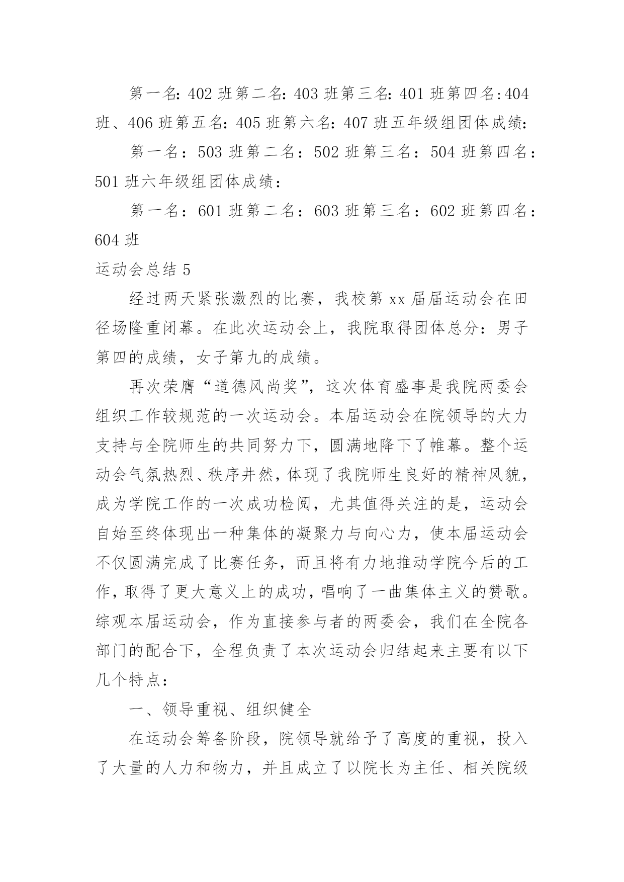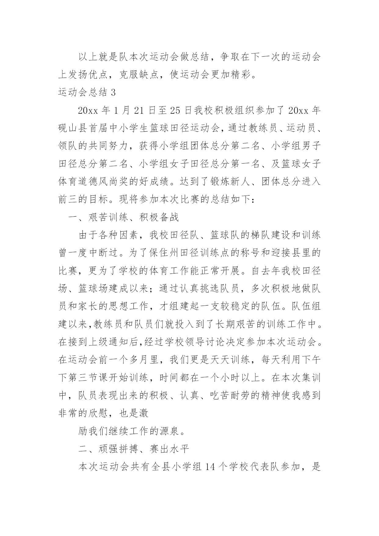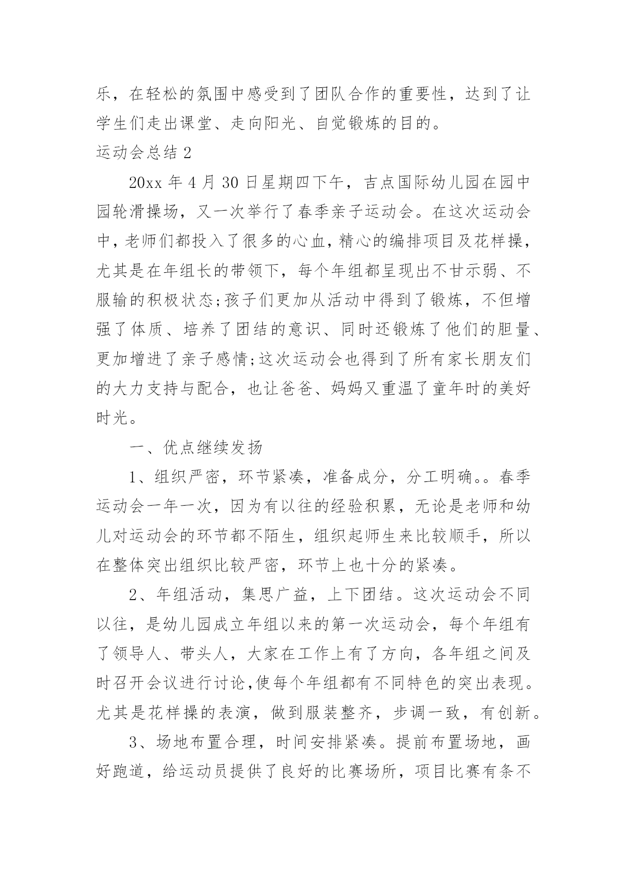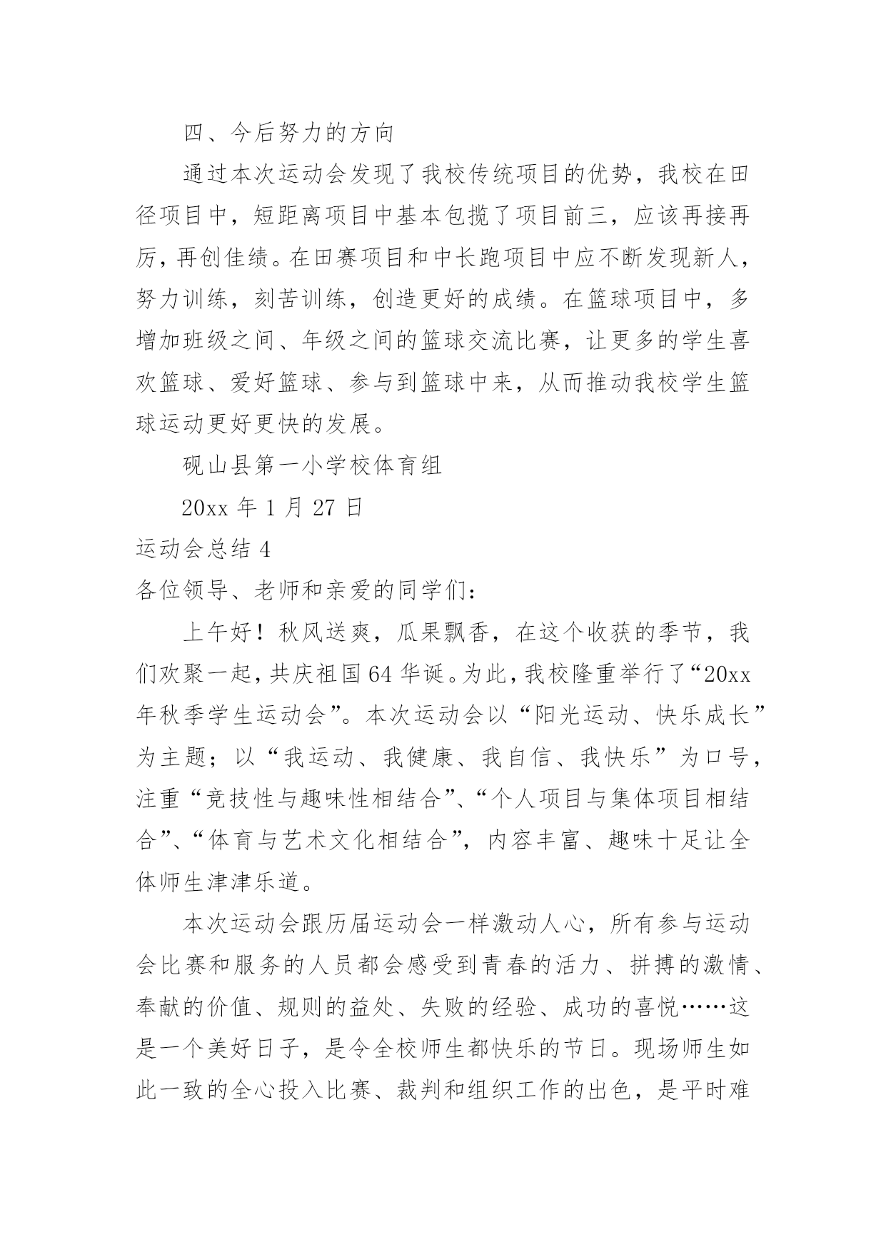 运动会总结运动会总结总结是把一定阶段内的有关情况分析研究,做出有指导性结论的书面材料,它可以促使我们思考,因此,让我们写一份总结吧。你所见过的总结应该是什么样的?下面是小编为大家整理的运动会总结,供大家参考借鉴,希望可以帮助到有需要的朋友。运动会总结1在元旦来临之际,华宇实验小学举办了庆元旦首届亲子趣味运动会,六十余名学生运动员和六十余名家长尽情享受运动的快乐,运动场成了欢乐的海洋。二十名少先队员的入队仪式及队旗下的宣誓,赢得了在场领导和家长的阵阵掌声。简短而隆重的开幕式后,随着裁判长的一声号令,趣味运动会的各项比赛也紧锣密鼓地开始了,“一分钟跳绳”、“运球赛跑”“夹球比赛”,一个个富有趣味的比赛吸引着学生和家长们的参与,校园里此起彼伏的欢呼声、喝彩声、加油声不绝于耳。本次运动会以“我运动、我健康、我快乐”为宗旨,变“竞技”为“娱乐”,改“精英展现”为“全员参与”,精心设计了学生喜欢的运动项目,是学校开展阳光体育的一次大检阅,为同学们搭建了一个参与运动、强身健体、享受快乐的舞台,让孩子们在紧张的学习生活之余体会到了运动的快乐,在轻松的氛围中感受到了团队合作的重要性,达到了让学生们走出课堂、走向阳光、自觉锻炼的目的。运动会总结220xx年4月30日星期四下午,吉点国际幼儿园在园中园轮滑操场,又一次举行了春季亲子运动会。在这次运动会中,老师们都投入了很多的心血,精心的编排项目及花样操,尤其是在年组长的带领下,每个年组都呈现出不甘示弱、不服输的积极状态;孩子们更加从活动中得到了锻炼,不但增强了体质、培养了团结的意识、同时还锻炼了他们的胆量、更加增进了亲子感情;这次运动会也得到了所有家长朋友们的大力支持与配合,也让爸爸、妈妈又重温了童年时的美好时光。一、优点继续发扬1、组织严密,环节紧凑,准备成分,分工明确。。春季运动会一年一次,因为有以往的经验积累,无论是老师和幼儿对运动会的环节都不陌生,组织起师生来比较顺手,所以在整体突出组织比较严密,环节上也十分的紧凑。2、年组活动,集思广益,上下团结。这次运动会不同以往,是幼儿园成立年组以来的第一次运动会,每个年组有了领导人、带头人,大家在工作上有了方向,各年组之间及时召开会议进行讨论,使每个年组都有不同特色的突出表现。尤其是花样操的表演,做到服装整齐,步调一致,有创新。3、场地布置合理,时间安排紧凑。提前布置场地,画好跑道,给运动员提供了良好的比赛场所,项目比赛有条不紊,分场内、场外同时进行,没出现时间拖沓的现象。整体上,时间安排的比较紧紧凑。4、家长的积极配合。今年的家长给孩子做出了突出的榜样作用,家长的队伍很庞大,分成爸爸、妈妈方队和爷爷、奶奶方队,家长们得到通知都积极响应,随时听从园里的安排。5、运动会的举办,为幼儿园创造了良好的社会影响力。6、运动会进行期间,在精心合理的组织,及家长和老师的共同努力下,未发生任何安全事故。7、会场秩序良好,不凌乱。会场上井然有序,随时听从会场工作人员的安排。二、存在的缺点及改正方法1、在细节中出现小漏洞如:各年组在比赛过程中,各班老师只关注本班幼儿,不能照顾到全体,因此应添加裁判员,裁判员的人选从其他年组的老师里出。2、在奖品的准备上,不够充分,出现分配奖品不到位的情况。导致个别项目的家长在奖品分配上出现分歧。3、由于某个班级派有家长代表,帮助老师管理一些事宜,但是家长代表的工作任务安排的不明确,导致其他家长的误解。4、还有个别的比赛项目安排的不够缜密。如:轮滑项目不够丰富,孩子们的轮滑风采没有得到充分的体现。5、在运动会结束后,没有闭幕和师生合影。以上就是队本次运动会做总结,争取在下一次的运动会上发扬优点,克服缺点,使运动会更加精彩。运动会总结320xx年1月21日至25日我校积极组织参加了20xx年砚山县首届中小学生篮球田径运动会,通过教练员、运动员、领队的共同努力,获得小学组团体总分第二名、小学组男子田径总分第二名、小学组女子田径总分第一名、及篮球女子体育道德风尚奖的好成绩。达到了锻炼新人、团体总分进入前三的目标。现将参加本次比赛的总结如下:一、艰苦训练、积极备战由于各种因素,我校田径队、篮球队的梯队建设和训练曾一度中断过。为了保住州田径训练点的称号和迎接县里的比赛,更为了学校的体育工作能正常开展。自去年我校田径场、篮球场建成以来;通过认真挑选队员,多次积极地做队员和家长的思想工作,才组建起一支较稳定的队伍。队伍组建以来,教练员和队员们就投入到了长期艰苦的训练工作中。在接到上级通知后,经过学校领导讨论决定参加本次运动会。在运动会前一个多月里,我们更是天天训练,每天利用下午下第三节课开始训练,时间都在一个小时以上。在本次集训中,队员表现出来的积极、认真、吃苦耐劳的精神使我感到非常的欣慰,也是激励我们继续工作的源泉。二、顽强拼搏、赛出水平本次运