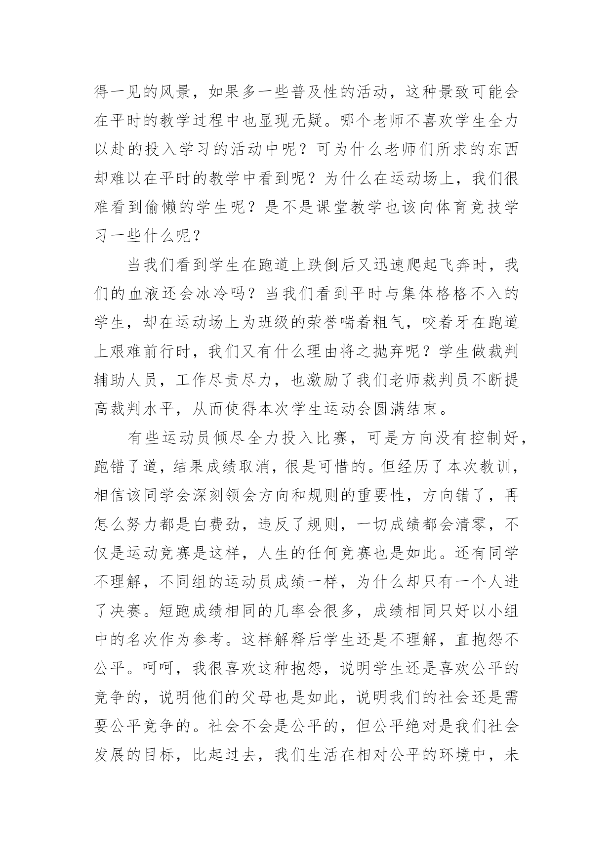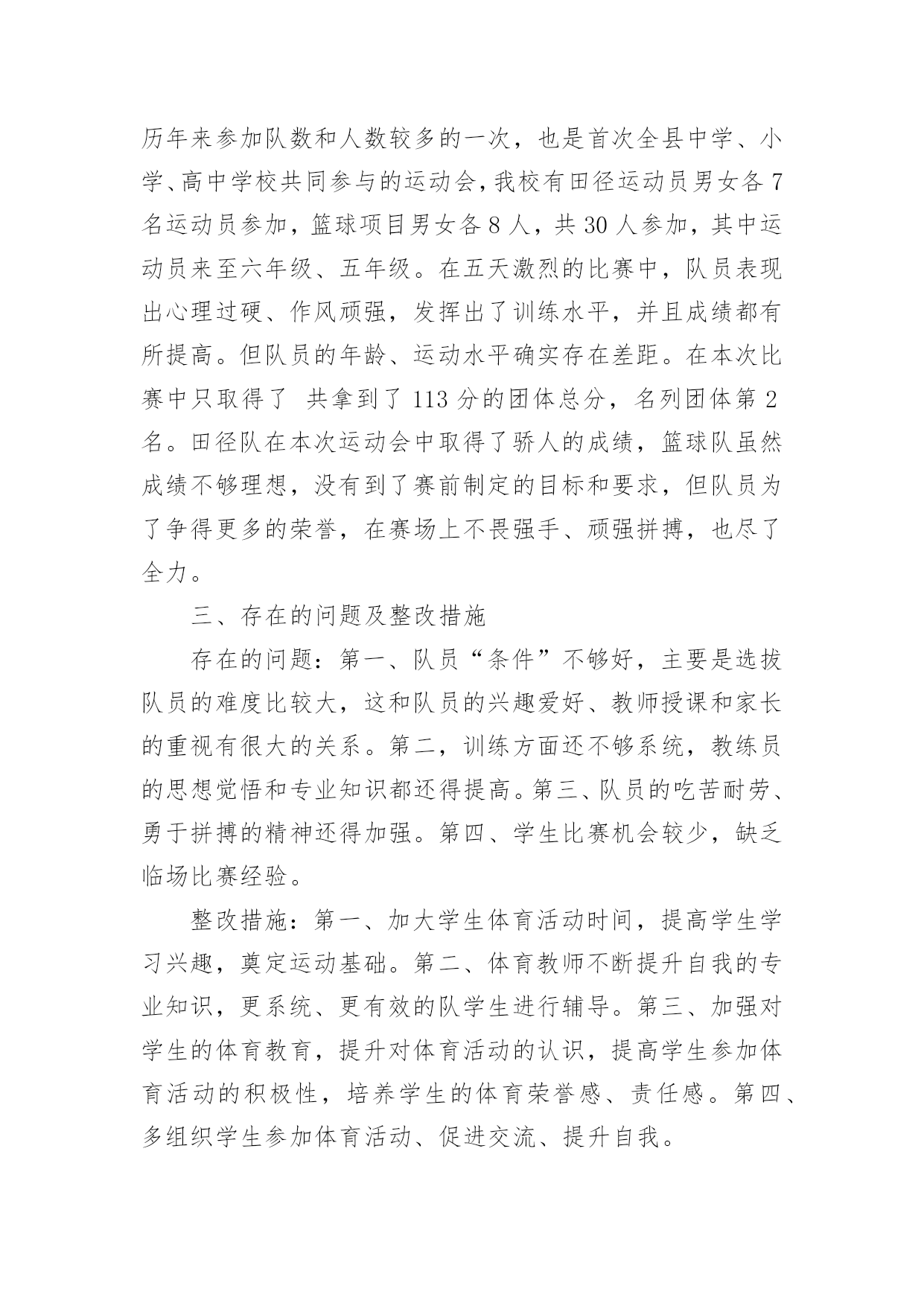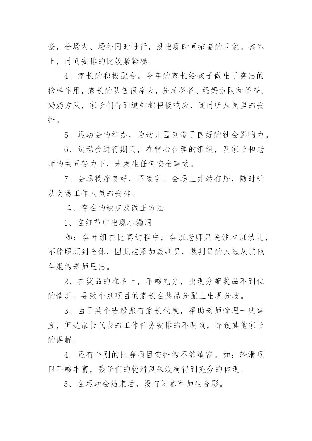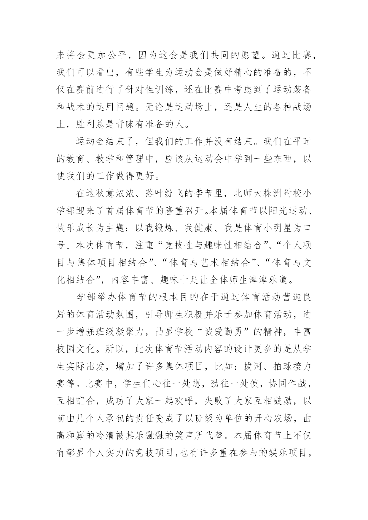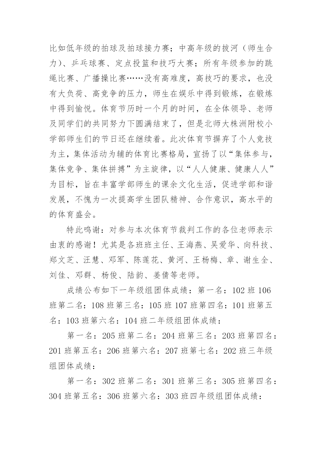 运动会总结运动会总结总结是把一定阶段内的有关情况分析研究,做出有指导性结论的书面材料,它可以促使我们思考,因此,让我们写一份总结吧。你所见过的总结应该是什么样的?下面是小编为大家整理的运动会总结,供大家参考借鉴,希望可以帮助到有需要的朋友。运动会总结1在元旦来临之际,华宇实验小学举办了庆元旦首届亲子趣味运动会,六十余名学生运动员和六十余名家长尽情享受运动的快乐,运动场成了欢乐的海洋。二十名少先队员的入队仪式及队旗下的宣誓,赢得了在场领导和家长的阵阵掌声。简短而隆重的开幕式后,随着裁判长的一声号令,趣味运动会的各项比赛也紧锣密鼓地开始了,“一分钟跳绳”、“运球赛跑”“夹球比赛”,一个个富有趣味的比赛吸引着学生和家长们的参与,校园里此起彼伏的欢呼声、喝彩声、加油声不绝于耳。本次运动会以“我运动、我健康、我快乐”为宗旨,变“竞技”为“娱乐”,改“精英展现”为“全员参与”,精心设计了学生喜欢的运动项目,是学校开展阳光体育的一次大检阅,为同学们搭建了一个参与运动、强身健体、享受快乐的舞台,让孩子们在紧张的学习生活之余体会到了运动的快乐,在轻松的氛围中感受到了团队合作的重要性,达到了让学生们走出课堂、走向阳光、自觉锻炼的目的。运动会总结220xx年4月30日星期四下午,吉点国际幼儿园在园中园轮滑操场,又一次举行了春季亲子运动会。在这次运动会中,老师们都投入了很多的心血,精心的编排项目及花样操,尤其是在年组长的带领下,每个年组都呈现出不甘示弱、不服输的积极状态;孩子们更加从活动中得到了锻炼,不但增强了体质、培养了团结的意识、同时还锻炼了他们的胆量、更加增进了亲子感情;这次运动会也得到了所有家长朋友们的大力支持与配合,也让爸爸、妈妈又重温了童年时的美好时光。一、优点继续发扬1、组织严密,环节紧凑,准备成分,分工明确。。春季运动会一年一次,因为有以往的经验积累,无论是老师和幼儿对运动会的环节都不陌生,组织起师生来比较顺手,所以在整体突出组织比较严密,环节上也十分的紧凑。2、年组活动,集思广益,上下团结。这次运动会不同以往,是幼儿园成立年组以来的第一次运动会,每个年组有了领导人、带头人,大家在工作上有了方向,各年组之间及时召开会议进行讨论,使每个年组都有不同特色的突出表现。尤其是花样操的表演,做到服装整齐,步调一致,有创新。3、场地布置合理,时间安排紧凑。提前布置场地,画好跑道,给运动员提供了良好的比赛场所,项目比赛有条不紊,分场内、场外同时进行,没出现时间拖沓的现象。整体上,时间安排的比较紧紧凑。4、家长的积极配合。今年的家长给孩子做出了突出的榜样作用,家长的队伍很庞大,分成爸爸、妈妈方队和爷爷、奶奶方队,家长们得到通知都积极响应,随时听从园里的安排。5、运动会的举办,为幼儿园创造了良好的社会影响力。6、运动会进行期间,在精心合理的组织,及家长和老师的共同努力下,未发生任何安全事故。7、会场秩序良好,不凌乱。会场上井然有序,随时听从会场工作人员的安排。二、存在的缺点及改正方法1、在细节中出现小漏洞如:各年组在比赛过程中,各班老师只关注本班幼儿,不能照顾到全体,因此应添加裁判员,裁判员的人选从其他年组的老师里出。2、在奖品的准备上,不够充分,出现分配奖品不到位的情况。导致个别项目的家长在奖品分配上出现分歧。3、由于某个班级派有家长代表,帮助老师管理一些事宜,但是家长代表的工作任务安排的不明确,导致其他家长的误解。4、还有个别的比赛项目安排的不够缜密。如:轮滑项目不够丰富,孩子们的轮滑风采没有得到充分的体现。5、在运动会结束后,没有闭幕和师生合影。以上就是队本次运动会做总结,争取在下一次的运动会上发扬优点,克服缺点,使运动会更加精彩。运动会总结320xx年1月21日至25日我校积极组织参加了20xx年砚山县首届中小学生篮球田径运动会,通过教练员、运动员、领队的共同努力,获得小学组团体总分第二名、小学组男子田径总分第二名、小学组女子田径总分第一名、及篮球女子体育道德风尚奖的好成绩。达到了锻炼新人、团体总分进入前三的目标。现将参加本次比赛的总结如下:一、艰苦训练、积极备战由于各种因素,我校田径队、篮球队的梯队建设和训练曾一度中断过。为了保住州田径训练点的称号和迎接县里的比赛,更为了学校的体育工作能正常开展。自去年我校田径场、篮球场建成以来;通过认真挑选队员,多次积极地做队员和家长的思想工作,才组建起一支较稳定的队伍。队伍组建以来,教练员和队员们就投入到了长期艰苦的训练工作中。在接到上级通知后,经过学校领导讨论决定参加本次运动会。在运动会前一个多月里,我们更是天天训练,每天利用下午下第三节课开始训练,时间都在一个小时以上。在本次集训中,队员表现出来的积极、认真、吃苦耐劳的精神使我感到非常的欣慰,也是激励我们继续工作的源泉。二、顽强拼搏、赛出水平本次运