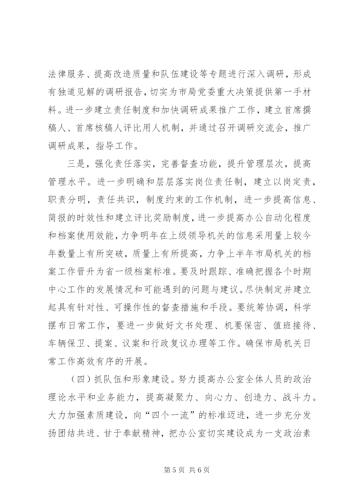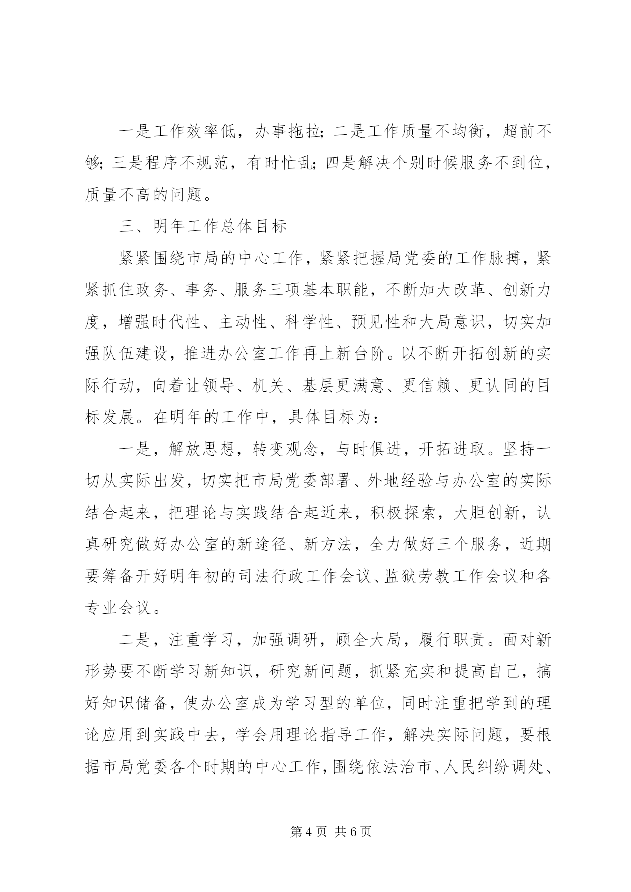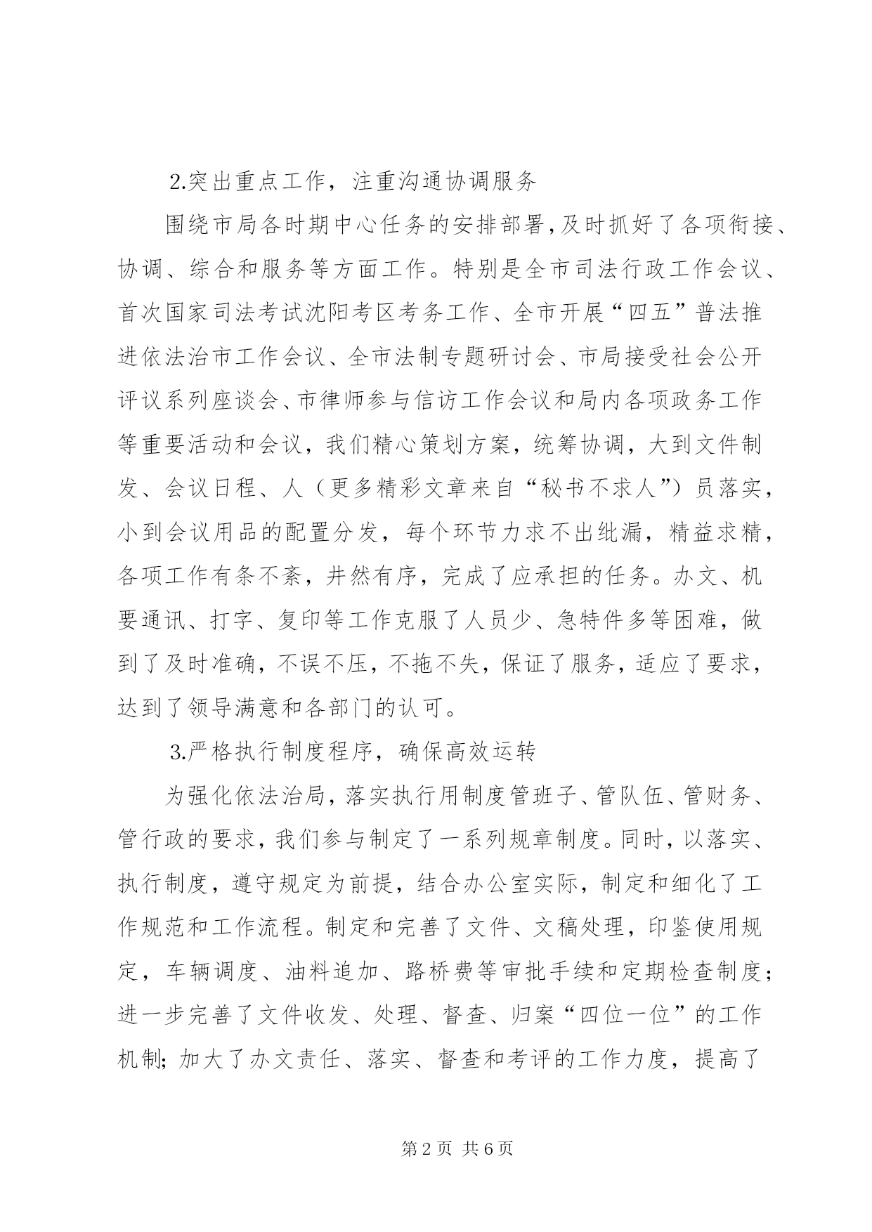 第PAGE\*Arabic\*MERGEFORMAT6页共NUMPAGES\*MERGEFORMAT6页司法局办公室主任述职报告某年是我被聘任为办公室主任的第三年。回顾一年来工作,深深感到,在市局党委的正确领导下,在各级领导的关怀下,同志们的大力支持下,紧紧围绕市局中心工作,牢固树立“服务为本”理念,恪尽职守,真抓实干,积极争创“四个一流”,各项业务工作取得了新的进展,达到了领导、机关、基层三个满意。现将一年来思想、体会和工作情况汇报如下:一、主要工作⒈加强文字综合,提高以文辅政水平我们不断强化对市局工作思路的把握和理解,注重提高行文质量,积极推进市局各项决策和部署的贯彻落实。前个月,共完成全市司法行政会议工作报告、“严打”整治斗争第一阶段总结、打击整治“”专项行动方案、市局机关和窗口单位接受社会公开评议实施方案、操作方案等全局性综合材料余份;完成《关于贯彻落实“·”市委政法工作会议精神的情况报告》、《关于编制我局二二年预算有关问题的说明》、《关于某年全局综合治理任务实施方案》、《关于做好“”类劳教人员收教转化防控工作所需经费的请示》等上报材料份;创设《沈司办通报》并制发期,《督查专报》期;制发《会议纪要》期;起草《市局行政工作规则》、《车辆管理使用办法》、《局域网管理办法》等规章制度多项;核稿件;完成打字、印刷余万字;接待上级单位及外地同行批人次。⒉突出重点工作,注重沟通协调服务围绕市局各时期中心任务的安排部署,及时抓好了各项衔接、协调、综合和服务等方面工作。特别是全市司法行政工作会议、首次国家司法考试沈阳考区考务工作、全市开展“四五”普法推进依法治市工作会议、全市法制专题研讨会、市局接受社会公开评议系列座谈会、市律师参与信访工作会议和局内各项政务工作等重要活动和会议,我们精心策划方案,统筹协调,大到文件制发、会议日程、人(更多精彩文章来自“秘书不求人”)员落实,小到会议用品的配置分发,每个环节力求不出纰漏,精益求精,各项工作有条不紊,井然有序,完成了应承担的任务。办文、机要通讯、打字、复印等工作克服了人员少、急特件多等困难,做到了及时准确,不误不压,不拖不失,保证了服务,适应了要求,达到了领导满意和各部门的认可。⒊严格执行制度程序,确保高效运转为强化依法治局,落实执行用制度管班子、管队伍、管财务、管行政的要求,我们参与制定了一系列规章制度。同时,以落实、执行制度,遵守规定为前提,结合办公室实际,制定和细化了工作规范和工作流程。制定和完善了文件、文稿处理,印鉴使用规定,车辆调度、油料追加、路桥费等审批手续和定期检查制度;进一步完善了文件收发、处理、督查、归案“四位一位”的工作机制;加大了办文责任、落实、督查和考评的工作力度,提高了办公自动化程度;明确了车辆管理运转、机关保卫、消防安全和环境建设的要求和责任。⒋积极转变作风,强化队伍和支部建设在新一轮思想解放学教活动中,我们深刻的体会到,对于既是全局中枢,又是窗口部门的办公室,必须在这方面花大力气,作全局的表率。根据市局的总体要求和部署,结合办公室人员多、分布广、工作责任大等特点,一是多次召开了各个层面的会议,研究工作,制定措施。除召开支部大会和全体人员会议外,以科为单位,查找思想、作风和工作上存在的差距和不足,逐项制定整改措施。如在办公室内部实行了“举牌制”,一次失职黄牌;第二次,年末不能评优。通过近一时期的努力,取得了较好效果,一些问题得到了切实解决。二是加大了学习力度。学教活动开展以来,在综合、秘书、督查、档案科开展了每周一次的政治、业务学习活动,在机关车队、总值班室开展了定期或不定期业务会议。这一做法我们将坚持开展下去。三是加强了形象建设。要求每一位同志,特别是处于窗口位置的同志,必须注重自己的工作态度和言行,确保在这方面不出现任何问题。前个月发展党员名,培养名。同时,注重发挥党员和骨干的模范带头作用。目前,办公室的工作质量和效率、整体和形象、纪律和作风得到了明显改善,形成了良好的发展态势。二、存在的主要问题一是工作效率低,办事拖拉;二是工作质量不均衡,超前不够;三是程序不规范,有时忙乱;四是解决个别时候服务不到位,质量不高的问题。三、明年工作总体目标紧紧围绕市局的中心工作,紧紧把握局党委的工作脉搏,紧紧抓住政务、事务、服务三项基本职能,不断加大改革、创新力度,增强时代性、主动性、科学性、预见性和大局意识,切实加强队伍建设,推进办公室工作再上新台阶。以不断开拓创新的实际行动,向着让领导、机关、基层更满意、更信赖、更认同的目标发展。在明年的工作中,具体目标为:一是,解放思想,转变观念,与时俱进,开拓进取。坚持一切从实际出发,切实把市局党委部署、外地经验与办公室的实际结合起来,把理论与实践结合起近来,积极探索,大胆创新,认真研究做好办公室的新途径、