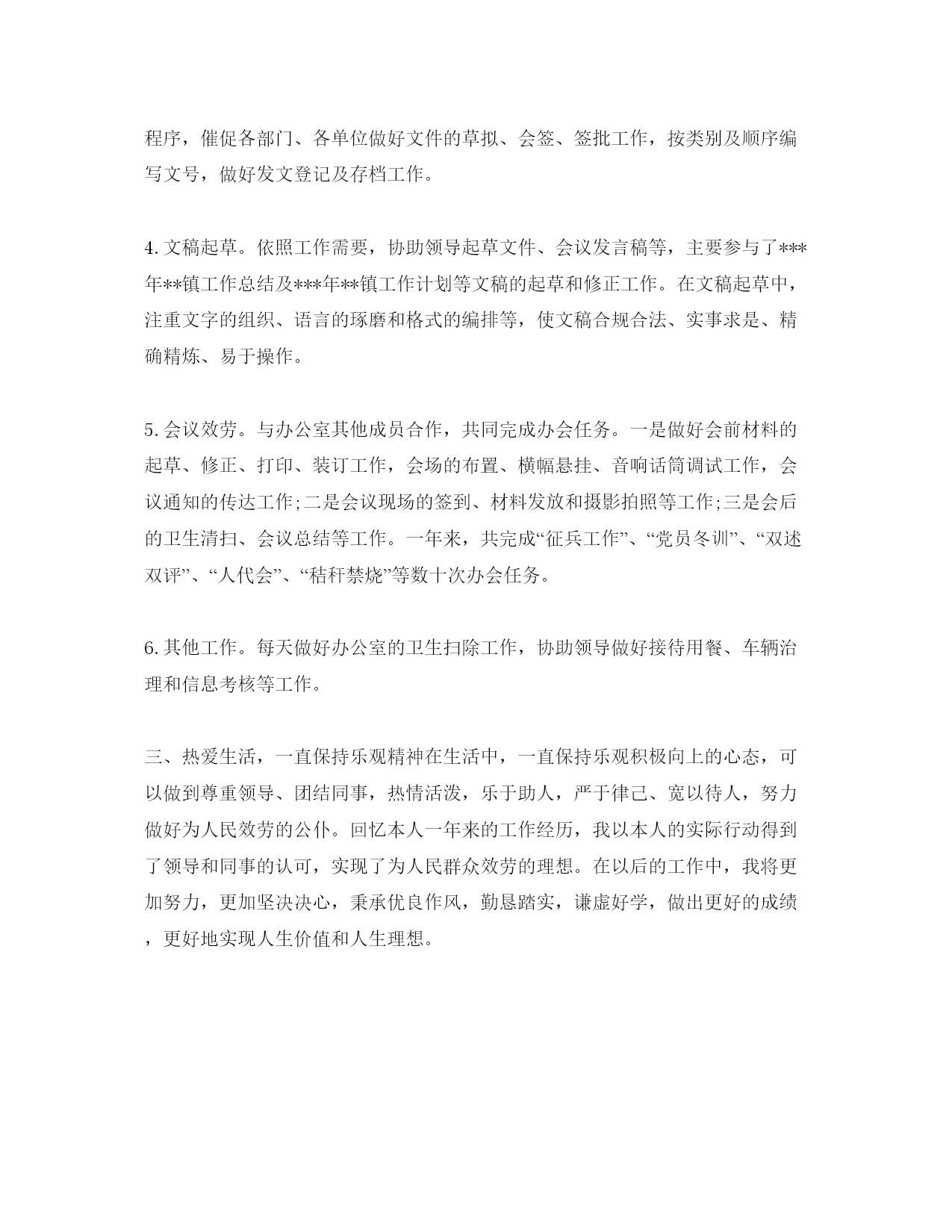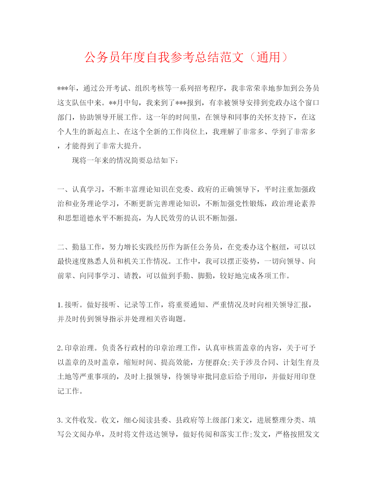 公务员年度自我参考总结范文(通用)***年,通过公开考试、组织考核等一系列招考程序,我非常荣幸地参加到公务员这支队伍中来。**月中旬,我来到了***报到,有幸被领导安排到党政办这个窗口部门,协助领导开展工作。这一年的时间里,在领导和同事的关怀支持下,在这个人生的新起点上、在这个全新的工作岗位上,我理解了非常多、学到了非常多,才能得到了非常大提升。现将一年来的情况简要总结如下:一、认真学习,不断丰富理论知识在党委、政府的正确领导下,平时注重加强政治和业务理论学习,不断更新完善理论知识,不断加强党性锻炼,政治理论素养和思想道德水平不断提高,为人民效劳的认识不断加强。二、勤恳工作,努力增长实践经历作为新任公务员,在党委办这个枢纽,可以以最快速度熟悉人员和机关工作情况。工作中,我可以摆正姿势,一切向领导、向前辈、向同事学习、请教,可以做到手勤、脚勤,较好地完成各项工作。1.接听。做好接听、记录等工作,将重要通知、严重情况及时向相关领导汇报,并及时传到领导指示并处理相关咨询题。2.印章治理。负责各行政村的印章治理工作,认真审核需盖章的内容,关于可予以盖章的及时盖章,缩短时间、提高效能,方便群众;关于涉及合同、计划生育及土地等严重事项的,及时上报领导,待领导审批同意后给予用印,并做好用印登记工作。3.文件收发。收文,细心阅读县委、县政府等上级部门来文,进展整理分类、填写公文阅办单,及时将文件送达领导,做好传阅和落实工作;发文,严格按照发文程序,催促各部门、各单位做好文件的草拟、会签、签批工作,按类别及顺序编写文号,做好发文登记及存档工作。4.文稿起草。依照工作需要,协助领导起草文件、会议发言稿等,主要参与了***年**镇工作总结及***年**镇工作计划等文稿的起草和修正工作。在文稿起草中,注重文字的组织、语言的琢磨和格式的编排等,使文稿合规合法、实事求是、精确精炼、易于操作。5.会议效劳。与办公室其他成员合作,共同完成办会任务。一是做好会前材料的起草、修正、打印、装订工作,会场的布置、横幅悬挂、音响话筒调试工作,会议通知的传达工作;二是会议现场的签到、材料发放和摄影拍照等工作;三是会后的卫生清扫、会议总结等工作。一年来,共完成“征兵工作”、“党员冬训”、“双述双评”、“人代会”、“秸秆禁烧”等数十次办会任务。6.其他工作。每天做好办公室的卫生扫除工作,协助领导做好接待用餐、车辆治理和信息考核等工作。三、热爱生活,一直保持乐观精神在生活中,一直保持乐观积极向上的心态,可以做到尊重领导、团结同事,热情活泼,乐于助人,严于律己、宽以待人,努力做好为人民效劳的公仆。回忆本人一年来的工作经历,我以本人的实际行动得到了领导和同事的认可,实现了为人民群众效劳的理想。在以后的工作中,我将更加努力,更加坚决决心,秉承优良作风,勤恳踏实,谦虚好学,做出更好的成绩,更好地实现人生价值和人生理想。